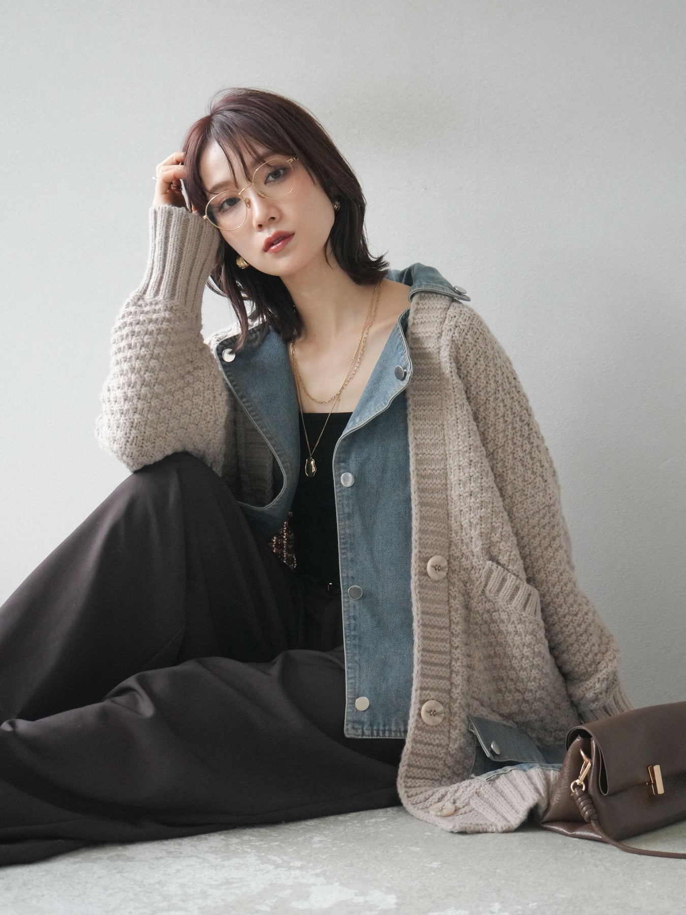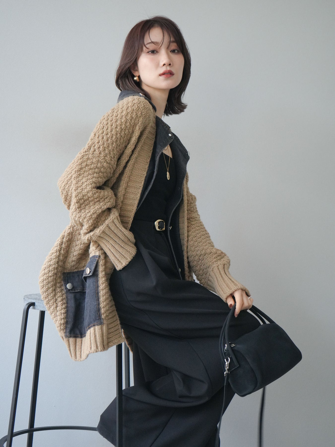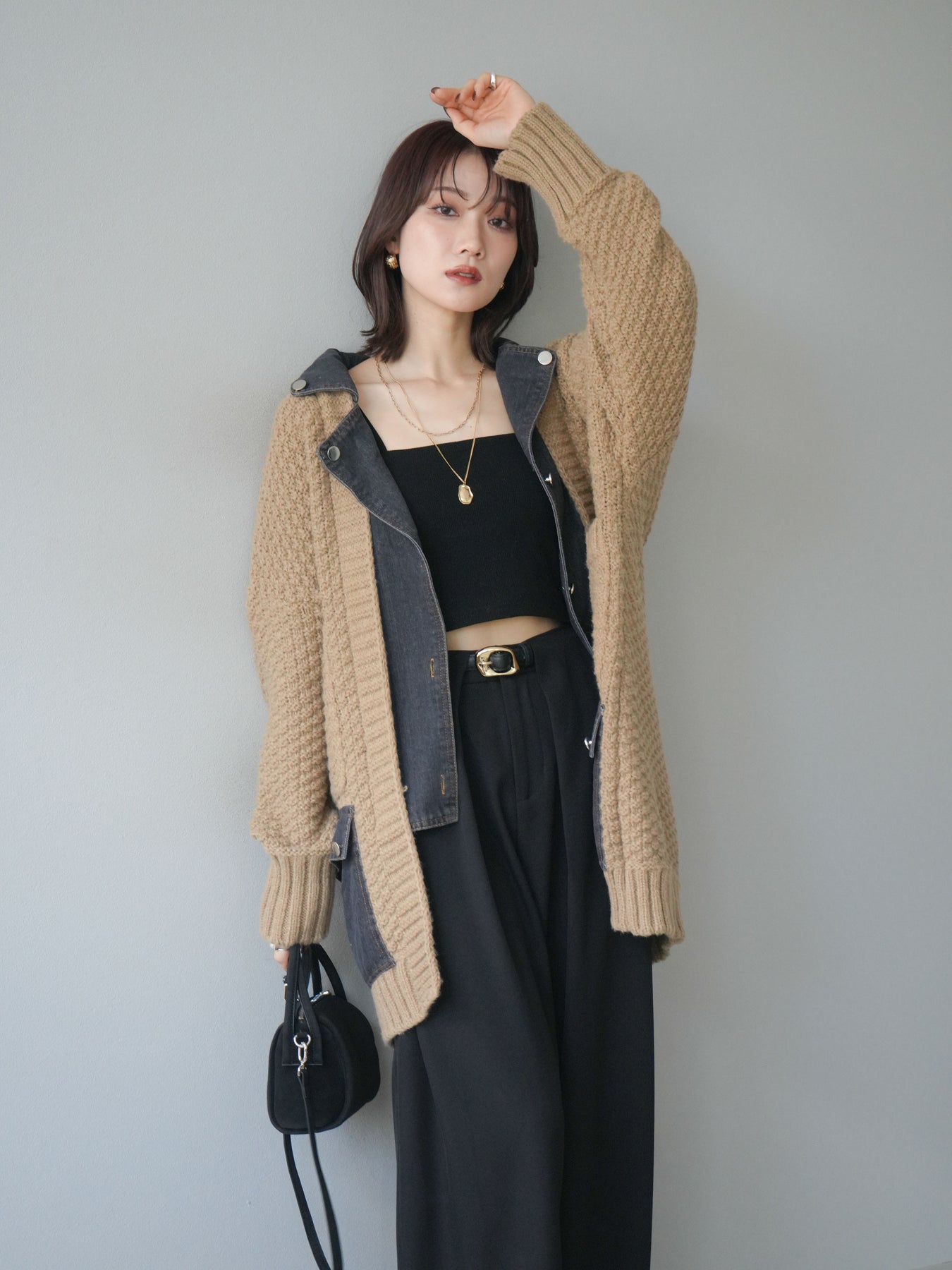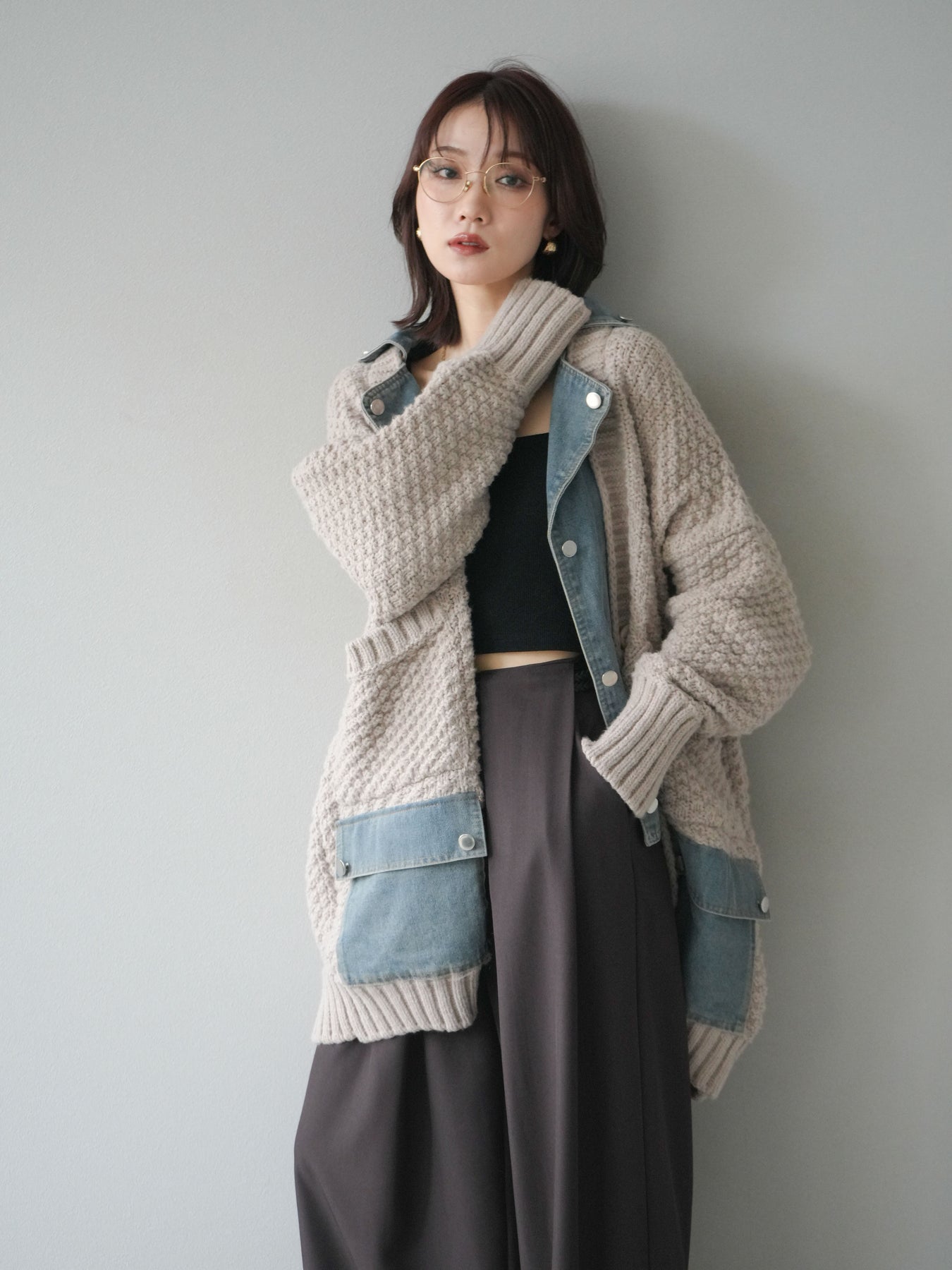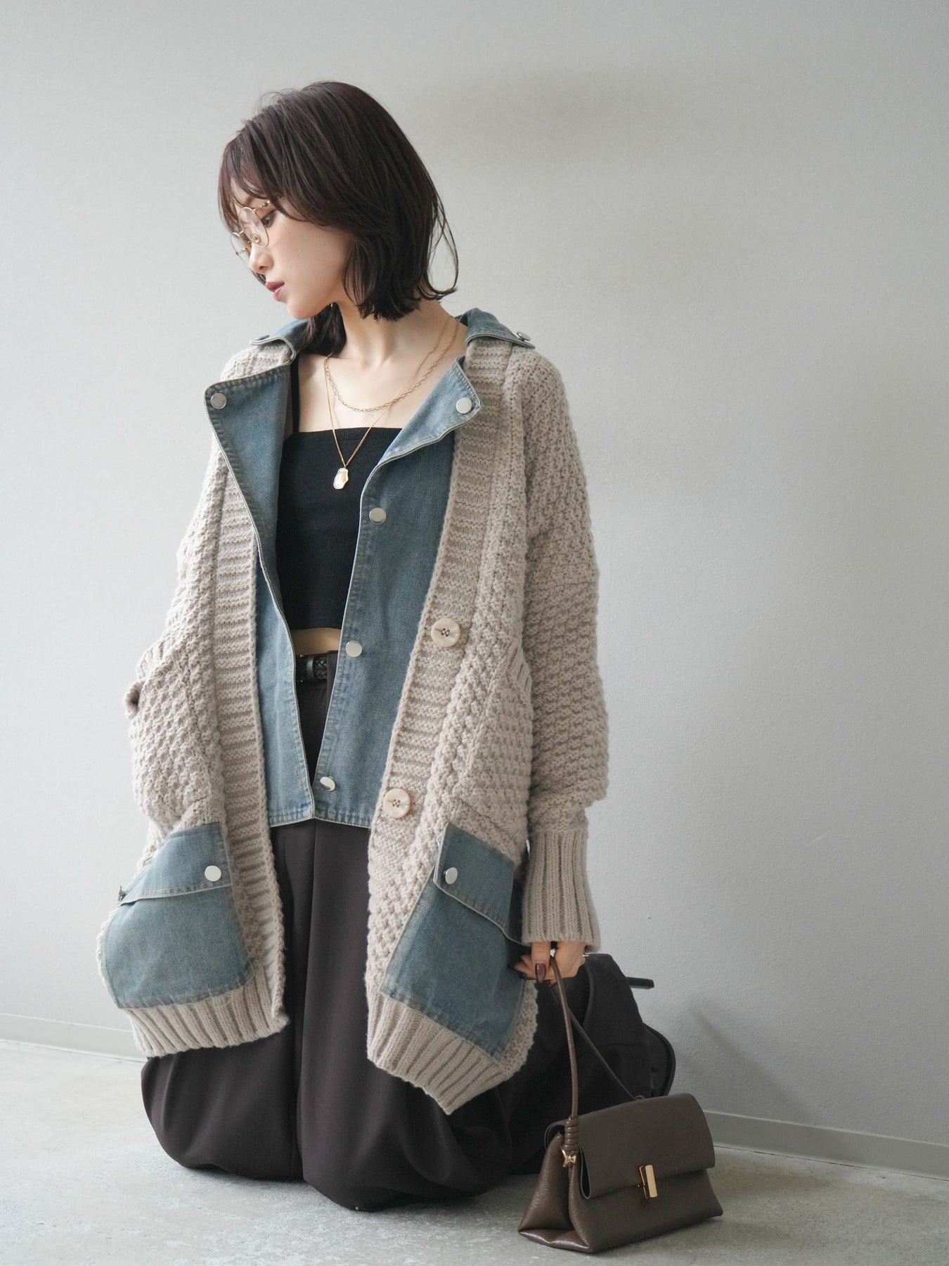 デニムとニットをドッキングした、存在感抜群のケーブルカーディガン。 ざっくりとしたケーブル編みと、デニムの切り替えが絶妙なバランスで、羽織るだけでこなれた印象を演出します。 ボリュームのあるシルエットながら軽やかな着心地で、アウターライクに使える一枚。 デニムの襟やポケットディテールがカジュアルさをプラスし、シンプルなコーディネートにも映えるデザインです。 季節の変わり目にさっと羽織れる、トレンド感のある万能アイテム。 ※ボトムス、キャミソール(インナー)以外の商品は一律でインナーは付属していません。