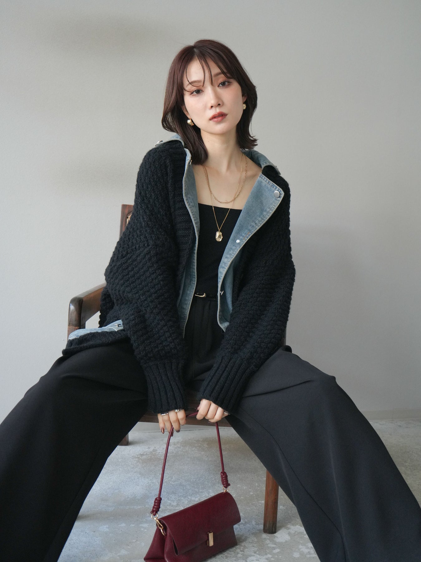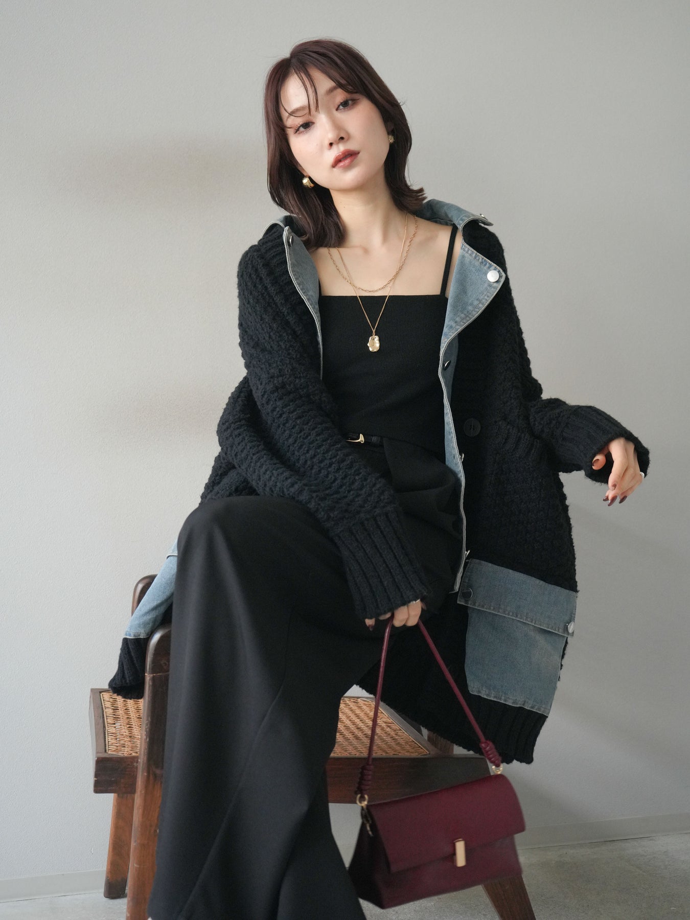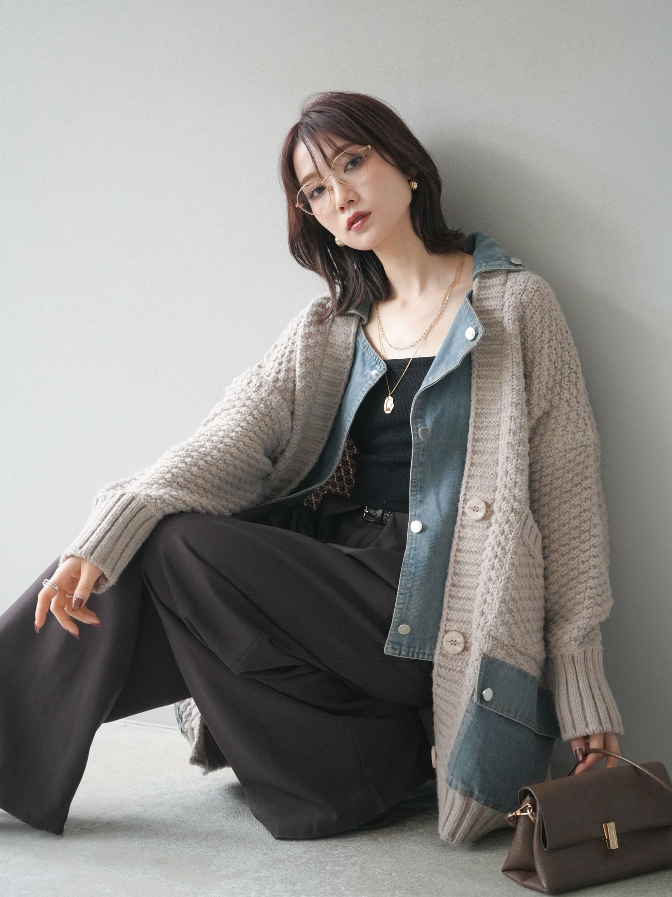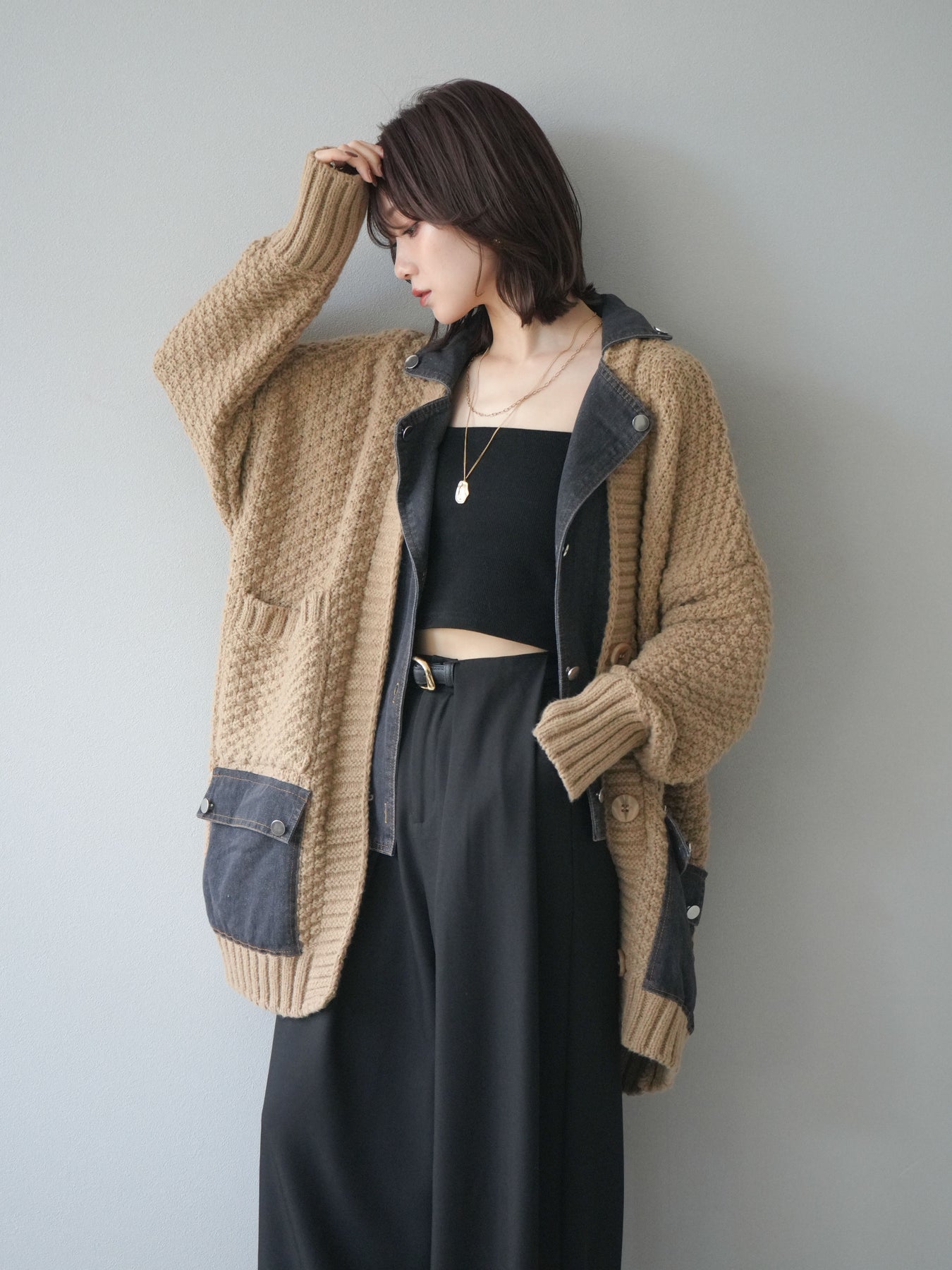 デニムとニットをドッキングした、存在感抜群のケーブルカーディガン。 ざっくりとしたケーブル編みと、デニムの切り替えが絶妙なバランスで、羽織るだけでこなれた印象を演出します。 ボリュームのあるシルエットながら軽やかな着心地で、アウターライクに使える一枚。 デニムの襟やポケットディテールがカジュアルさをプラスし、シンプルなコーディネートにも映えるデザインです。 季節の変わり目にさっと羽織れる、トレンド感のある万能アイテム。 ※ボトムス、キャミソール(インナー)以外の商品は一律でインナーは付属していません。