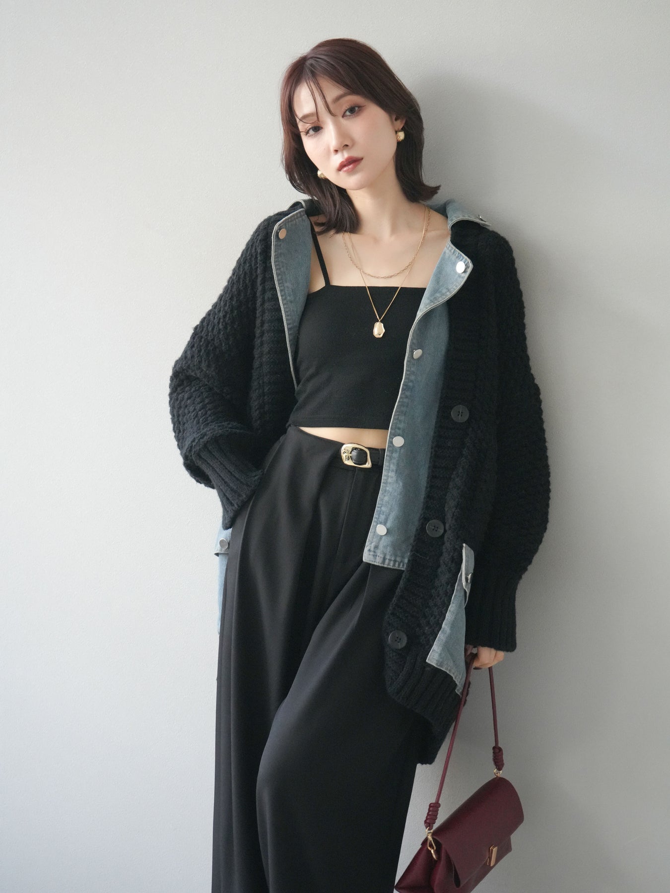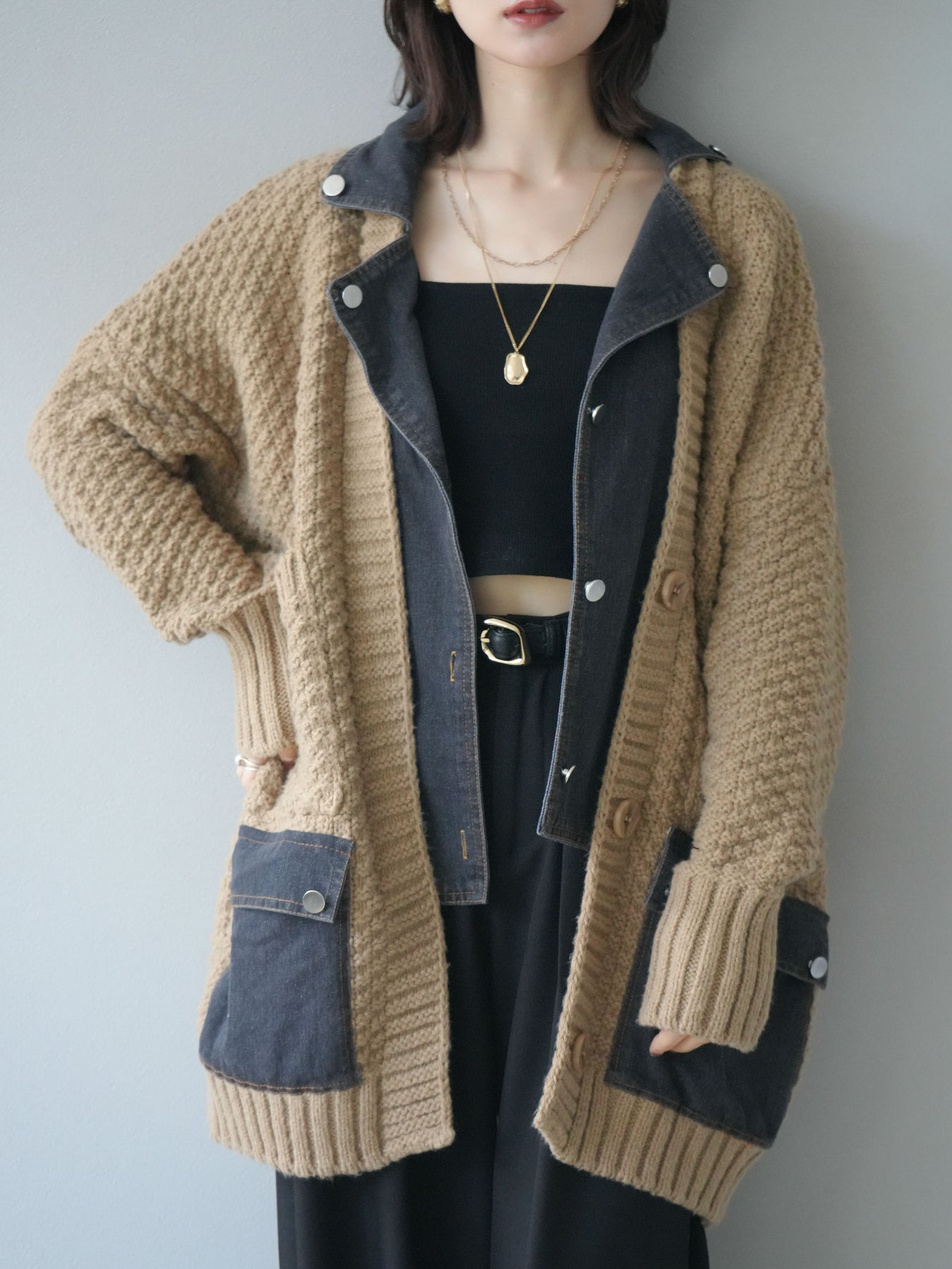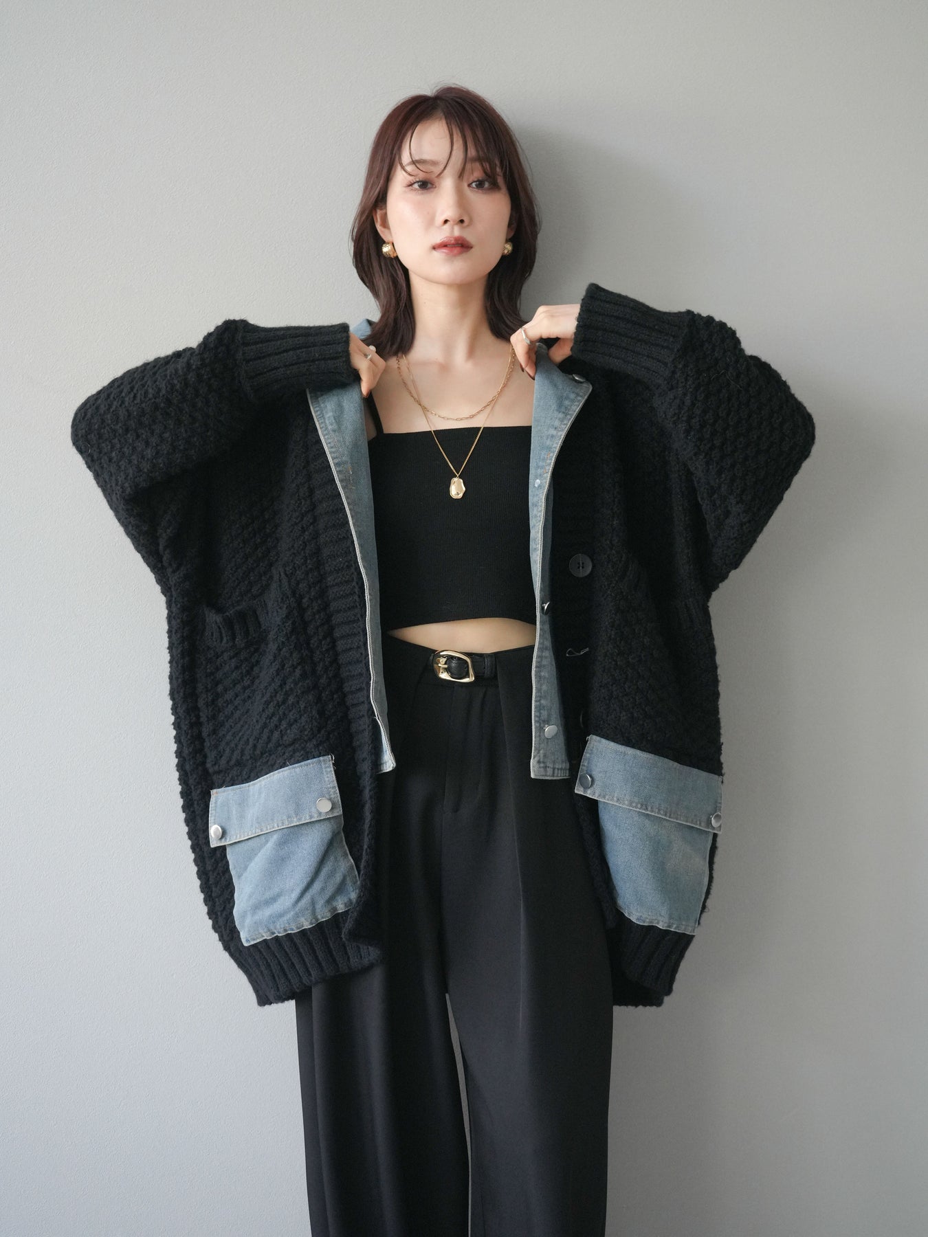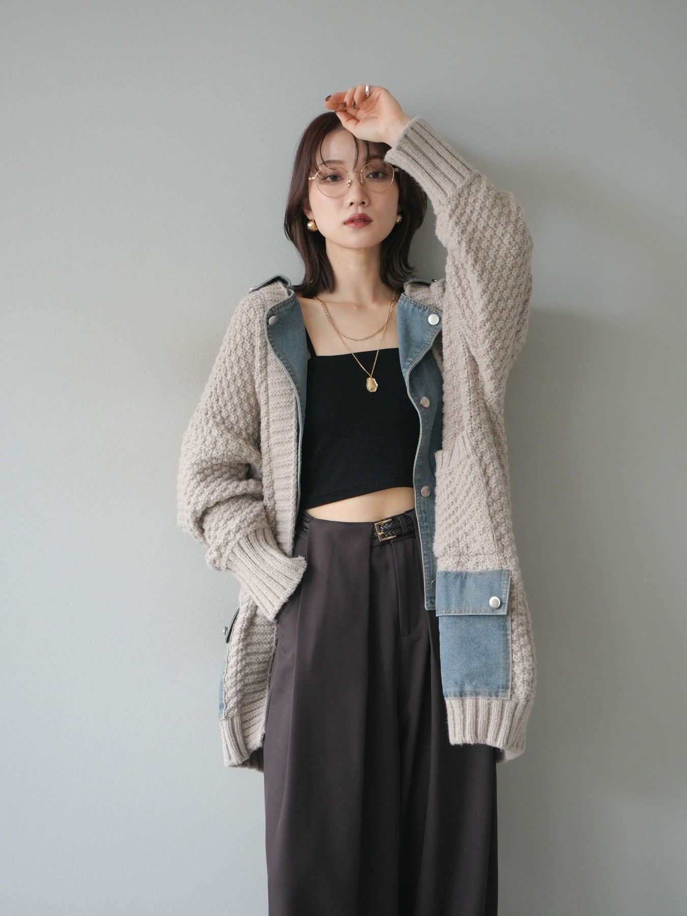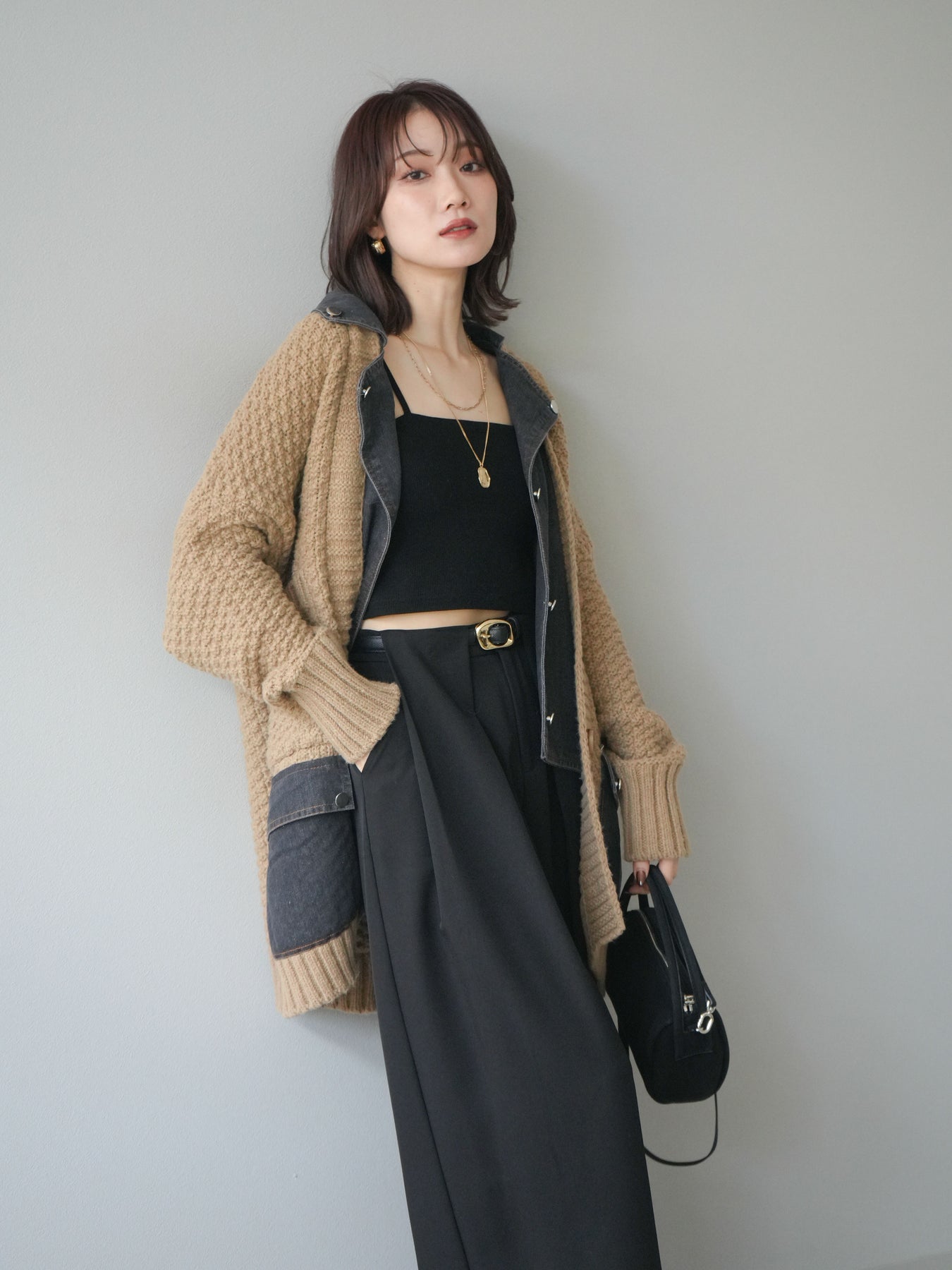 デニムとニットをドッキングした、存在感抜群のケーブルカーディガン。 ざっくりとしたケーブル編みと、デニムの切り替えが絶妙なバランスで、羽織るだけでこなれた印象を演出します。 ボリュームのあるシルエットながら軽やかな着心地で、アウターライクに使える一枚。 デニムの襟やポケットディテールがカジュアルさをプラスし、シンプルなコーディネートにも映えるデザインです。 季節の変わり目にさっと羽織れる、トレンド感のある万能アイテム。 ※ボトムス、キャミソール(インナー)以外の商品は一律でインナーは付属していません。