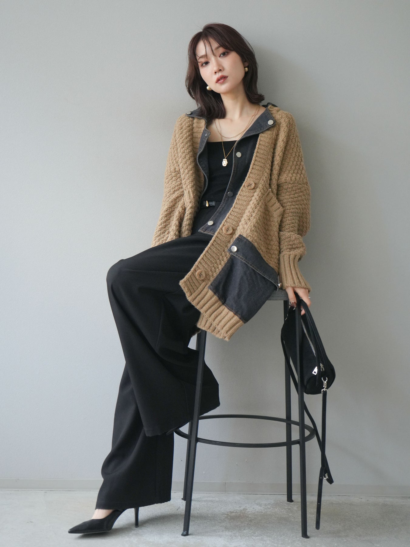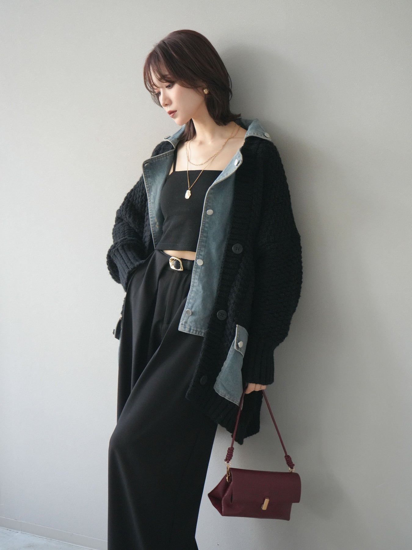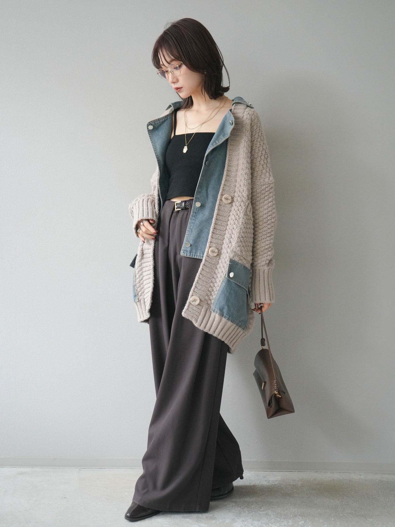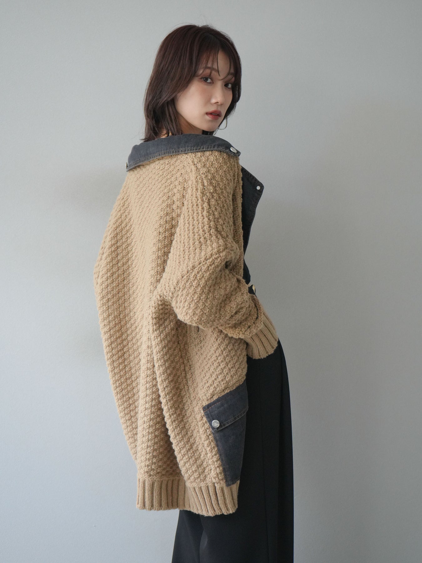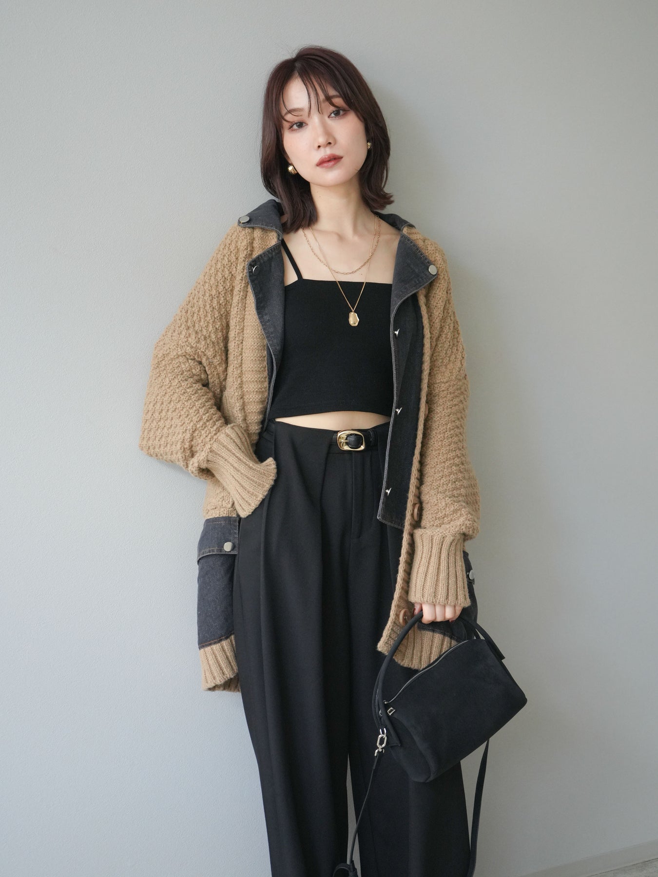 デニムとニットをドッキングした、存在感抜群のケーブルカーディガン。 ざっくりとしたケーブル編みと、デニムの切り替えが絶妙なバランスで、羽織るだけでこなれた印象を演出します。 ボリュームのあるシルエットながら軽やかな着心地で、アウターライクに使える一枚。 デニムの襟やポケットディテールがカジュアルさをプラスし、シンプルなコーディネートにも映えるデザインです。 季節の変わり目にさっと羽織れる、トレンド感のある万能アイテム。 ※ボトムス、キャミソール(インナー)以外の商品は一律でインナーは付属していません。
