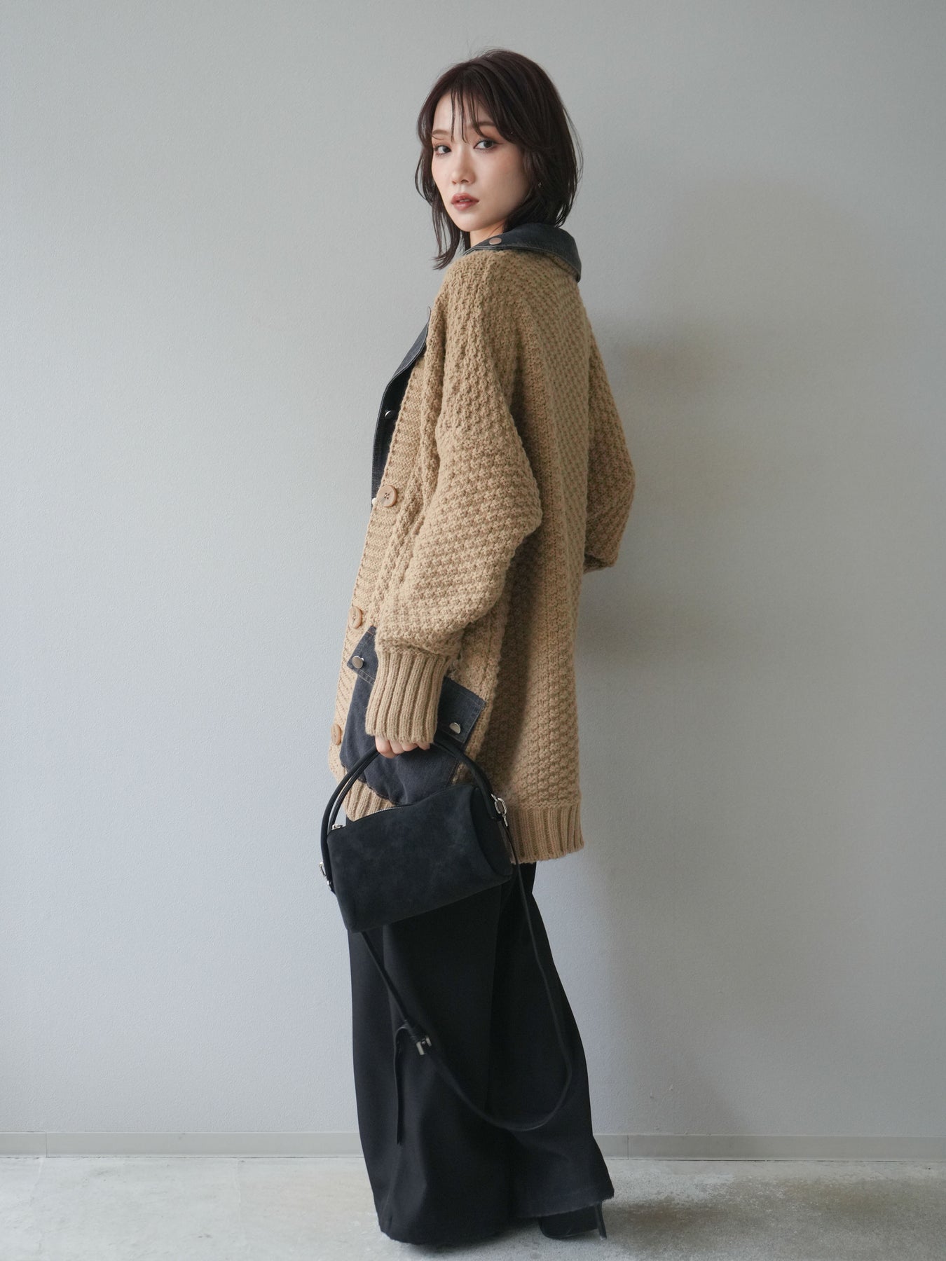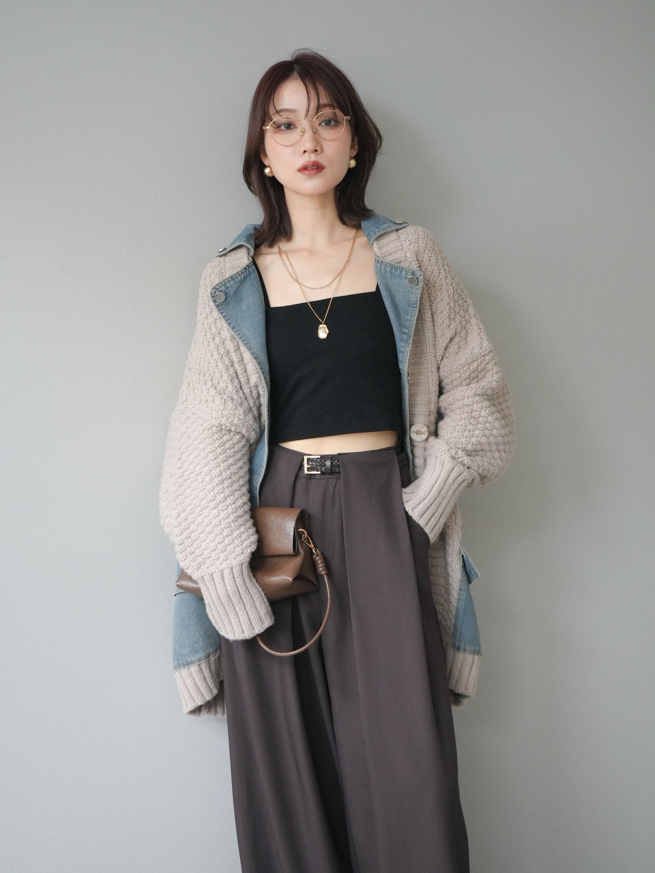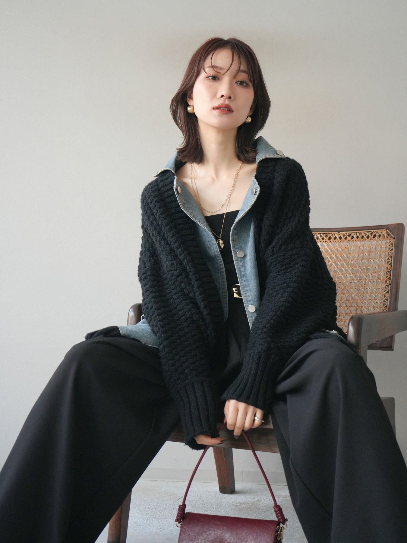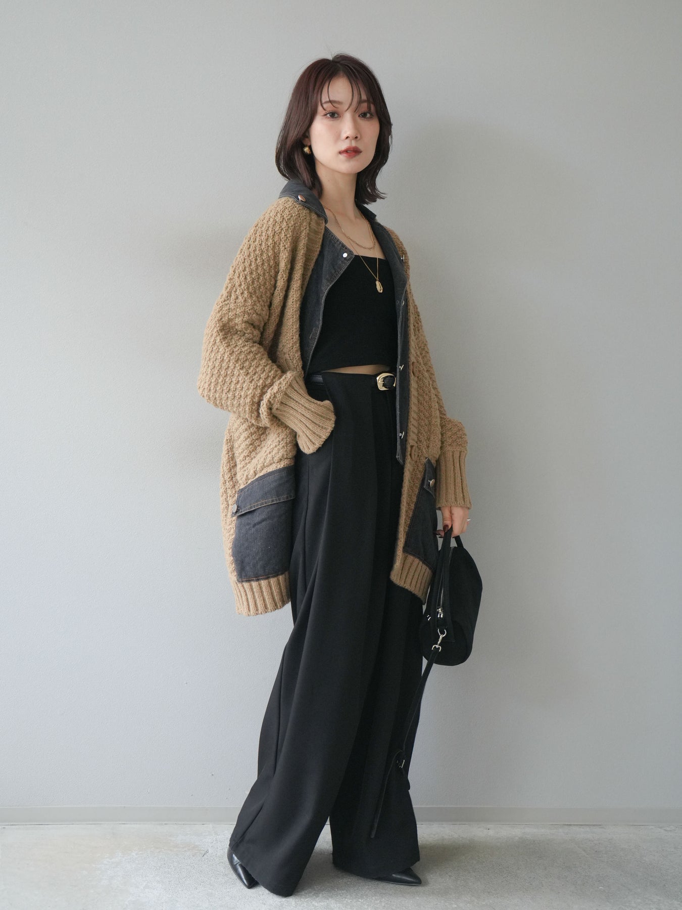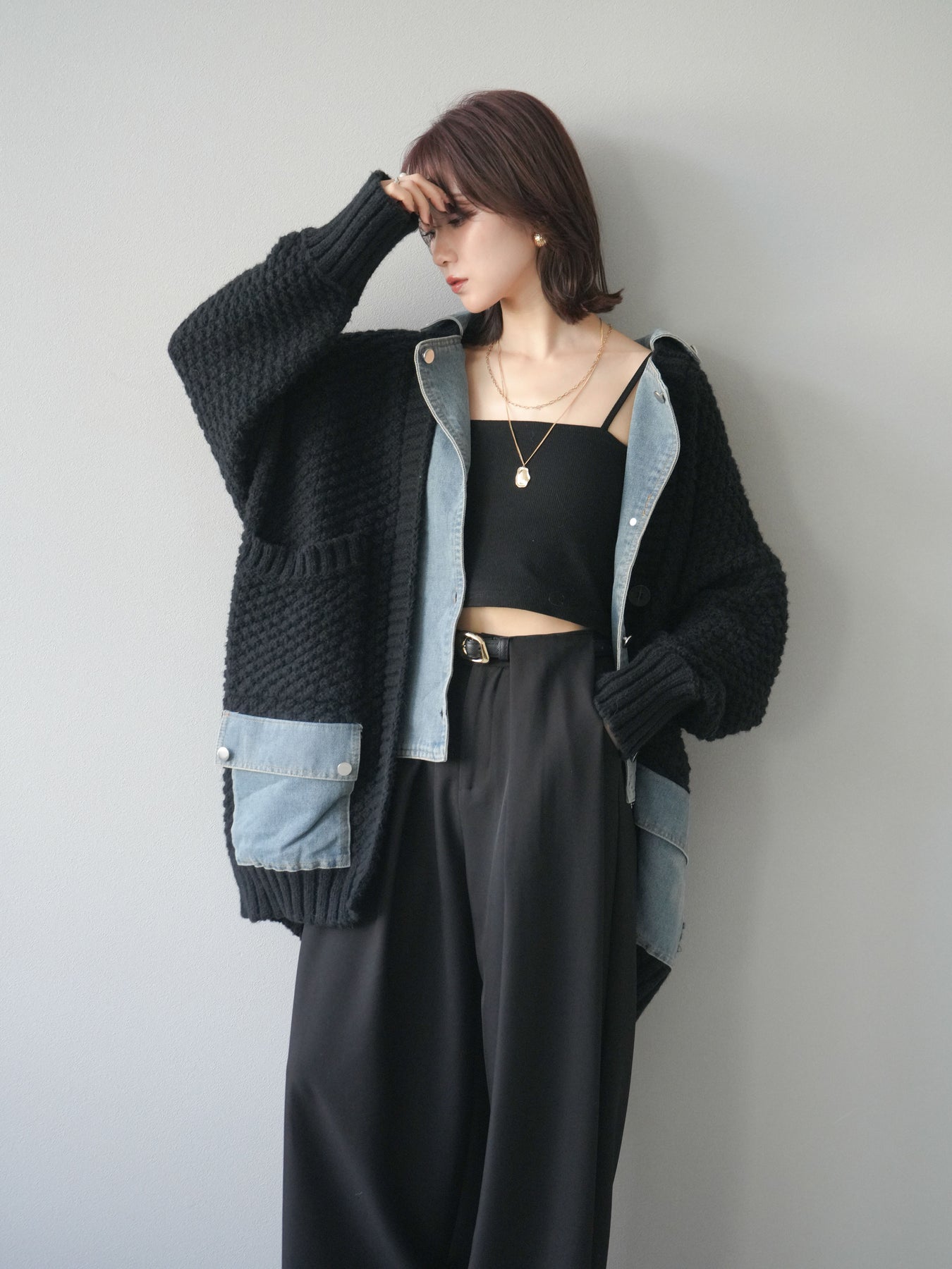 デニムとニットをドッキングした、存在感抜群のケーブルカーディガン。 ざっくりとしたケーブル編みと、デニムの切り替えが絶妙なバランスで、羽織るだけでこなれた印象を演出します。 ボリュームのあるシルエットながら軽やかな着心地で、アウターライクに使える一枚。 デニムの襟やポケットディテールがカジュアルさをプラスし、シンプルなコーディネートにも映えるデザインです。 季節の変わり目にさっと羽織れる、トレンド感のある万能アイテム。 ※ボトムス、キャミソール(インナー)以外の商品は一律でインナーは付属していません。