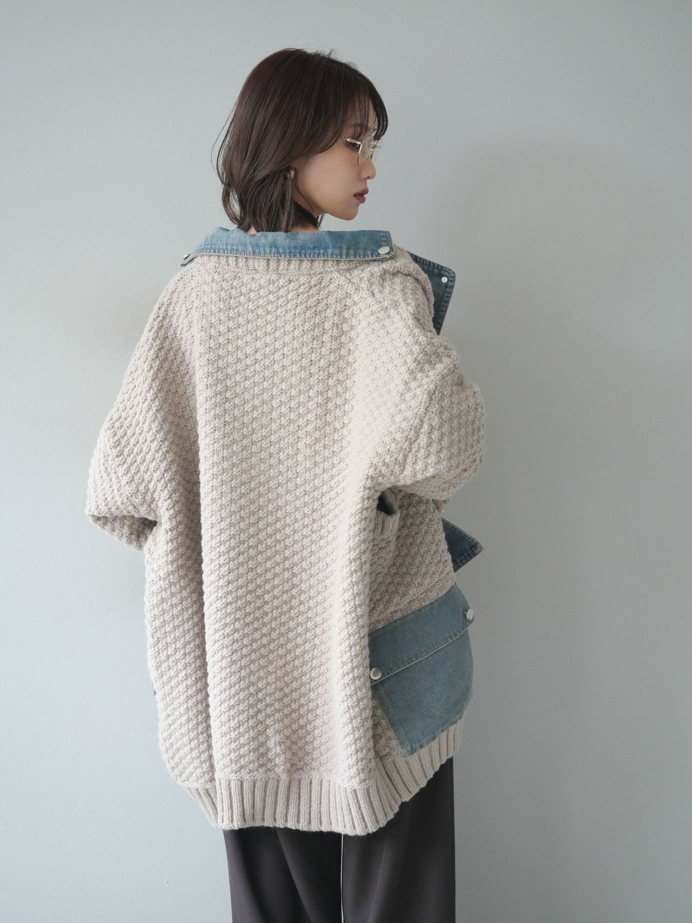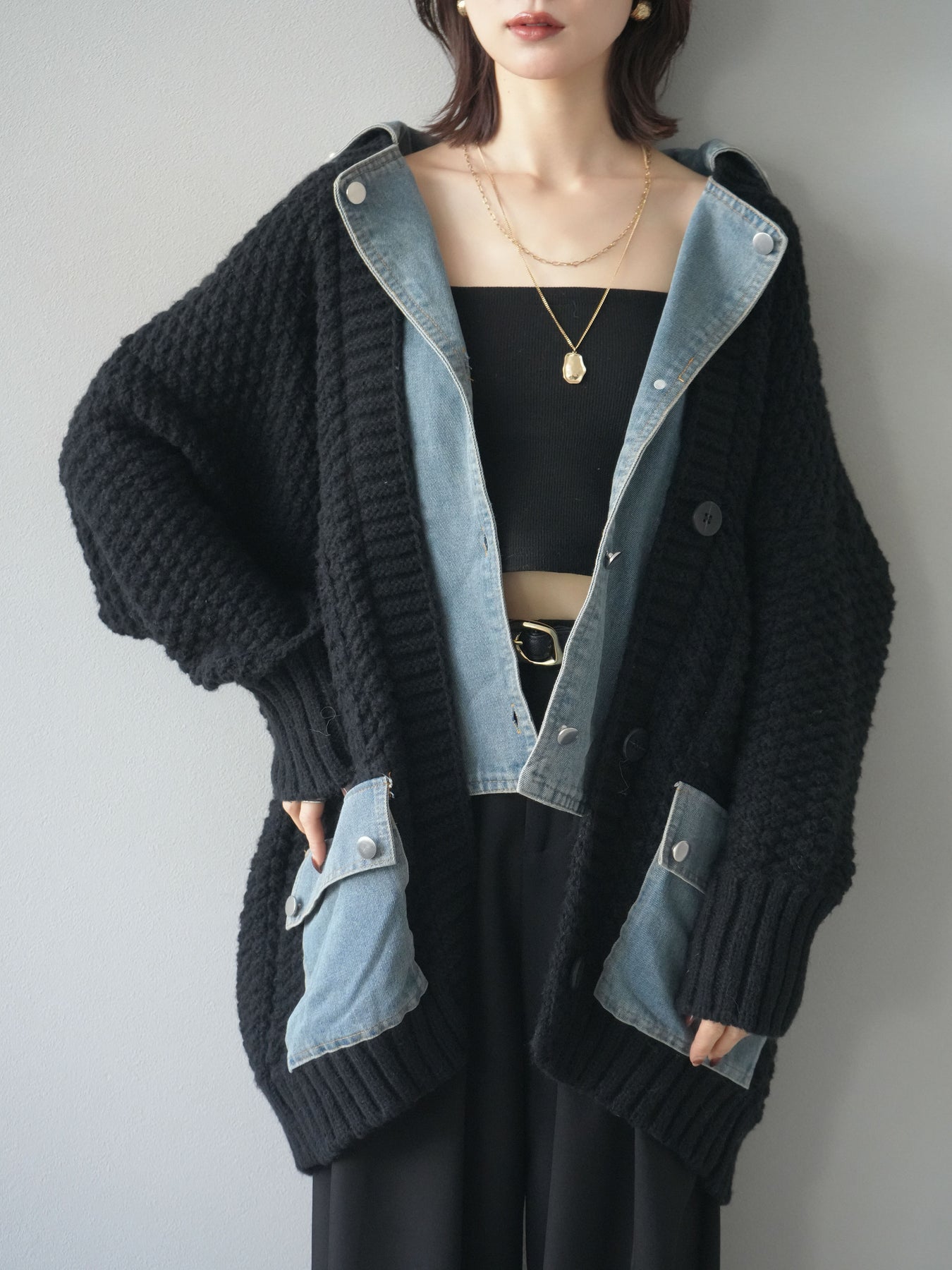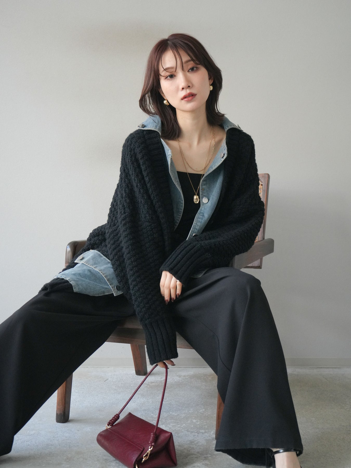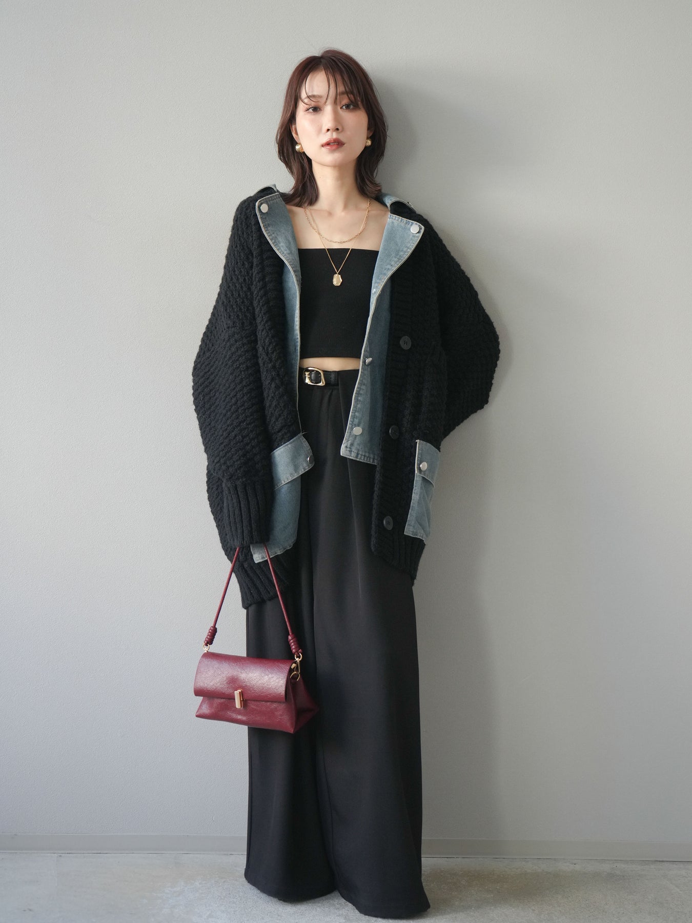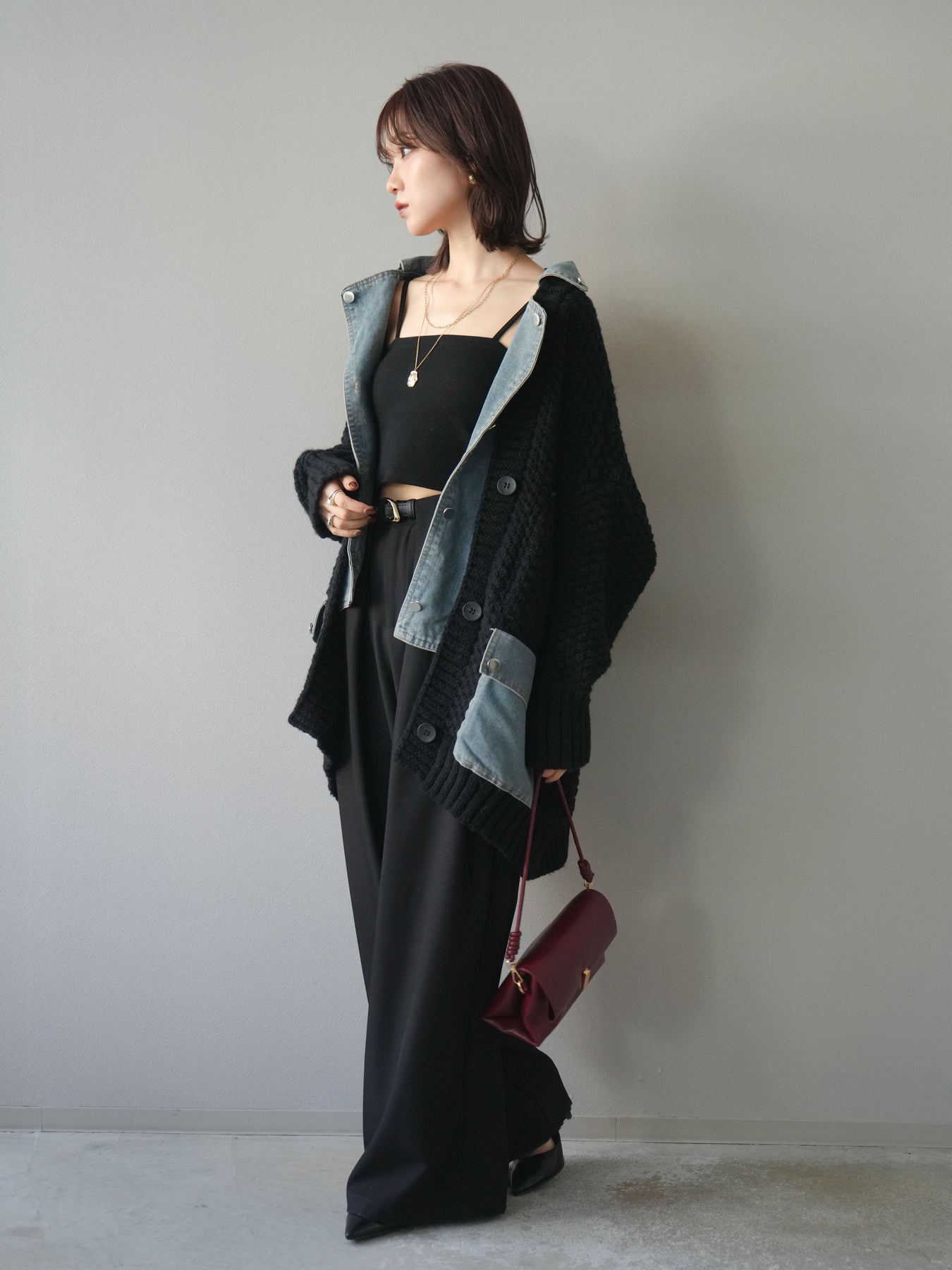 デニムとニットをドッキングした、存在感抜群のケーブルカーディガン。 ざっくりとしたケーブル編みと、デニムの切り替えが絶妙なバランスで、羽織るだけでこなれた印象を演出します。 ボリュームのあるシルエットながら軽やかな着心地で、アウターライクに使える一枚。 デニムの襟やポケットディテールがカジュアルさをプラスし、シンプルなコーディネートにも映えるデザインです。 季節の変わり目にさっと羽織れる、トレンド感のある万能アイテム。 ※ボトムス、キャミソール(インナー)以外の商品は一律でインナーは付属していません。