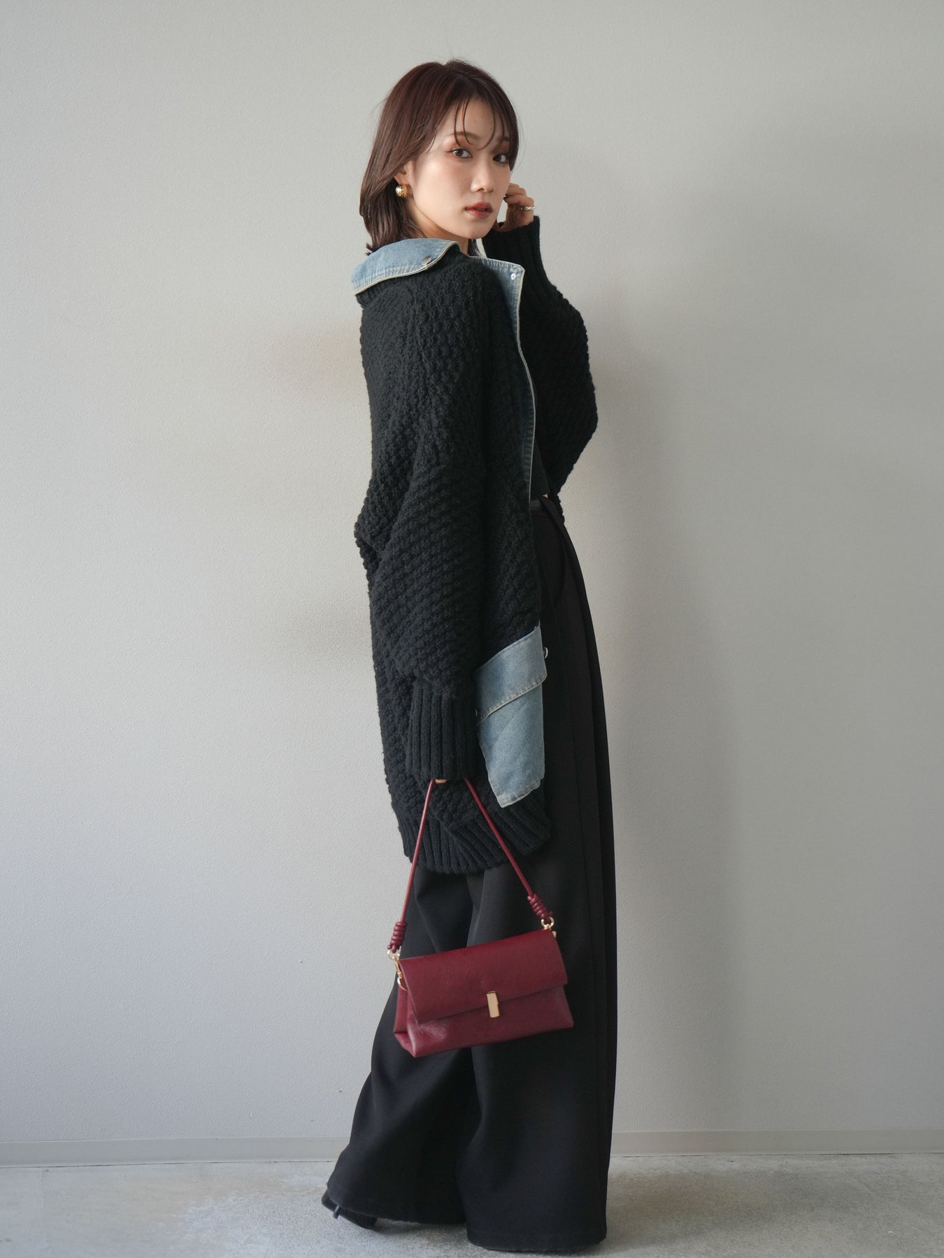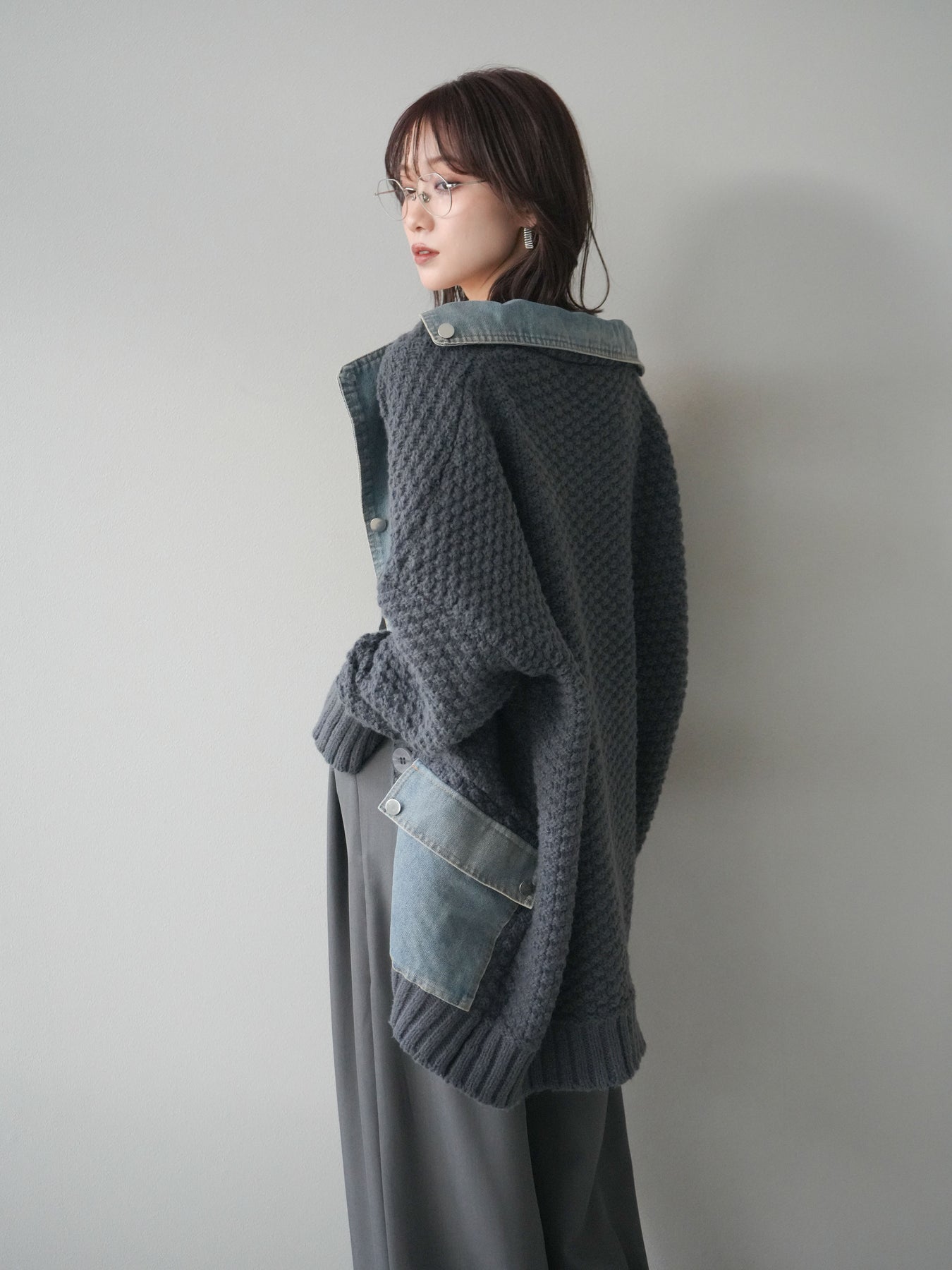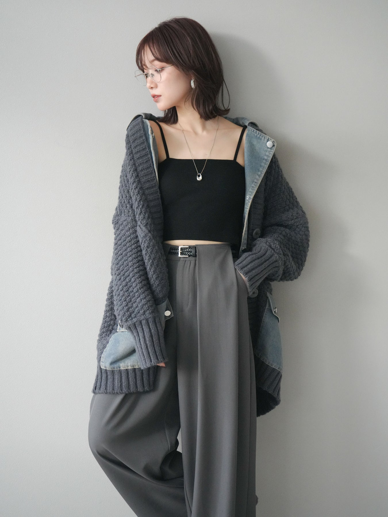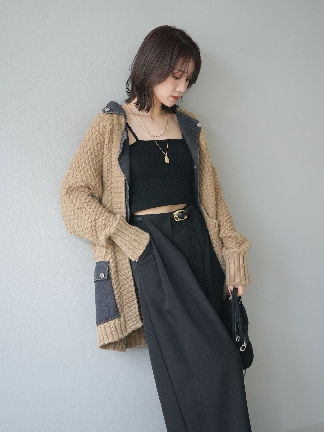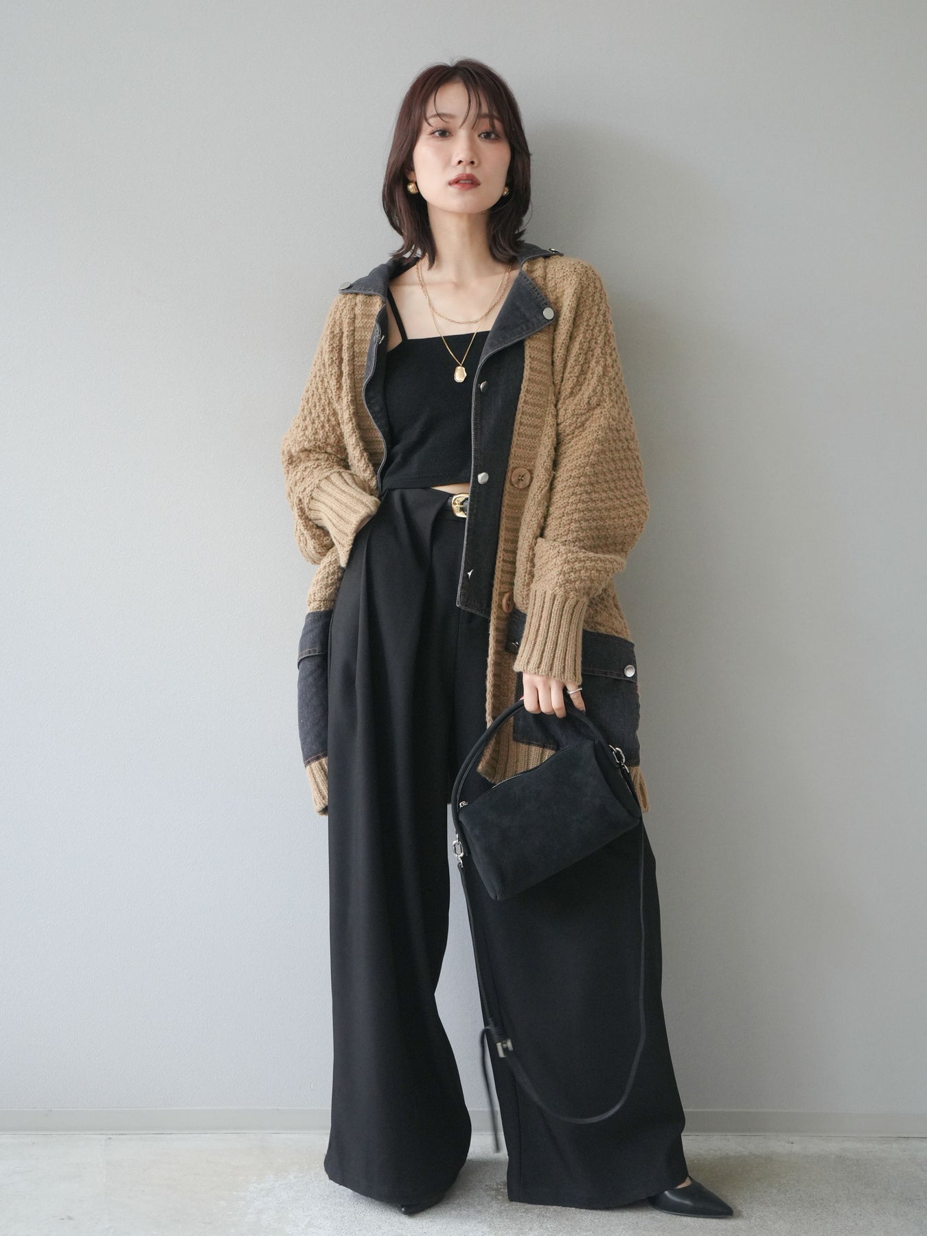 デニムとニットをドッキングした、存在感抜群のケーブルカーディガン。 ざっくりとしたケーブル編みと、デニムの切り替えが絶妙なバランスで、羽織るだけでこなれた印象を演出します。 ボリュームのあるシルエットながら軽やかな着心地で、アウターライクに使える一枚。 デニムの襟やポケットディテールがカジュアルさをプラスし、シンプルなコーディネートにも映えるデザインです。 季節の変わり目にさっと羽織れる、トレンド感のある万能アイテム。 ※ボトムス、キャミソール(インナー)以外の商品は一律でインナーは付属していません。