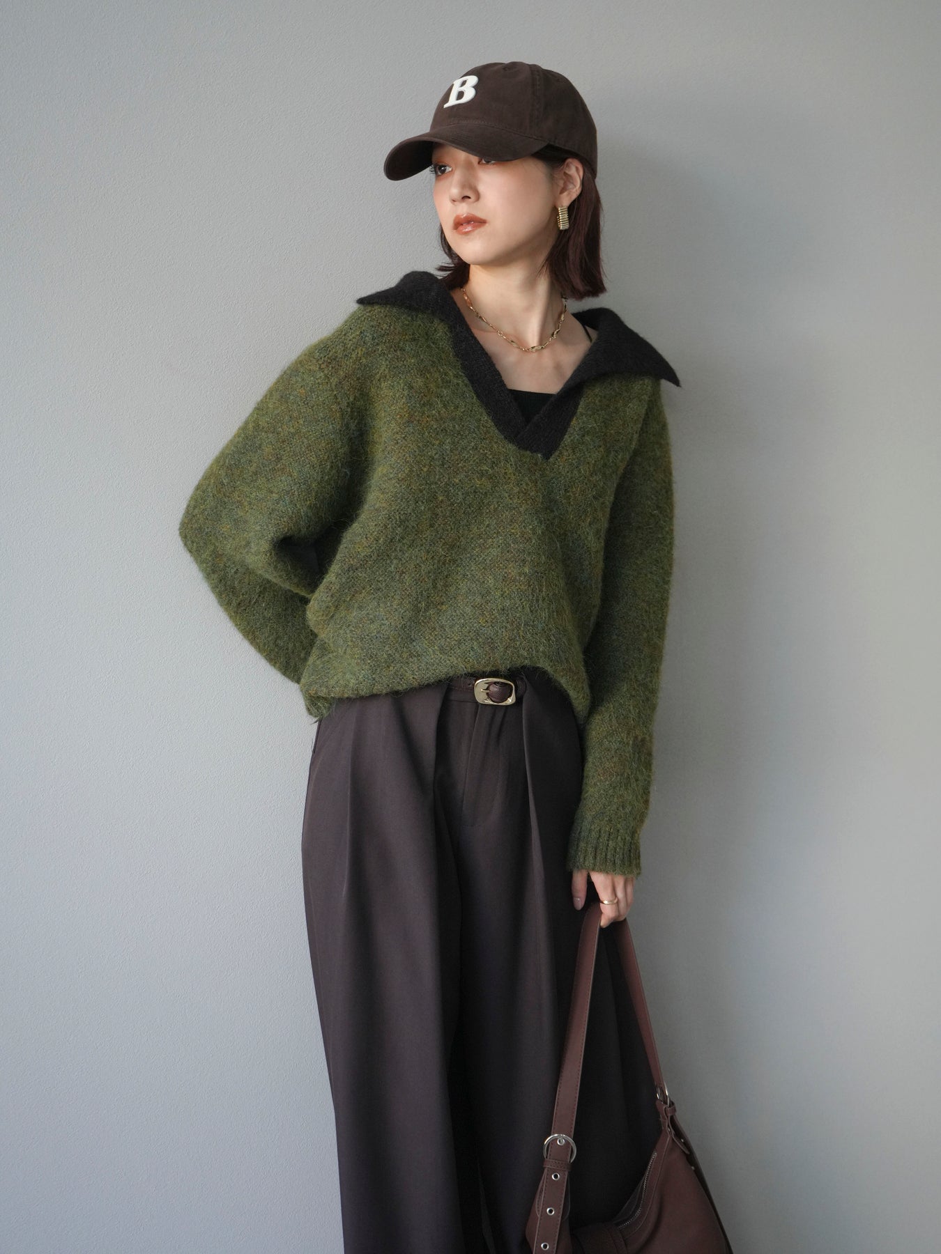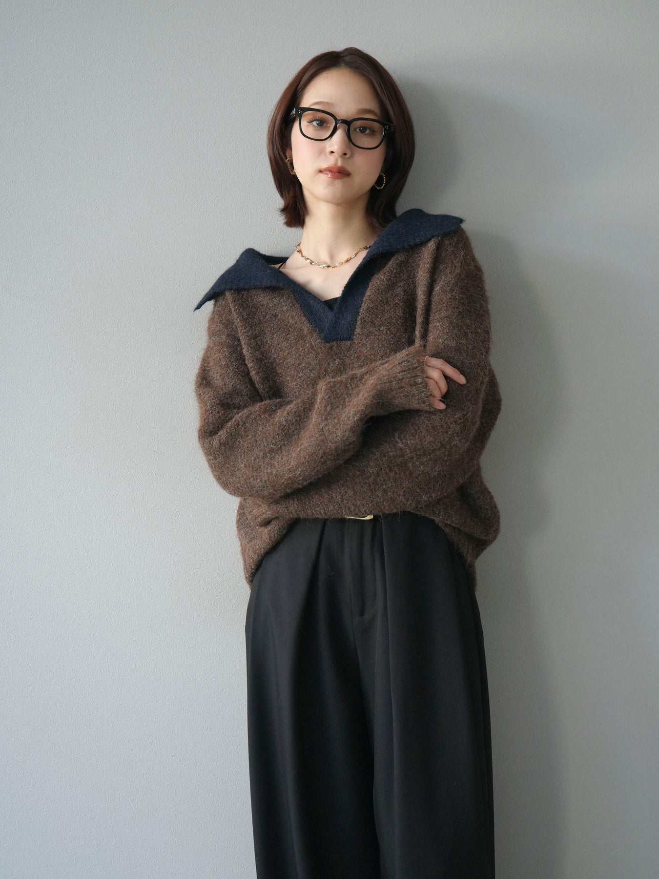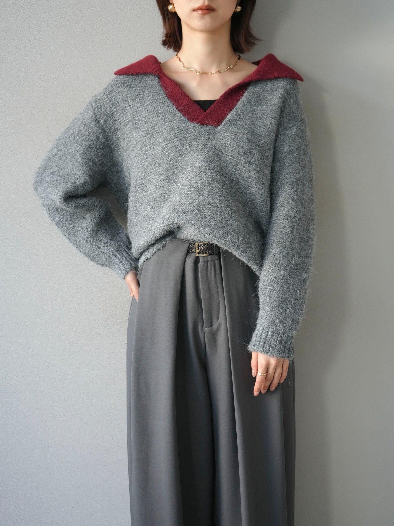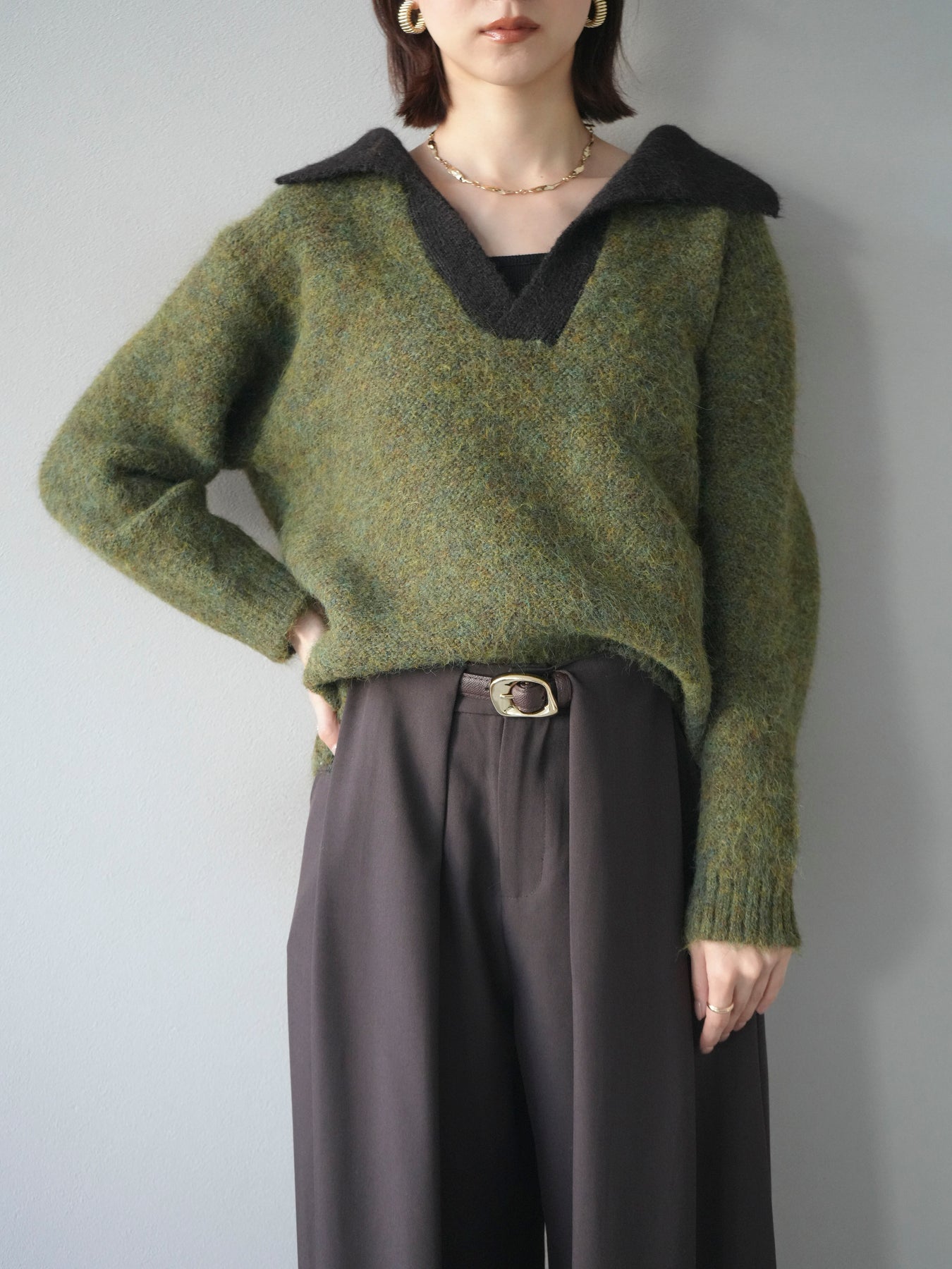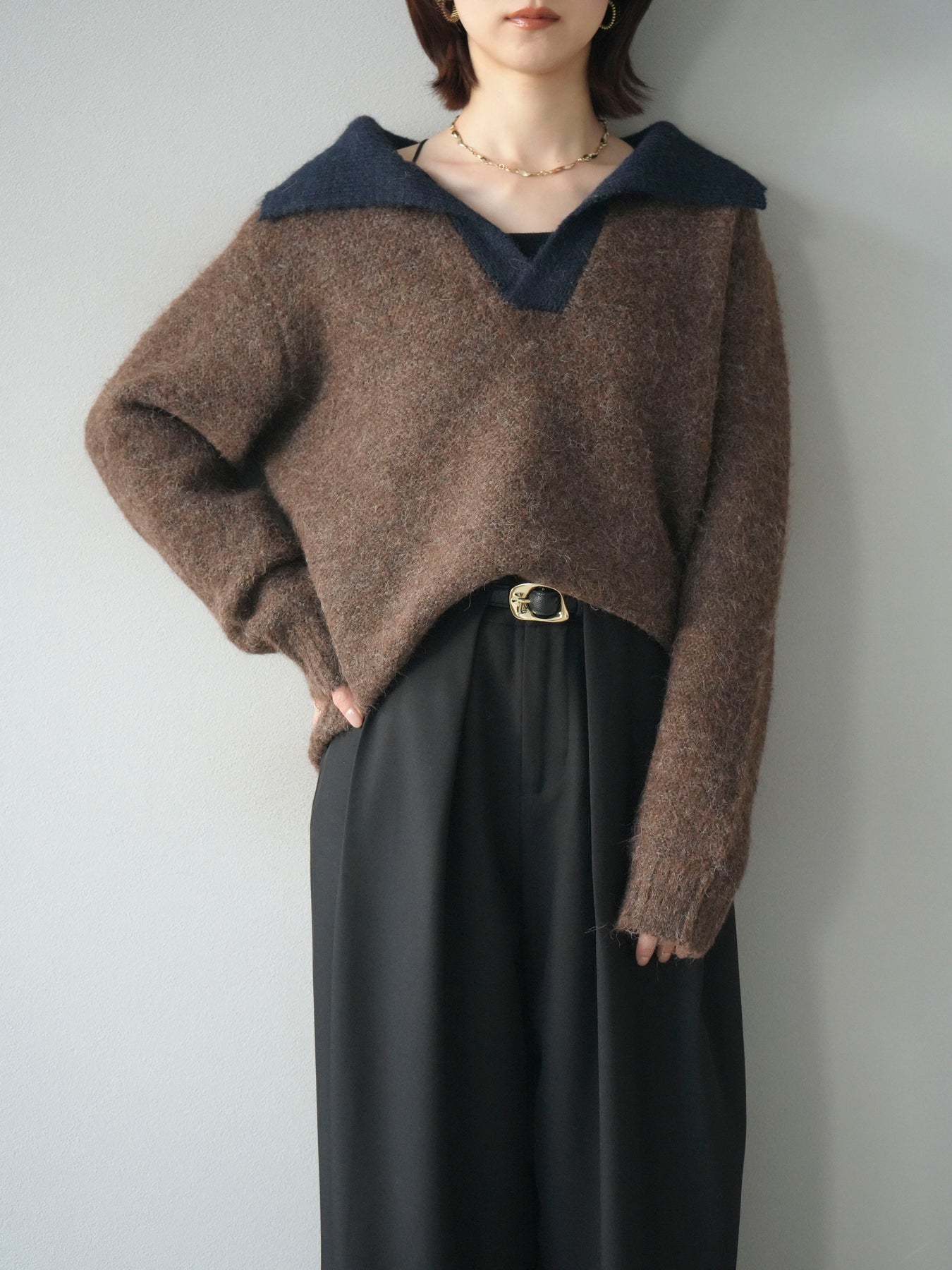 配色の襟デザインが目を惹くニットプルオーバー。 ふんわりとしたモヘアタッチの素材が柔らかく、優しい風合いを演出します。 ゆったりとしたシルエットと程よい着丈で、ボトムを選ばずバランスよく着こなせる一枚。 襟元のバイカラーデザインがコーディネートにアクセントを加え、シンプルながらも洗練された印象に仕上がります。 デイリーからお出かけまで幅広く活躍する、シーズンムード漂うニットです。 ※ボトムス、キャミソール(インナー)以外の商品は一律でインナーは付属していません。