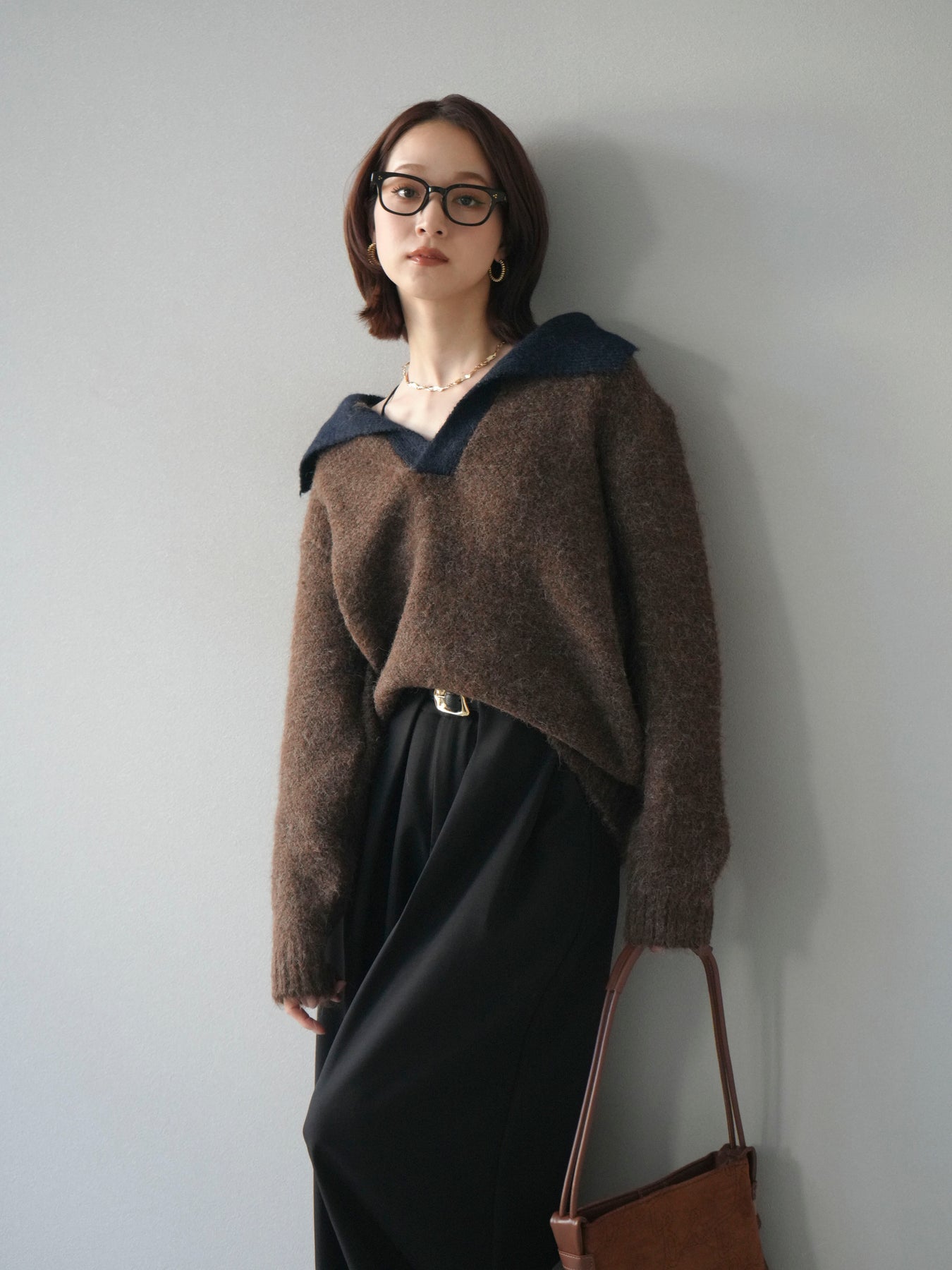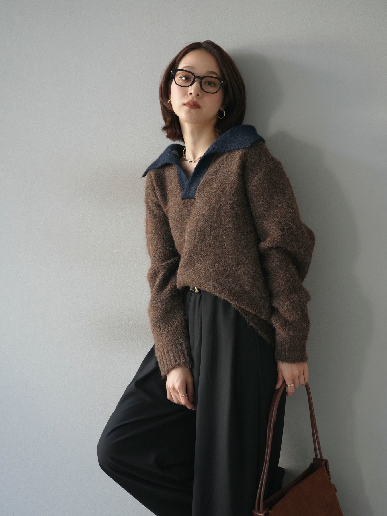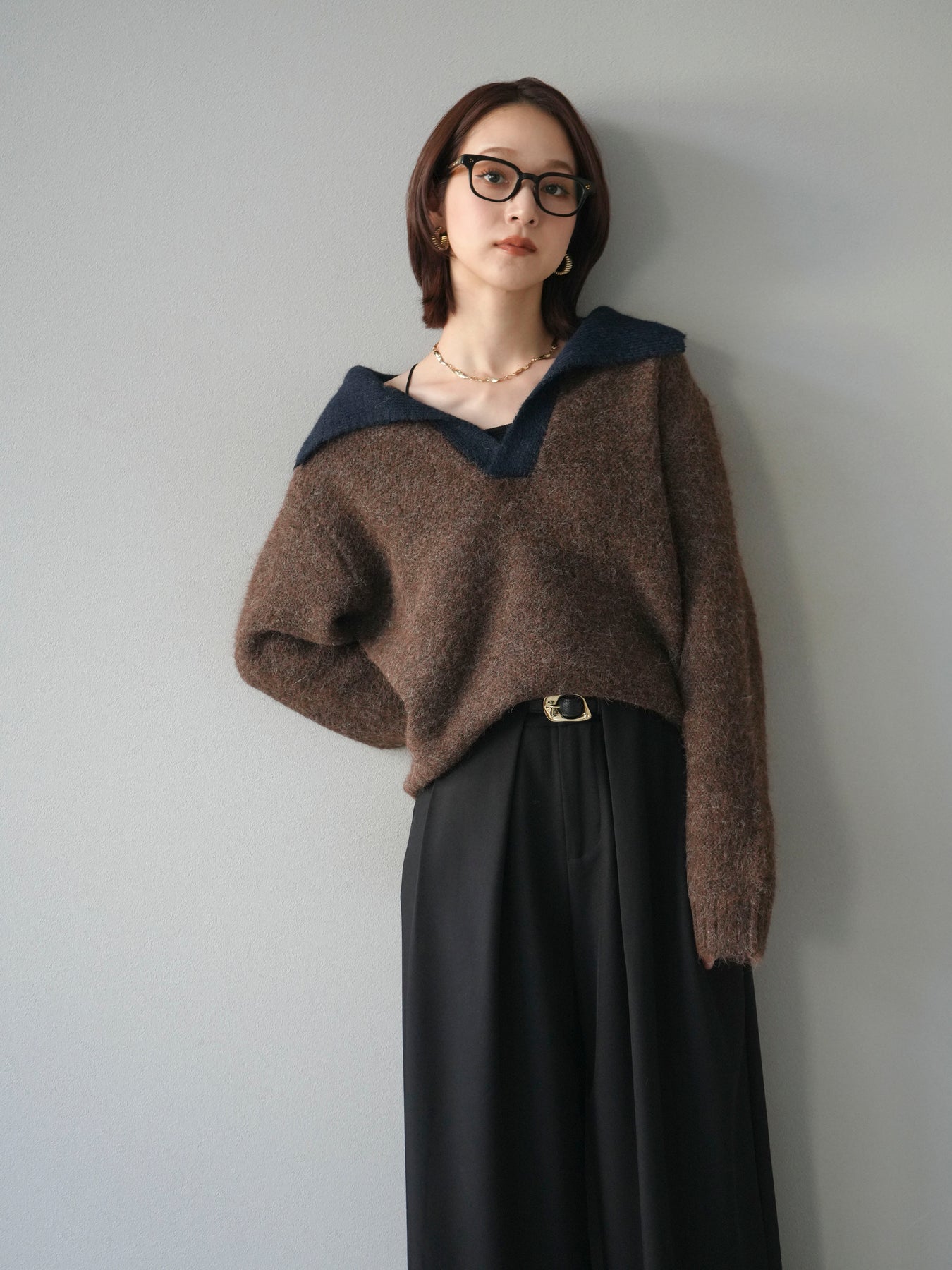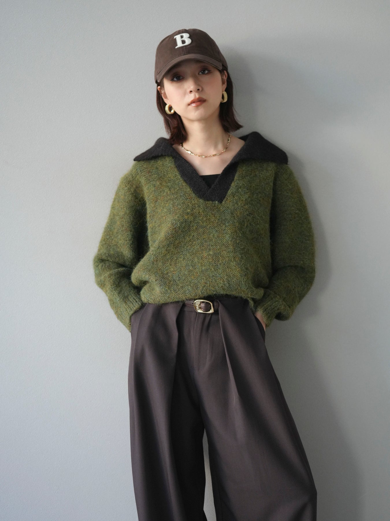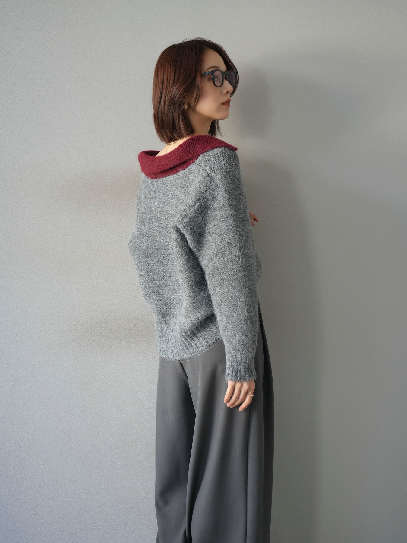 配色の襟デザインが目を惹くニットプルオーバー。 ふんわりとしたモヘアタッチの素材が柔らかく、優しい風合いを演出します。 ゆったりとしたシルエットと程よい着丈で、ボトムを選ばずバランスよく着こなせる一枚。 襟元のバイカラーデザインがコーディネートにアクセントを加え、シンプルながらも洗練された印象に仕上がります。 デイリーからお出かけまで幅広く活躍する、シーズンムード漂うニットです。 ※ボトムス、キャミソール(インナー)以外の商品は一律でインナーは付属していません。