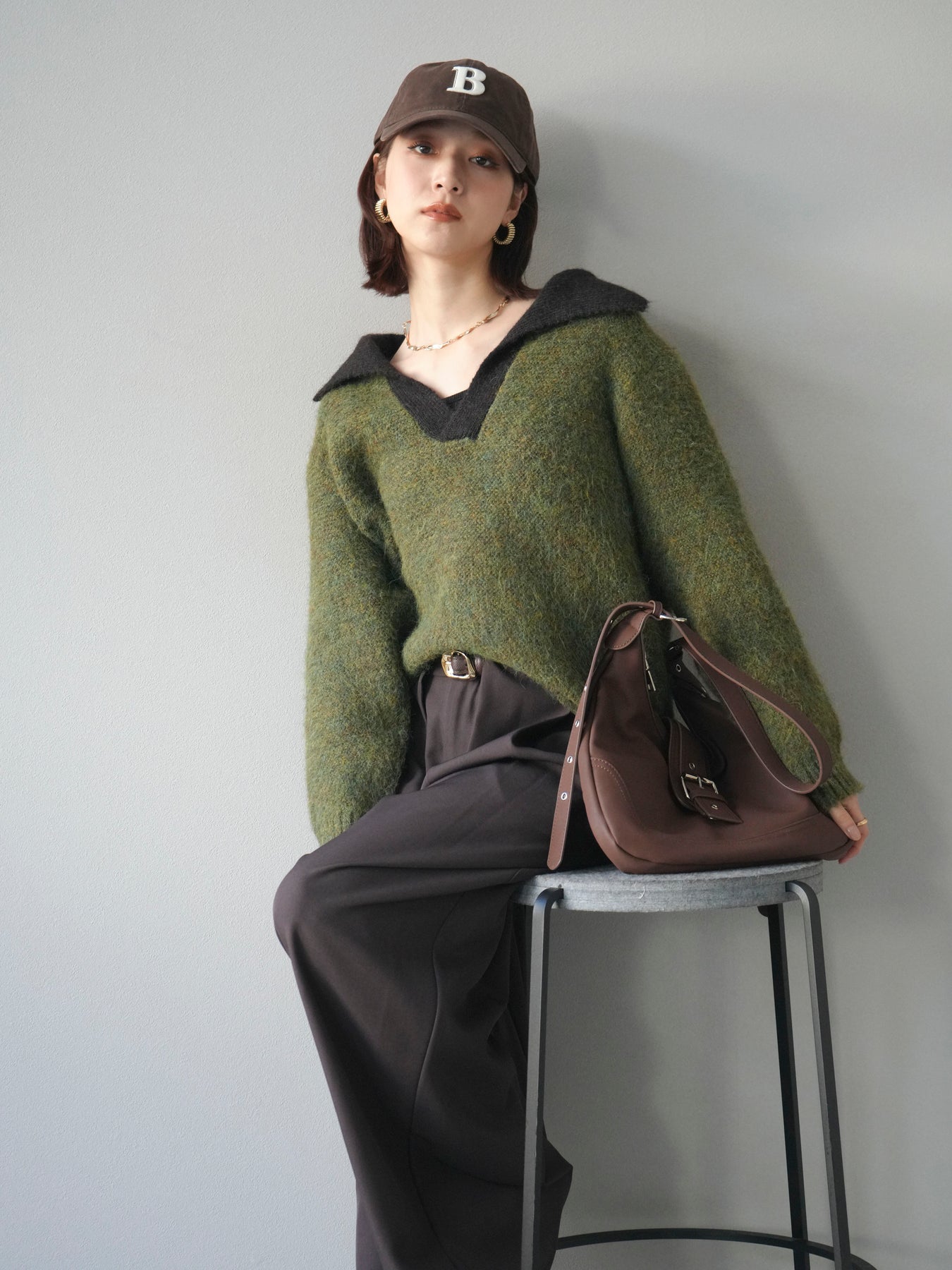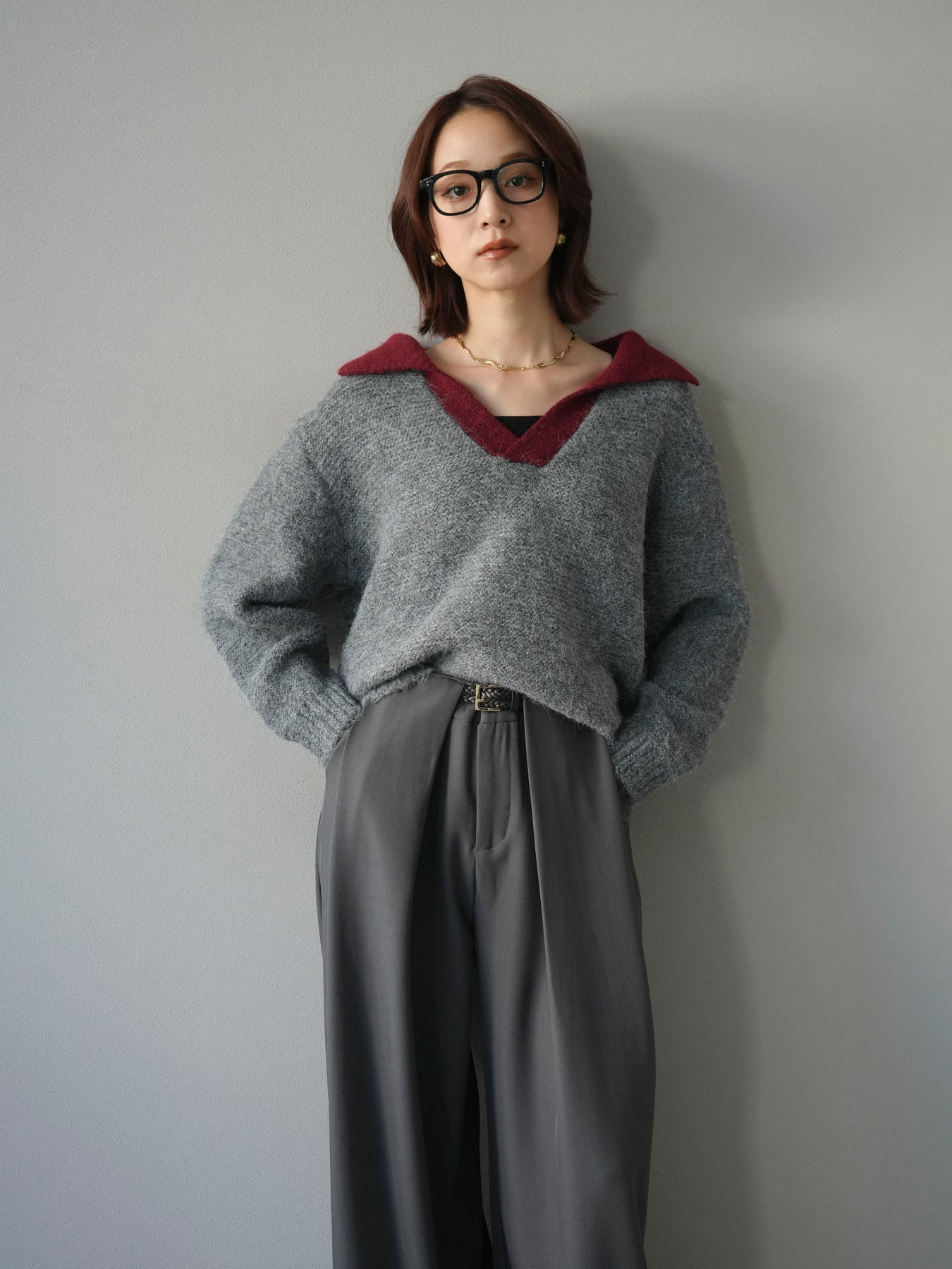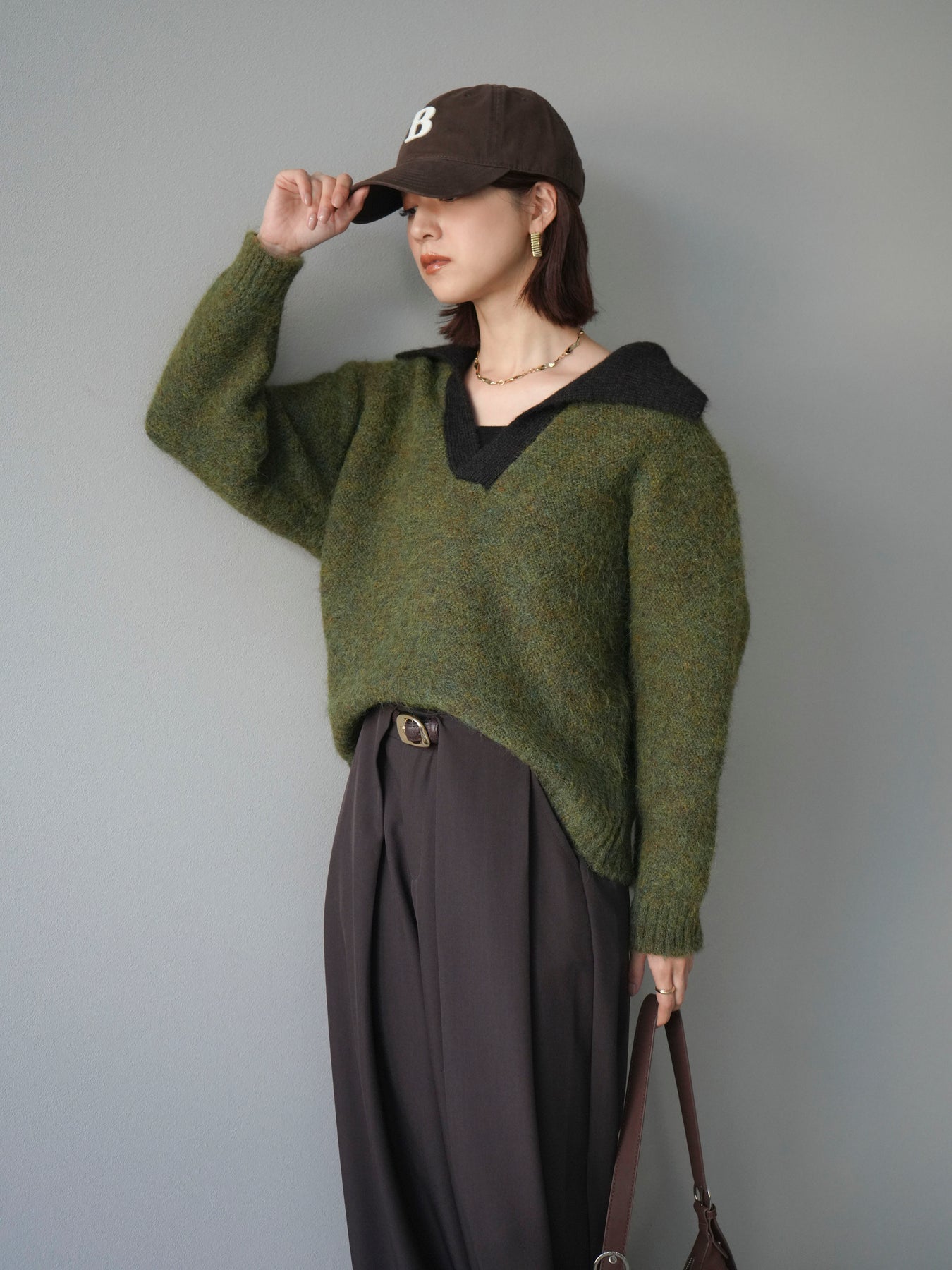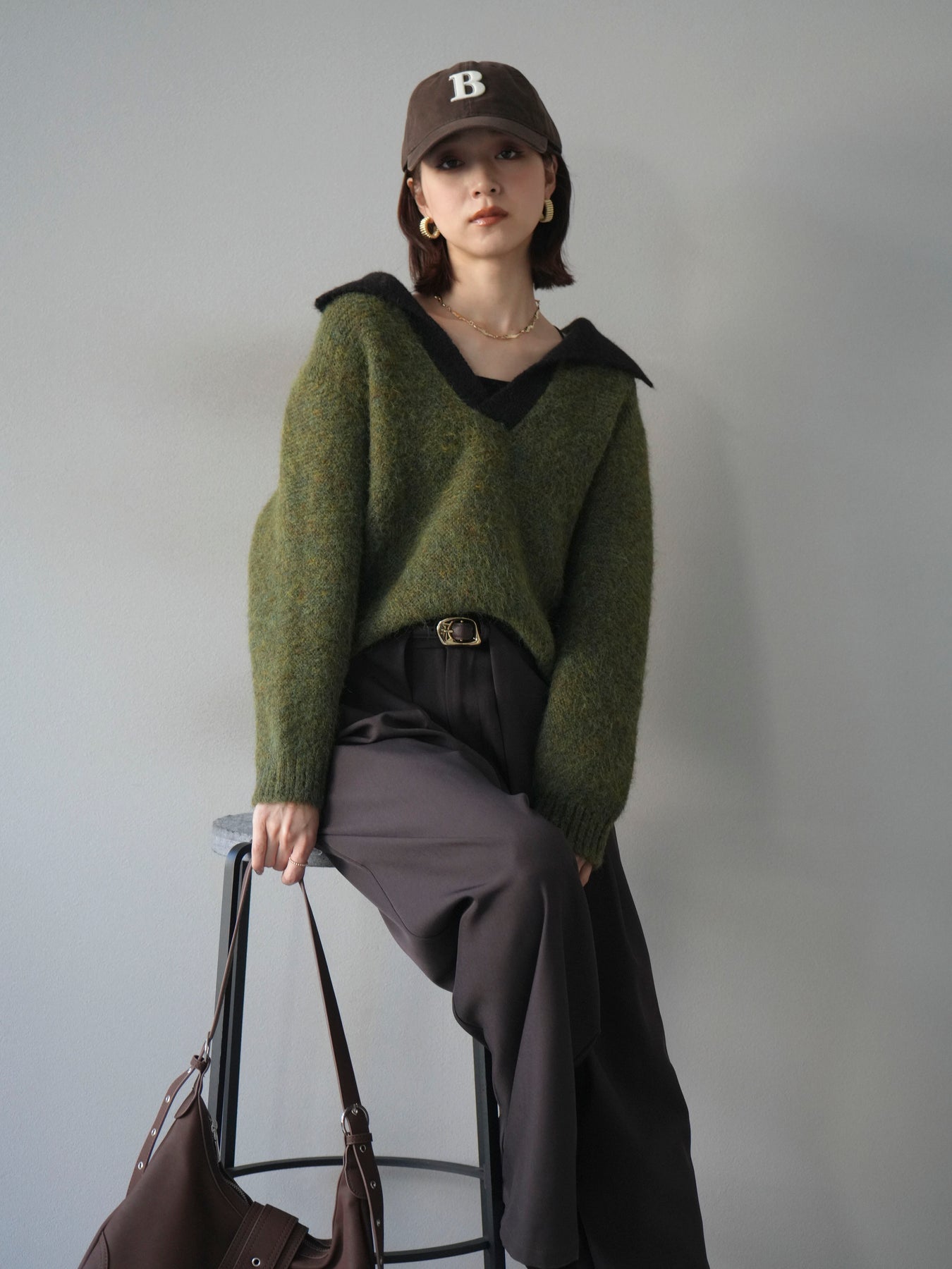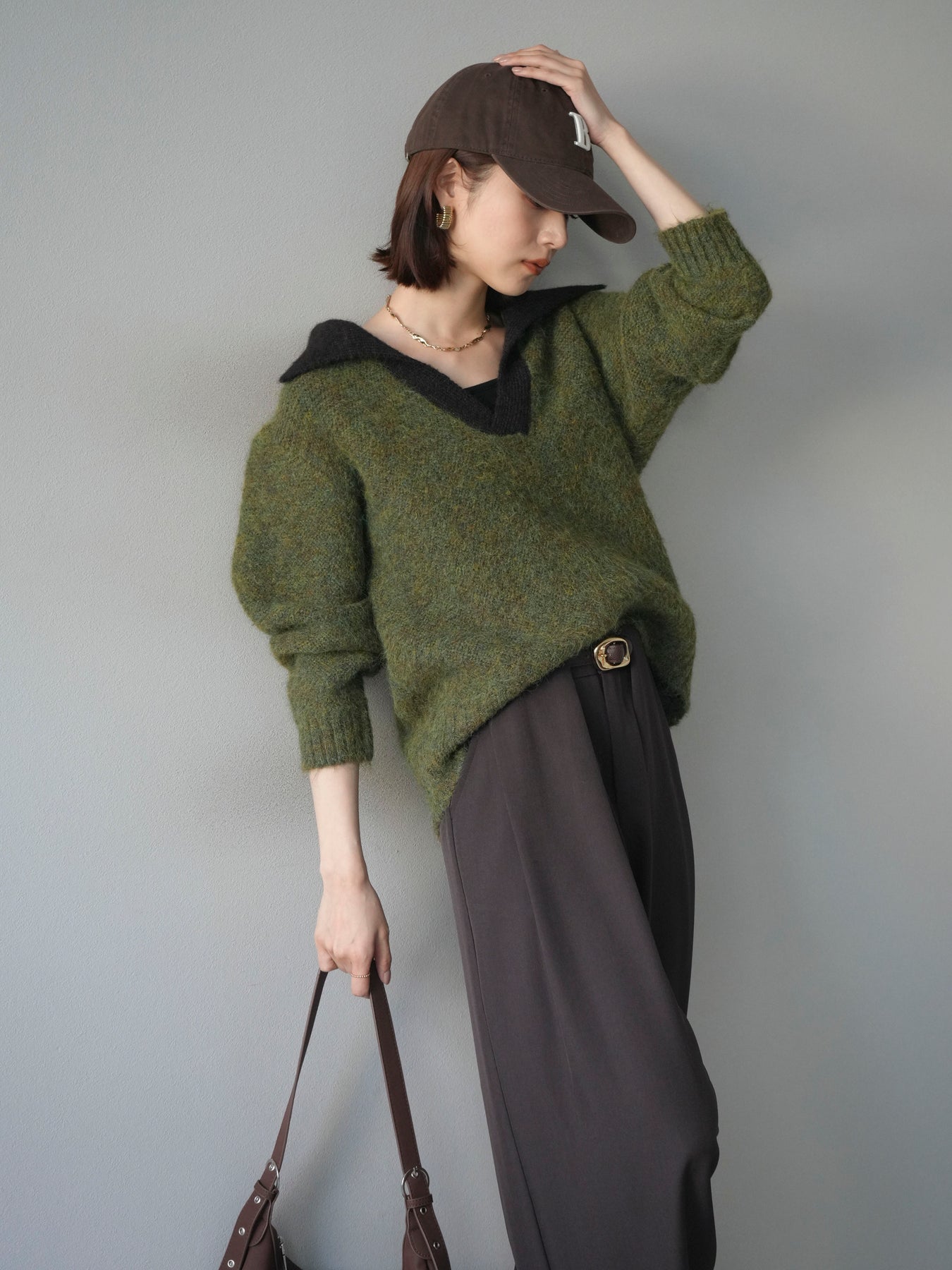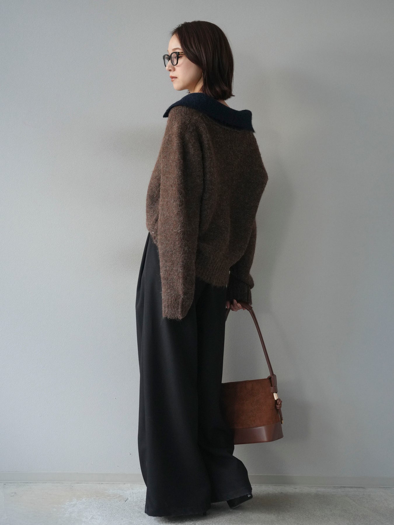 配色の襟デザインが目を惹くニットプルオーバー。 ふんわりとしたモヘアタッチの素材が柔らかく、優しい風合いを演出します。 ゆったりとしたシルエットと程よい着丈で、ボトムを選ばずバランスよく着こなせる一枚。 襟元のバイカラーデザインがコーディネートにアクセントを加え、シンプルながらも洗練された印象に仕上がります。 デイリーからお出かけまで幅広く活躍する、シーズンムード漂うニットです。 ※ボトムス、キャミソール(インナー)以外の商品は一律でインナーは付属していません。