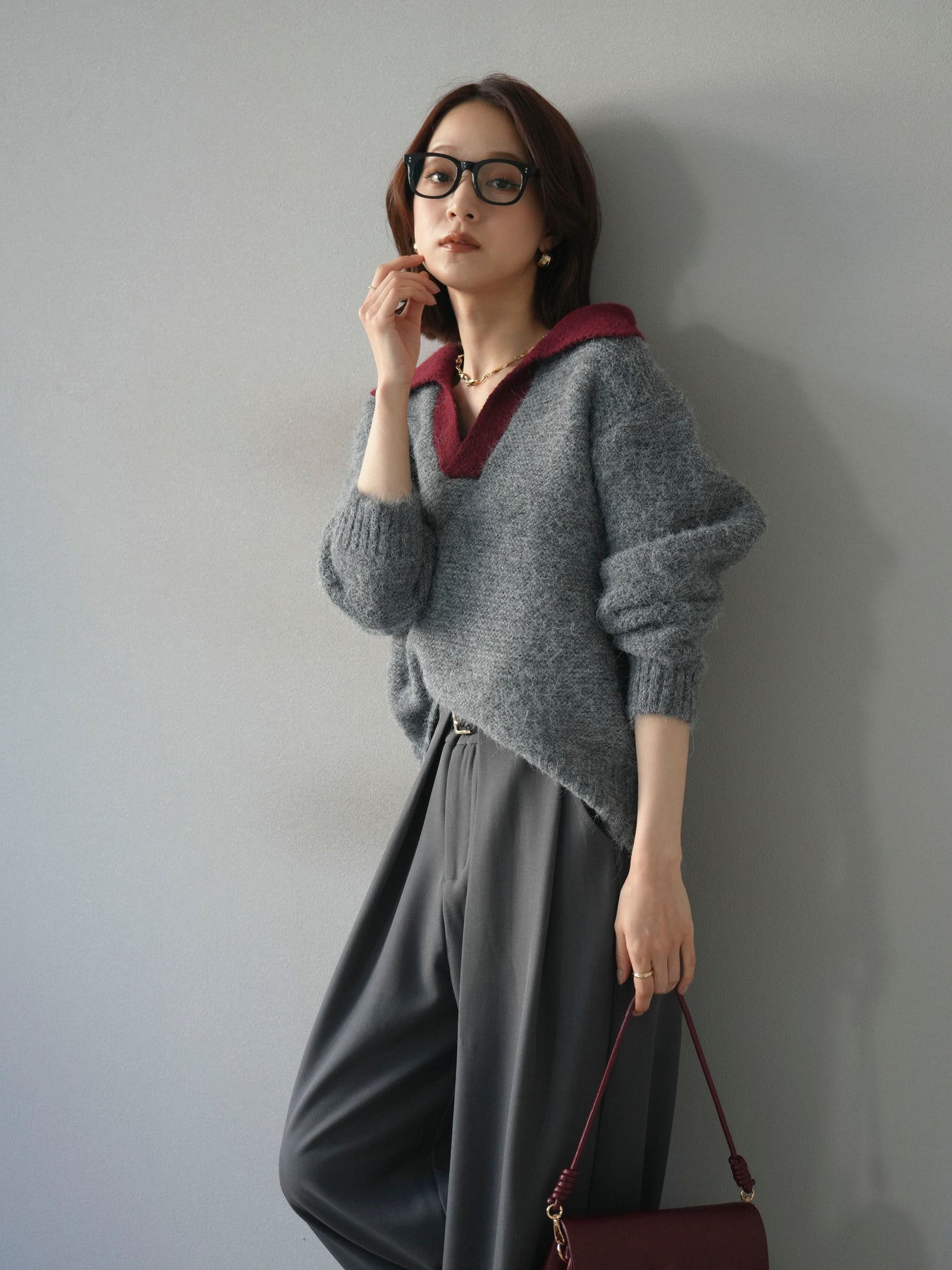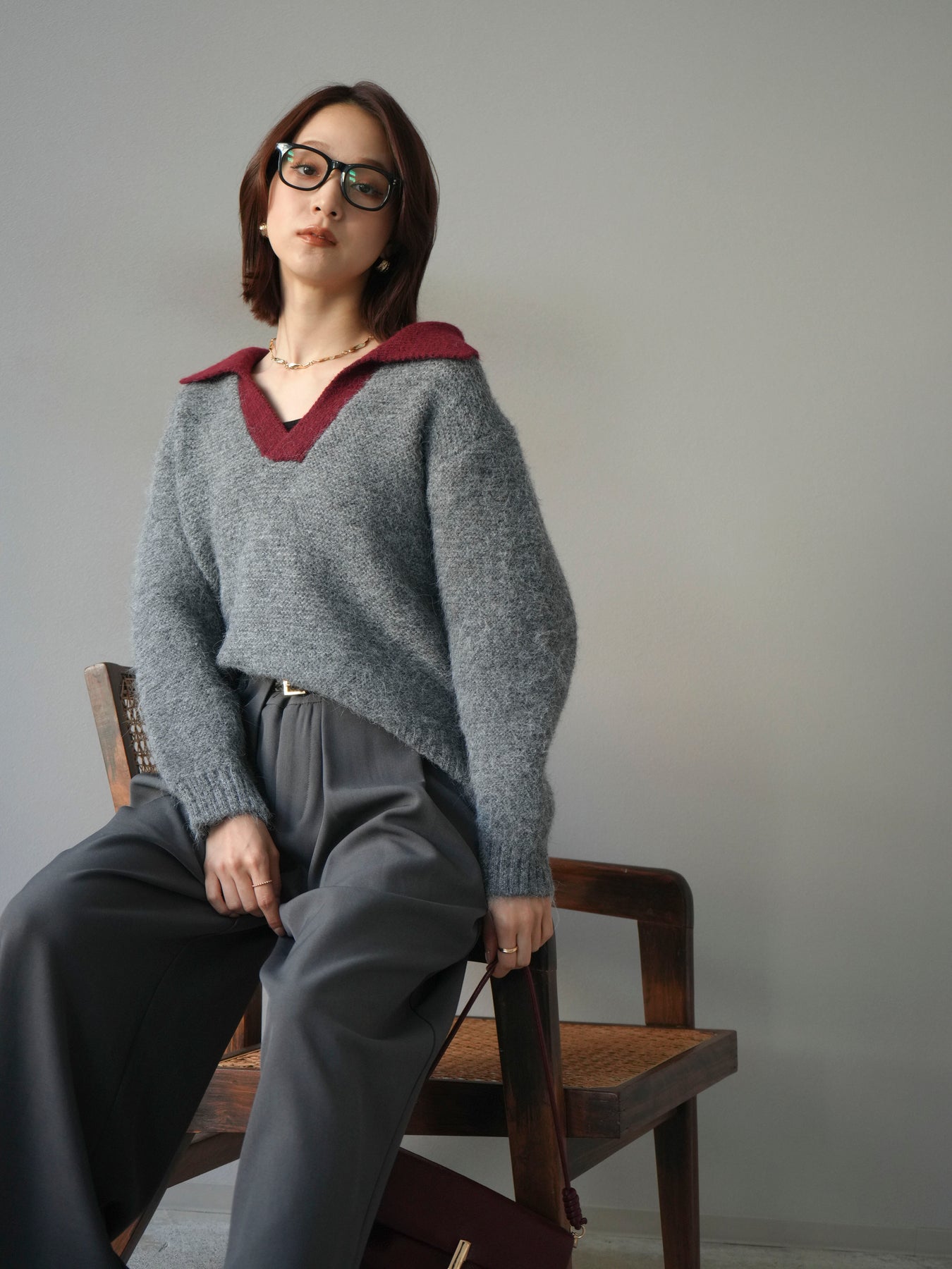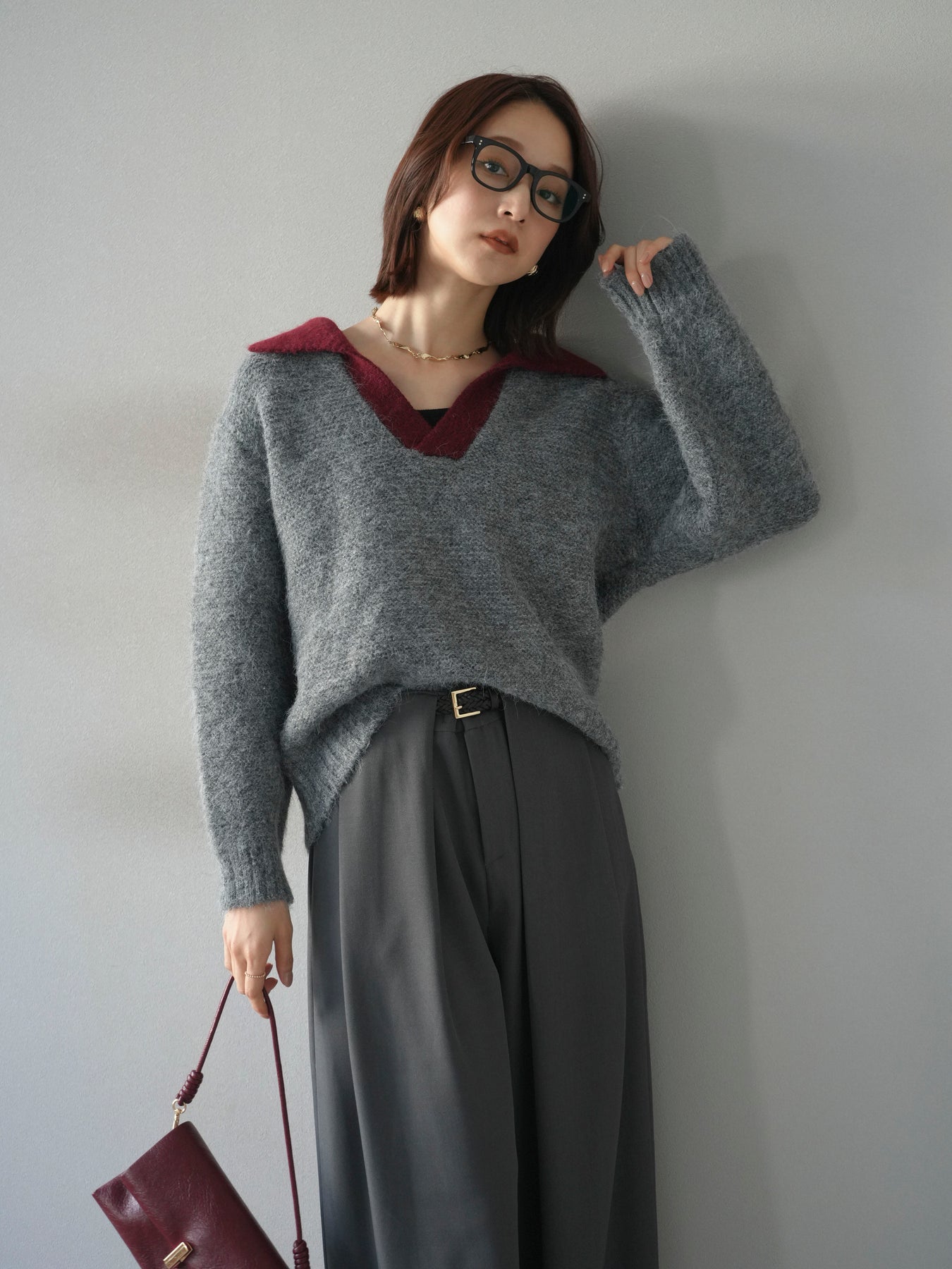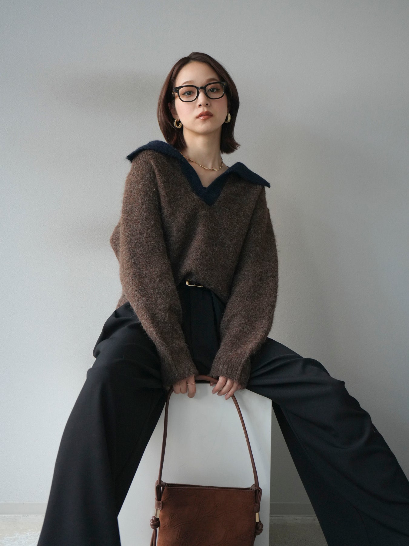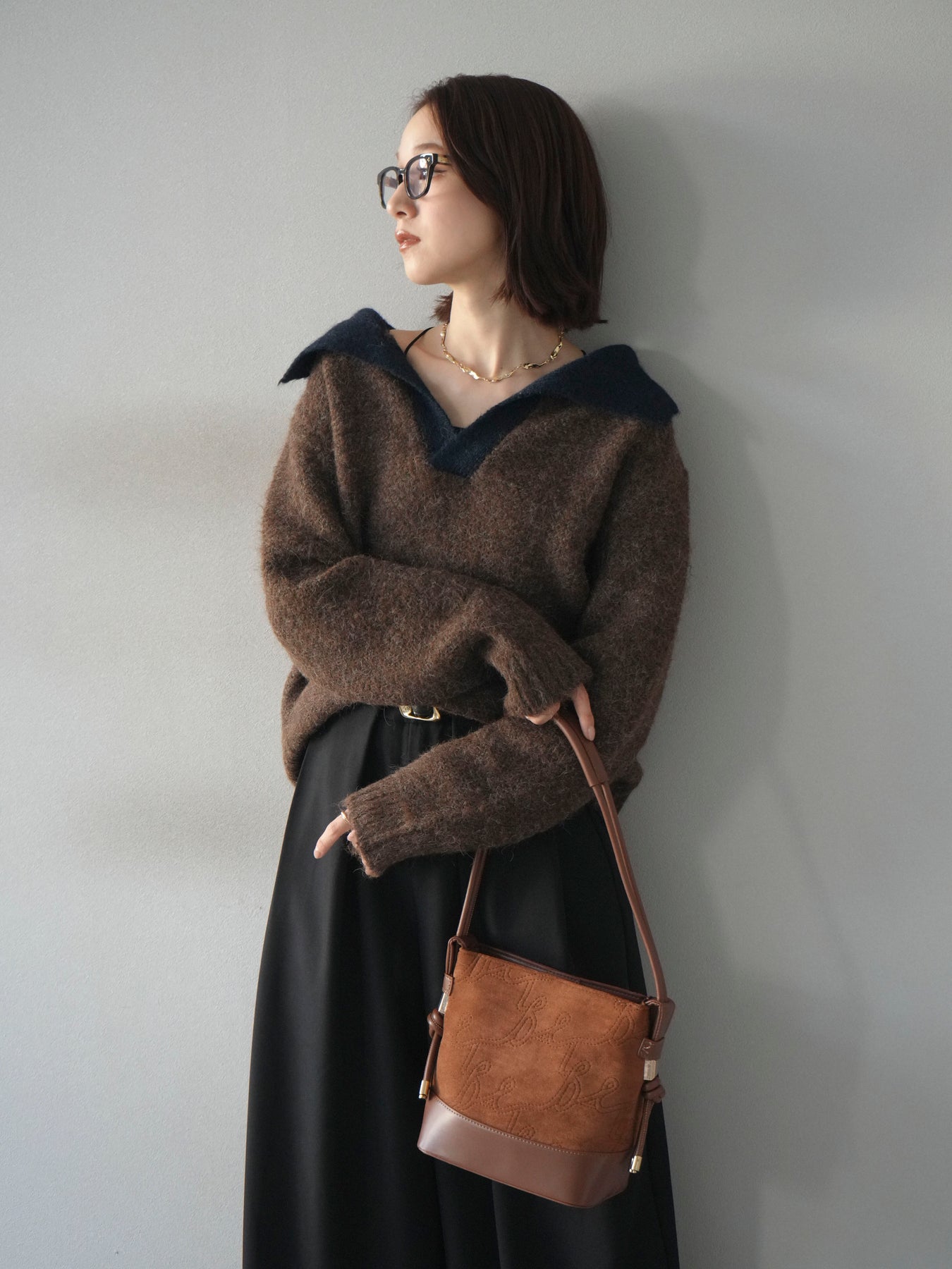 配色の襟デザインが目を惹くニットプルオーバー。 ふんわりとしたモヘアタッチの素材が柔らかく、優しい風合いを演出します。 ゆったりとしたシルエットと程よい着丈で、ボトムを選ばずバランスよく着こなせる一枚。 襟元のバイカラーデザインがコーディネートにアクセントを加え、シンプルながらも洗練された印象に仕上がります。 デイリーからお出かけまで幅広く活躍する、シーズンムード漂うニットです。 ※ボトムス、キャミソール(インナー)以外の商品は一律でインナーは付属していません。