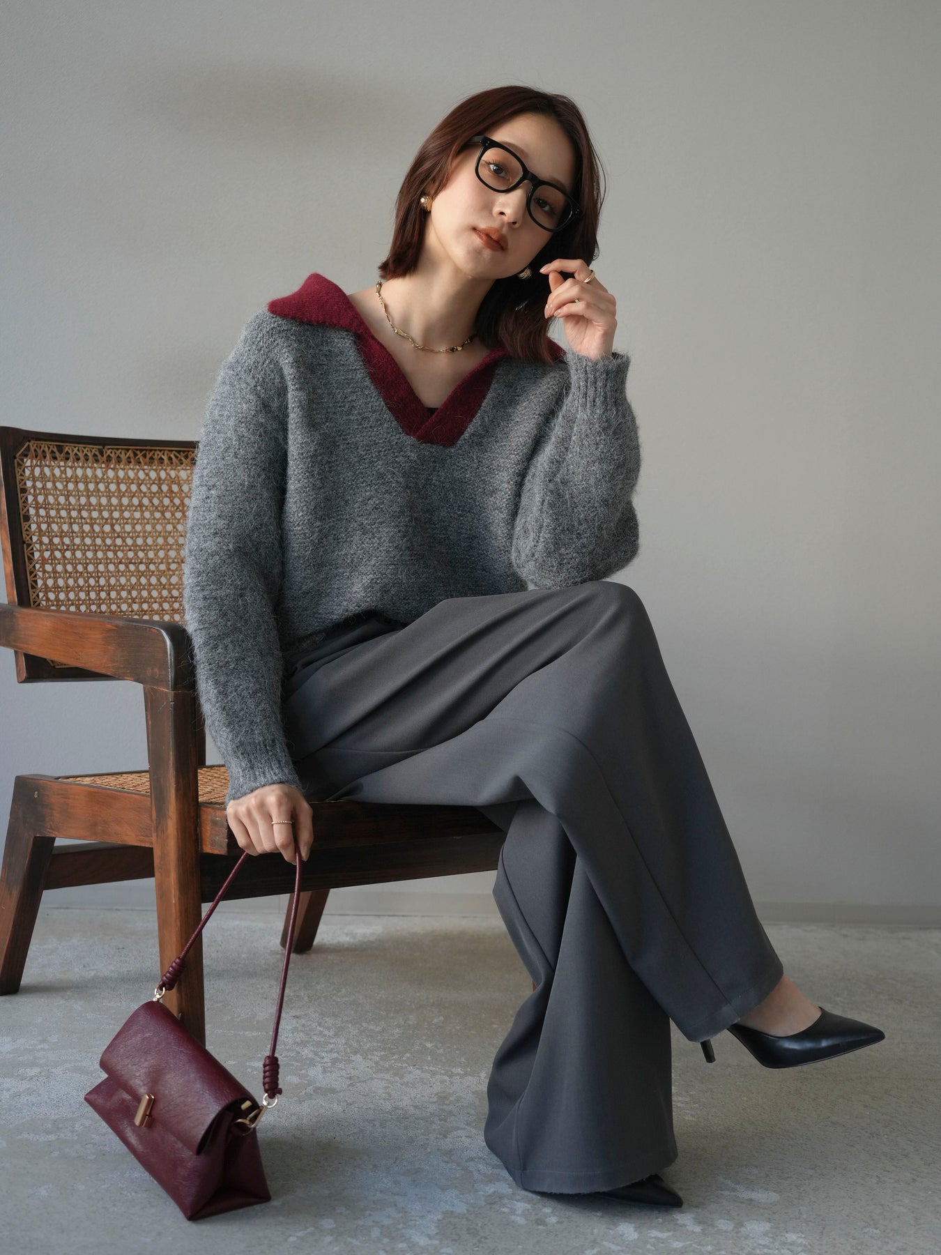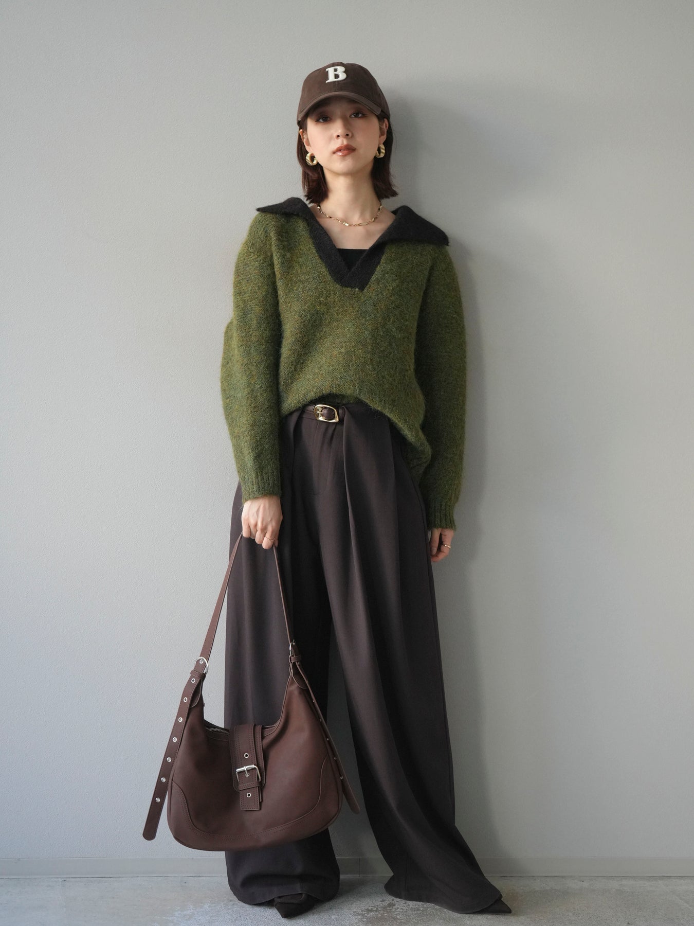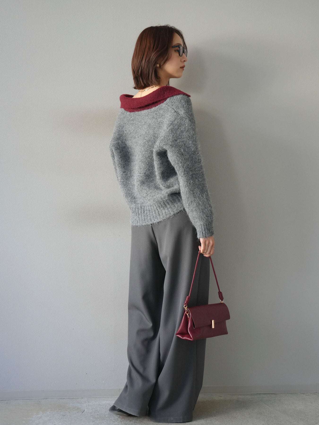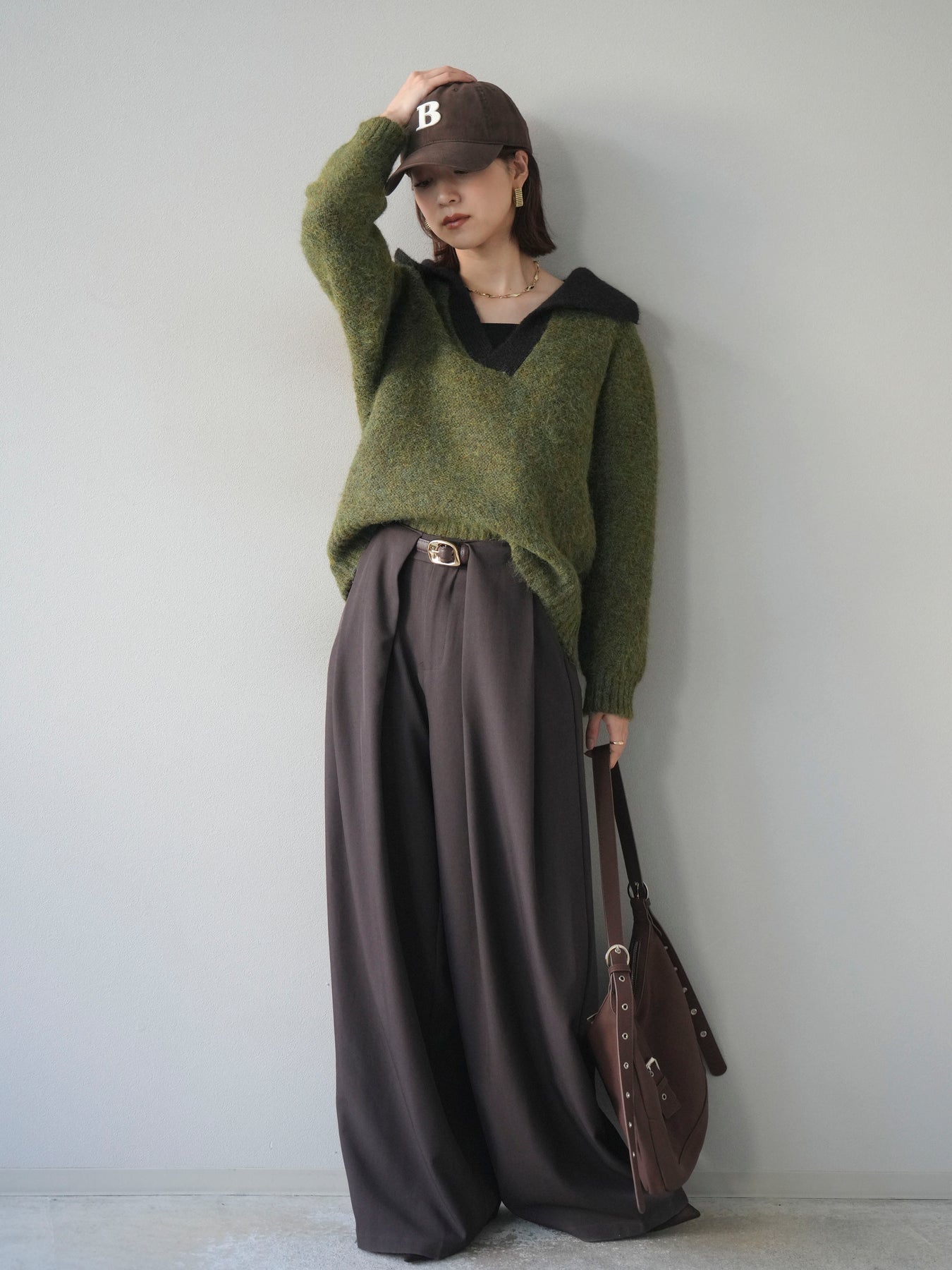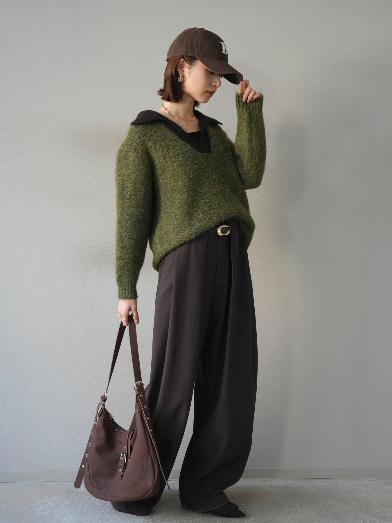 配色の襟デザインが目を惹くニットプルオーバー。 ふんわりとしたモヘアタッチの素材が柔らかく、優しい風合いを演出します。 ゆったりとしたシルエットと程よい着丈で、ボトムを選ばずバランスよく着こなせる一枚。 襟元のバイカラーデザインがコーディネートにアクセントを加え、シンプルながらも洗練された印象に仕上がります。 デイリーからお出かけまで幅広く活躍する、シーズンムード漂うニットです。 ※ボトムス、キャミソール(インナー)以外の商品は一律でインナーは付属していません。