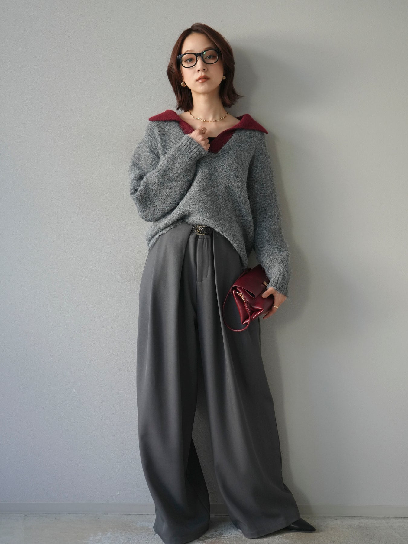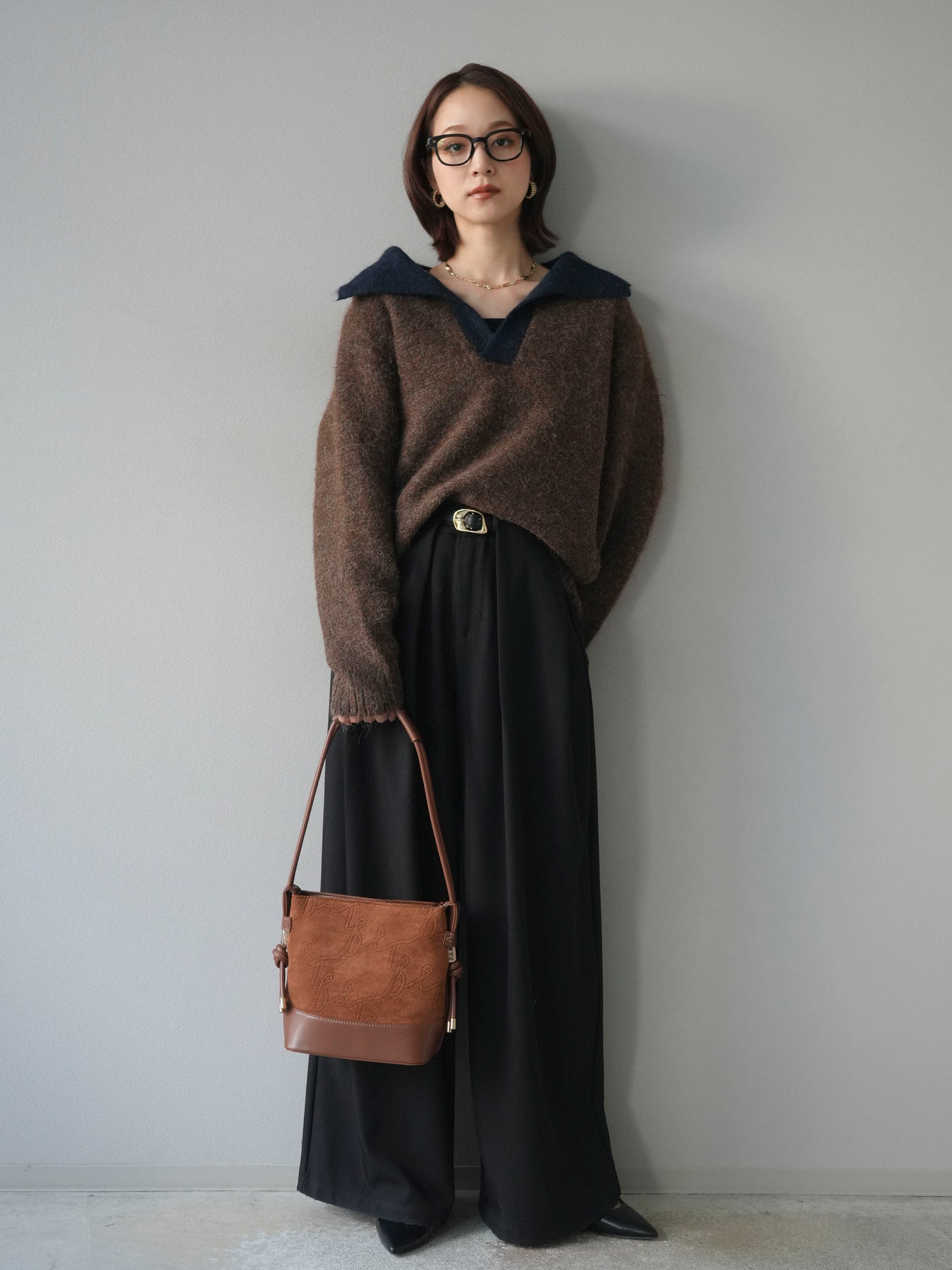 [SET]バイカラー襟付きニットプルオーバー+ベルトループデザインワイドパンツ(2set)