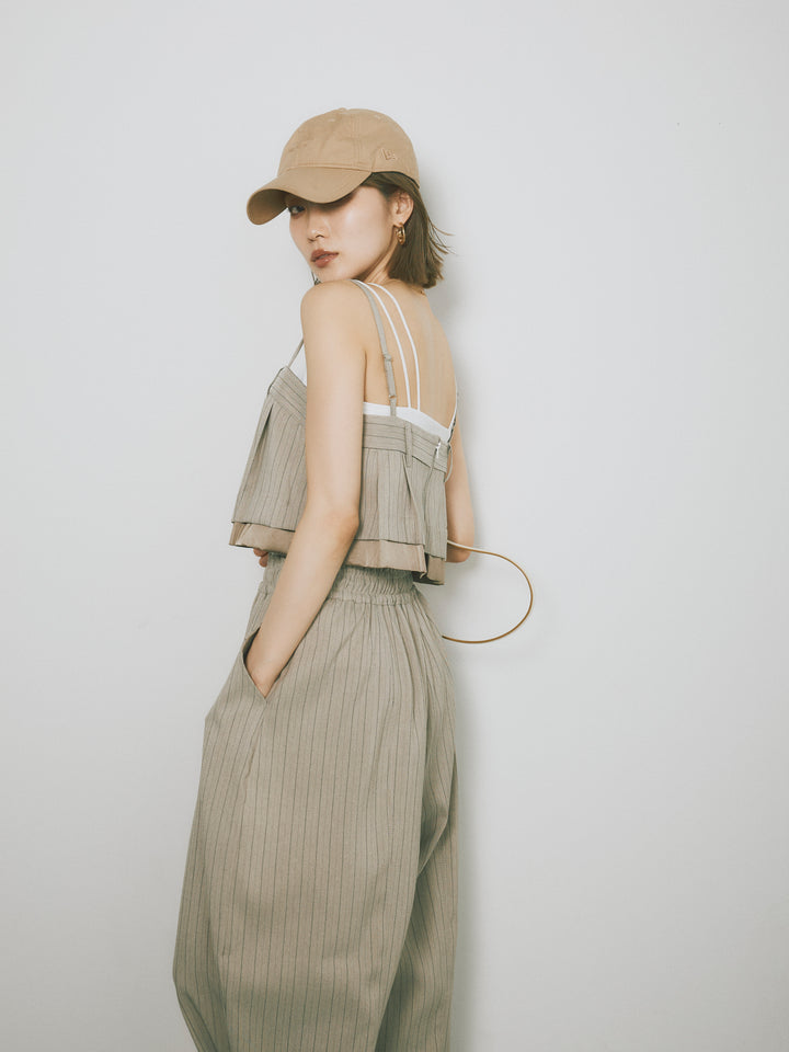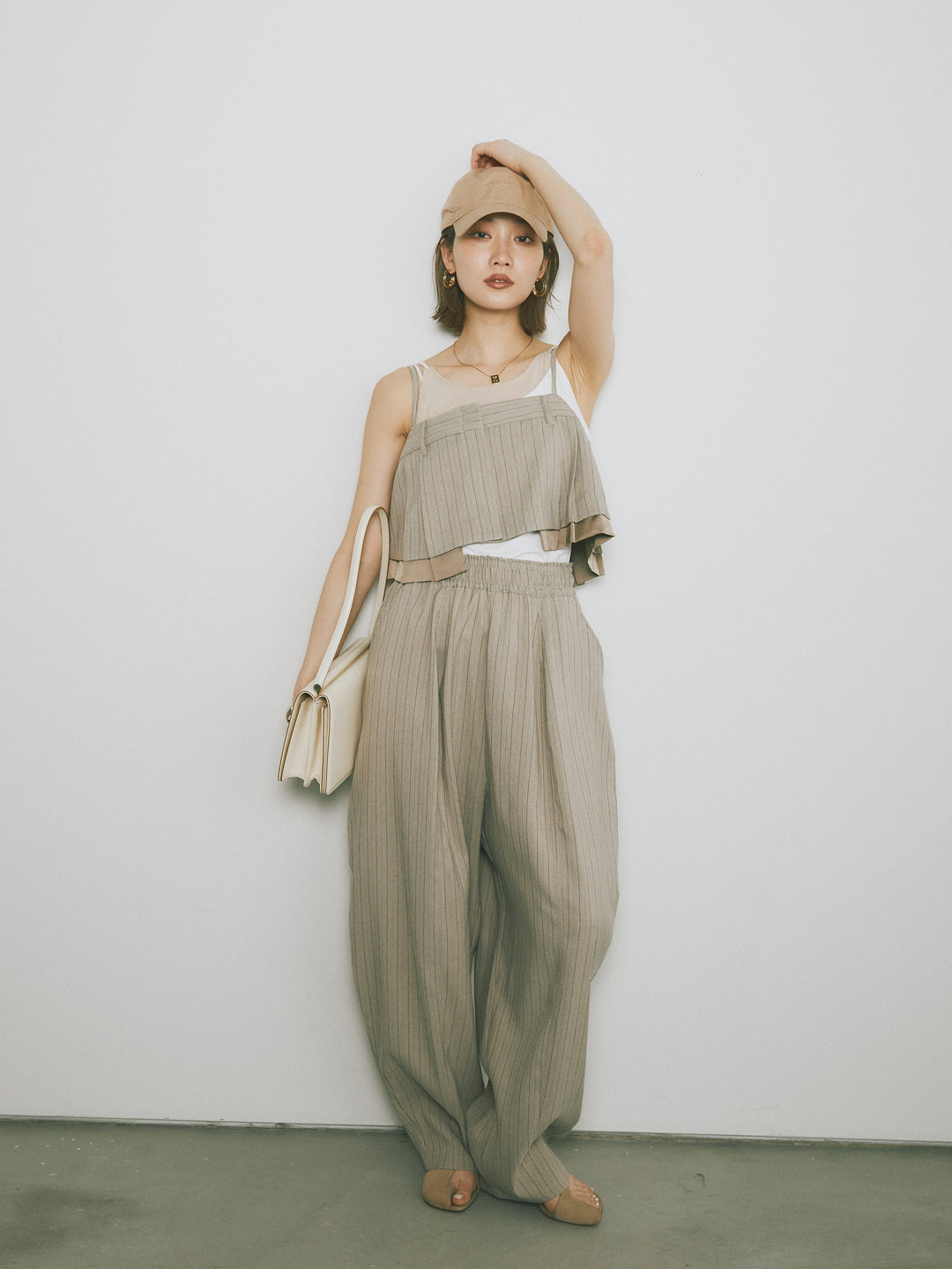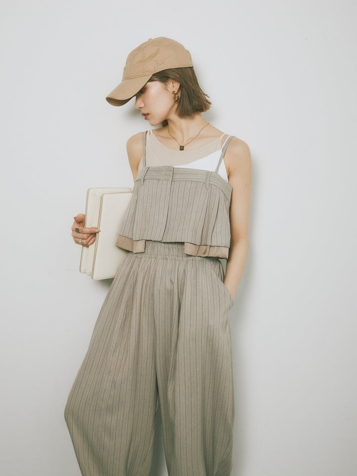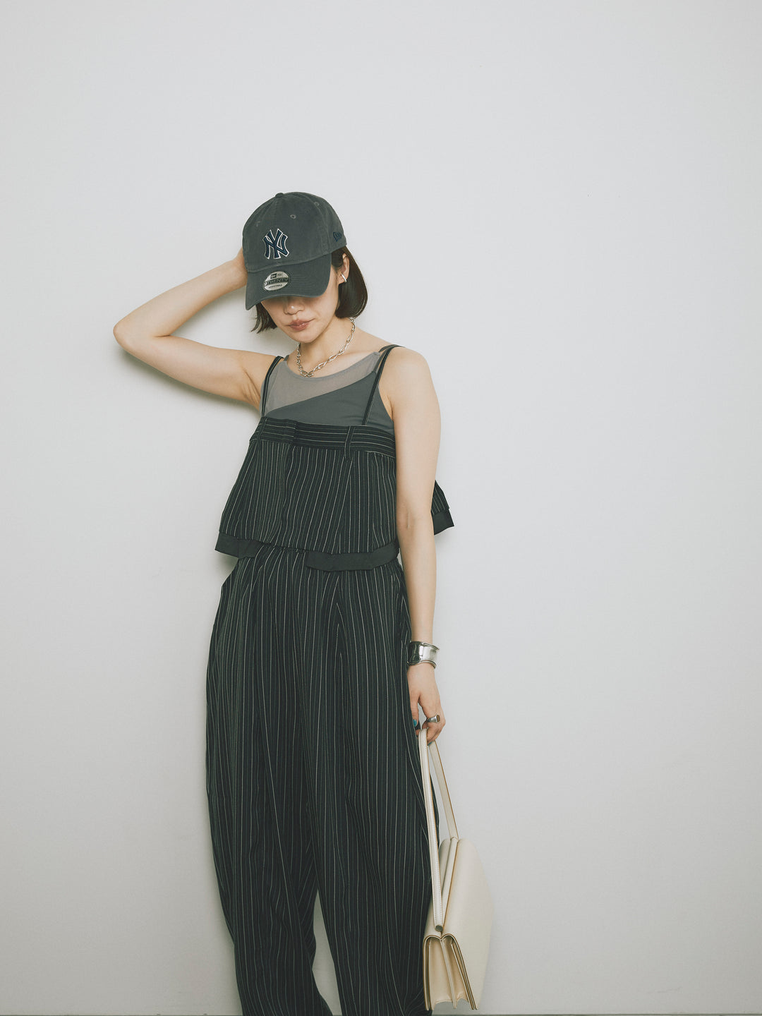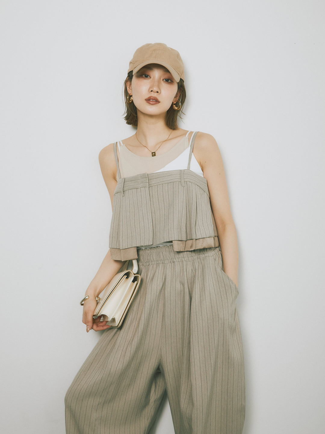 マニッシュなピンストライプ柄を、トレンドライクなキャミビスチェに落とし込んだ主役トップス。コンパクトながらも立体的なシルエットで、着るだけでスタイリングをアップデートしてくれます。シンプルなカットソーやシアートップスとのレイヤードもおすすめ。程よくモード感を演出しながら、洗練された印象に仕上げてくれる一着です。 ※ボトムス、キャミソール(インナー)以外の商品は一律でインナーは付属していません