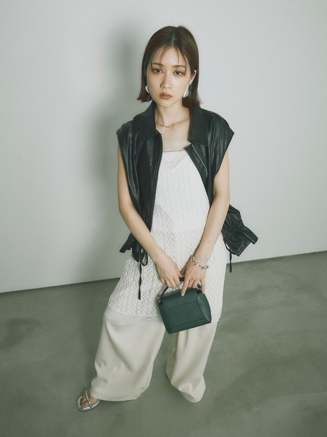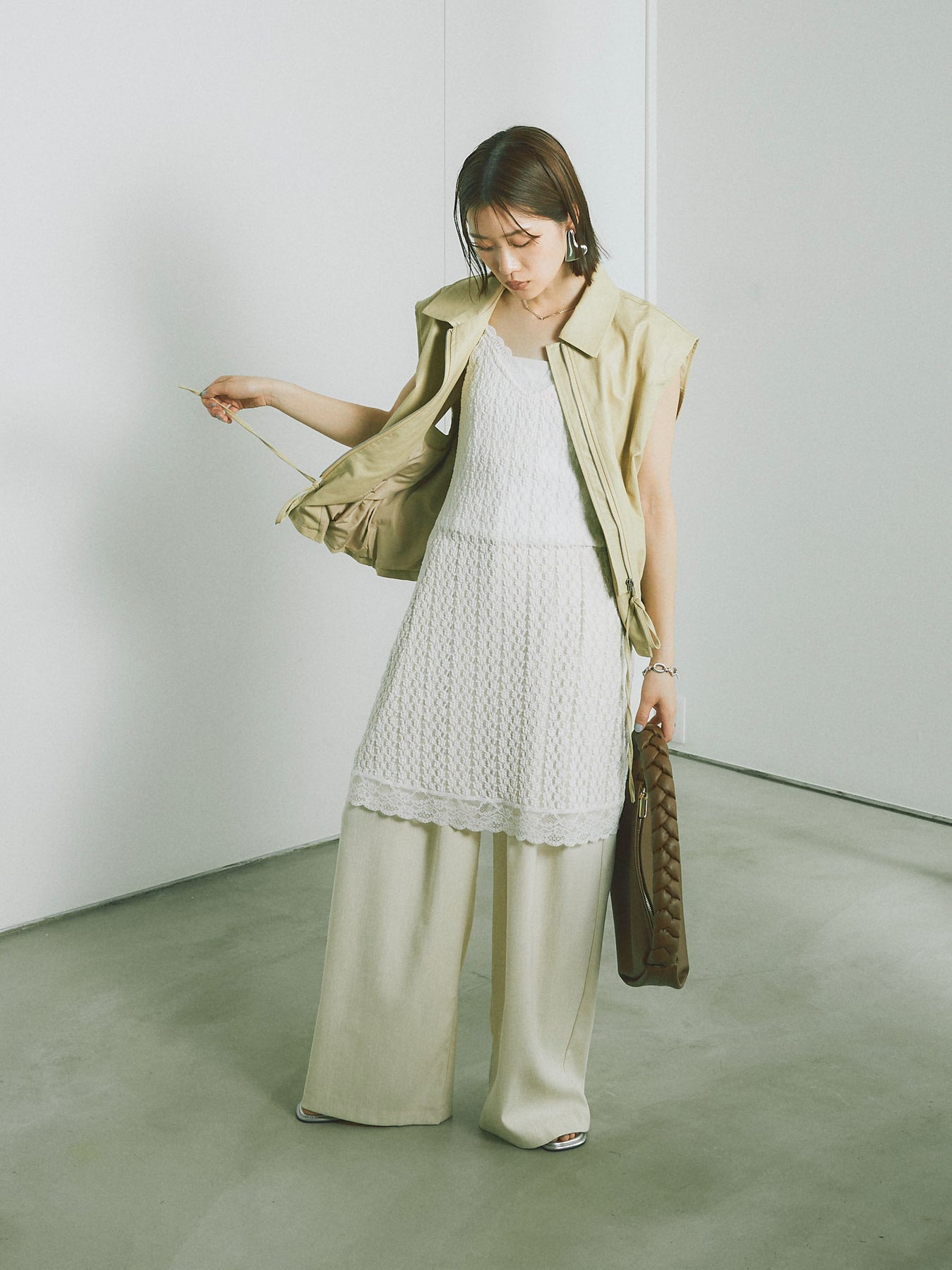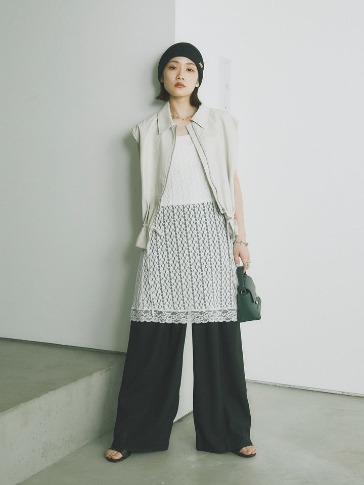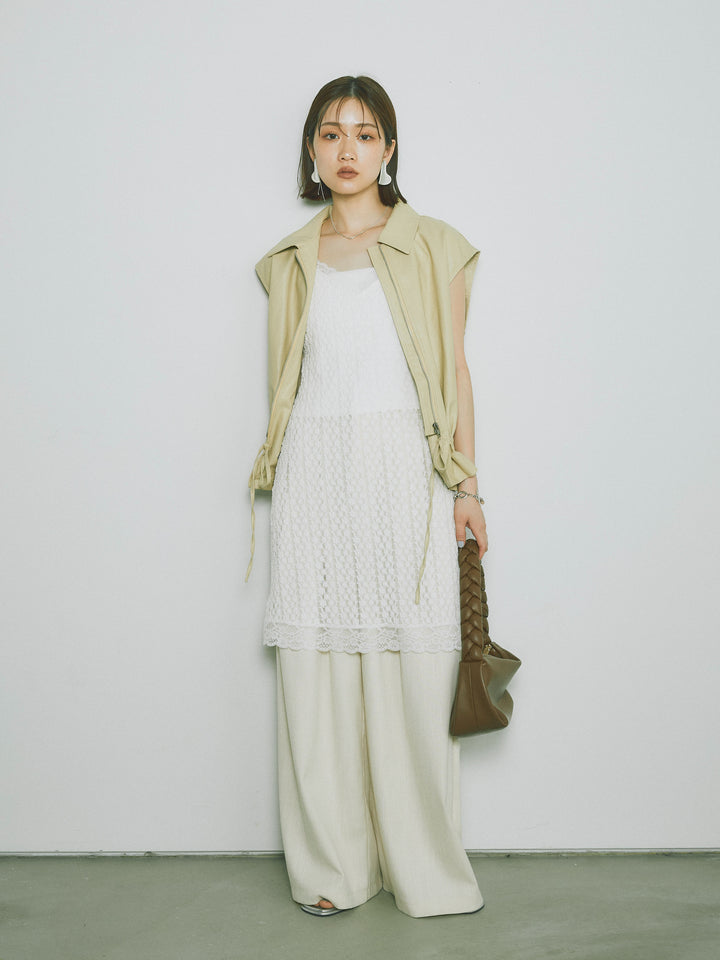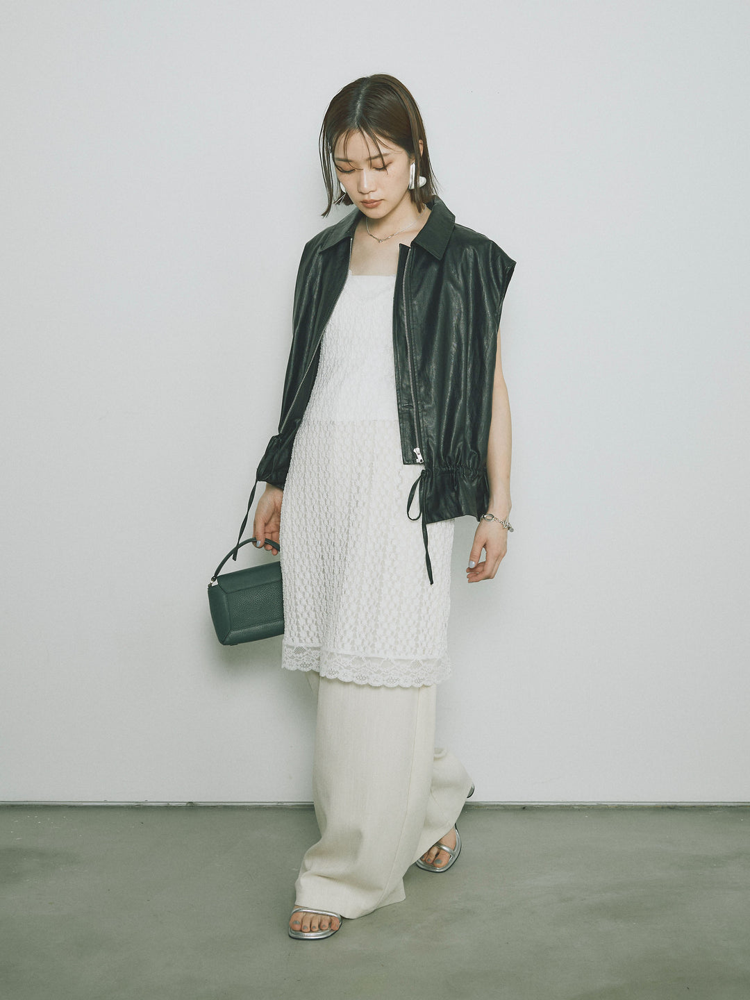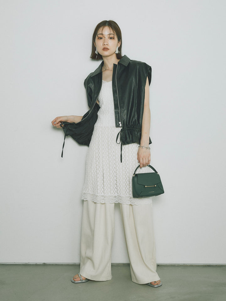 [SET]フェイクレザーノースリーブジャケット+レースキャミミニワンピース+リネンタッチダブルタックワイドパンツ(3set)