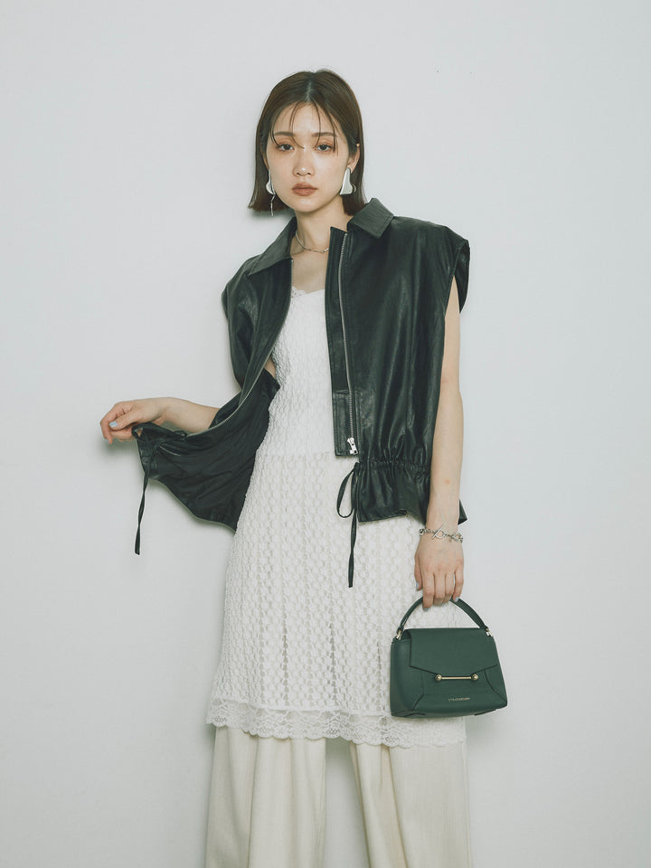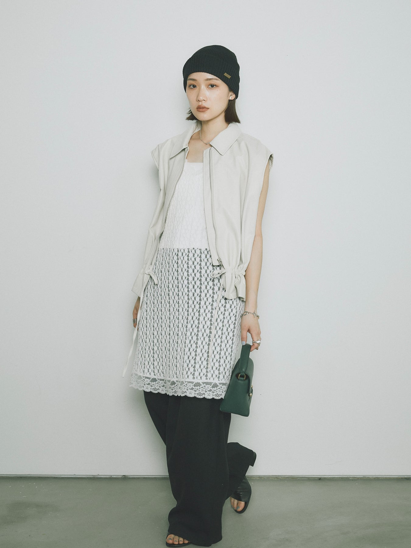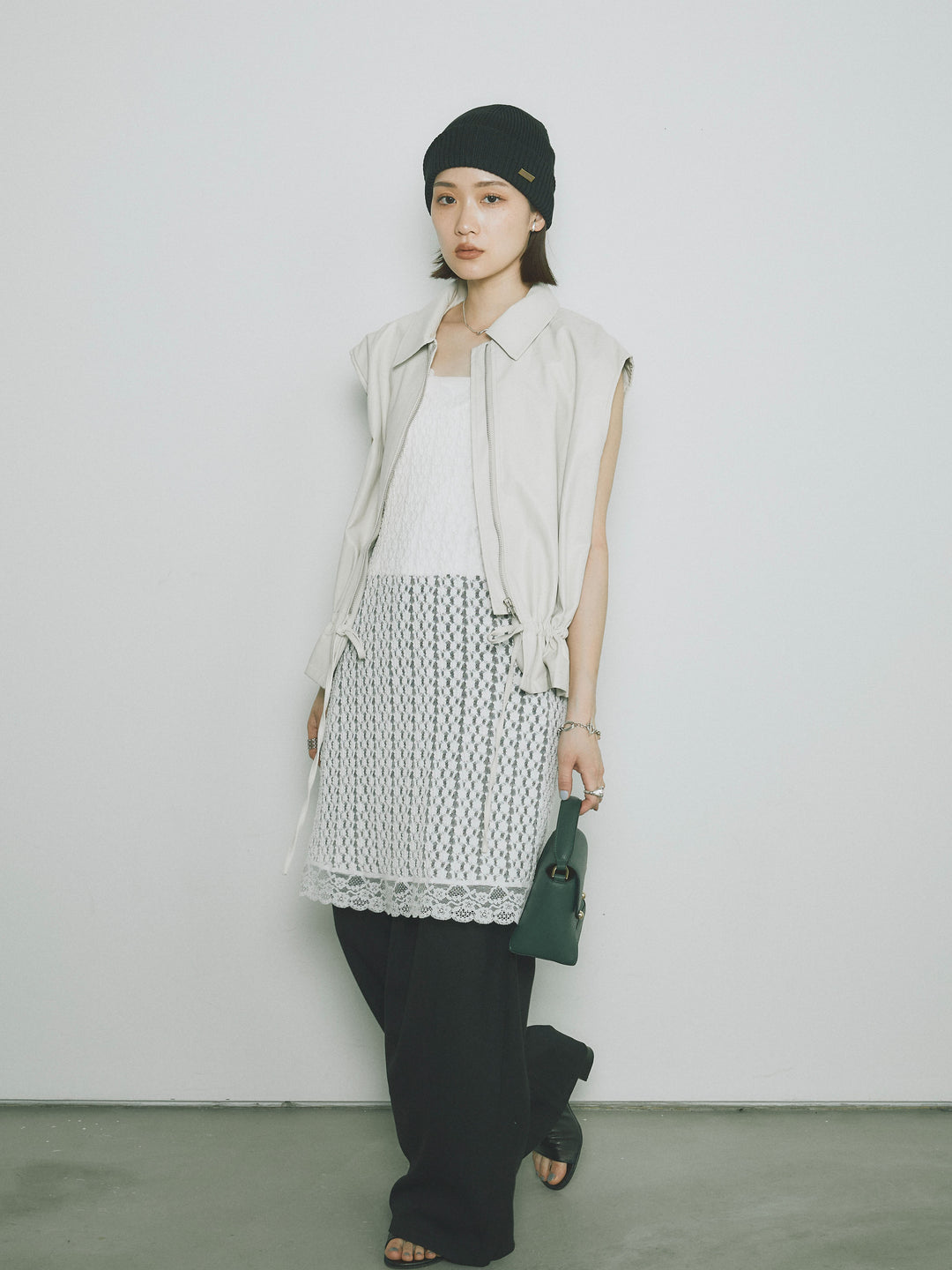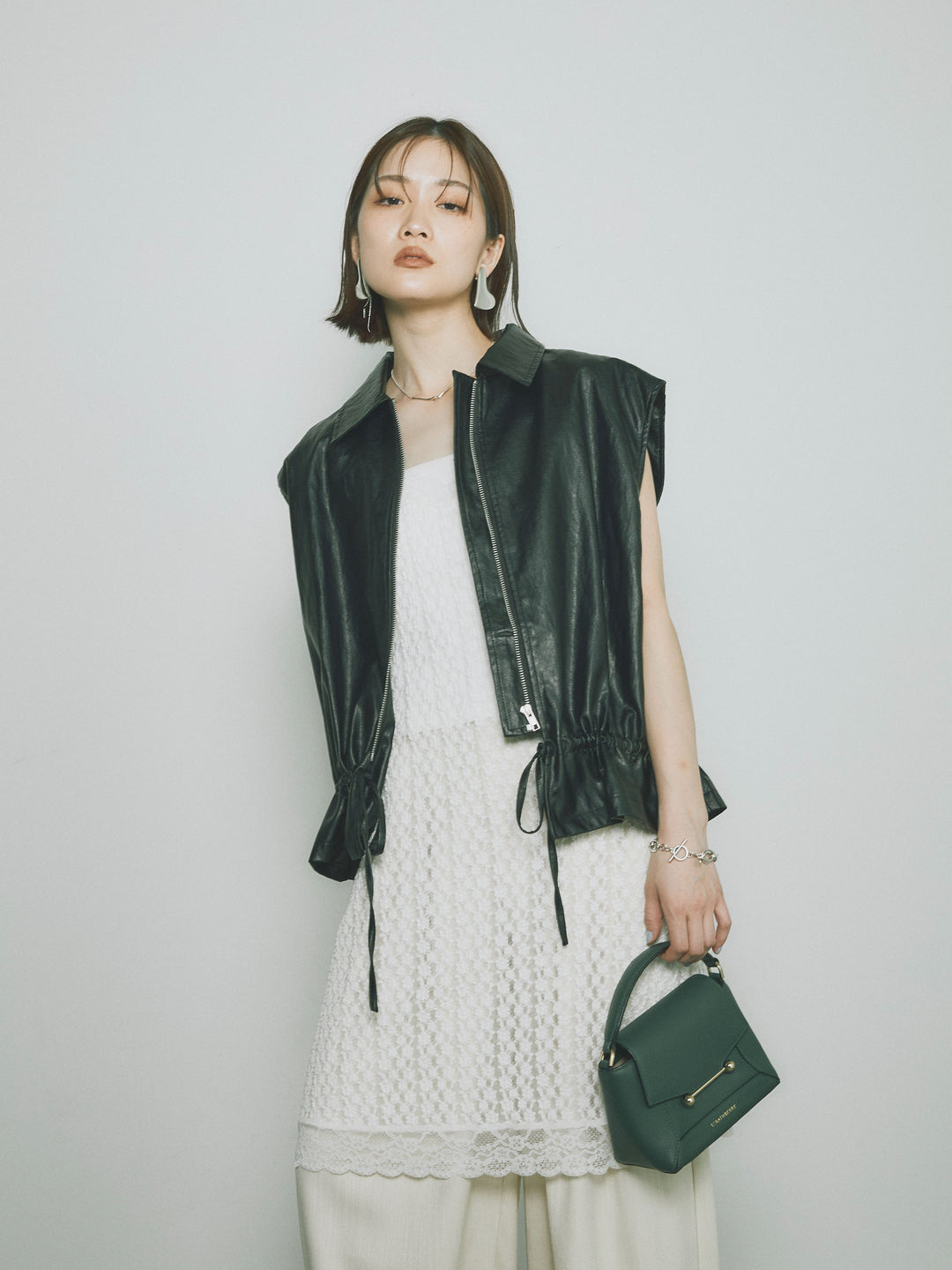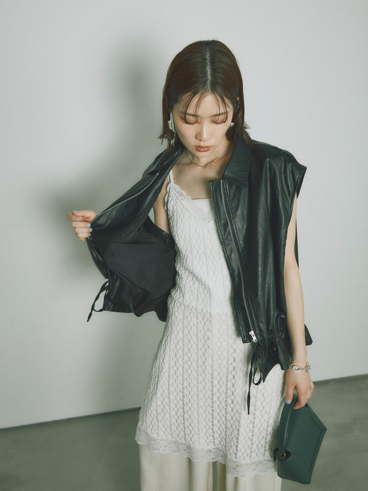 [SET]フェイクレザーノースリーブジャケット+レースキャミミニワンピース+リネンタッチダブルタックワイドパンツ(3set)