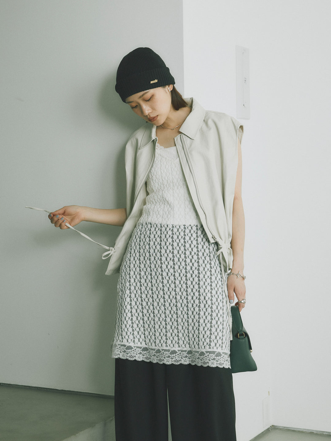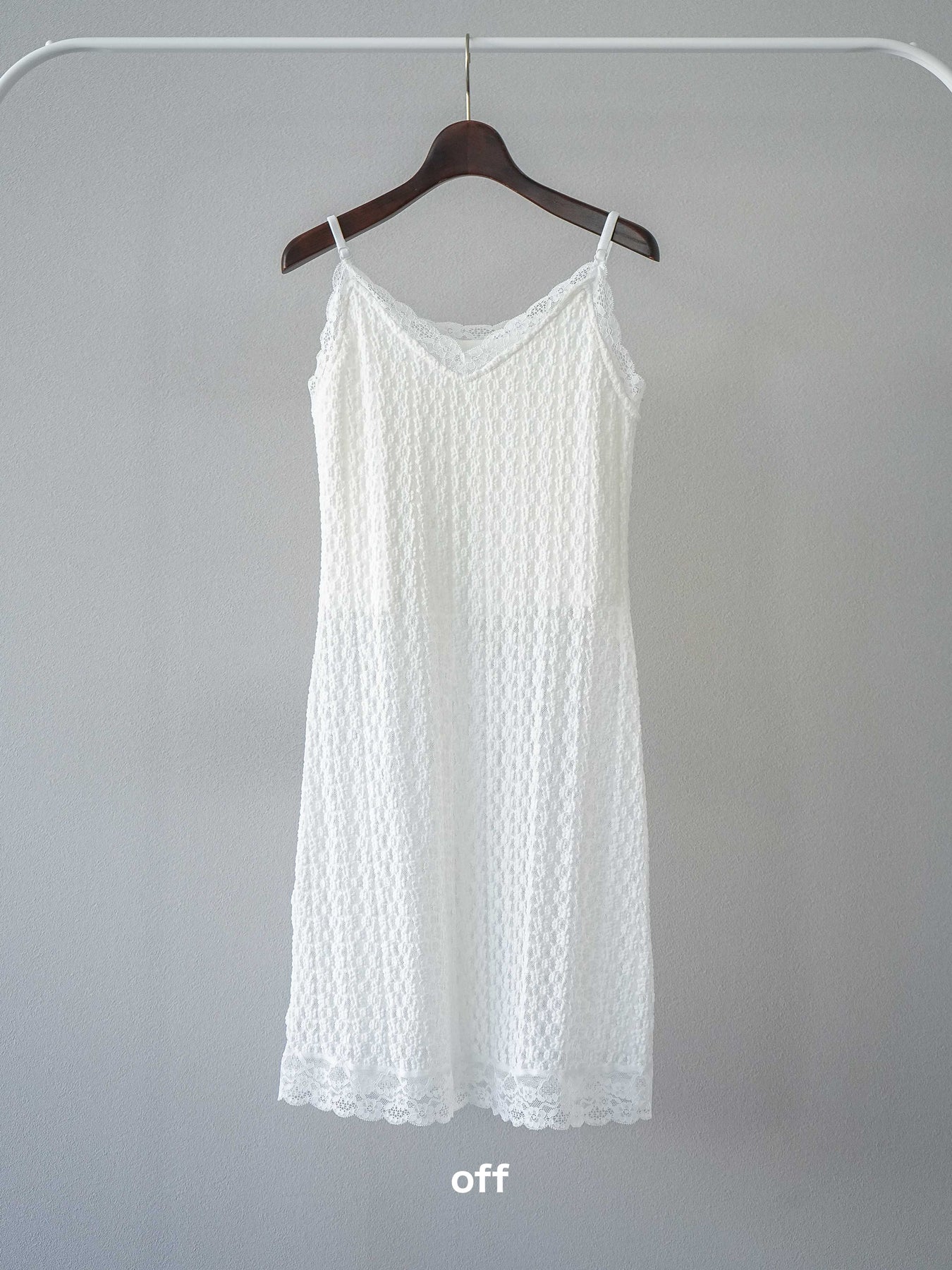 繊細なレース素材で仕立てたキャミソール型のミニワンピース。柔らかなレースが女性らしさを引き立て、リラックスした着心地を提供します。レースの縁取りが華やかさを加え、シンプルながらも上品な印象を与えます。単品としてはもちろん、重ね着にも活躍するアイテムです。清潔感のあるホワイトカラーが、軽やかな雰囲気を演出します。 ※ボトムス、キャミソール(インナー)以外の商品は一律でインナーは付属していません。