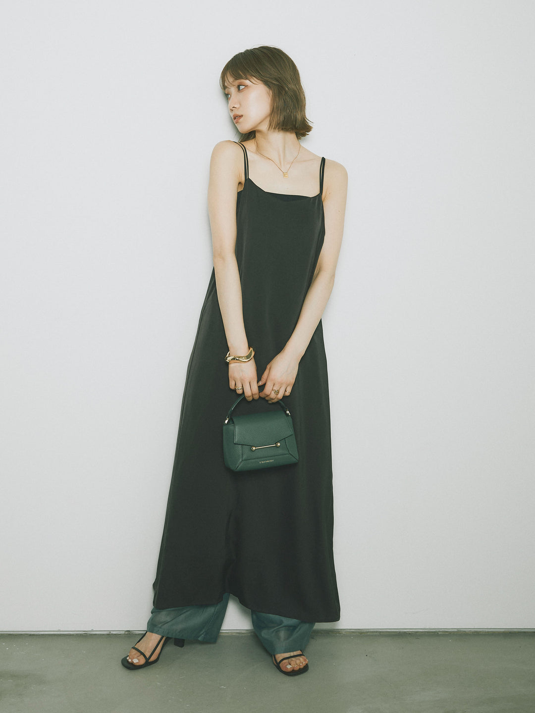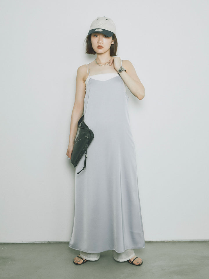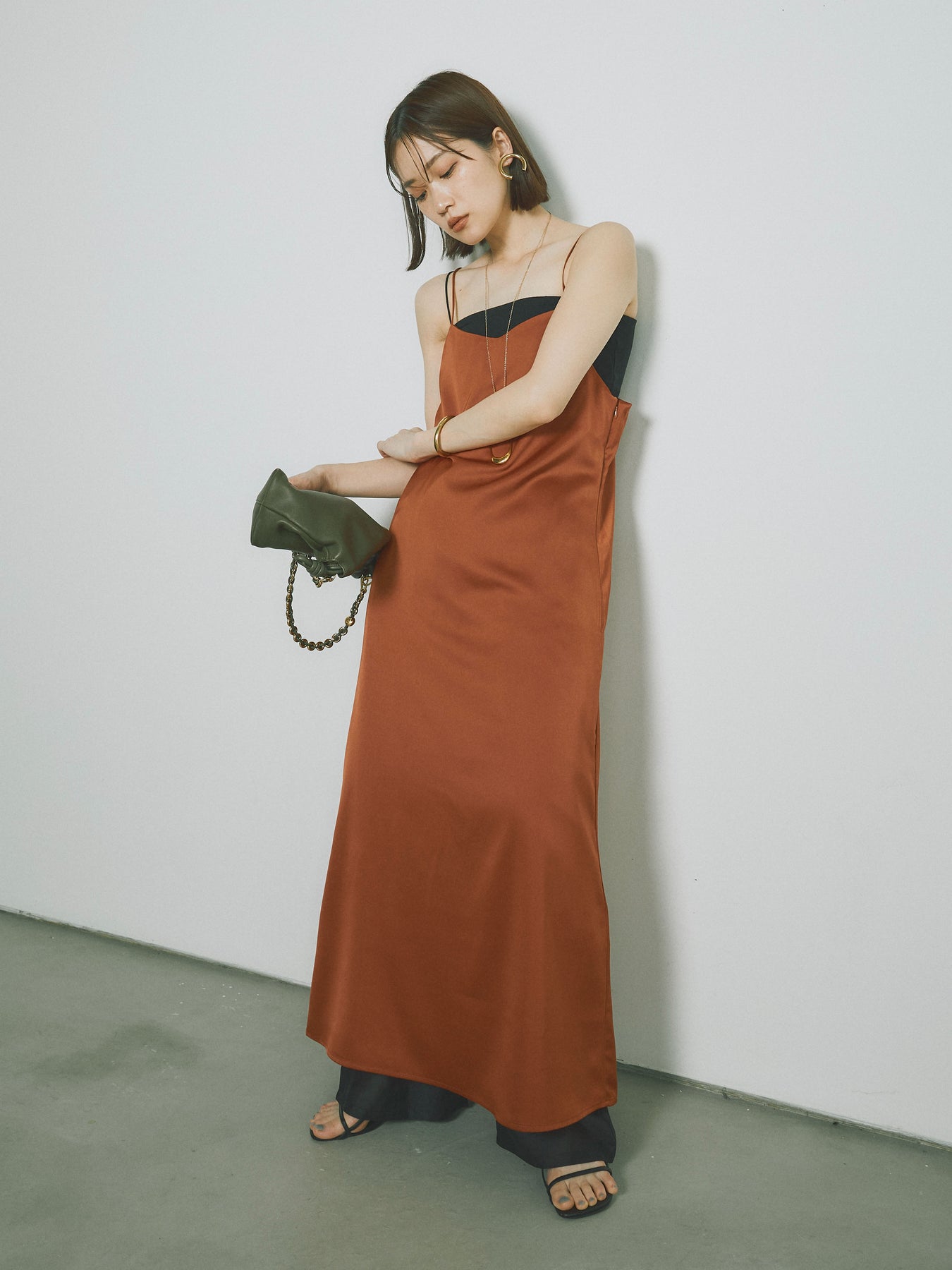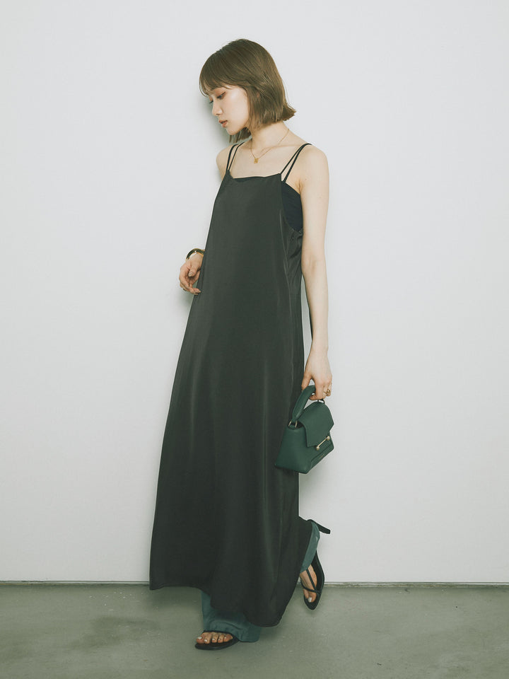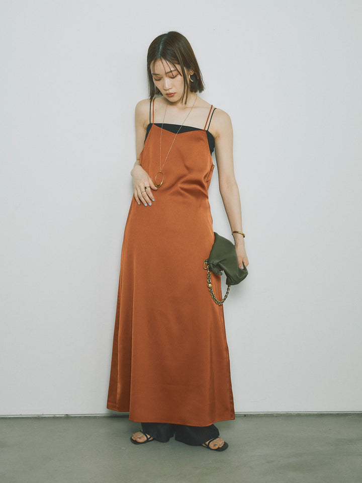 優雅なマットサテン素材で仕立てたキャミソール型のワンピース。落ち着いた光沢感があり、シンプルながらも洗練された印象を与えます。肩ひも部分は調整可能で、体型に合わせてフィット感を調整できます。リラックスしたシルエットで、デイリースタイルにも特別なシーンにもぴったり。シンプルでありながら、華やかさも感じさせる一枚です。 ※ボトムス、キャミソール(インナー)以外の商品は一律でインナーは付属していません。