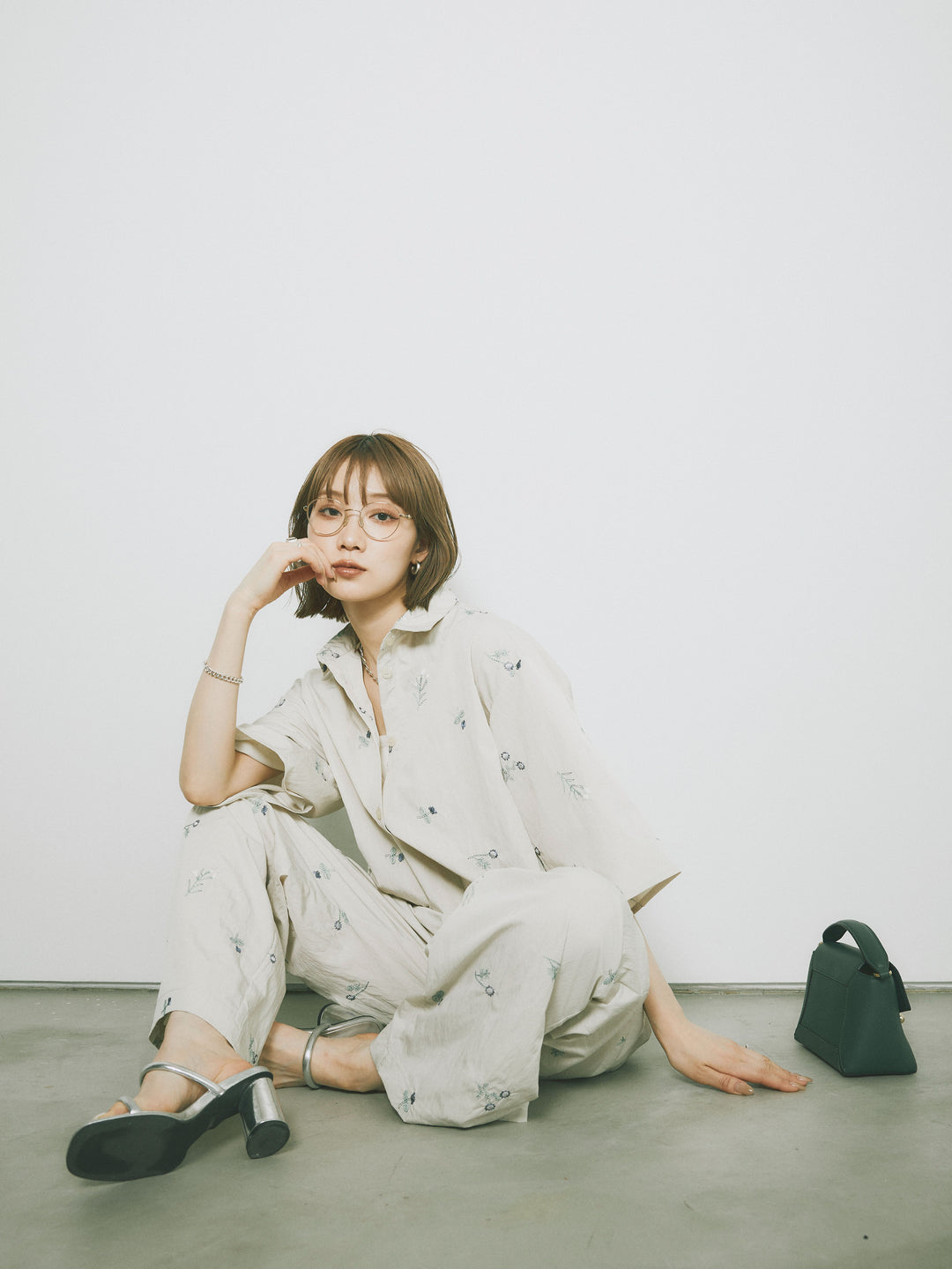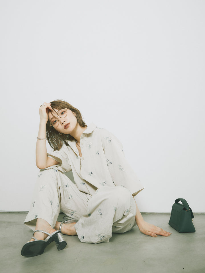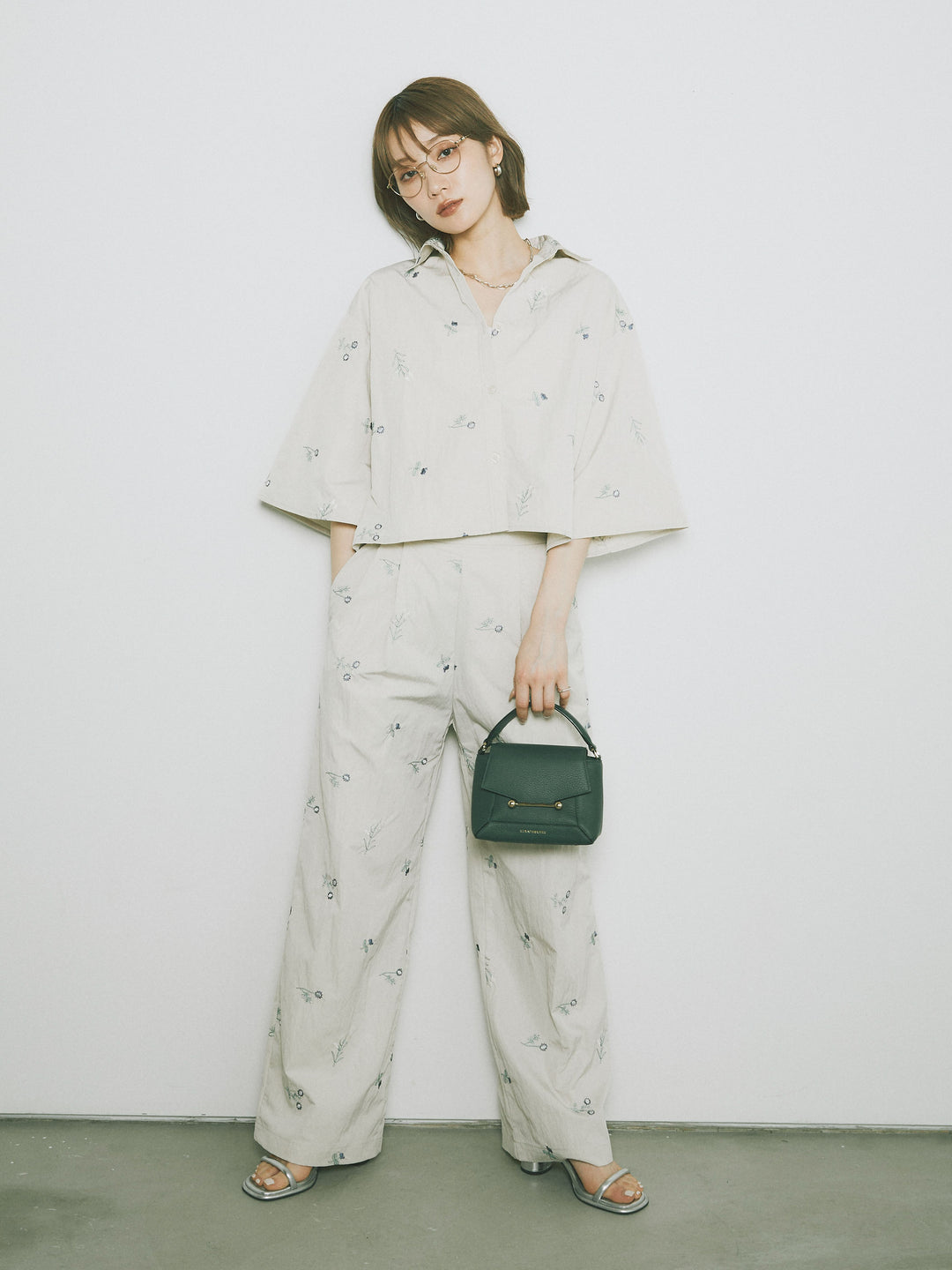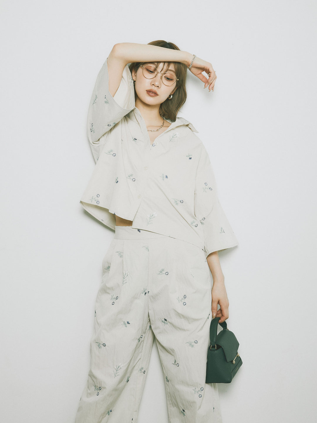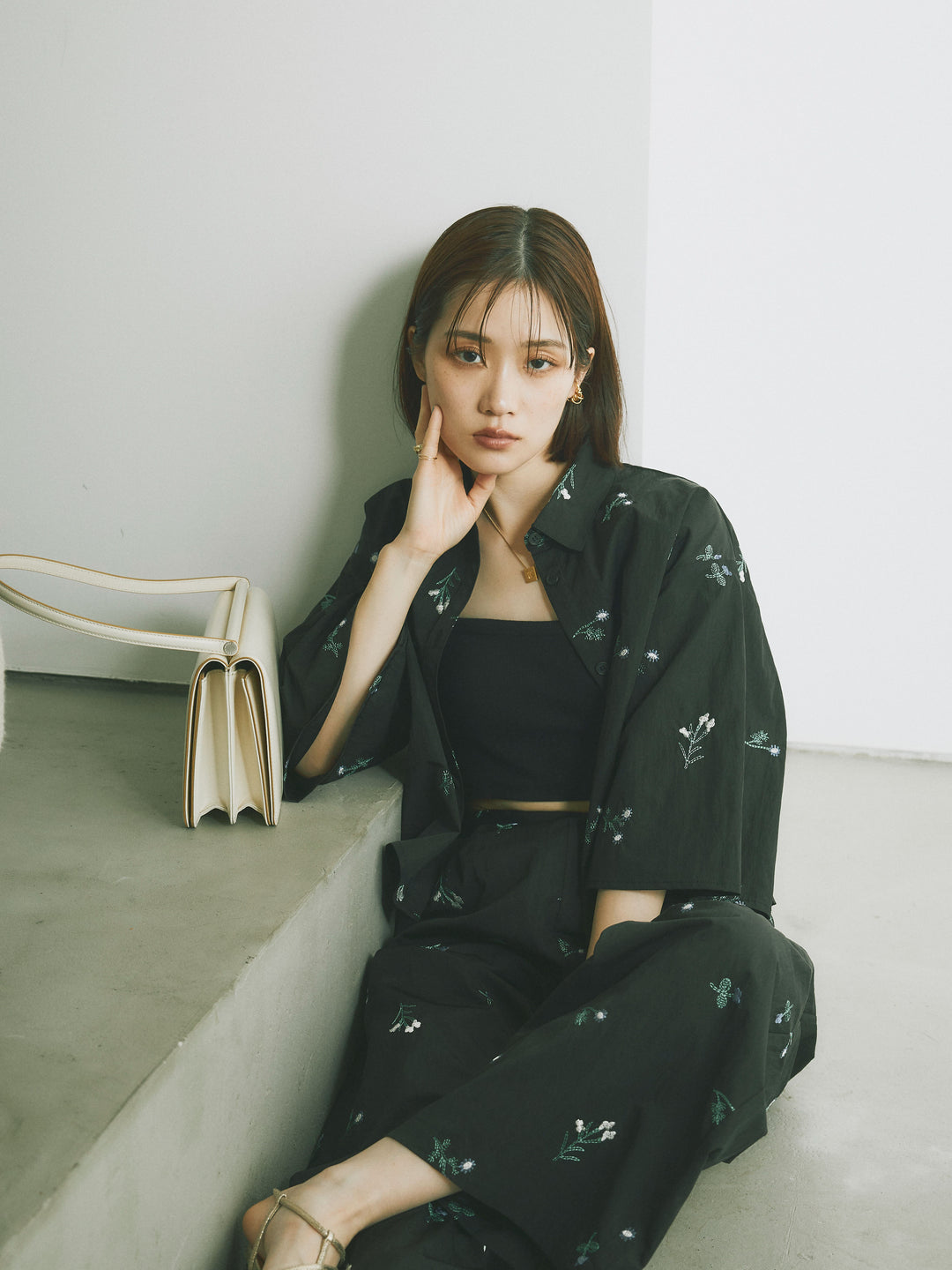軽やかなタフタ素材に繊細なフラワー刺繍が施された、ハーフ丈のシャツ。フラワーデザインがアクセントとなり、シンプルな中にも華やかさを加えます。ゆったりとしたシルエットでリラックス感のある着心地ながら、刺繍とタフタ素材が上品な印象を演出。カジュアルなデザインの中にエレガントさを感じさせる一枚です。 ※ボトムス、キャミソール(インナー)以外の商品は一律でインナーは付属していません。