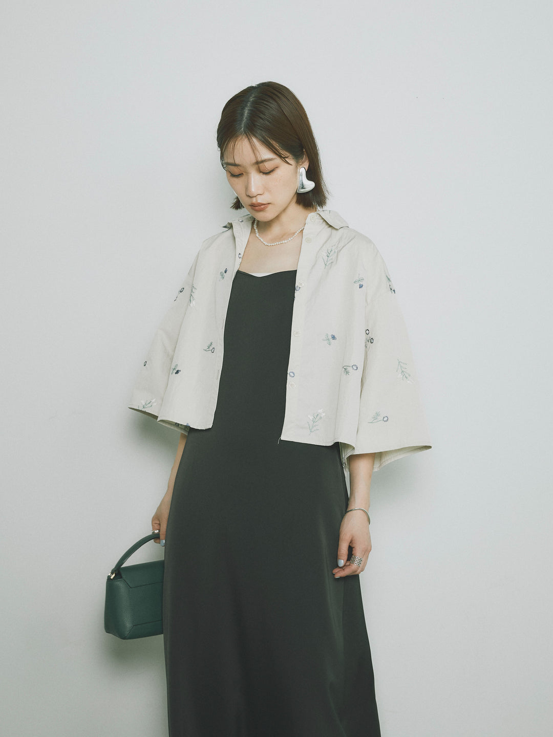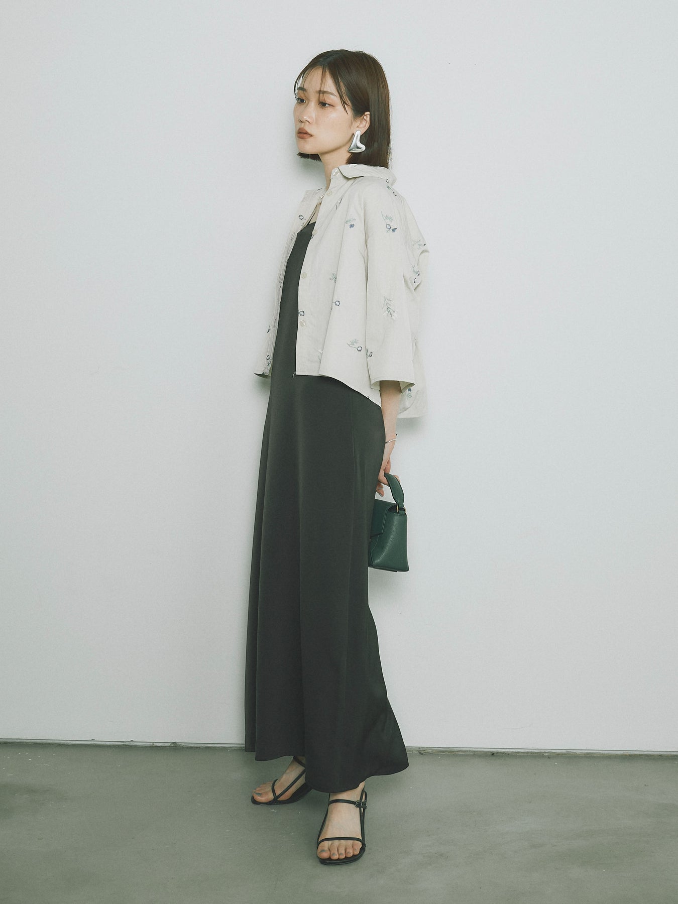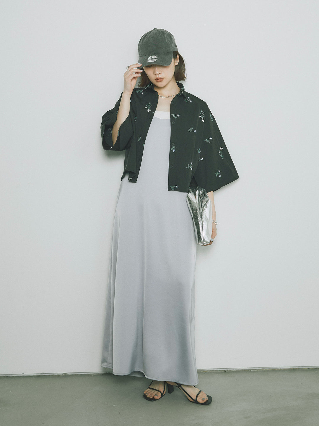 [SET]フラワー刺繍タフタハーフシャツ+マットサテンキャミワンピース(2set)