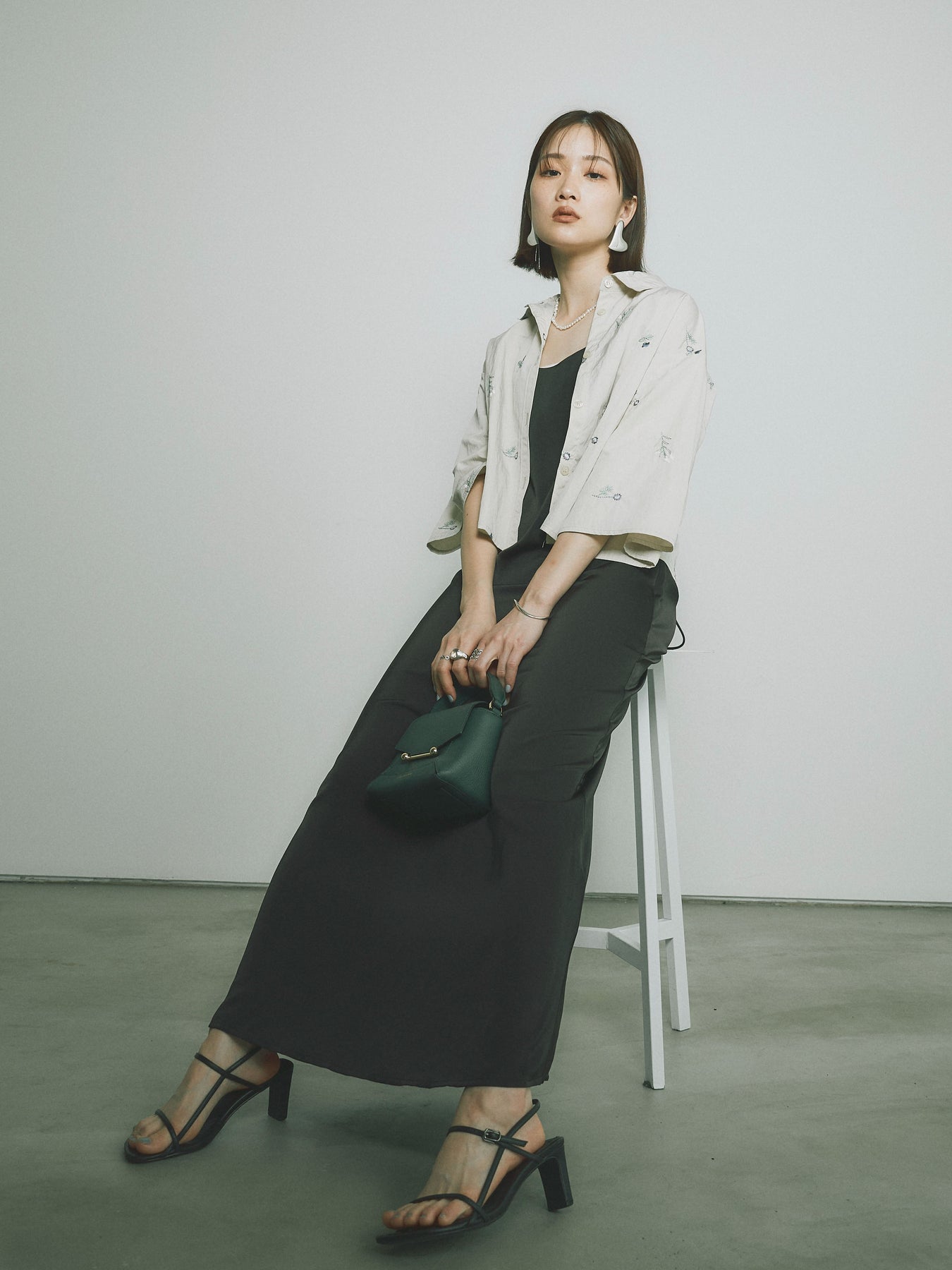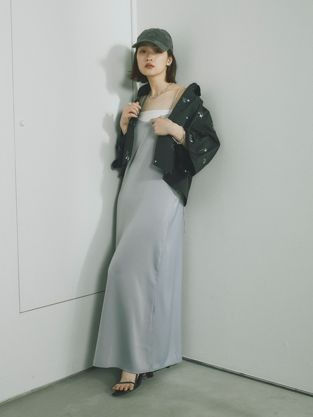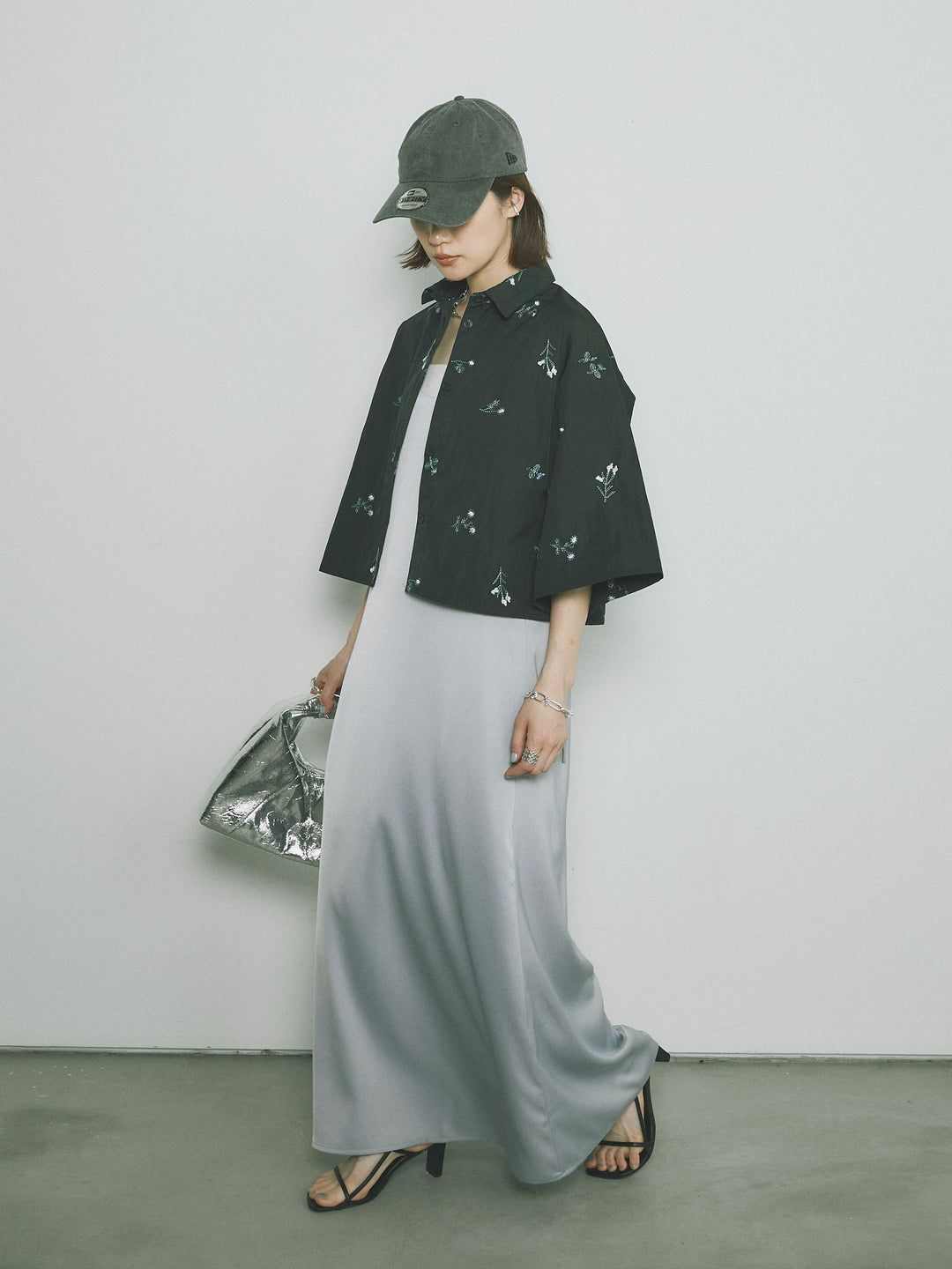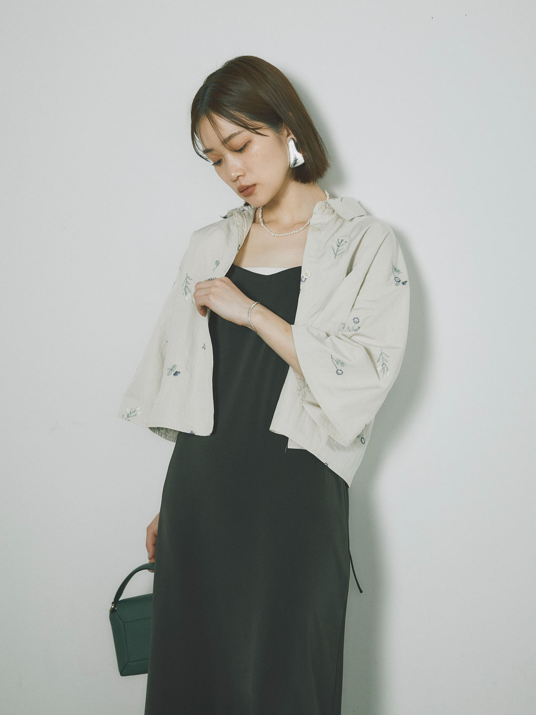 [SET]フラワー刺繍タフタハーフシャツ+マットサテンキャミワンピース(2set)