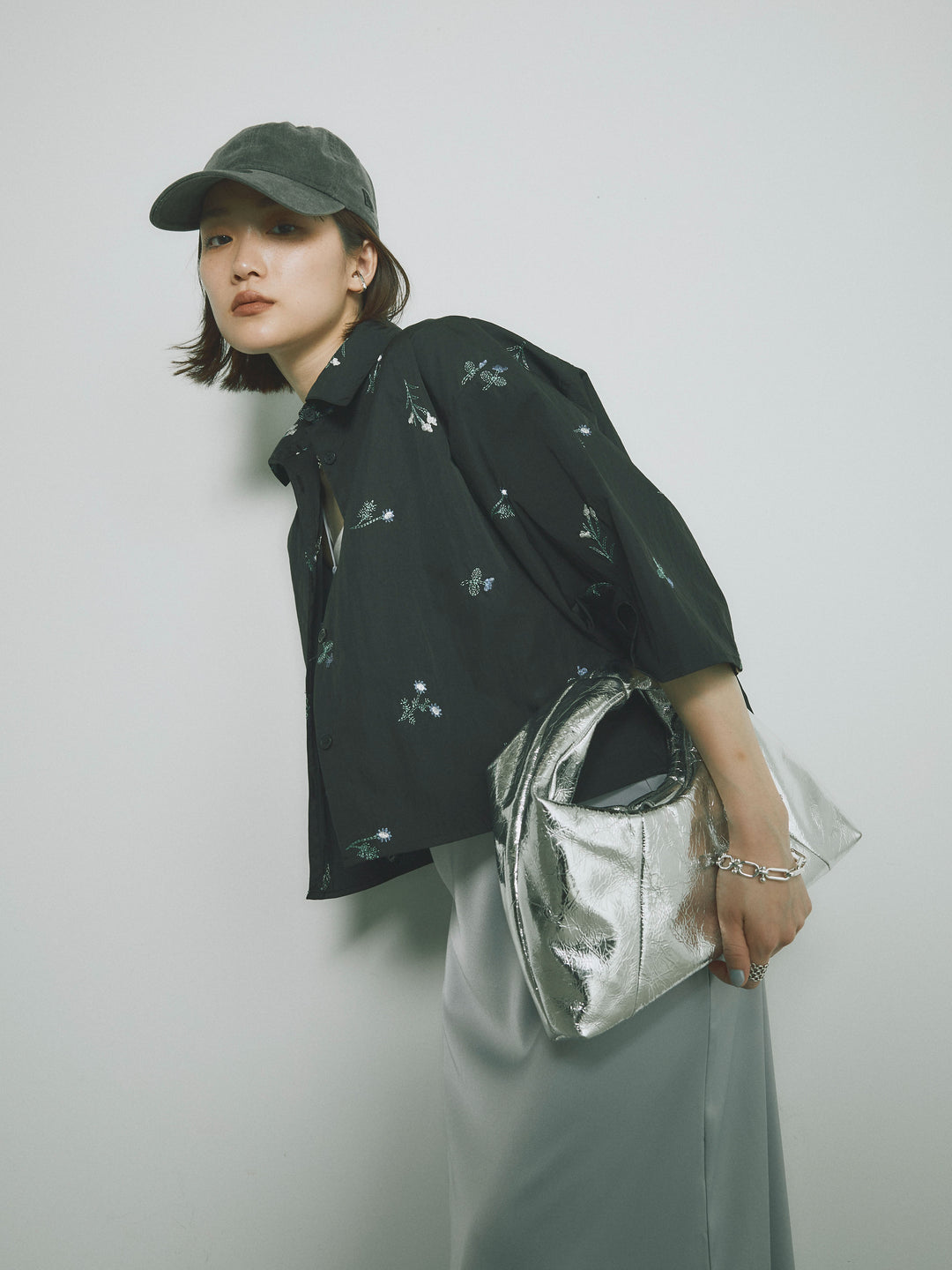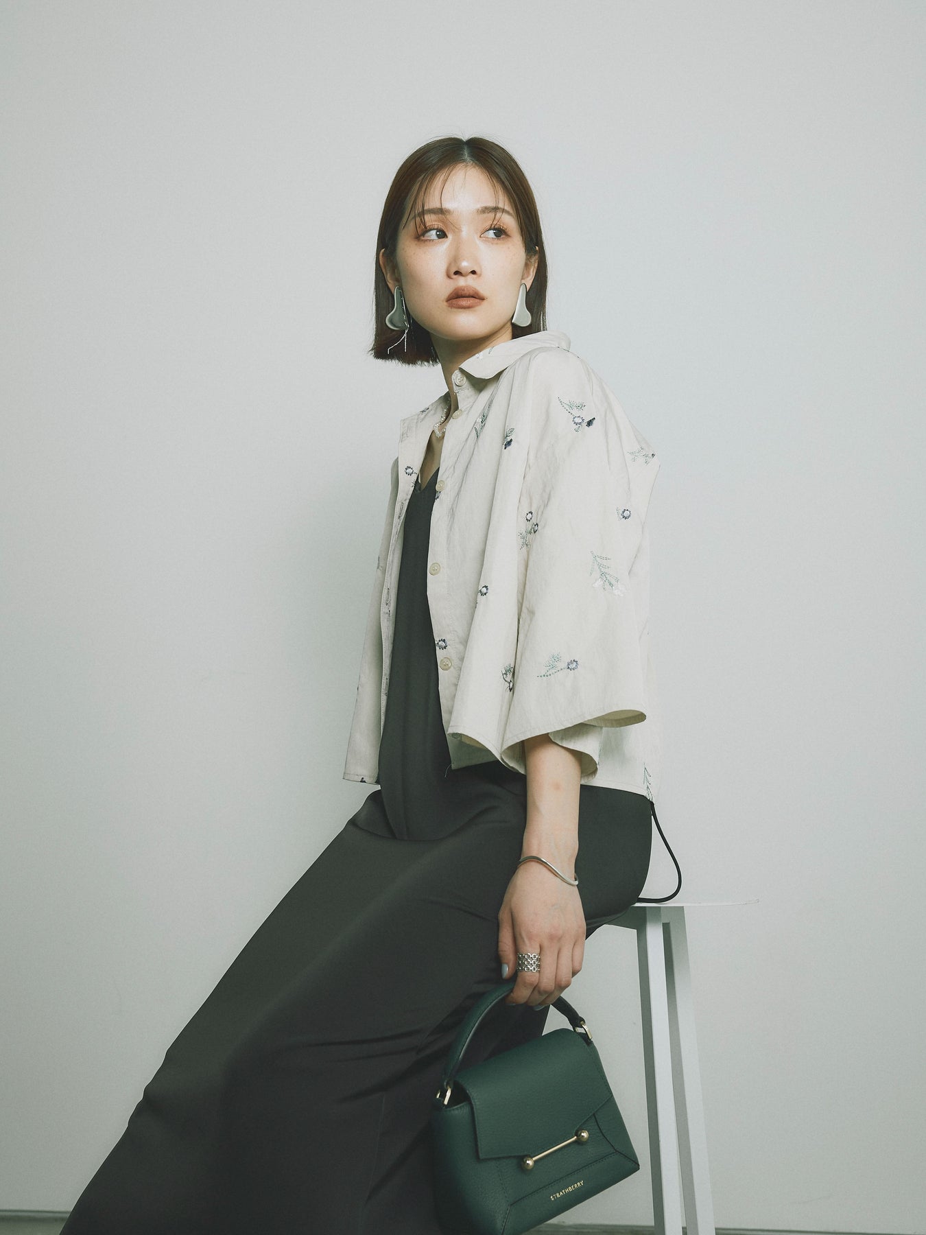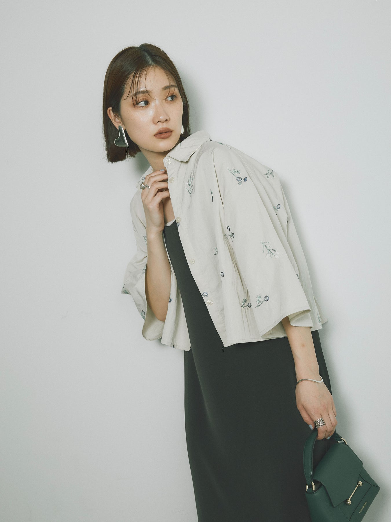 軽やかなタフタ素材に繊細なフラワー刺繍が施された、ハーフ丈のシャツ。フラワーデザインがアクセントとなり、シンプルな中にも華やかさを加えます。ゆったりとしたシルエットでリラックス感のある着心地ながら、刺繍とタフタ素材が上品な印象を演出。カジュアルなデザインの中にエレガントさを感じさせる一枚です。 ※ボトムス、キャミソール(インナー)以外の商品は一律でインナーは付属していません。