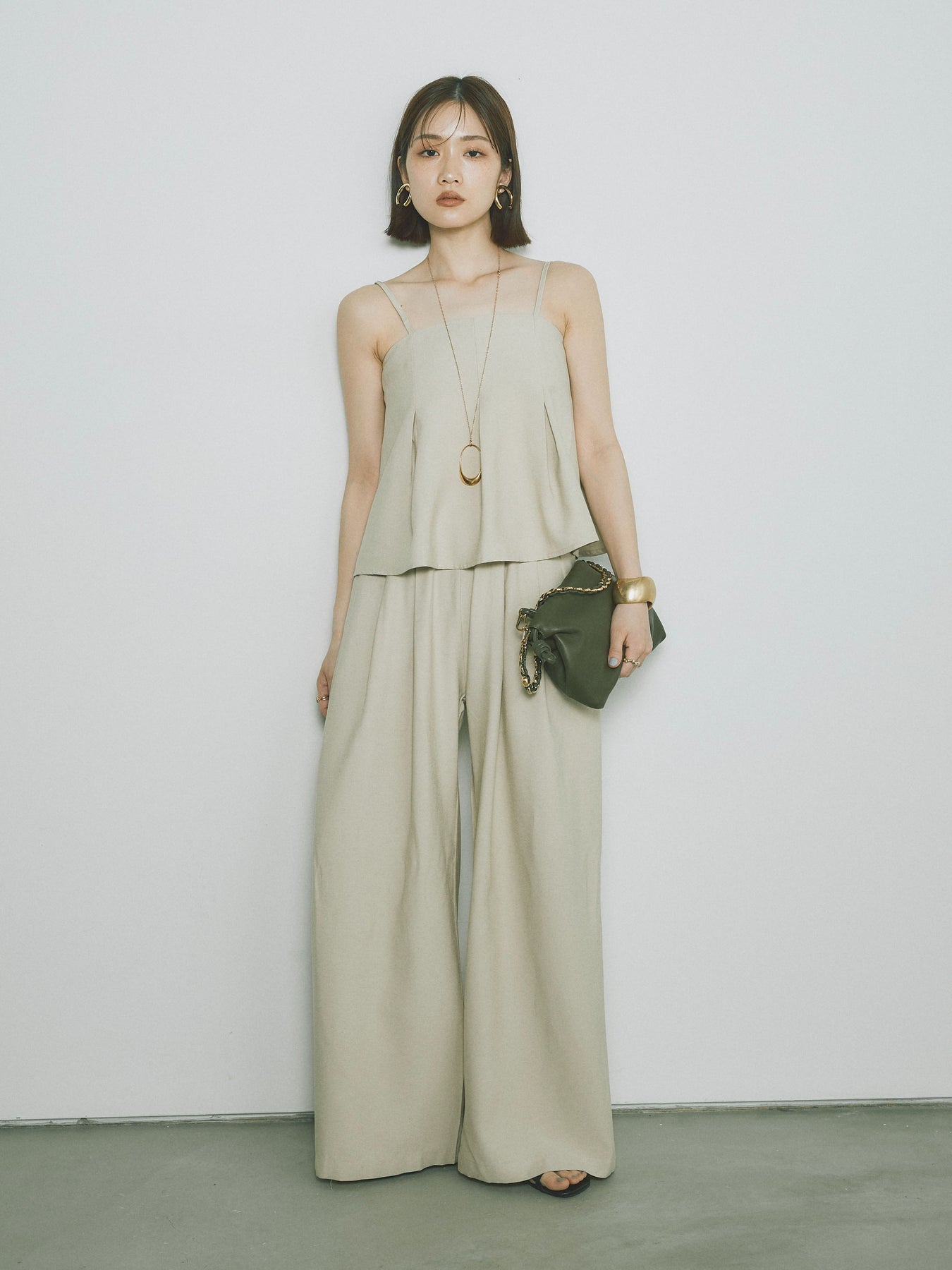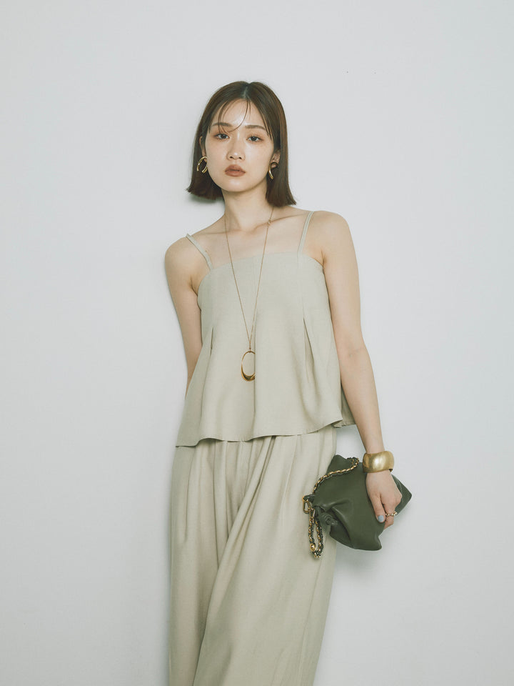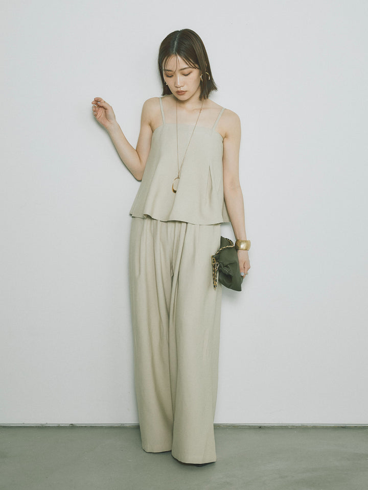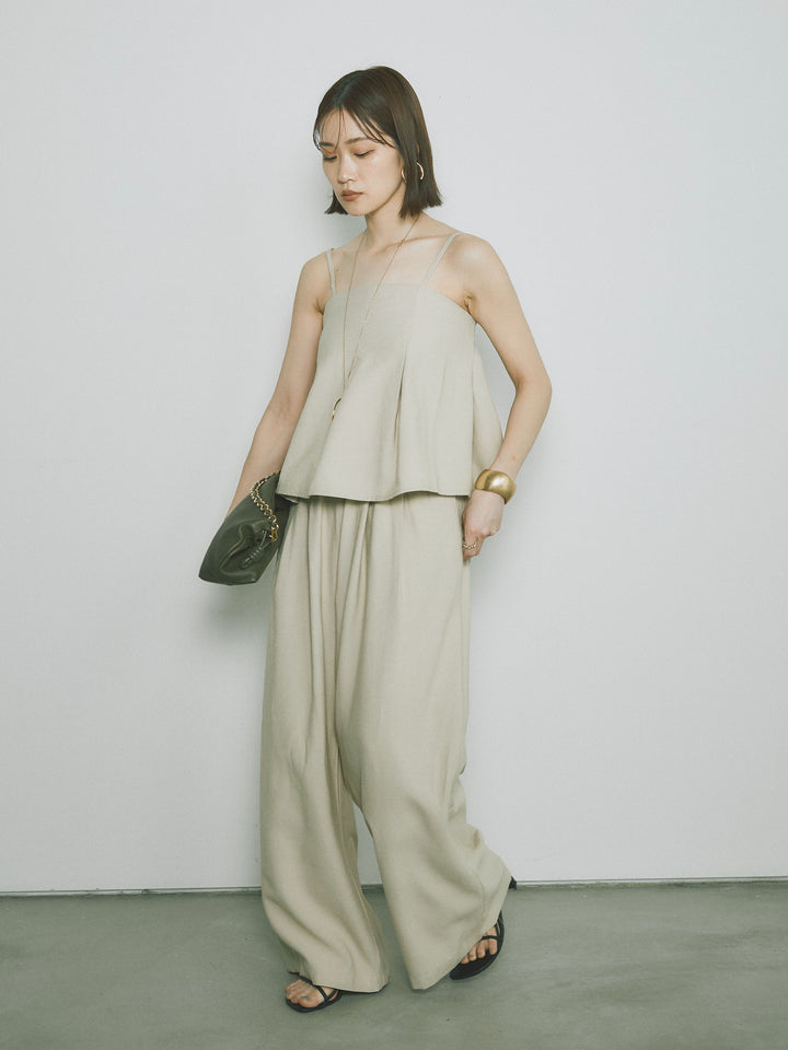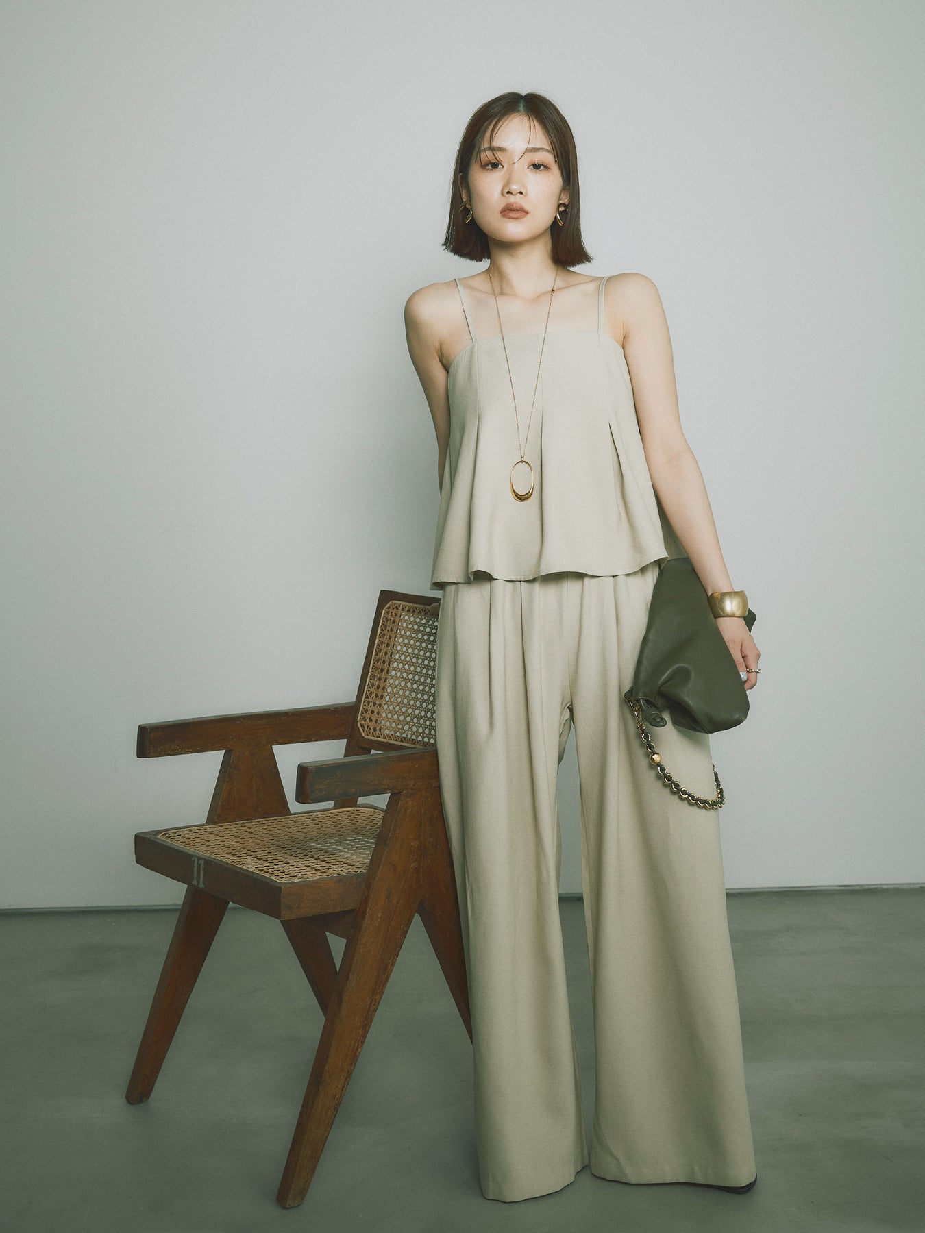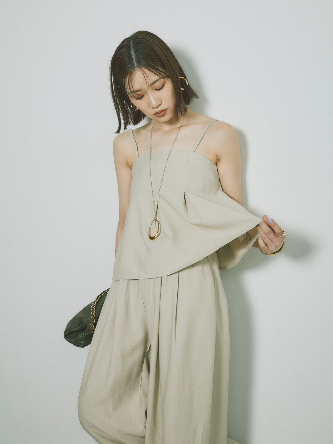 軽やかなテンセル素材で仕立てた、バルーンシルエットのトップスとパンツのセットアップ。トップスは肩紐付きのシンプルでエレガントなデザインで、リラックスしたシルエットを引き立てます。パンツはゆったりとしたバルーンシルエットで、動きやすさと快適さを兼ね備えています。セットアップとしてはもちろん、単品でも使える万能アイテムです。ナチュラルな色合いで、春夏にぴったりのスタイルを完成させます。 ※ボトムス、キャミソール(インナー)以外の商品は一律でインナーは付属していません。