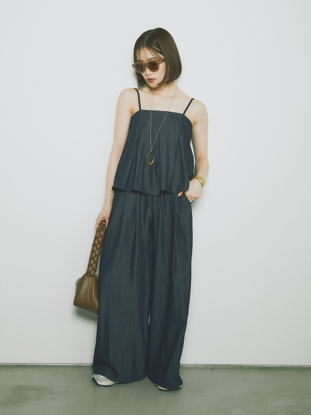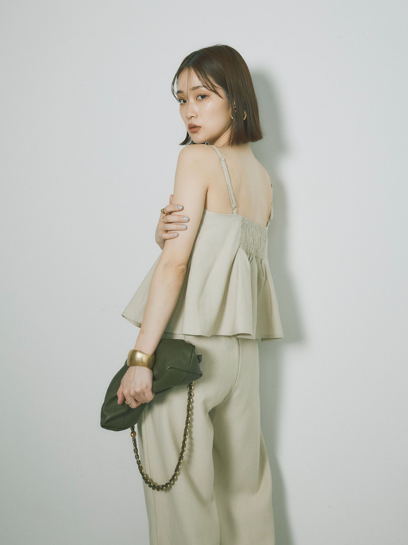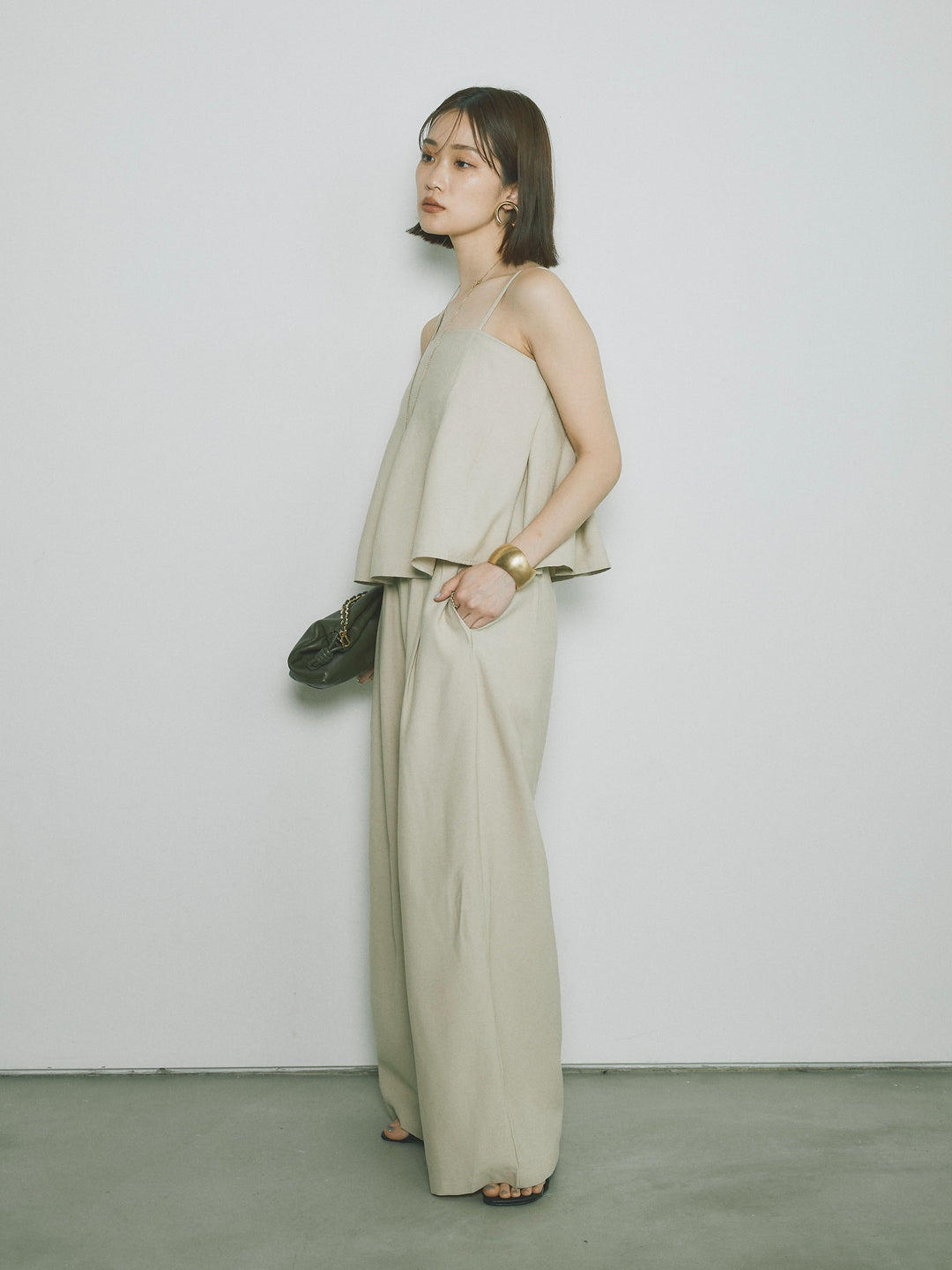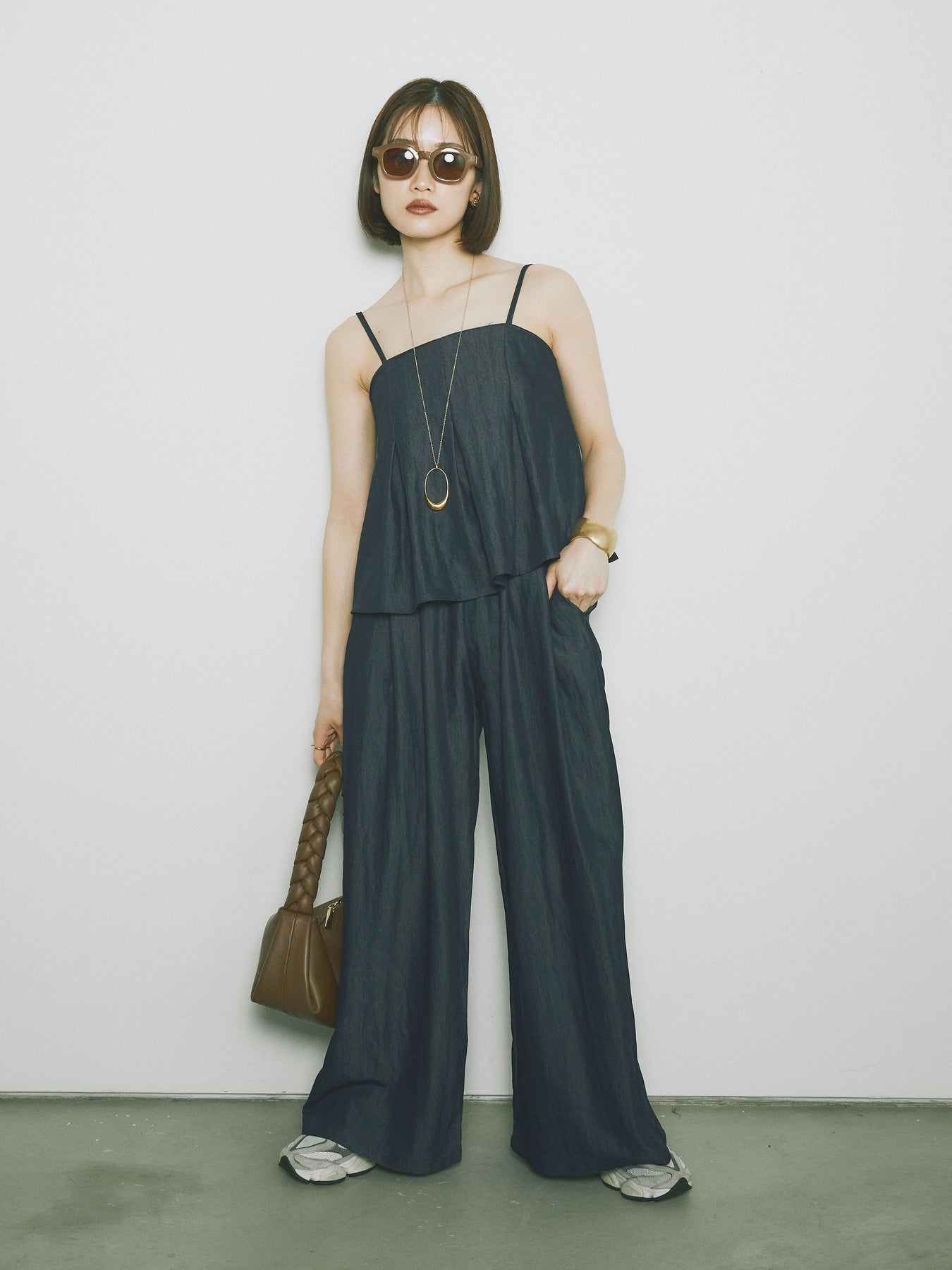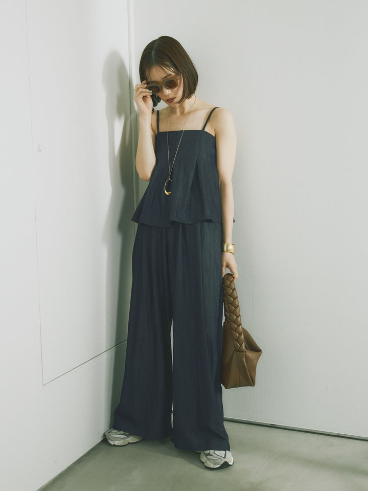 軽やかなテンセル素材で仕立てた、バルーンシルエットのトップスとパンツのセットアップ。トップスは肩紐付きのシンプルでエレガントなデザインで、リラックスしたシルエットを引き立てます。パンツはゆったりとしたバルーンシルエットで、動きやすさと快適さを兼ね備えています。セットアップとしてはもちろん、単品でも使える万能アイテムです。ナチュラルな色合いで、春夏にぴったりのスタイルを完成させます。 ※ボトムス、キャミソール(インナー)以外の商品は一律でインナーは付属していません。