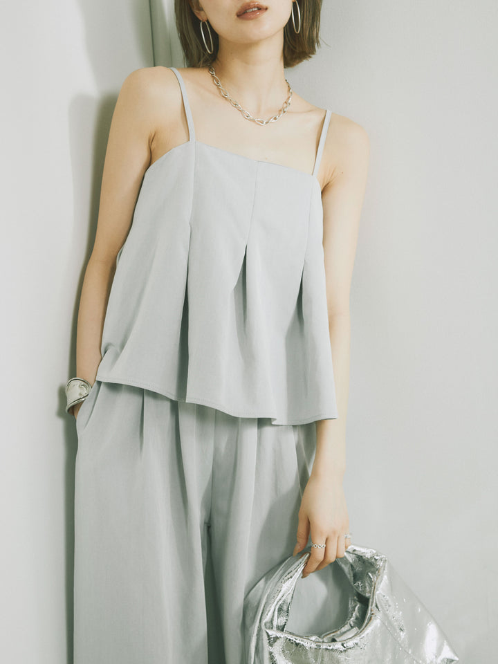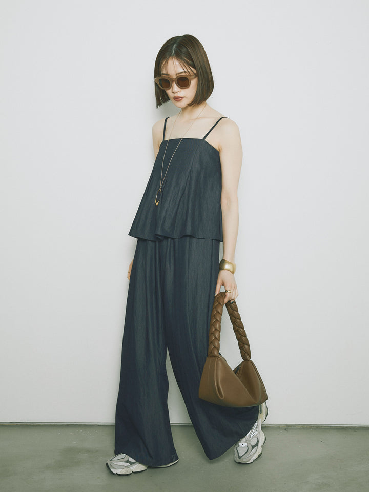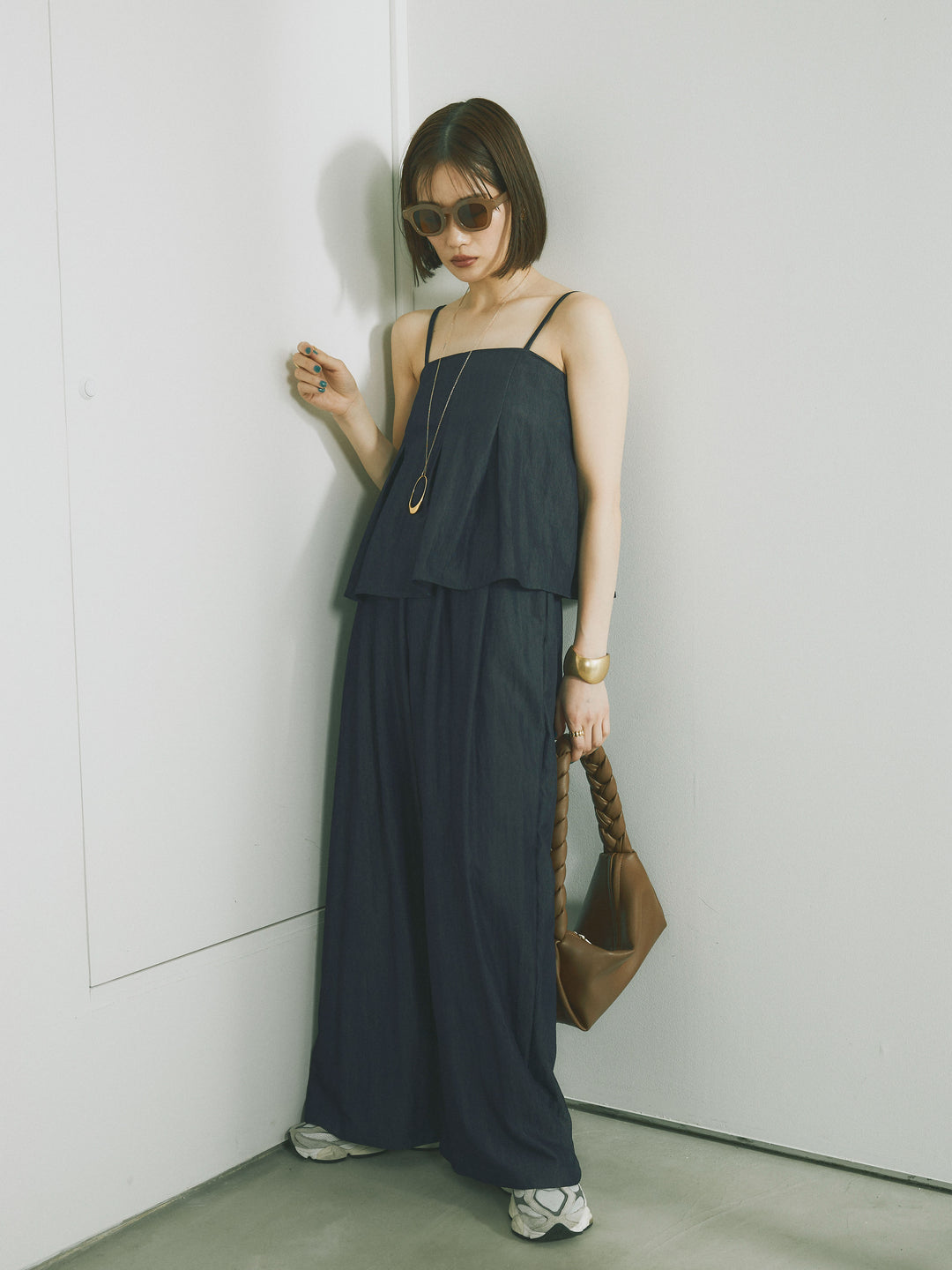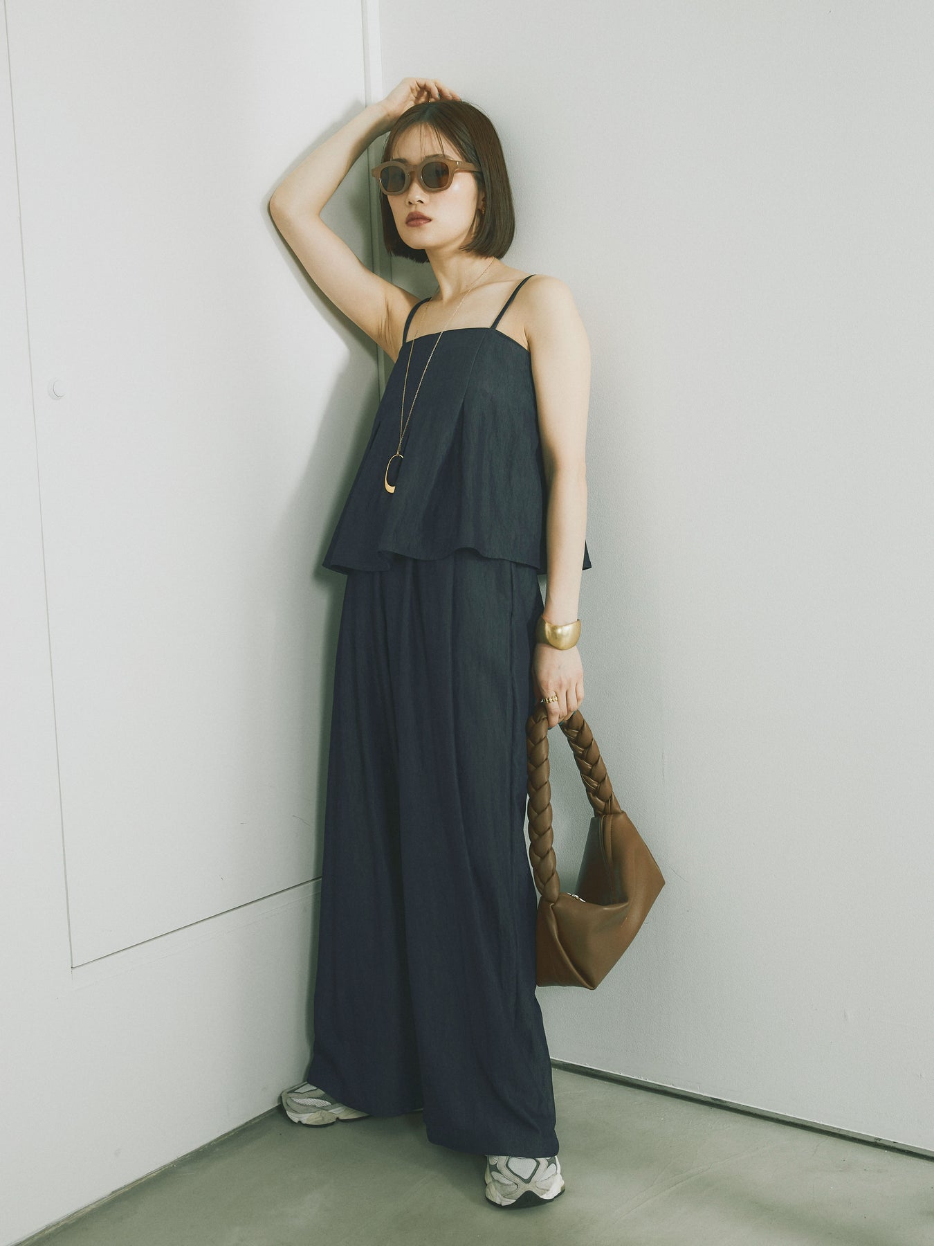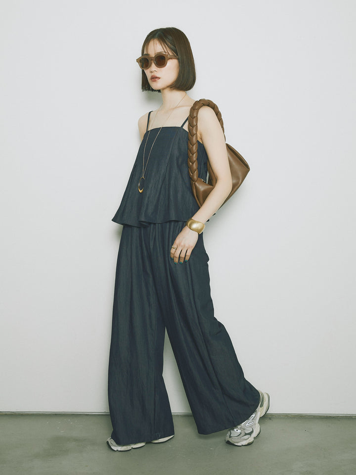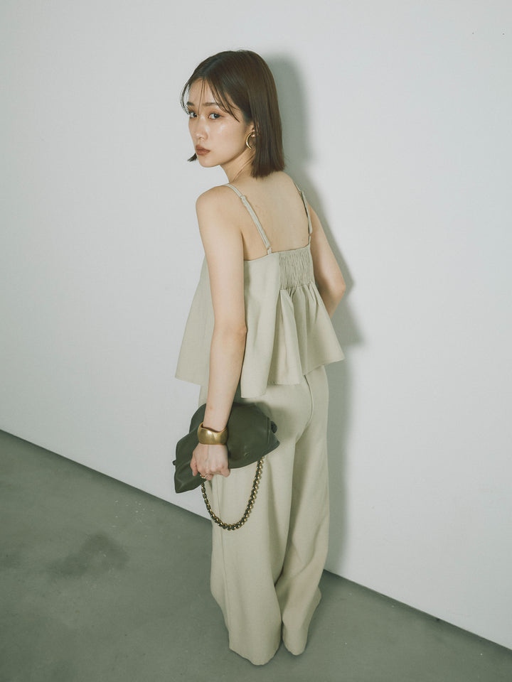 軽やかなテンセル素材で仕立てた、バルーンシルエットのトップスとパンツのセットアップ。トップスは肩紐付きのシンプルでエレガントなデザインで、リラックスしたシルエットを引き立てます。パンツはゆったりとしたバルーンシルエットで、動きやすさと快適さを兼ね備えています。セットアップとしてはもちろん、単品でも使える万能アイテムです。ナチュラルな色合いで、春夏にぴったりのスタイルを完成させます。 ※ボトムス、キャミソール(インナー)以外の商品は一律でインナーは付属していません。