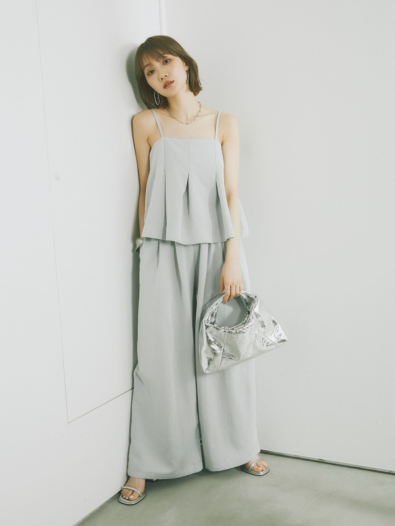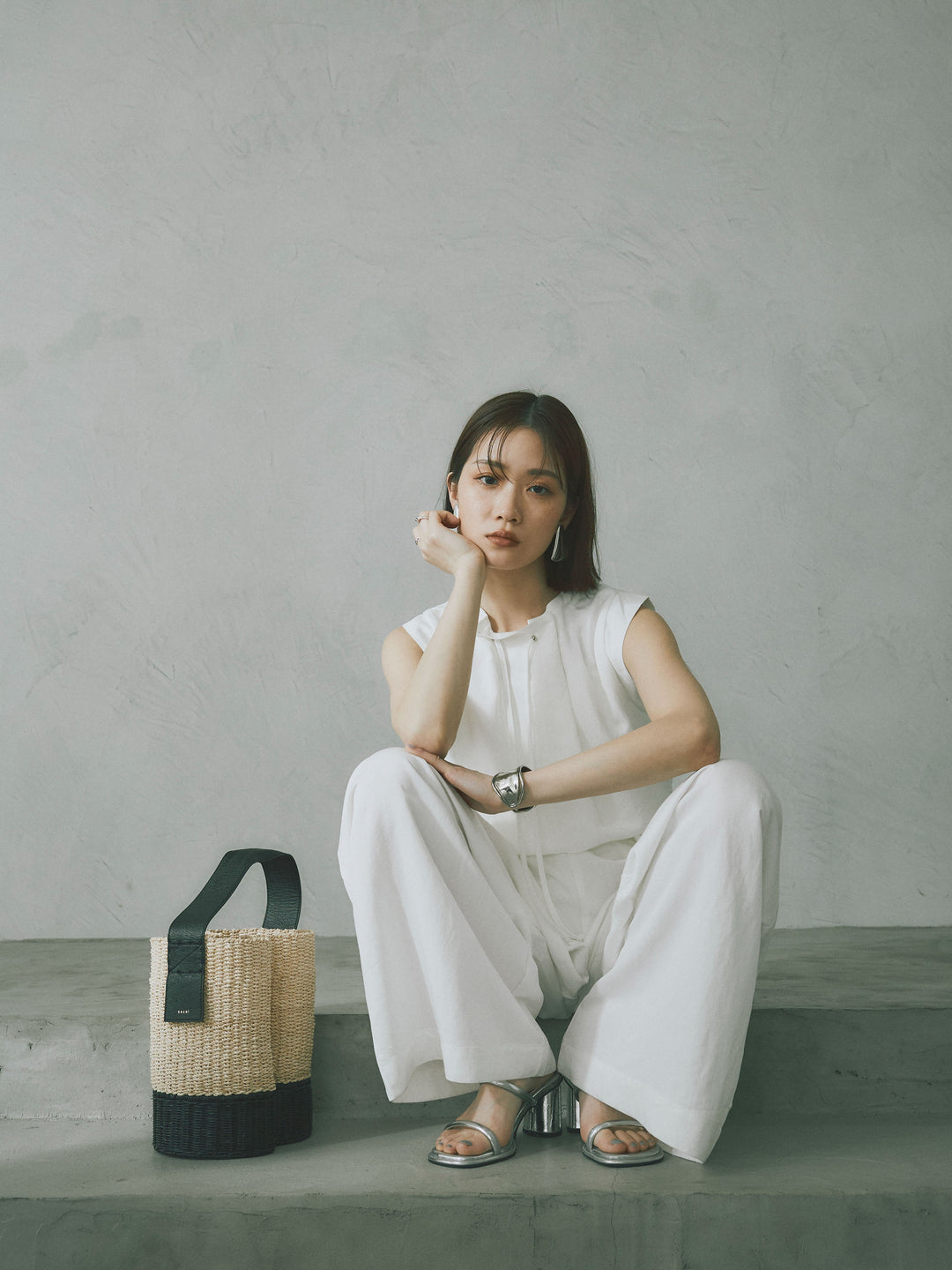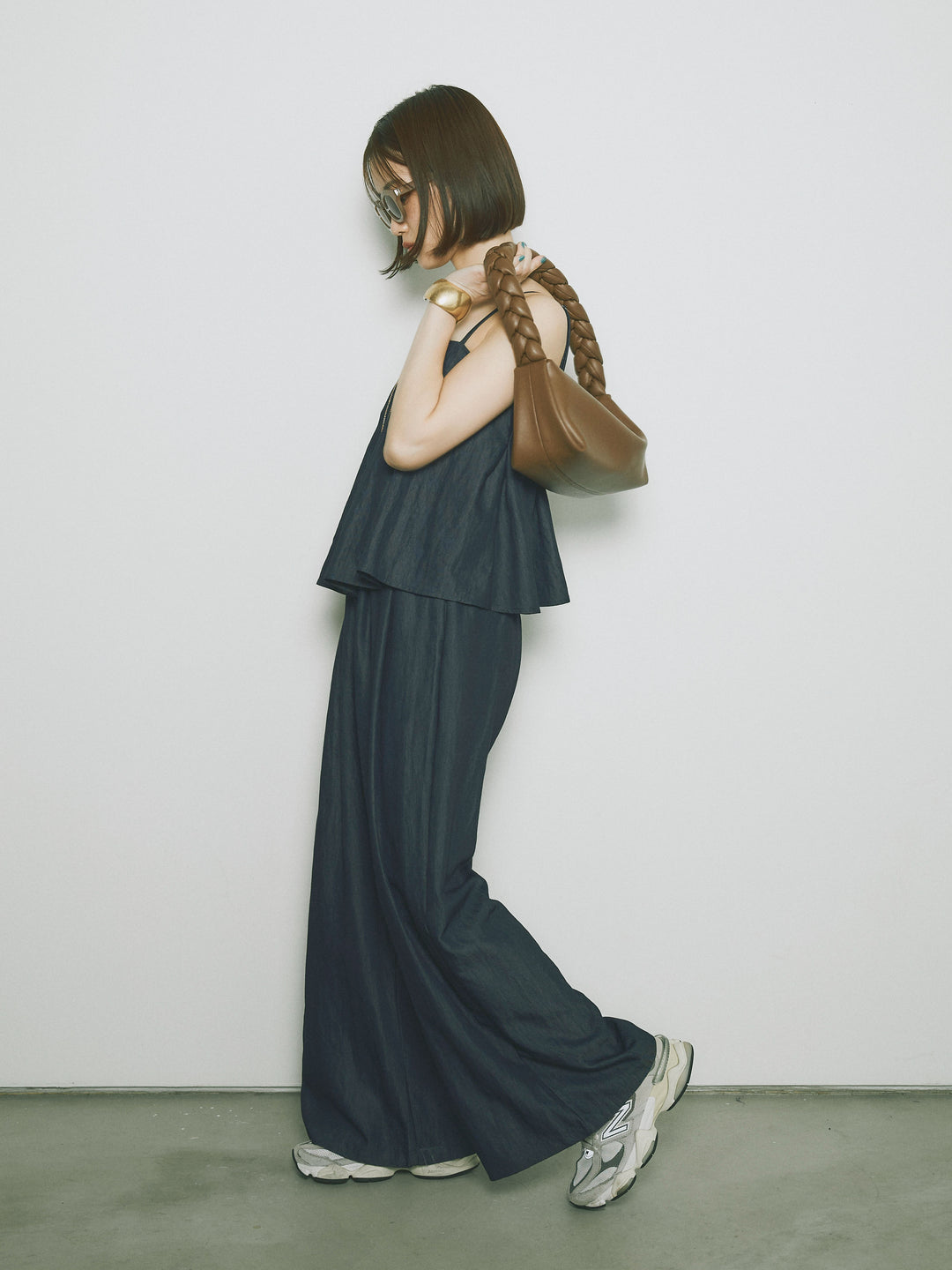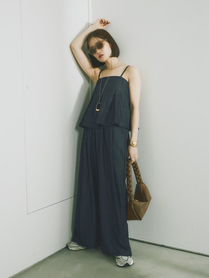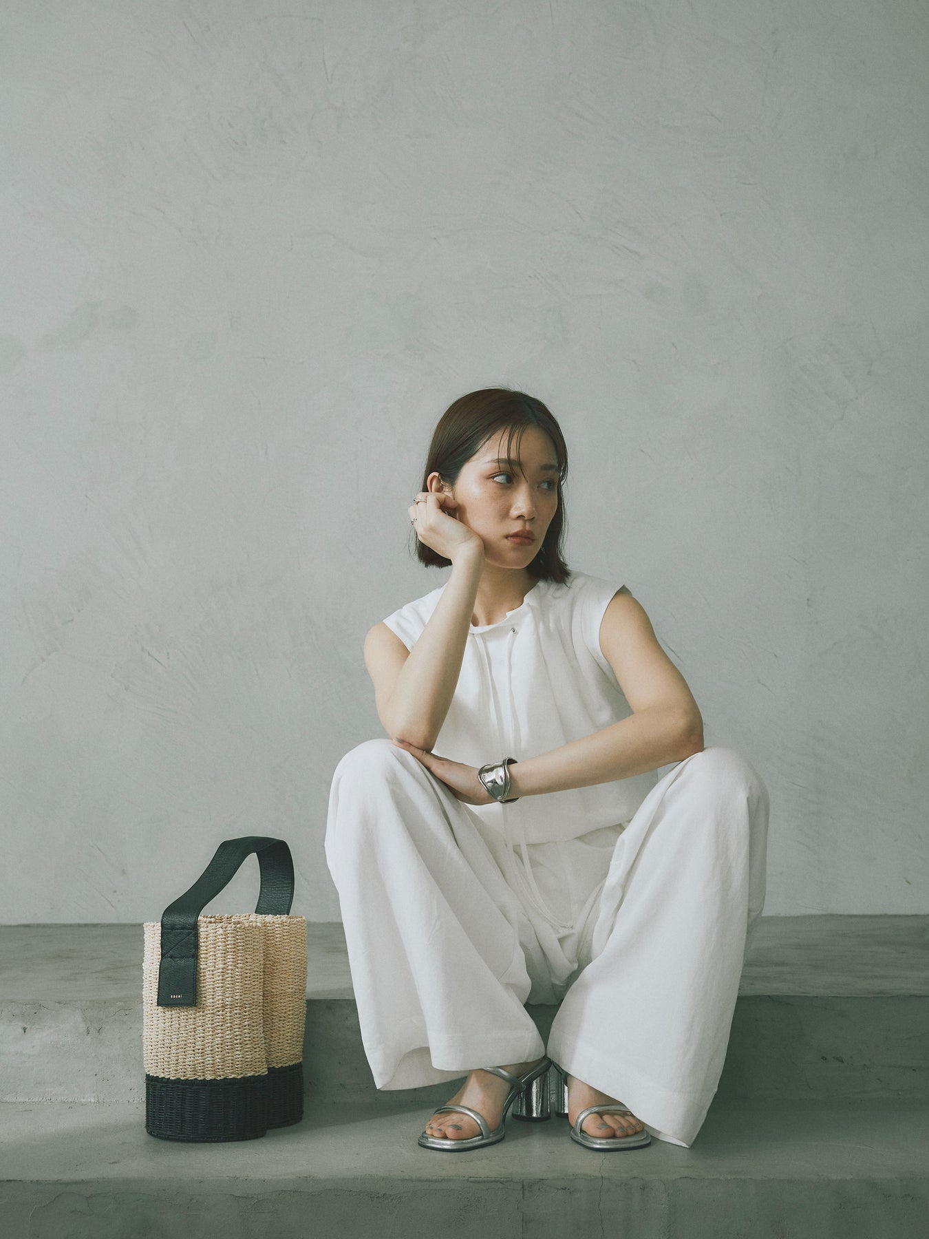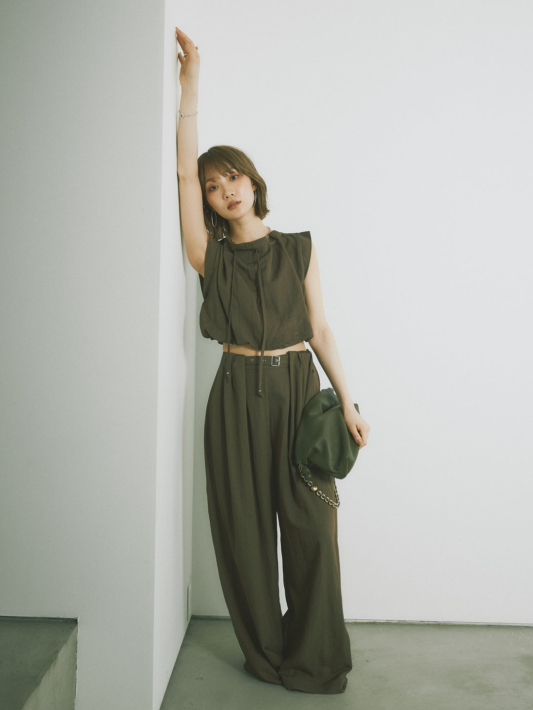 軽やかなテンセル素材で仕立てた、バルーンシルエットのトップスとパンツのセットアップ。トップスは肩紐付きのシンプルでエレガントなデザインで、リラックスしたシルエットを引き立てます。パンツはゆったりとしたバルーンシルエットで、動きやすさと快適さを兼ね備えています。セットアップとしてはもちろん、単品でも使える万能アイテムです。ナチュラルな色合いで、春夏にぴったりのスタイルを完成させます。 ※ボトムス、キャミソール(インナー)以外の商品は一律でインナーは付属していません。