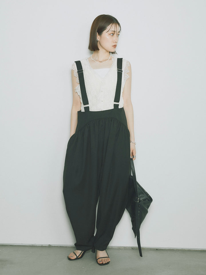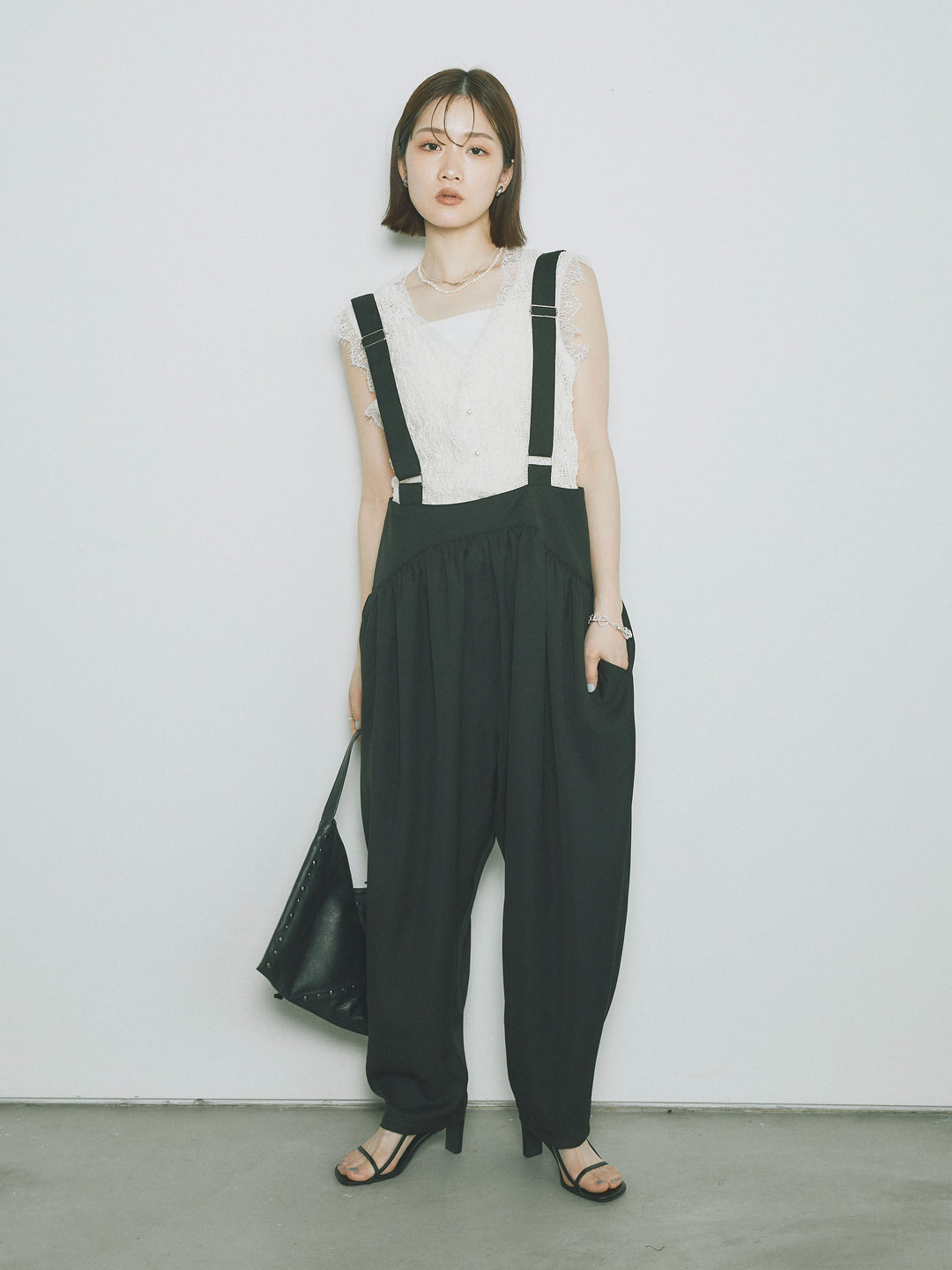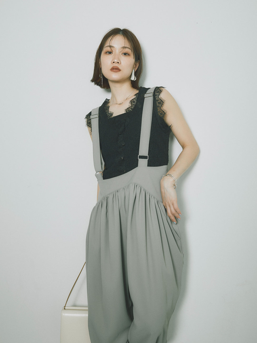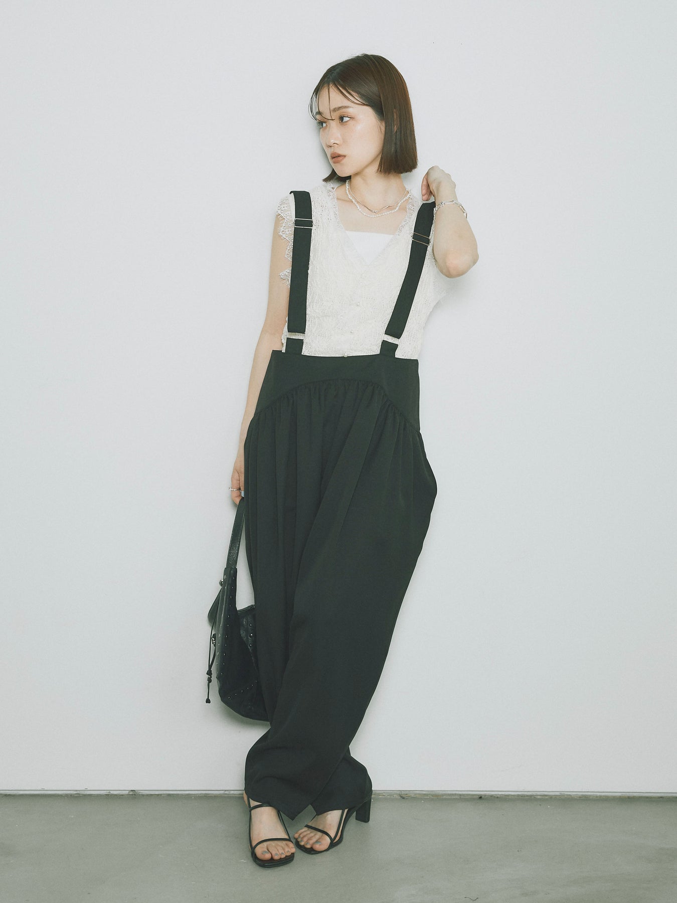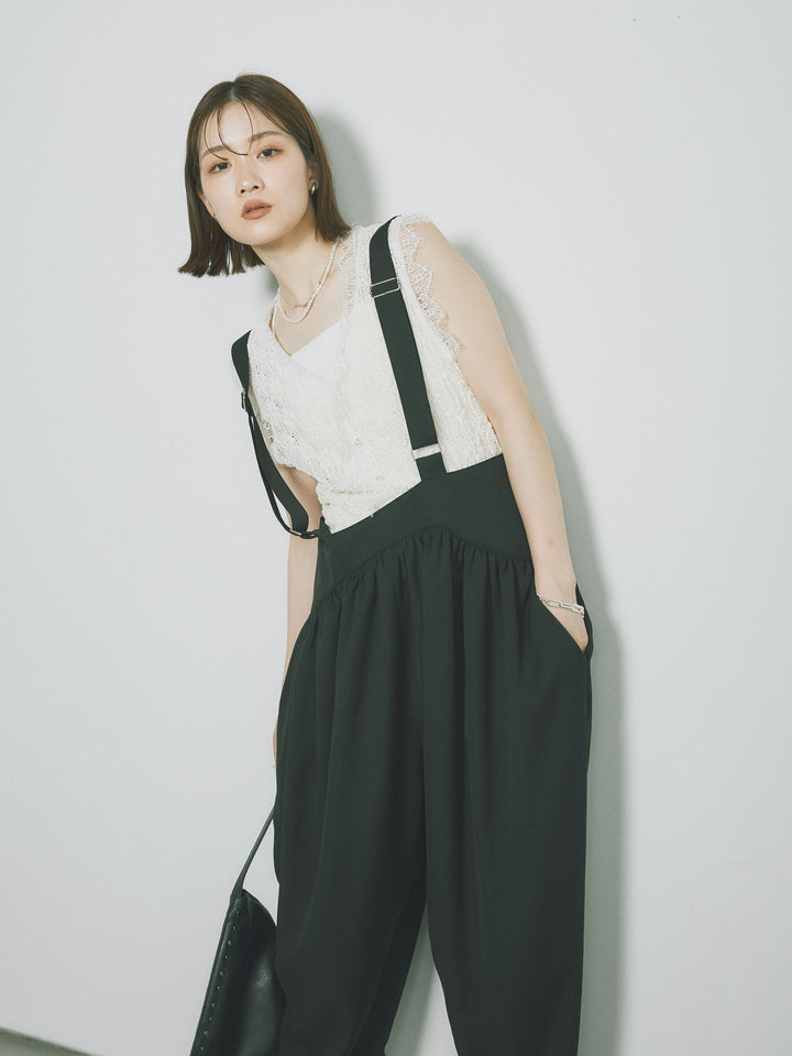 [SET]レース切替テープヤーンノースリーブトップス+サスペンダーバルーンパンツ(2set)