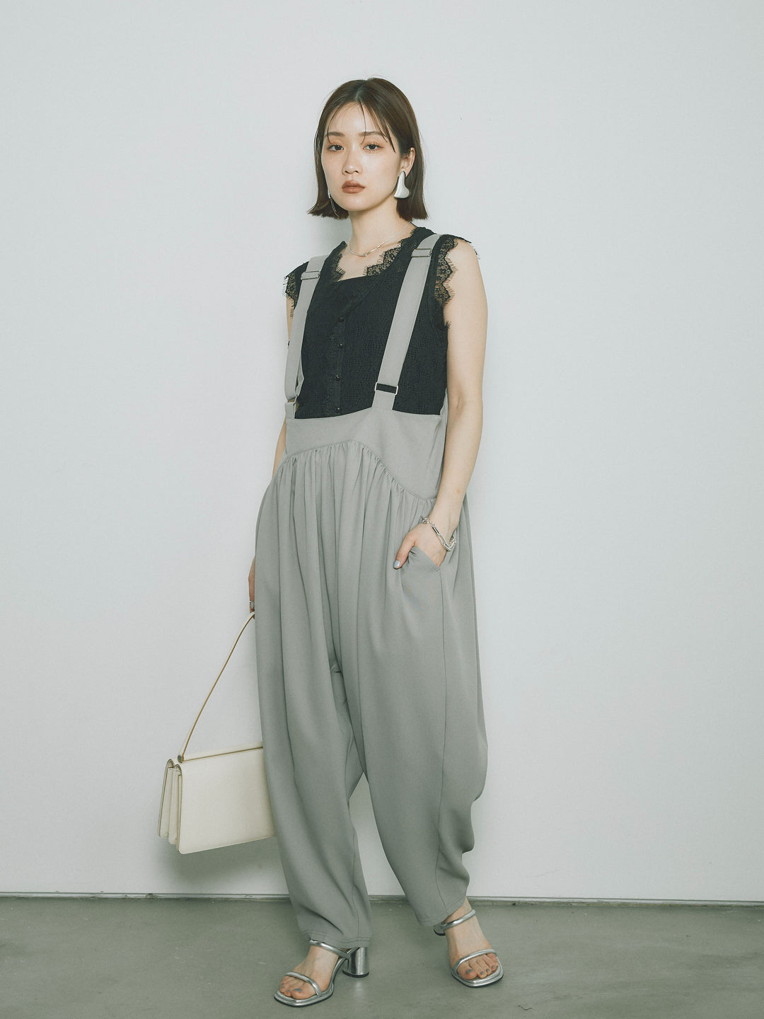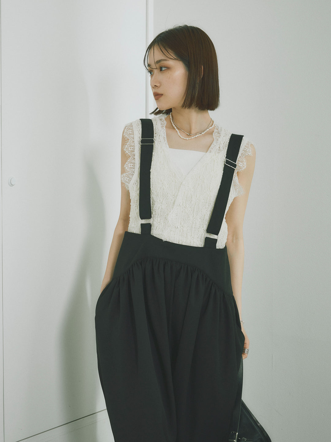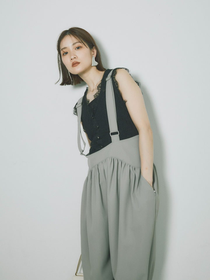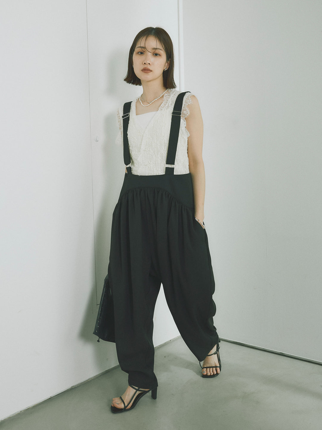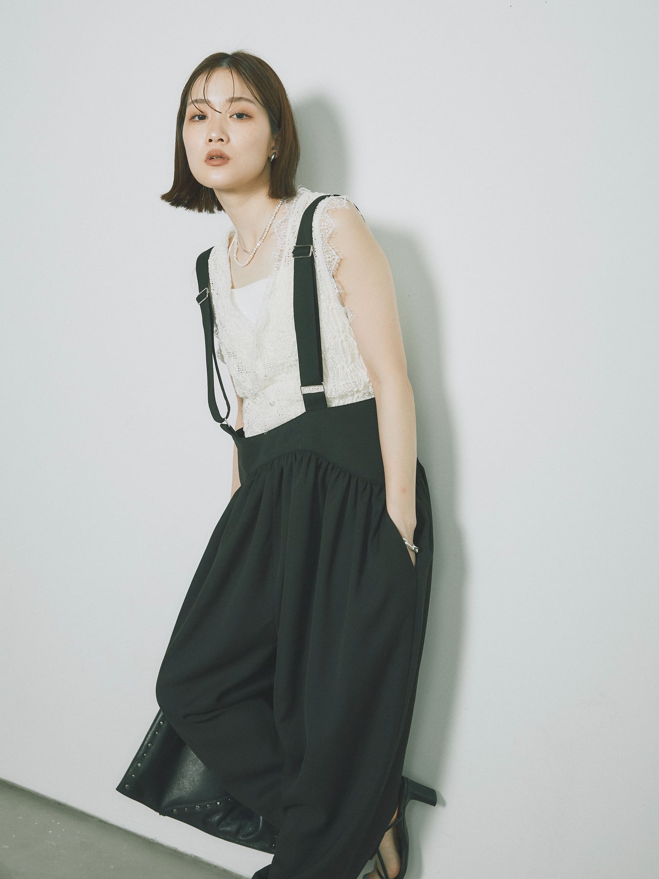 [SET]レース切替テープヤーンノースリーブトップス+サスペンダーバルーンパンツ(2set)