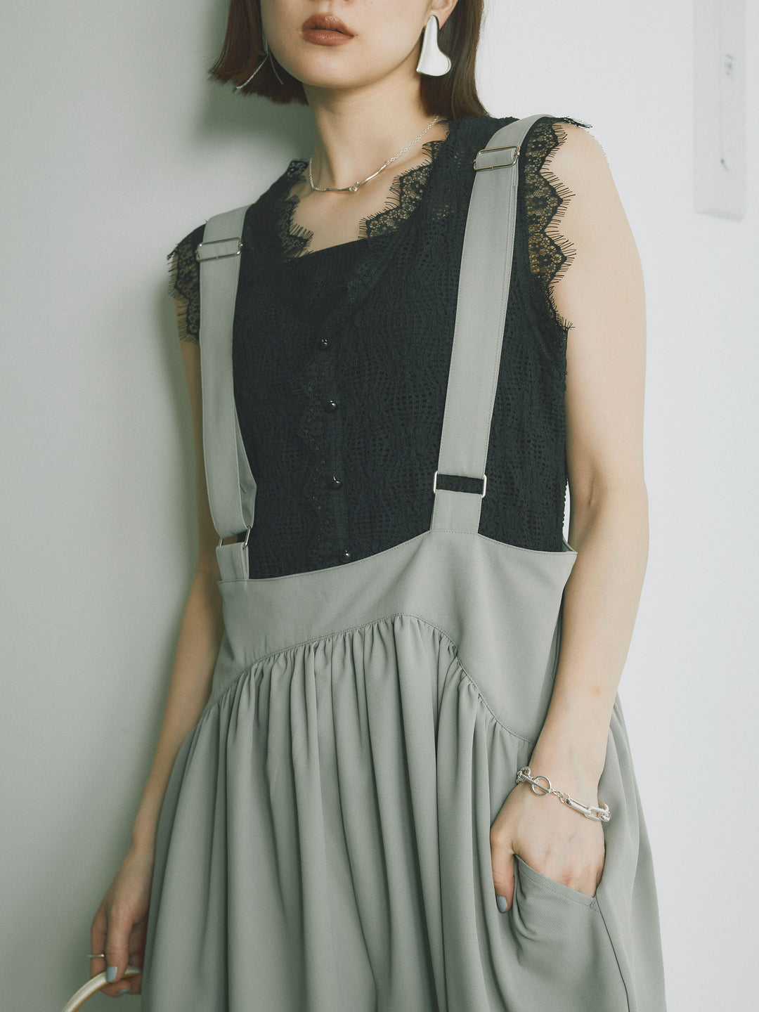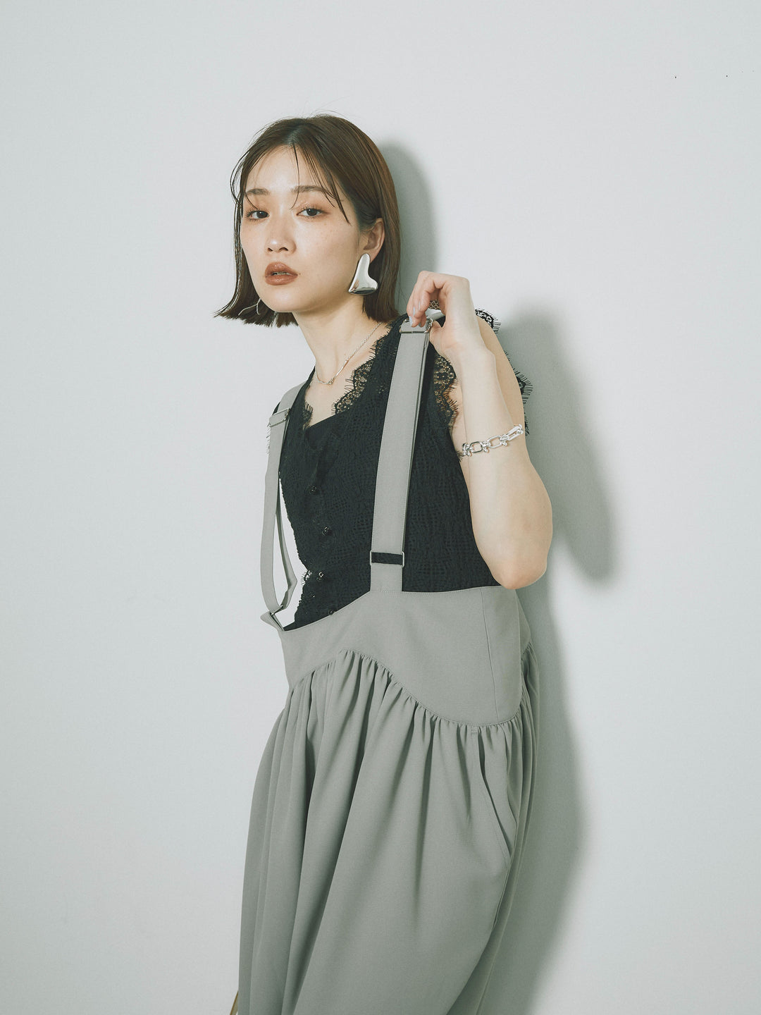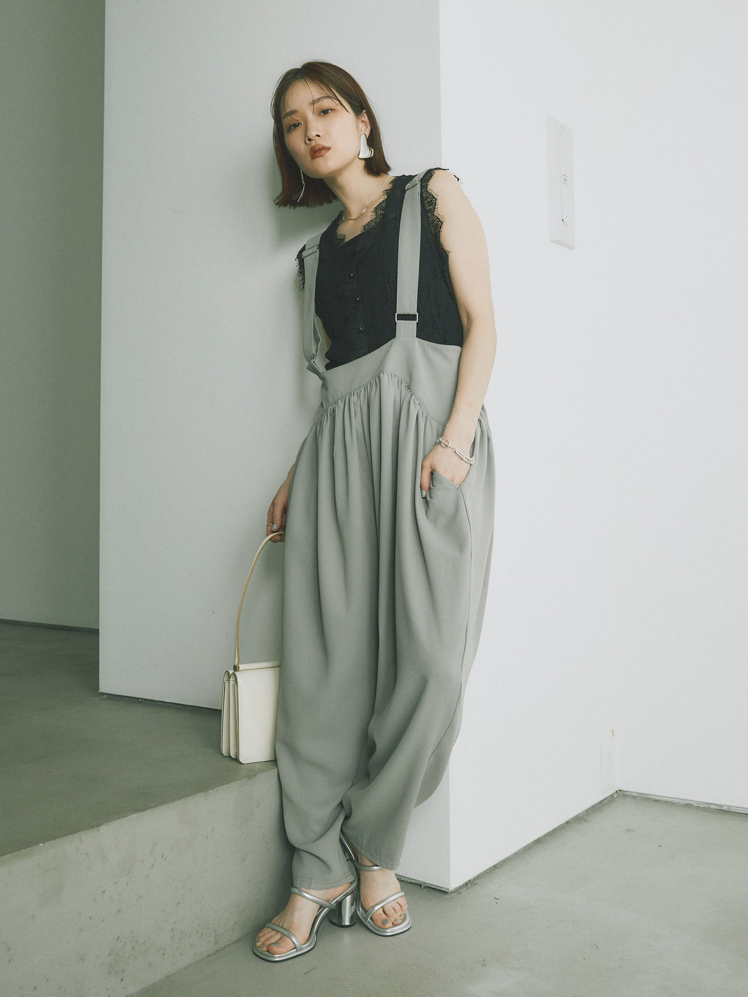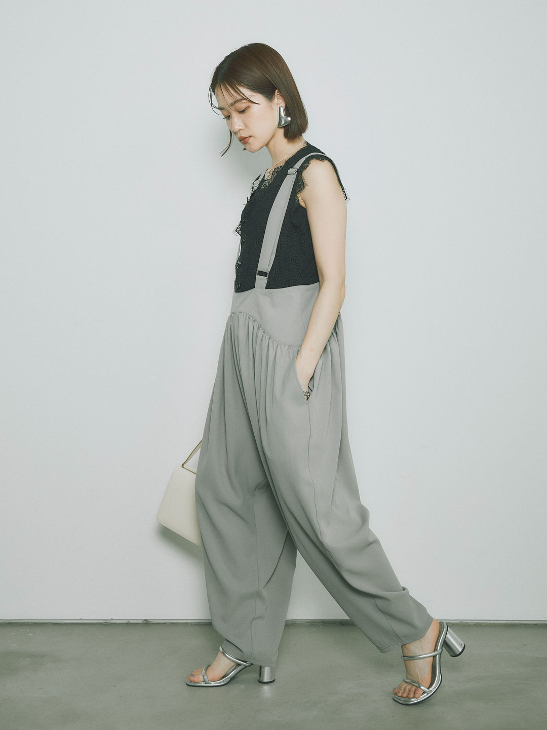 [SET]レース切替テープヤーンノースリーブトップス+サスペンダーバルーンパンツ(2set)