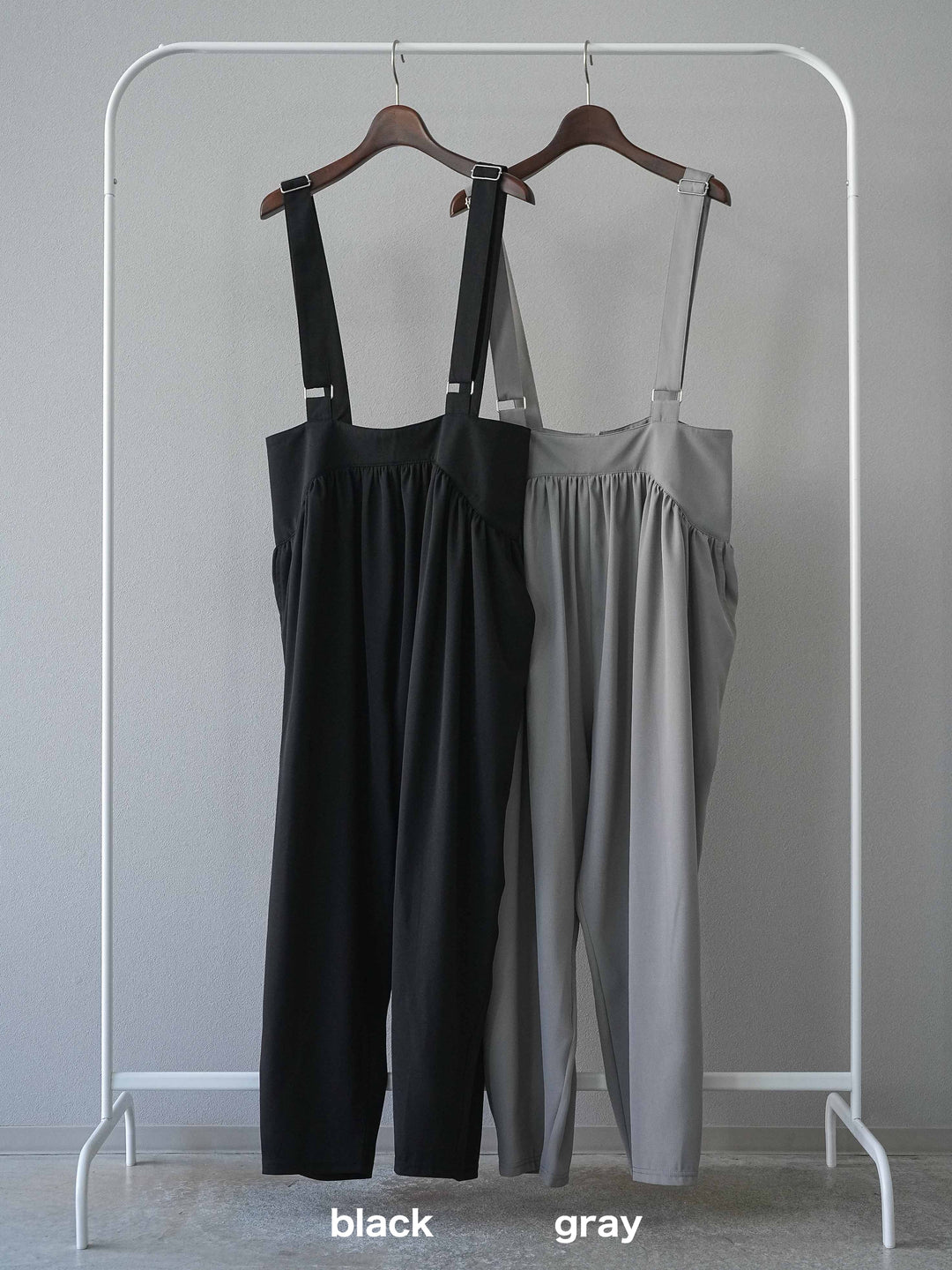 サスペンダーデザインが特徴的なバルーンシルエットのパンツ。肩紐の調整が可能で、自分の体型に合わせてフィット感を調整できるのがポイントです。ウエスト部分はゴム入りで、リラックスした着心地を提供します。ゆったりとしたシルエットながら、すっきりとしたラインを作り出し、スタイルアップ効果も抜群。ブラックとグレーのシンプルなカラー展開で、様々なトップスと合わせやすいアイテムです。