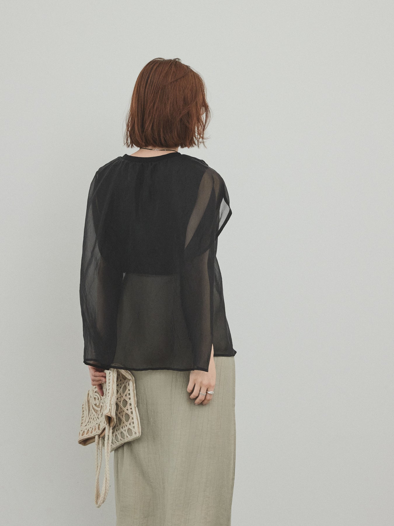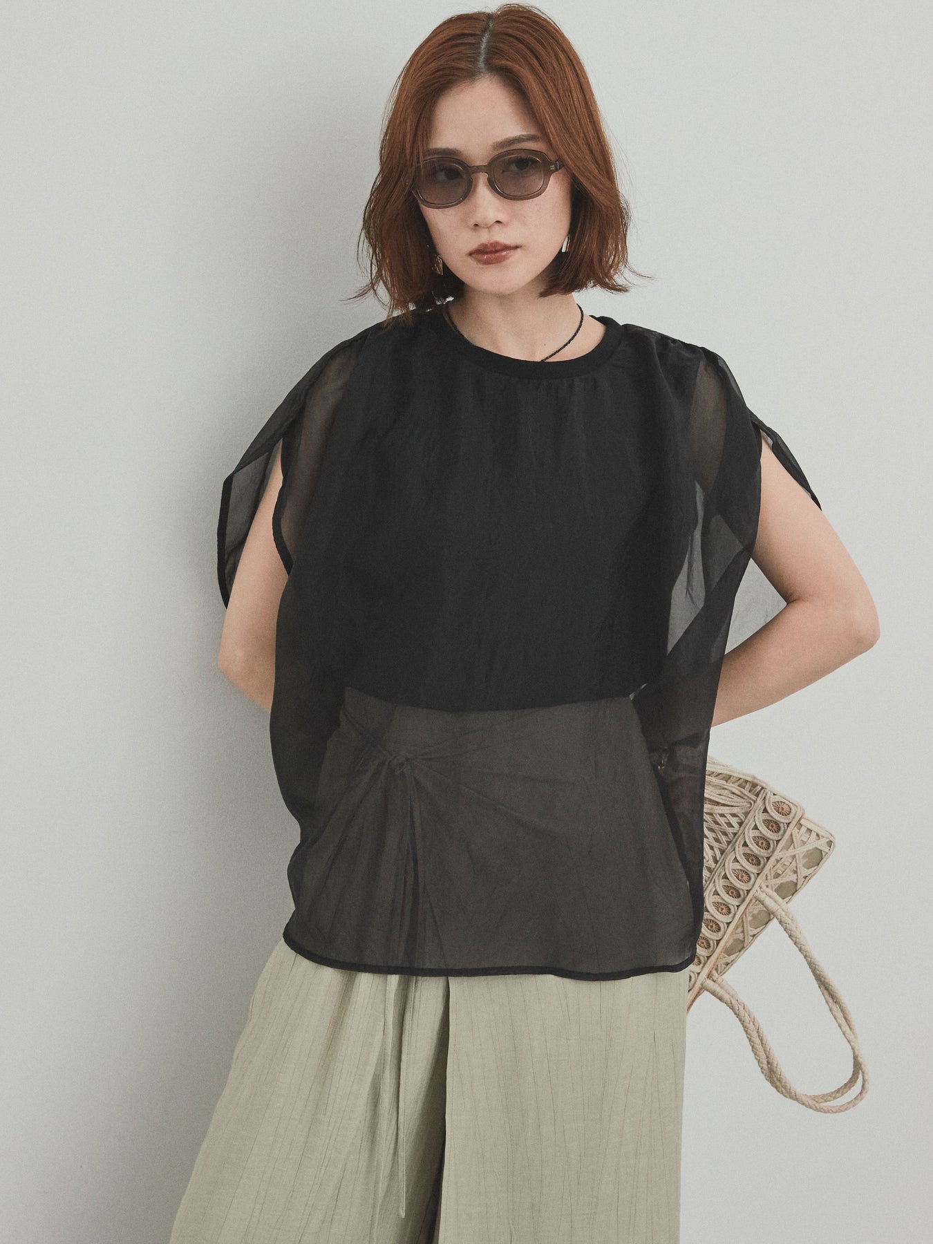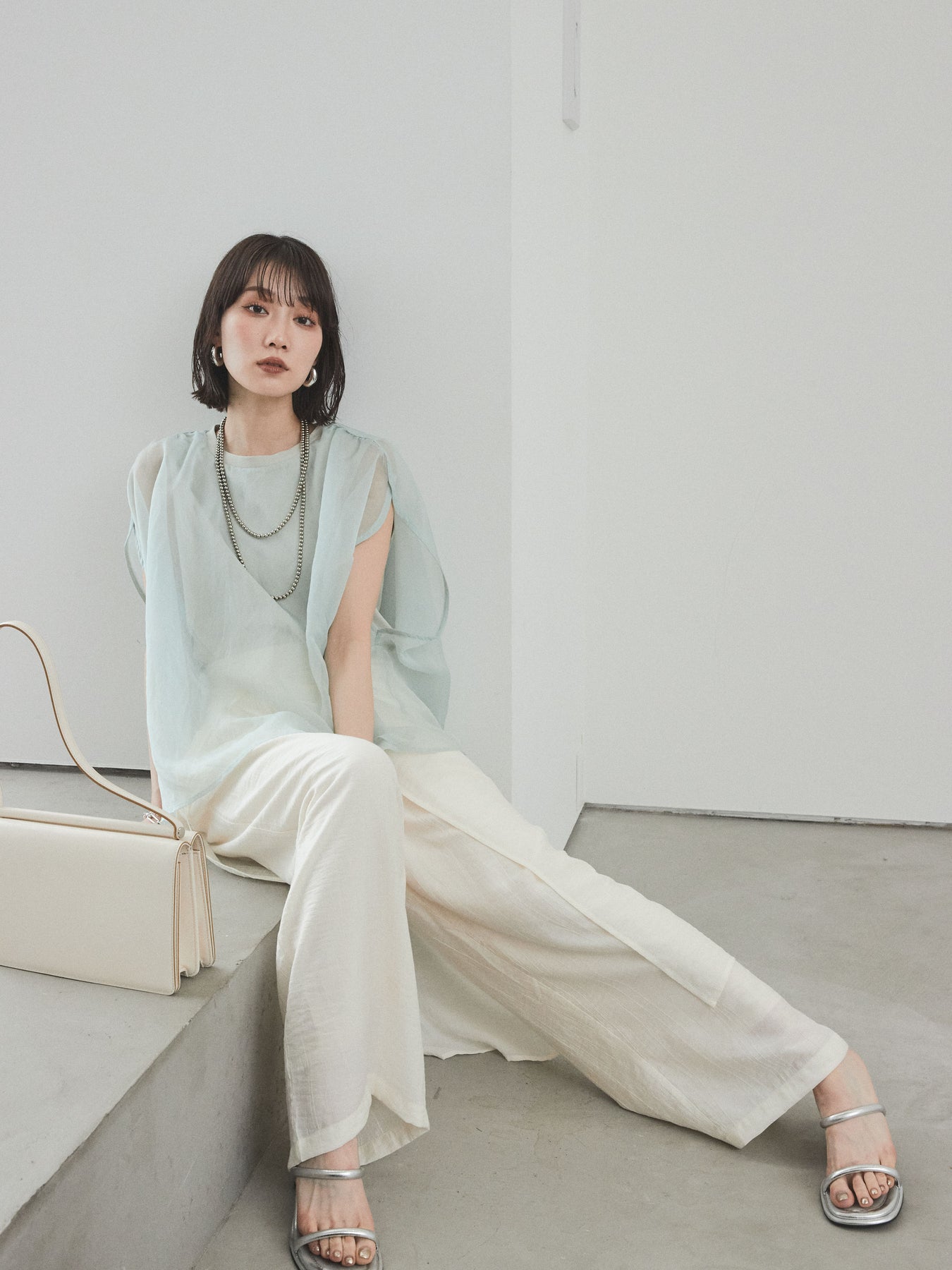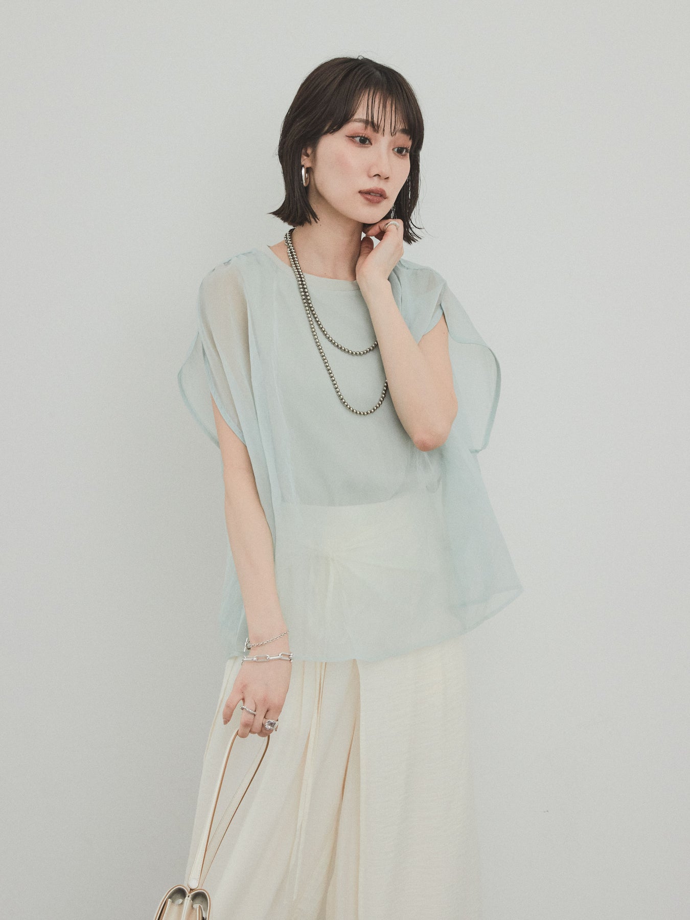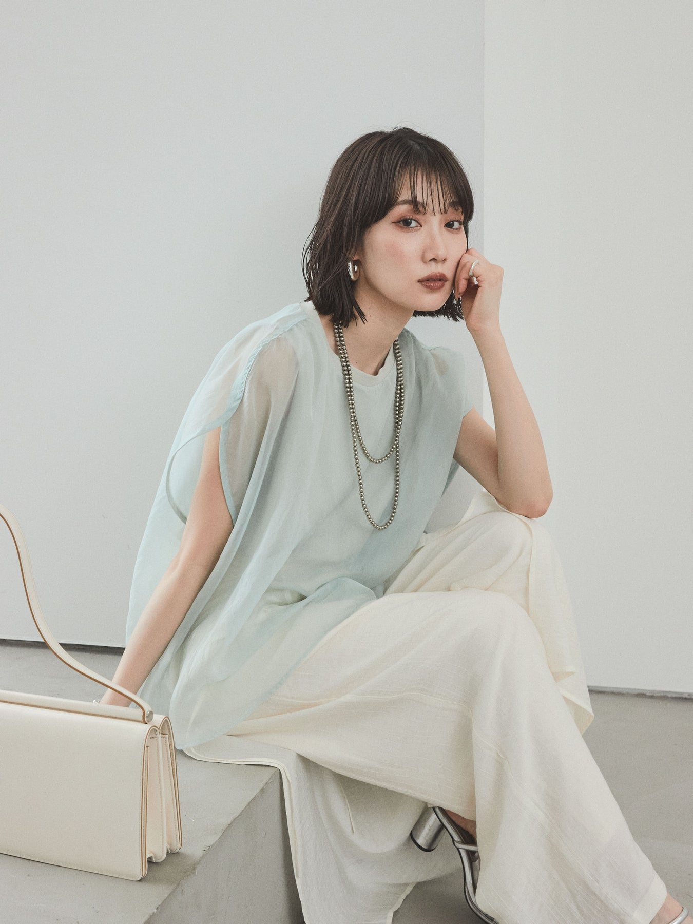 さらっとした肌触りのコンパクトスムース素材に、シアー感のある生地を重ねたレイヤードトップス。透け感のある軽やかな素材が女性らしい抜け感を演出し、インナーとの組み合わせで表情の変化も楽しめます。ややルーズなシルエットでリラクシーな着心地ながら、きちんと感もある上品な仕上がり。パンツやスカートはもちろん、ジャンスカやキャミワンピのインナーとしてもおすすめです。シーズンレスに活躍する、着回し力抜群の一着。 ※ボトムス、キャミソール(インナー)以外の商品は一律でインナーは付属していません。