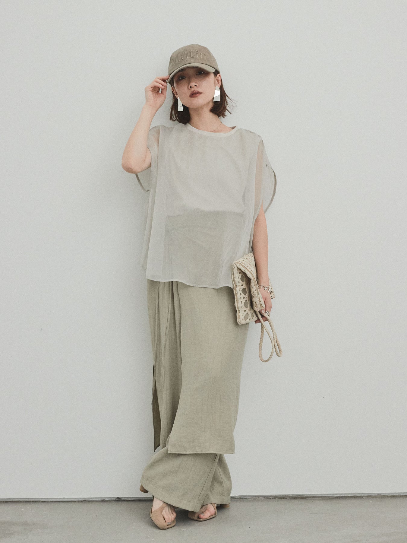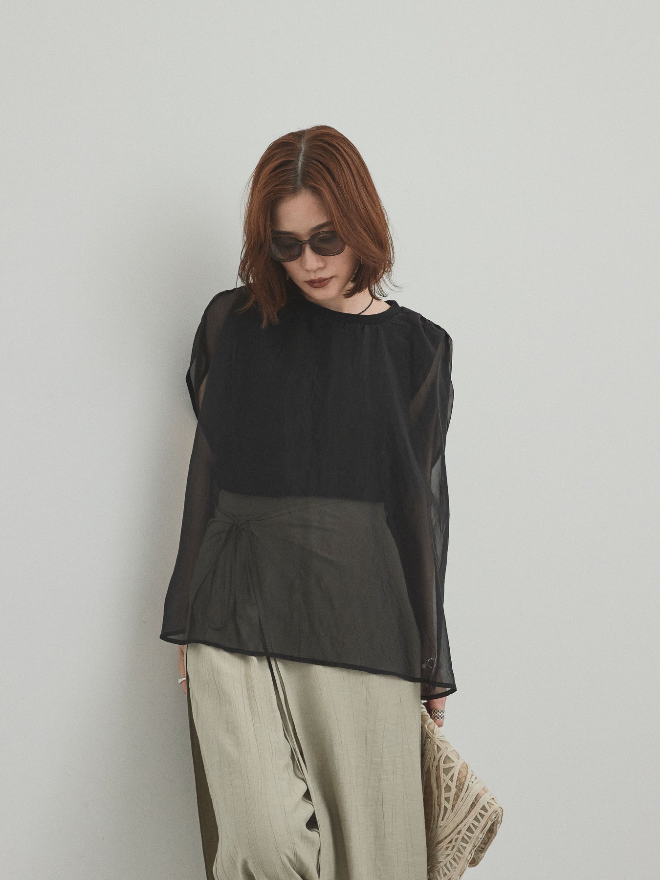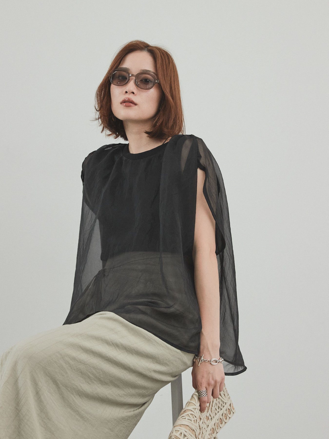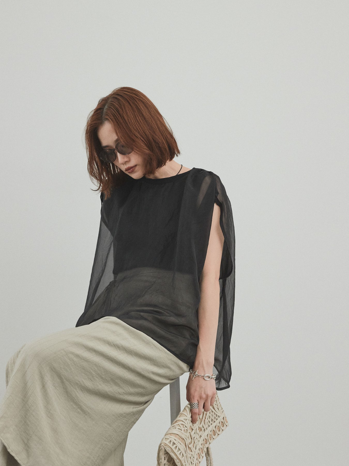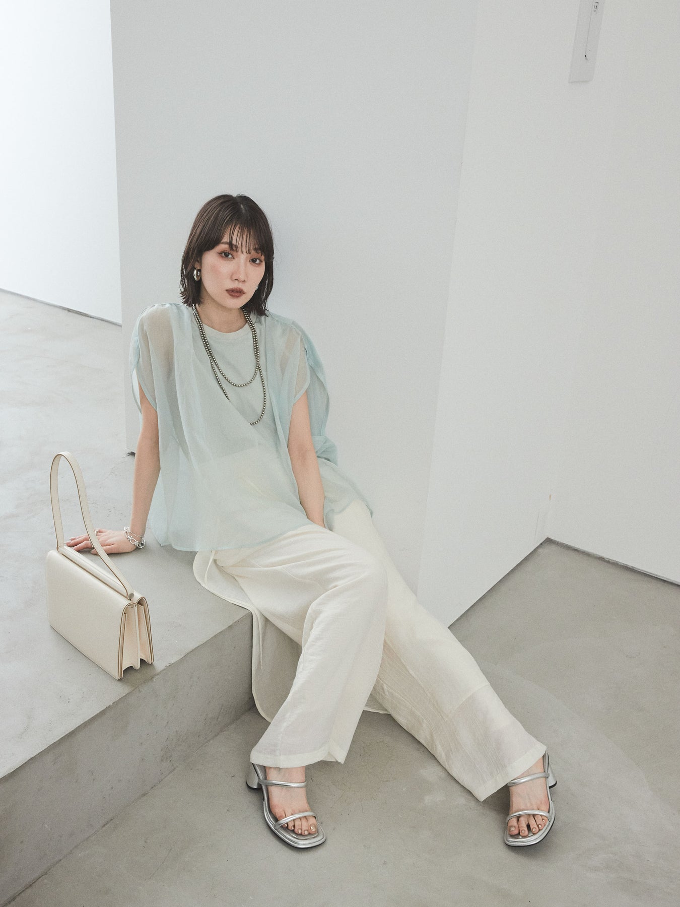 さらっとした肌触りのコンパクトスムース素材に、シアー感のある生地を重ねたレイヤードトップス。透け感のある軽やかな素材が女性らしい抜け感を演出し、インナーとの組み合わせで表情の変化も楽しめます。ややルーズなシルエットでリラクシーな着心地ながら、きちんと感もある上品な仕上がり。パンツやスカートはもちろん、ジャンスカやキャミワンピのインナーとしてもおすすめです。シーズンレスに活躍する、着回し力抜群の一着。 ※ボトムス、キャミソール(インナー)以外の商品は一律でインナーは付属していません。