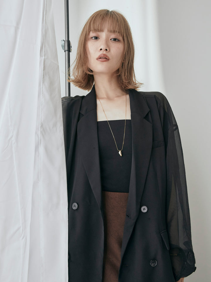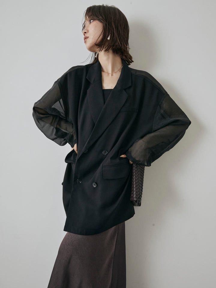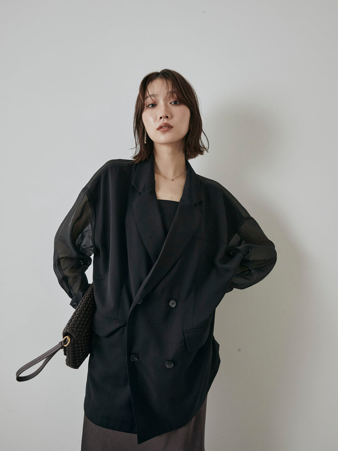 シアー素材のスリーブが軽やかさを添える、モードな雰囲気漂うオーバーサイズのテーラードジャケット。 クラシカルなダブルボタンのデザインに、ほんのり透け感のある袖の異素材切替で抜け感をプラスした、存在感のある1枚です。 程よく落ち感のあるシルエットで、肩の力を抜いたこなれた着こなしが叶うデザイン。 ヒップが隠れる着丈感で、パンツにもスカートにも合わせやすいバランスに仕上げています。 インナーにタンクトップやキャミソールを合わせて軽やかに、ボリュームスカートと合わせてレディに着こなすのもおすすめ。 羽織るだけで洗練された印象に導く、大人のための春夏ジャケットです。