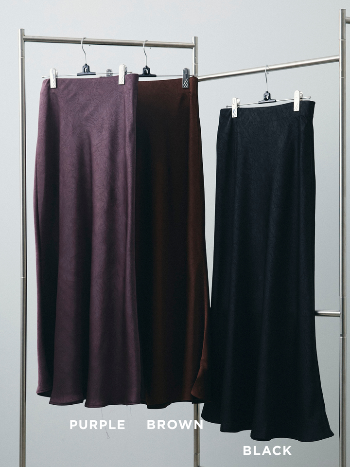 さりげない光沢感とワッシャー加工の表情が魅力の、大人のためのサテンナロースカート。 上品な艶感のある素材に、表面のシボ感が加わることで、シンプルながら奥行きのある印象に仕上がっています。 腰まわりはすっきりと、裾にかけてややフレアに広がる美しいシルエットが女性らしさを引き立て、スタイルアップ効果も抜群。 ストレッチ性のある裏地付きで、動きやすさと安心感も兼ね備えています。 Tシャツやシャツと合わせてカジュアルダウンするのはもちろん、ノースリーブやブラウスでキレイめに仕上げるのもおすすめ。 デイリーからちょっとしたお出かけまで、幅広く活躍する万能スカートです。