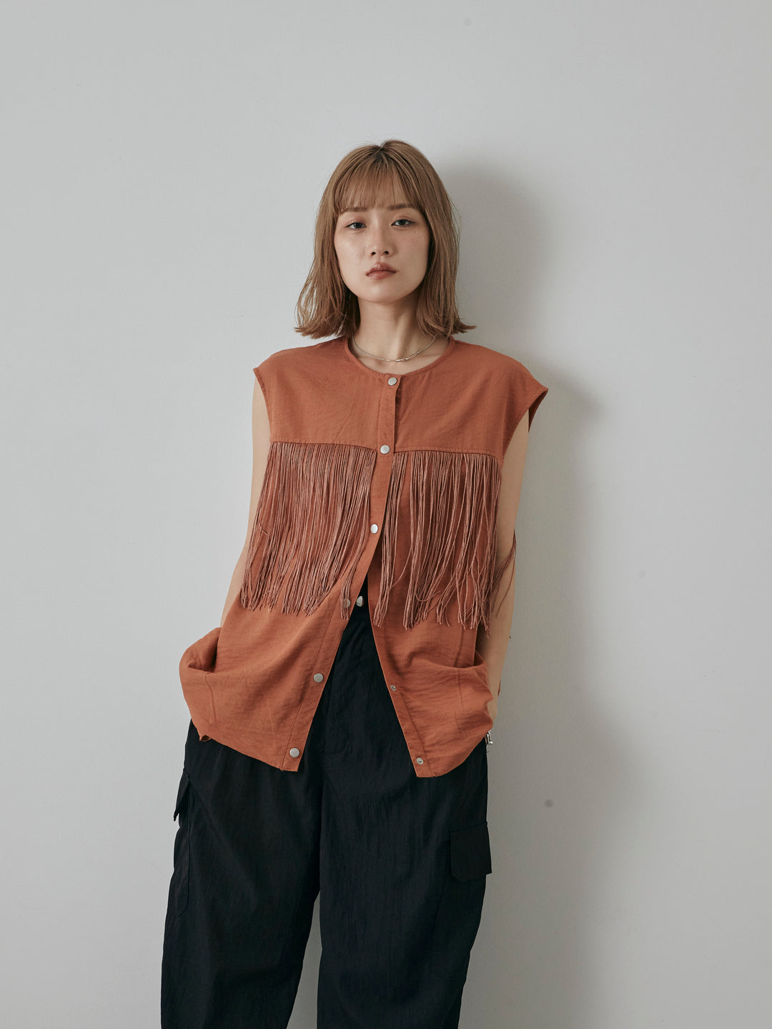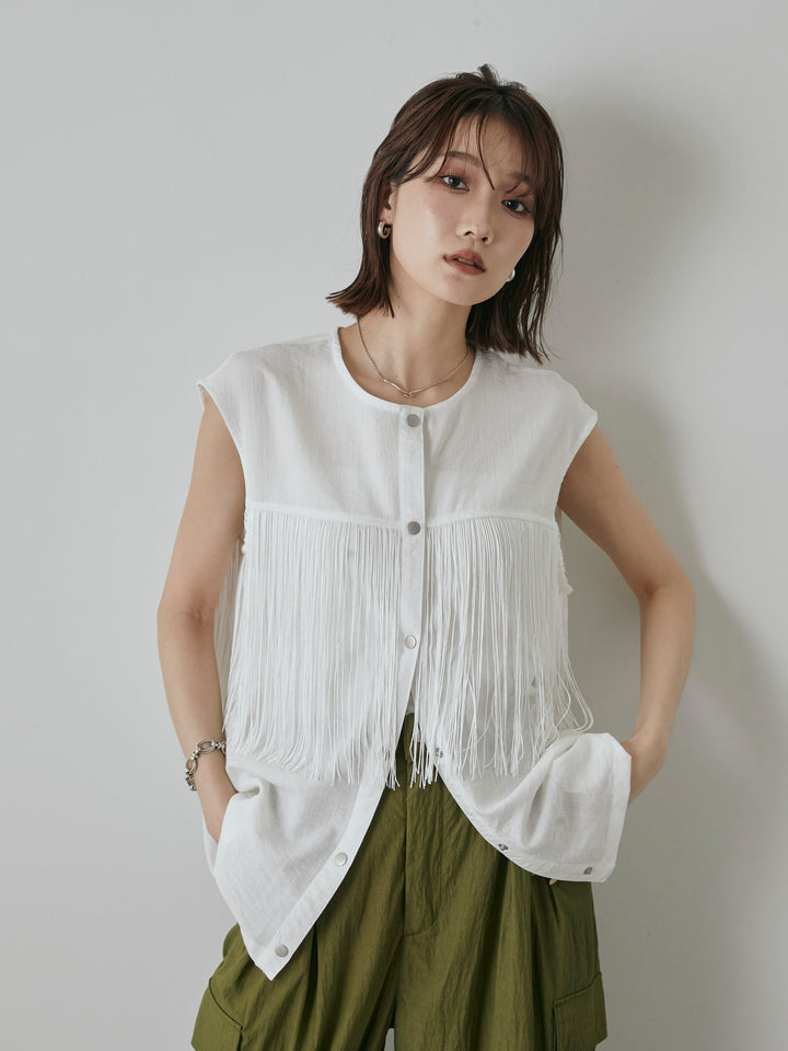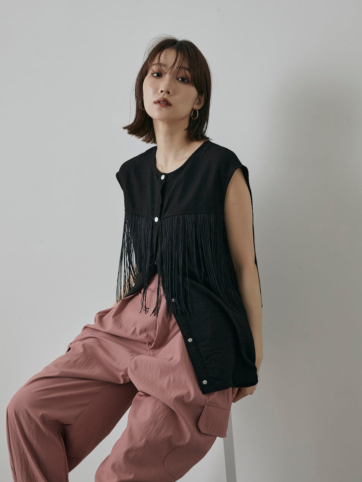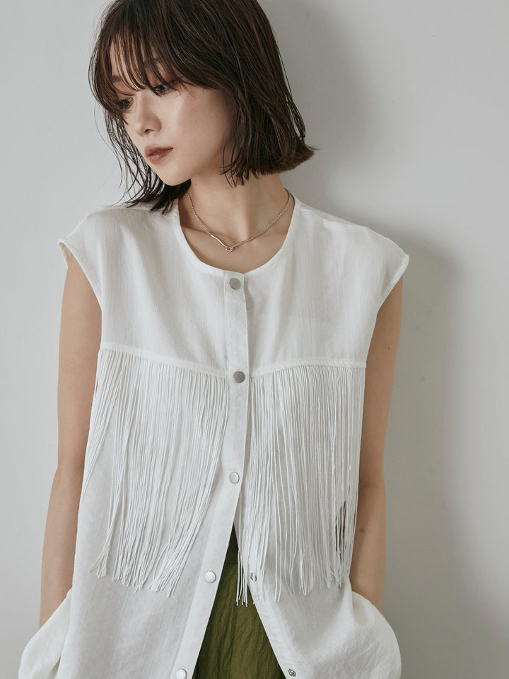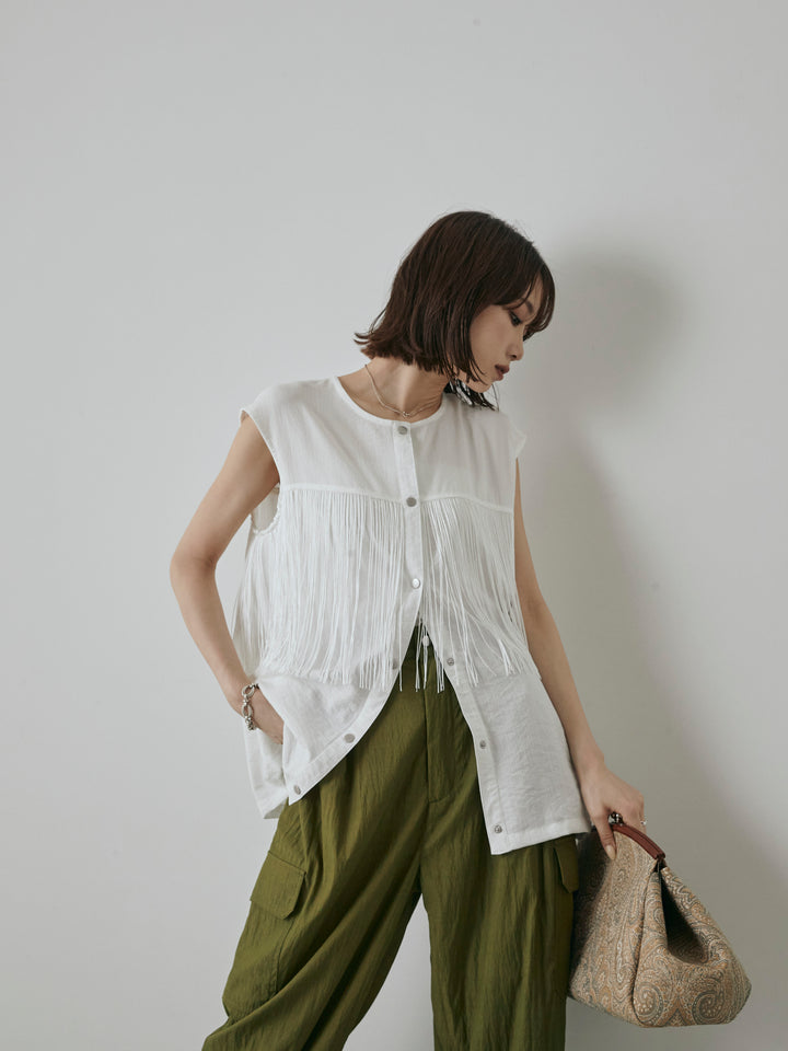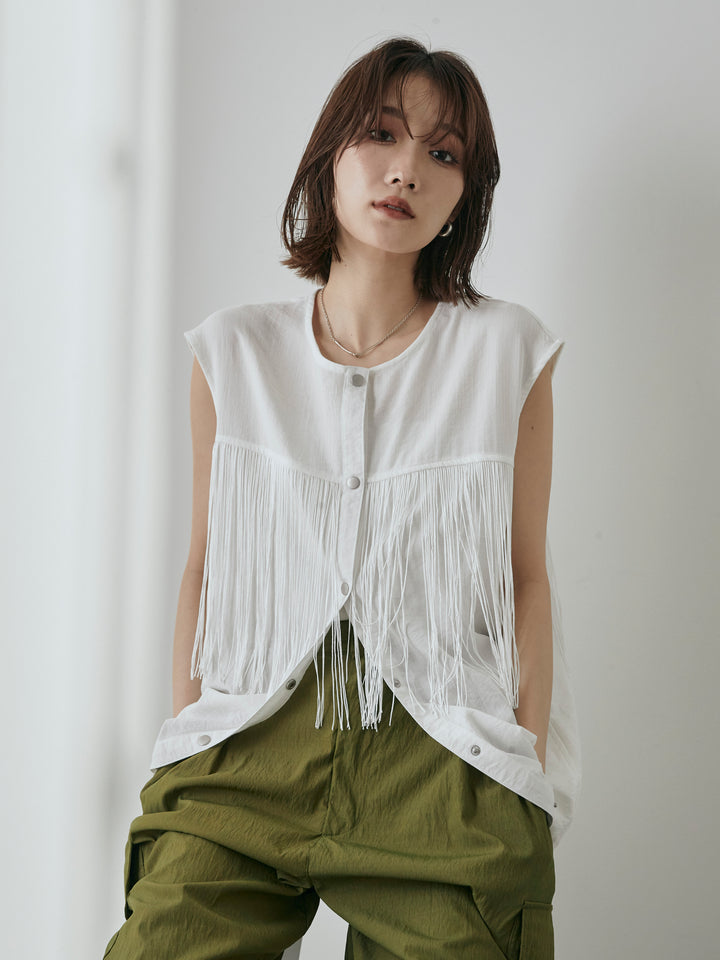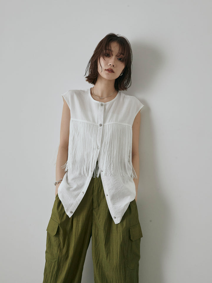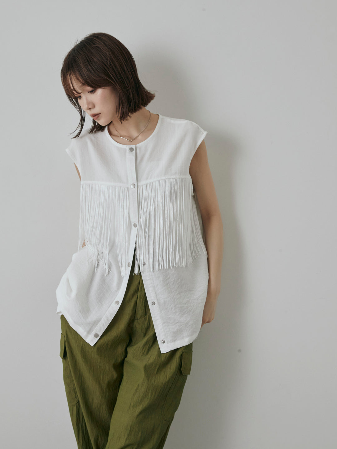 フロントにたっぷり施されたフリンジが印象的な、主役級のノースリーブブラウス。 動くたびに揺れるフリンジが目を惹き、シンプルながらもコーデに華やかさと抜け感をプラスしてくれる一枚です。 ボディにはさらっとした肌触りのコットン混素材を使用し、軽やかで快適な着心地を実現。 肩まわりを程よくカバーするスリーブデザインで、ノースリーブ初心者にも取り入れやすいバランス感です。 パンツにもスカートにも合わせやすく、羽織りのインナーとしても存在感を放つ万能アイテム。 フロントはボタン開きで、前を開けてベスト風にも着こなせる2WAY仕様です。