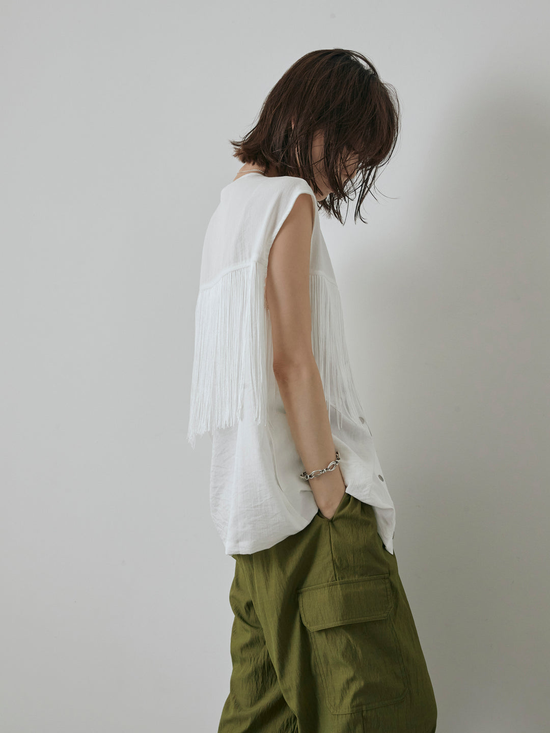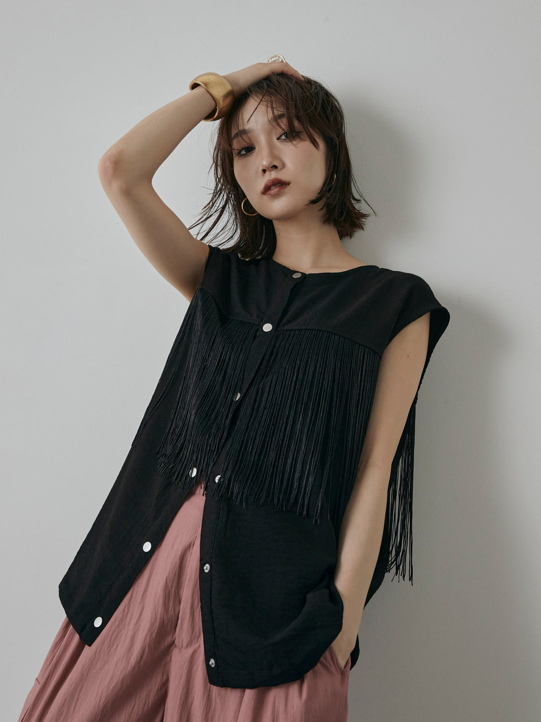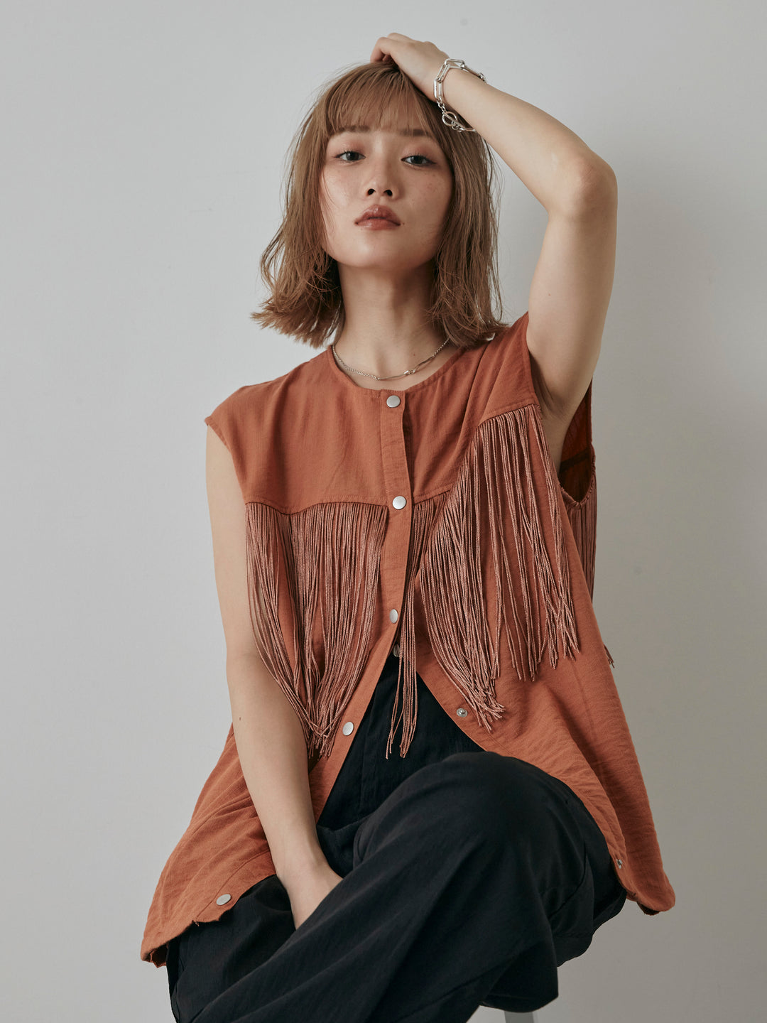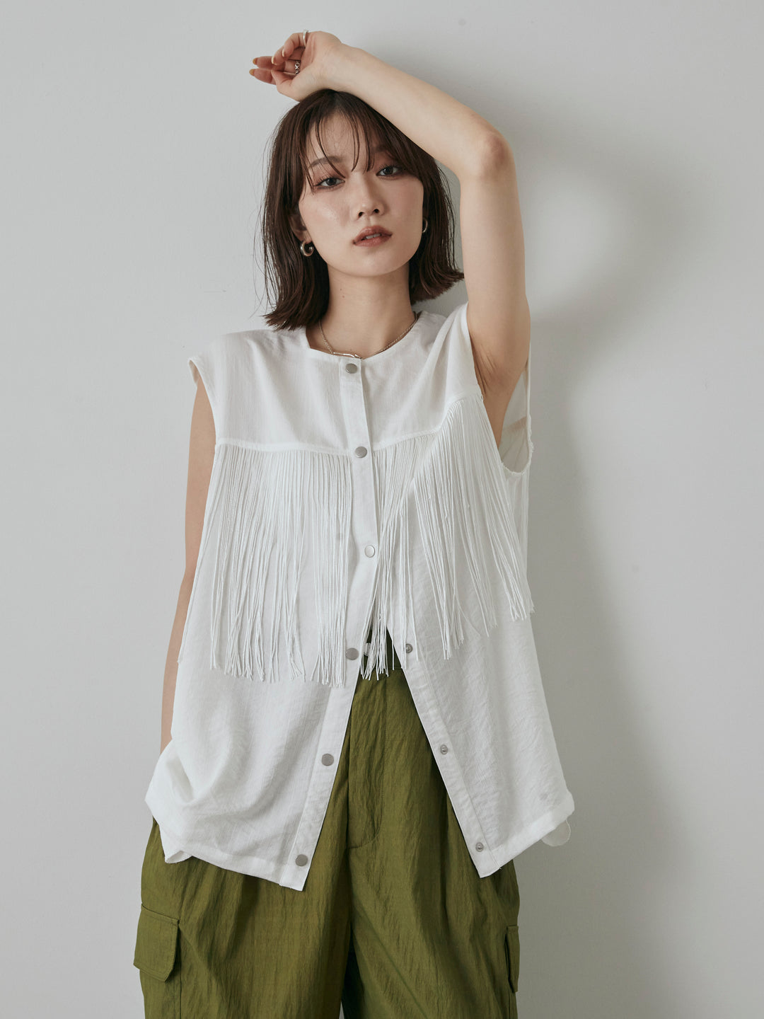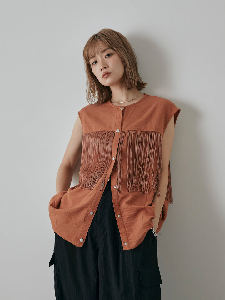 フロントにたっぷり施されたフリンジが印象的な、主役級のノースリーブブラウス。 動くたびに揺れるフリンジが目を惹き、シンプルながらもコーデに華やかさと抜け感をプラスしてくれる一枚です。 ボディにはさらっとした肌触りのコットン混素材を使用し、軽やかで快適な着心地を実現。 肩まわりを程よくカバーするスリーブデザインで、ノースリーブ初心者にも取り入れやすいバランス感です。 パンツにもスカートにも合わせやすく、羽織りのインナーとしても存在感を放つ万能アイテム。 フロントはボタン開きで、前を開けてベスト風にも着こなせる2WAY仕様です。