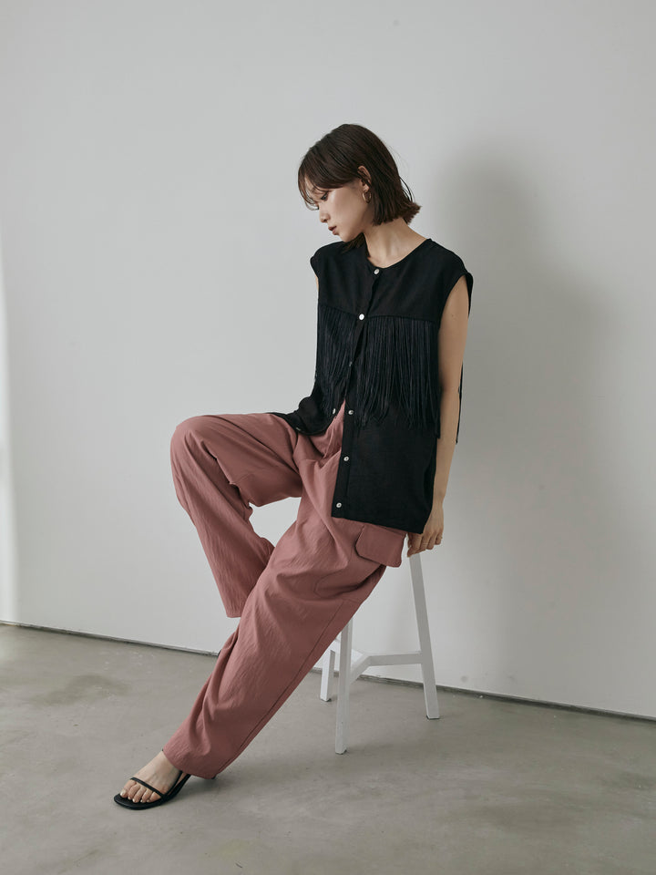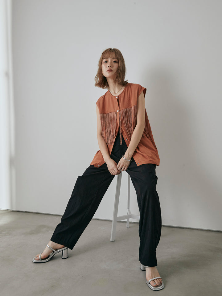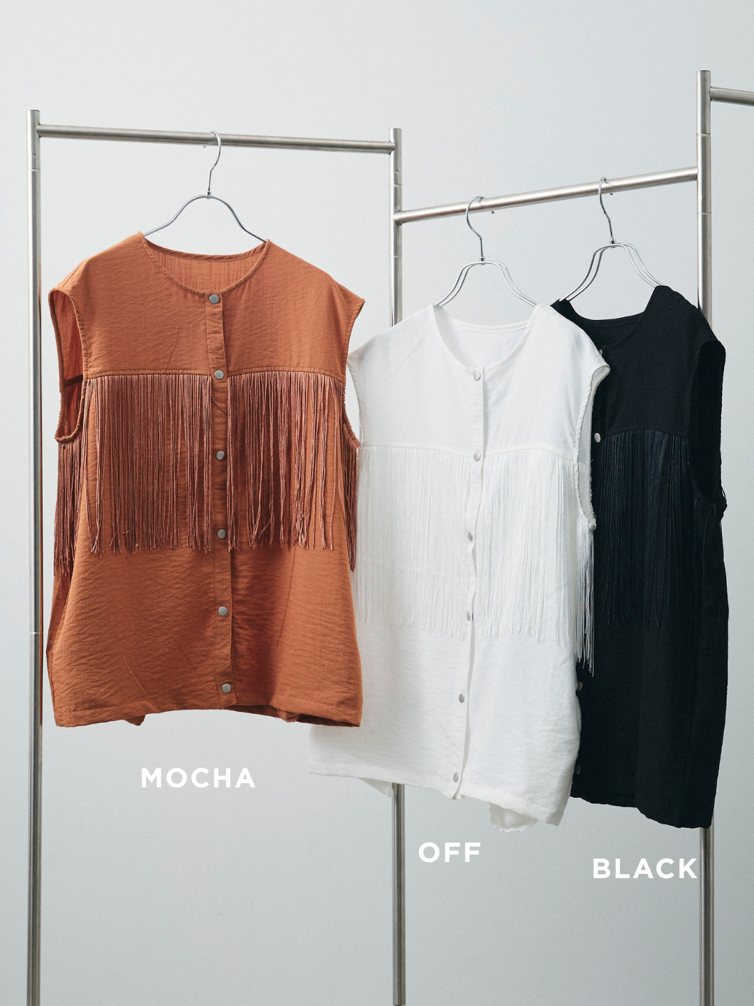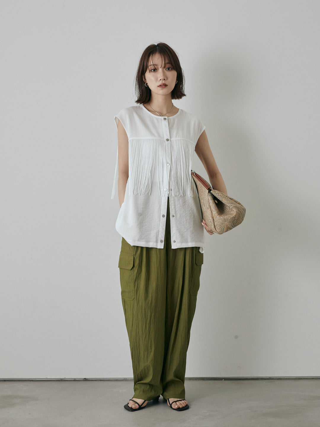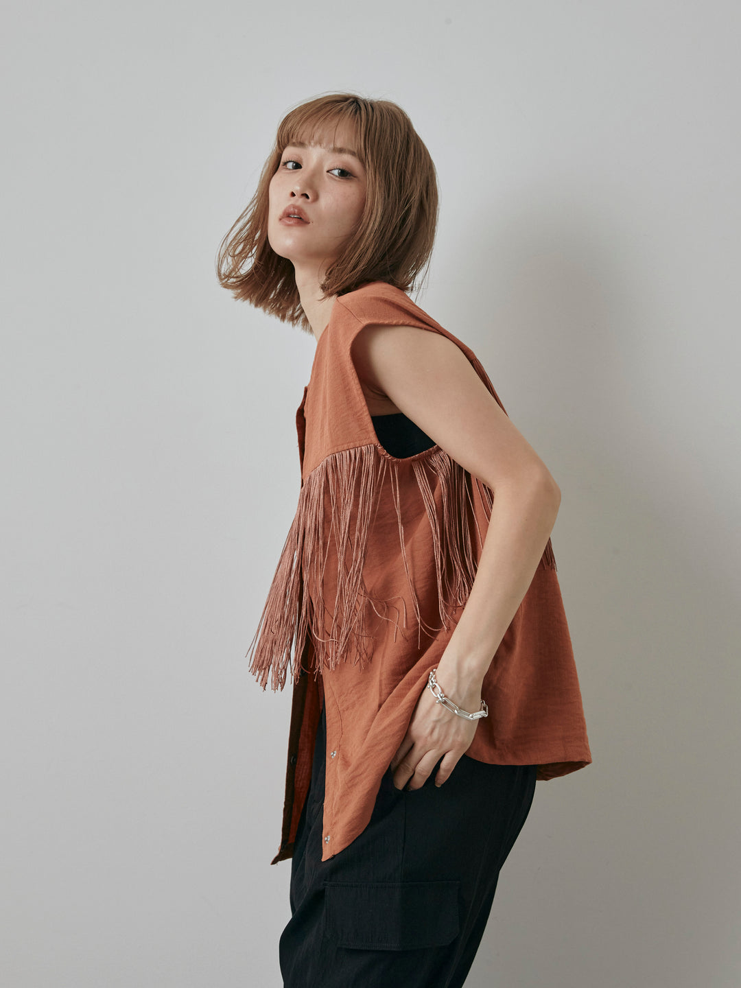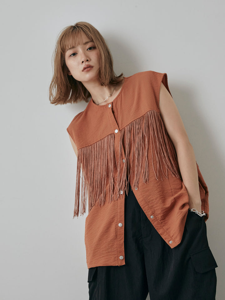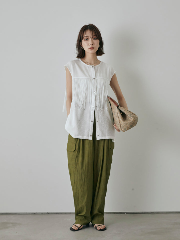 フロントにたっぷり施されたフリンジが印象的な、主役級のノースリーブブラウス。 動くたびに揺れるフリンジが目を惹き、シンプルながらもコーデに華やかさと抜け感をプラスしてくれる一枚です。 ボディにはさらっとした肌触りのコットン混素材を使用し、軽やかで快適な着心地を実現。 肩まわりを程よくカバーするスリーブデザインで、ノースリーブ初心者にも取り入れやすいバランス感です。 パンツにもスカートにも合わせやすく、羽織りのインナーとしても存在感を放つ万能アイテム。 フロントはボタン開きで、前を開けてベスト風にも着こなせる2WAY仕様です。