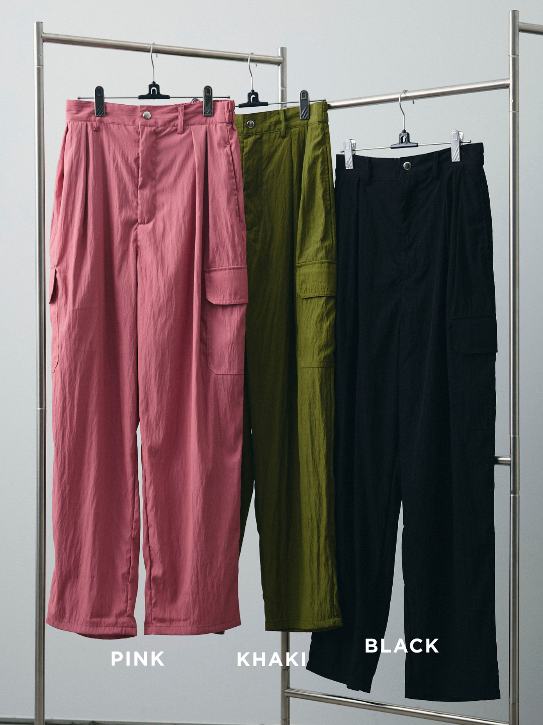 程よいラフさと抜け感を兼ね備えた、大人のためのミリタリーカーゴパンツ。 マットな表情とワッシャー加工による軽やかな風合いが、こなれたスタイリングを叶える1本です。 太ももにあしらわれたフラップポケットがミリタリーテイストを感じさせつつも、シルエットはすっきり見えするストレートライン。 ウエストはバックゴム仕様で、リラクシーな履き心地を実現しながらもきちんと見えする仕立てです。 Tシャツやタンクトップでカジュアルに、ジャケットやシアーシャツを合わせてモードに振っても◎。 トレンド感のあるカラーバリエーションも魅力の、着回し力抜群なアイテムです。