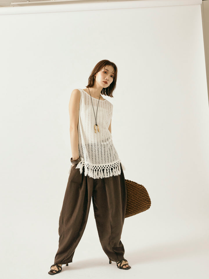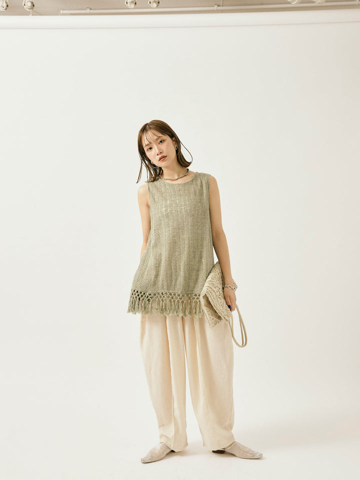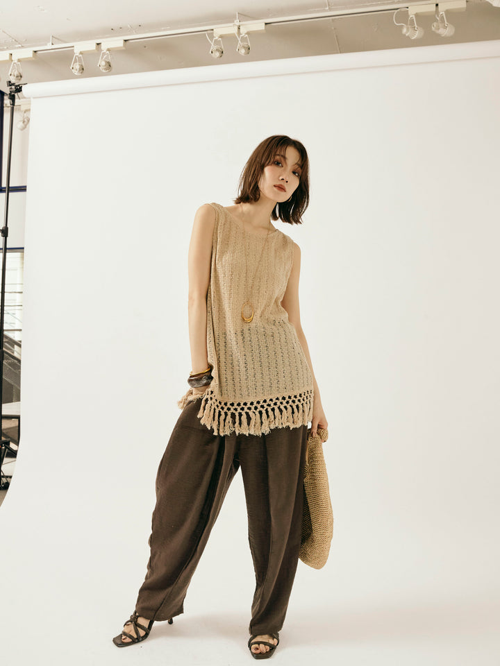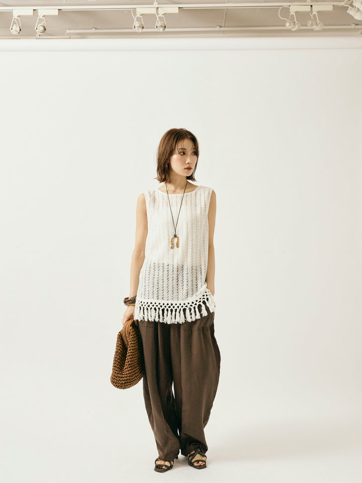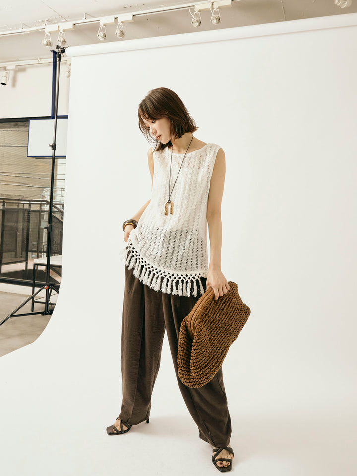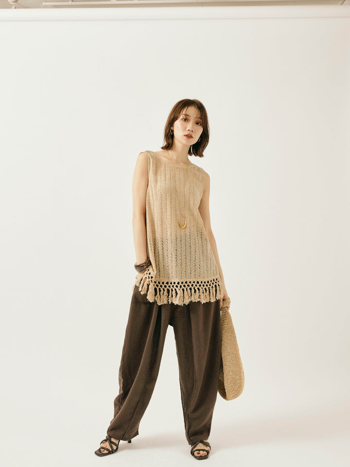 【Allure】[SET]フリンジ透かし編みニットベスト+リネンライクベイカーバルーンパンツ(2set)