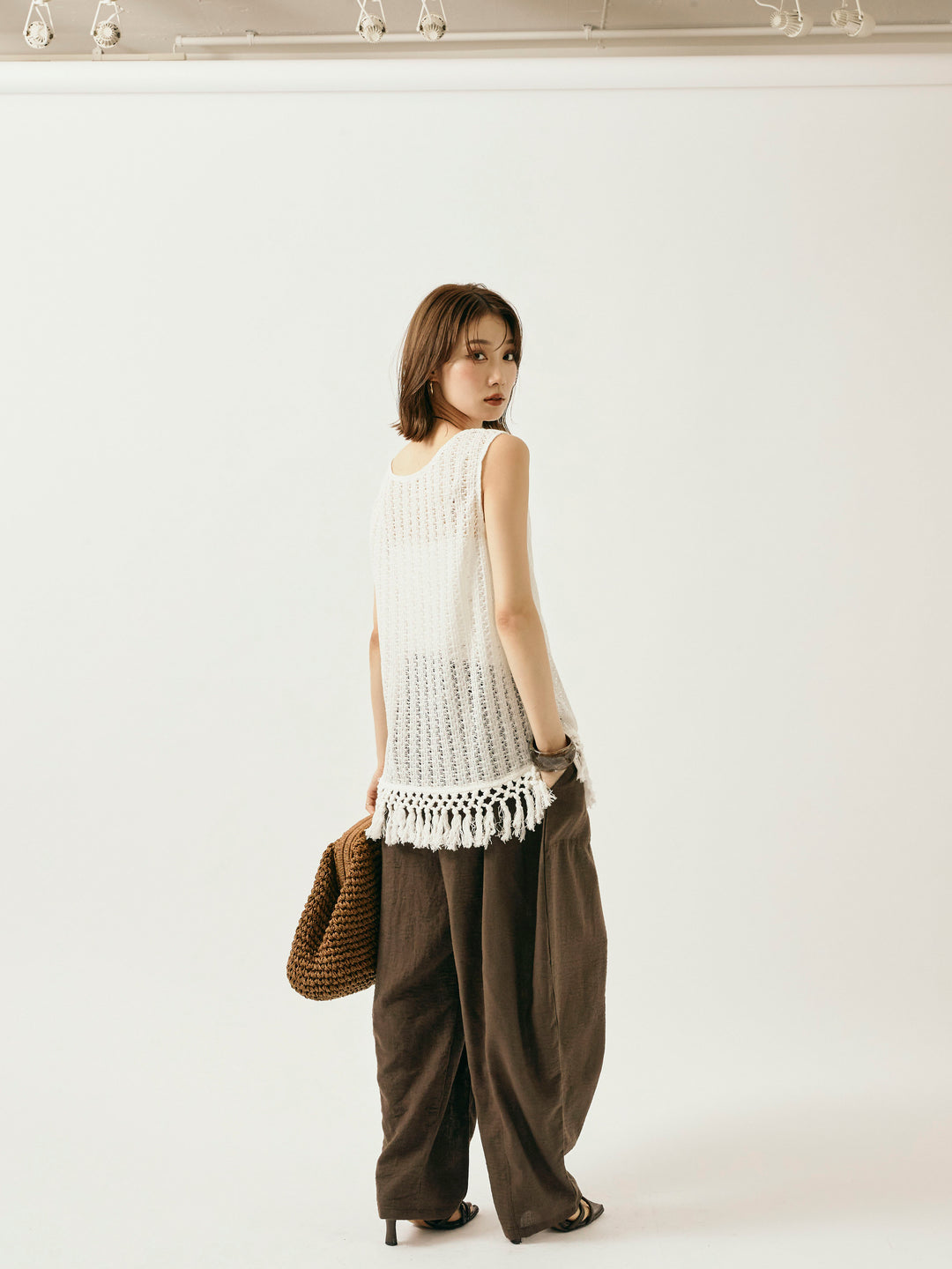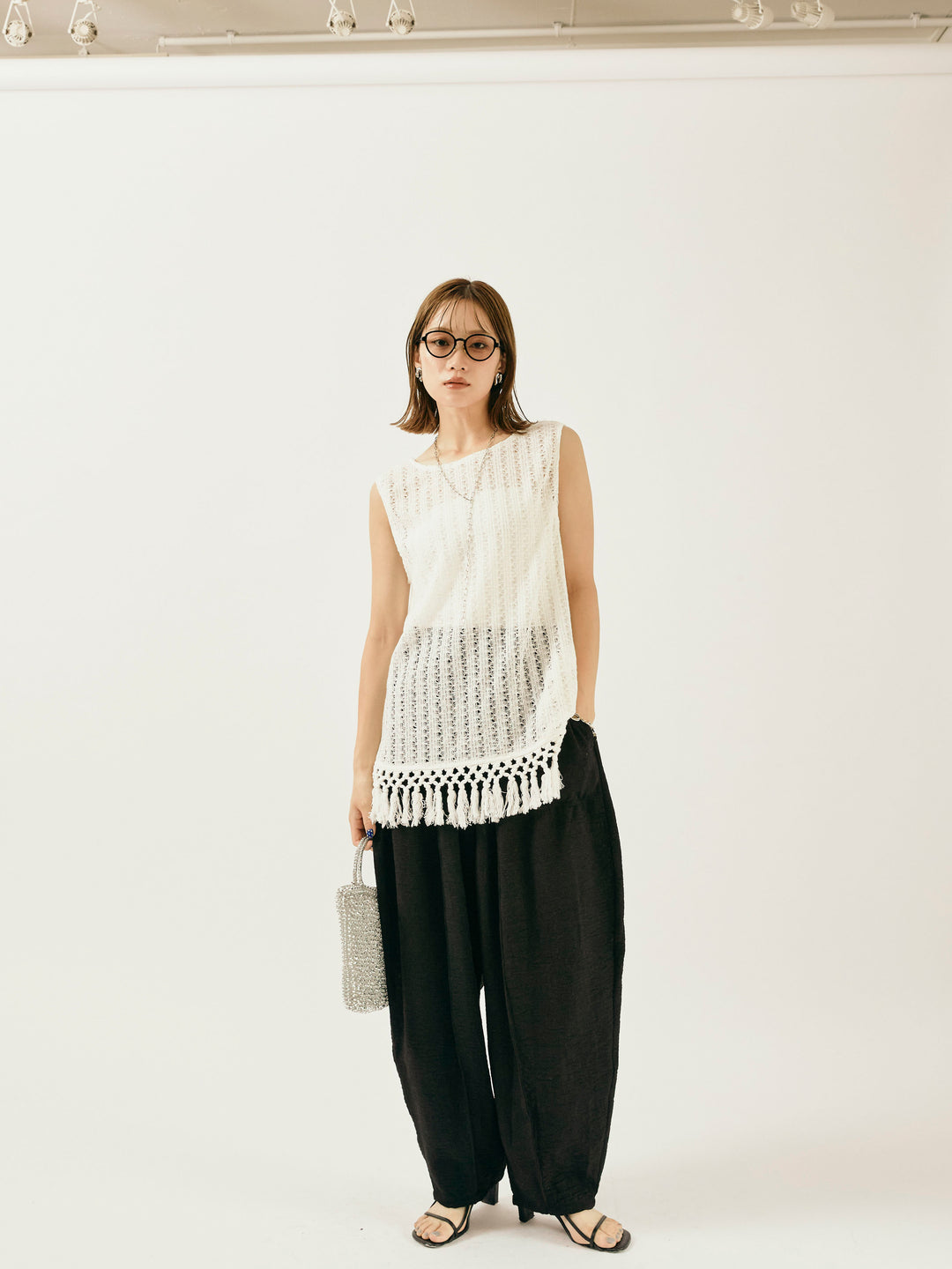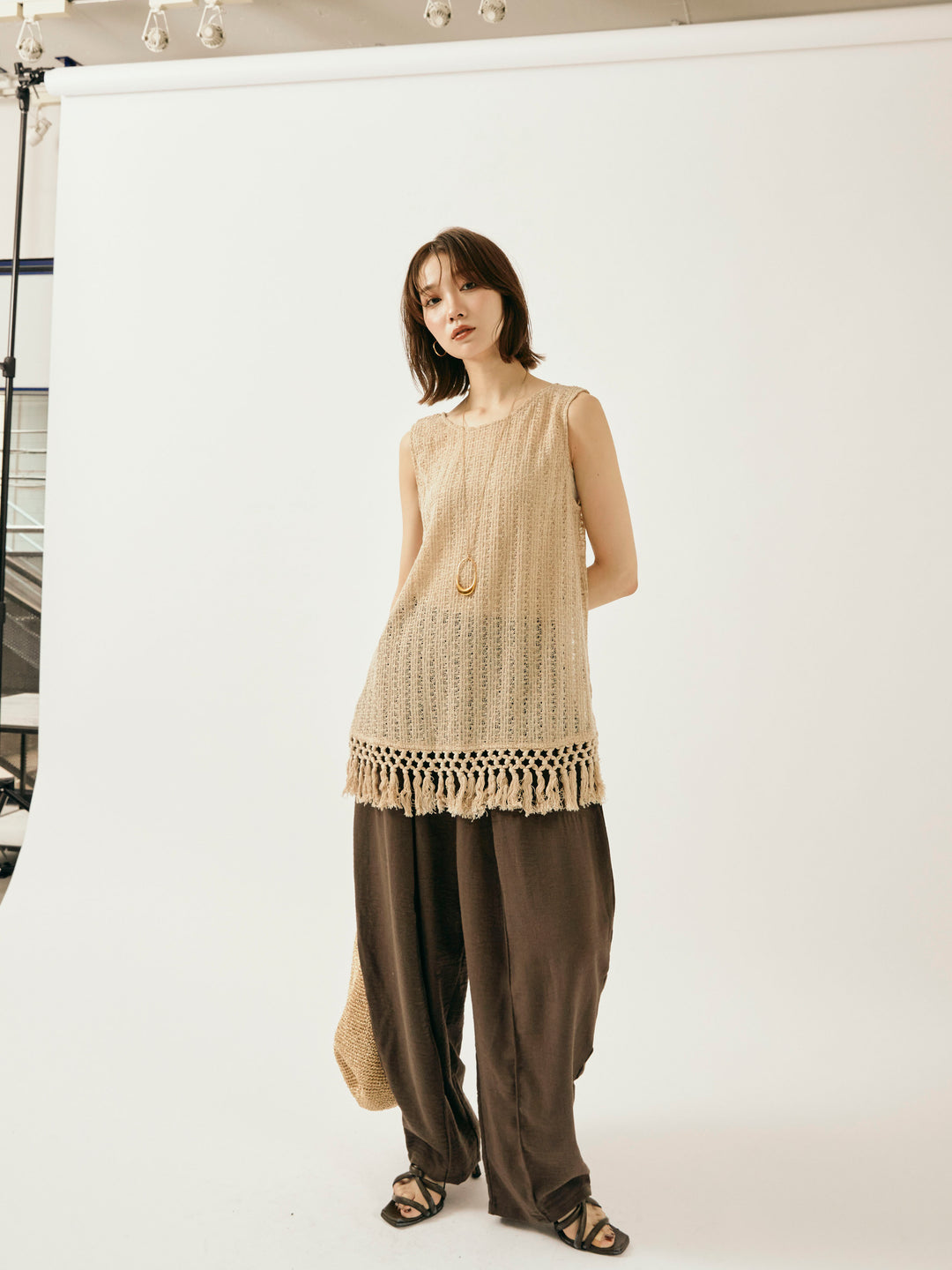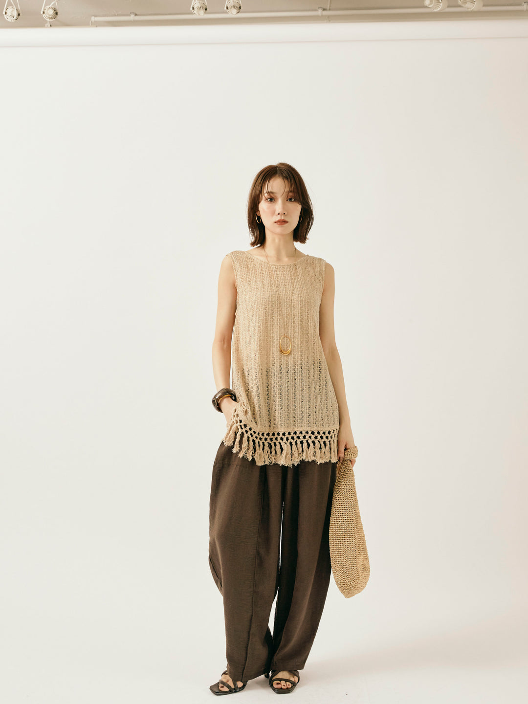【Allure】[SET]フリンジ透かし編みニットベスト+リネンライクベイカーバルーンパンツ(2set)