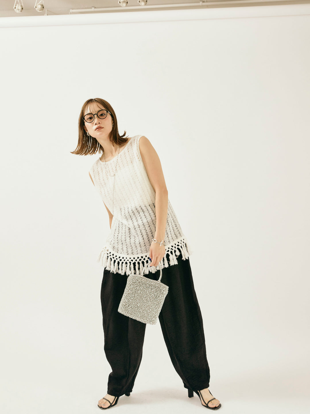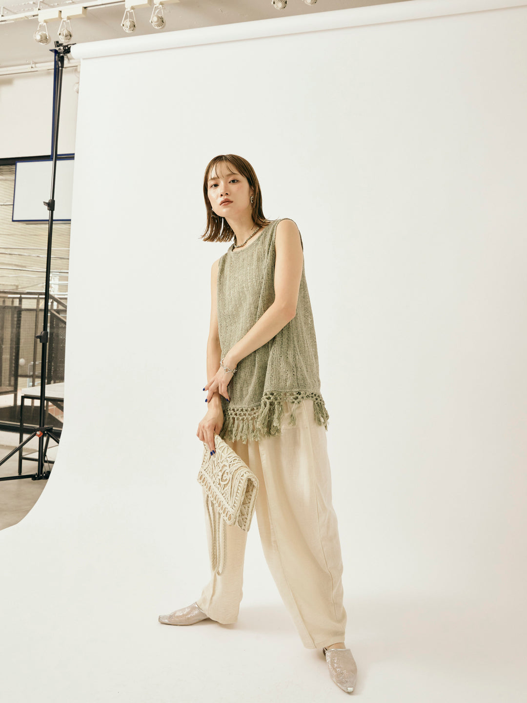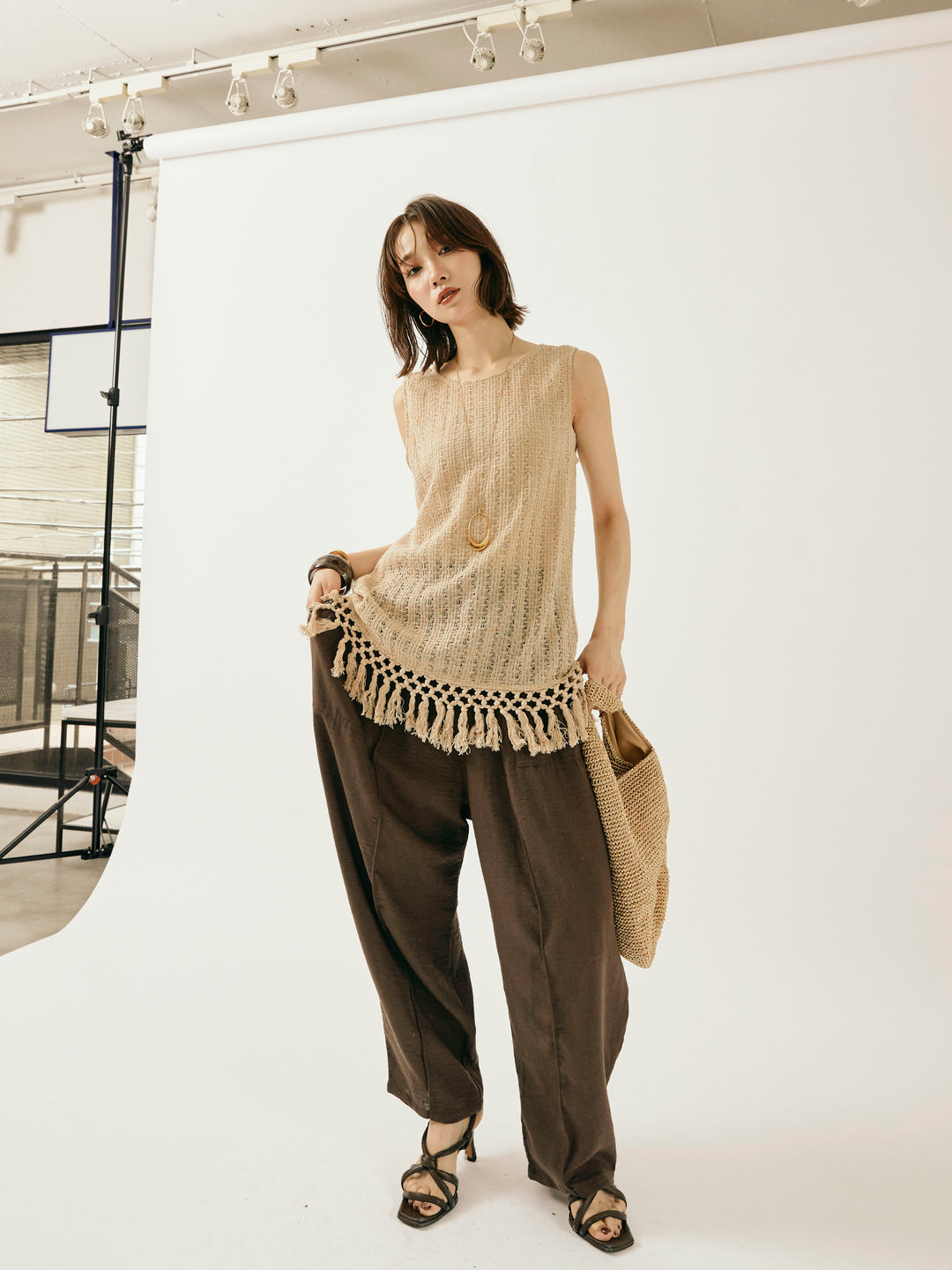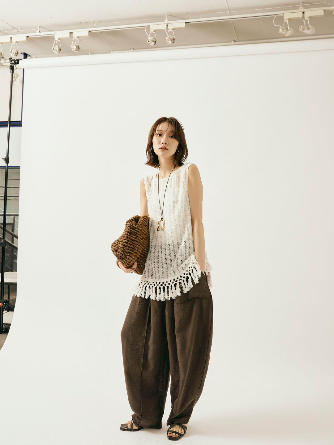 【Allure】[SET]フリンジ透かし編みニットベスト+リネンライクベイカーバルーンパンツ(2set)