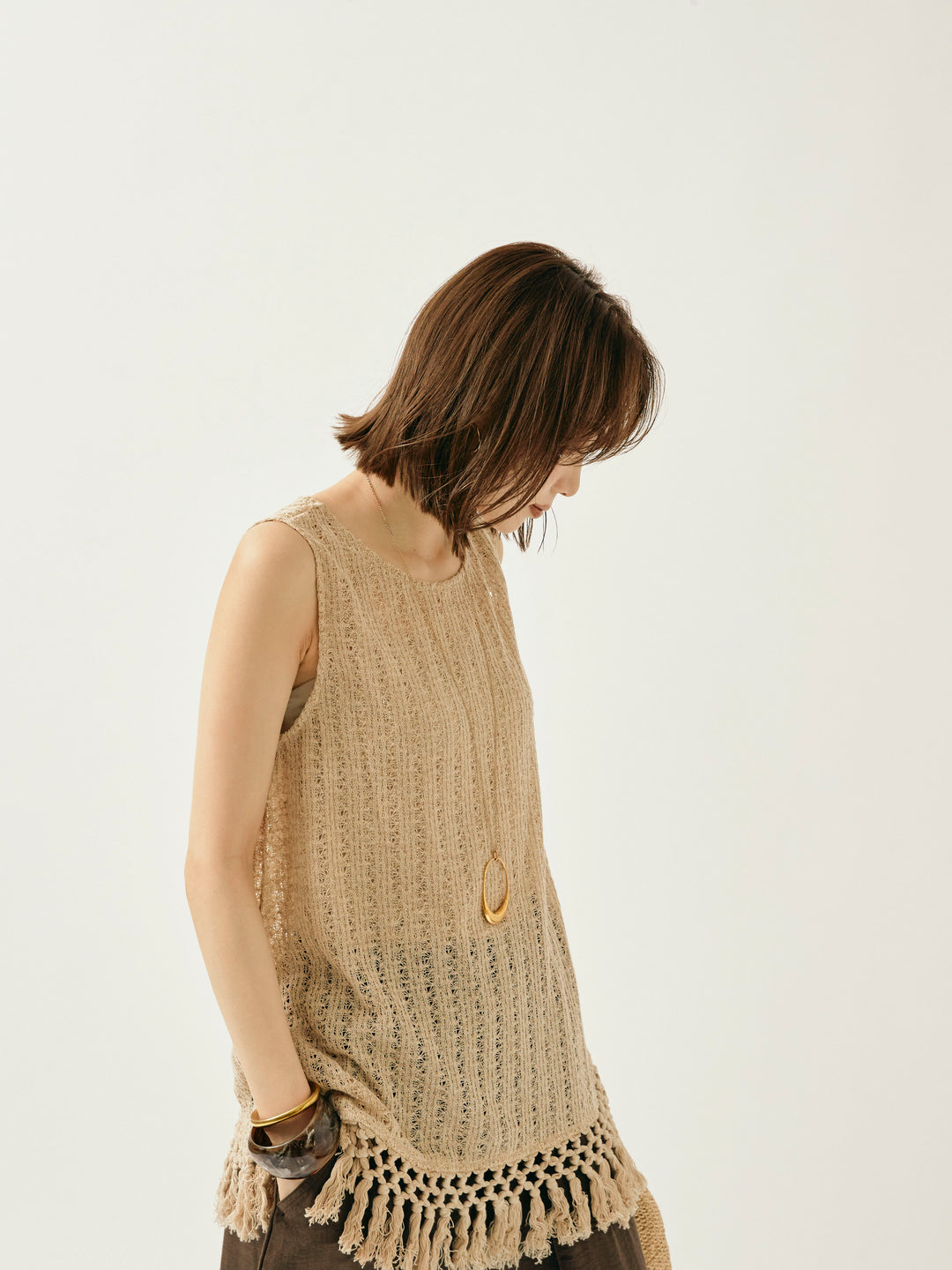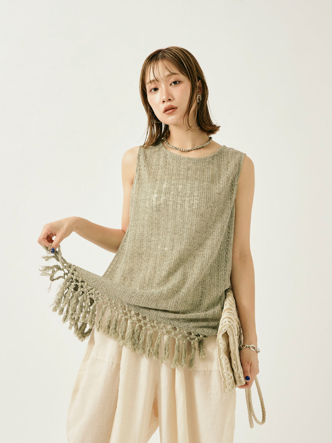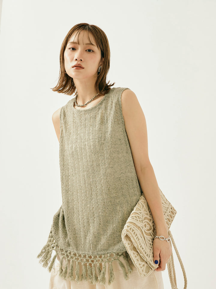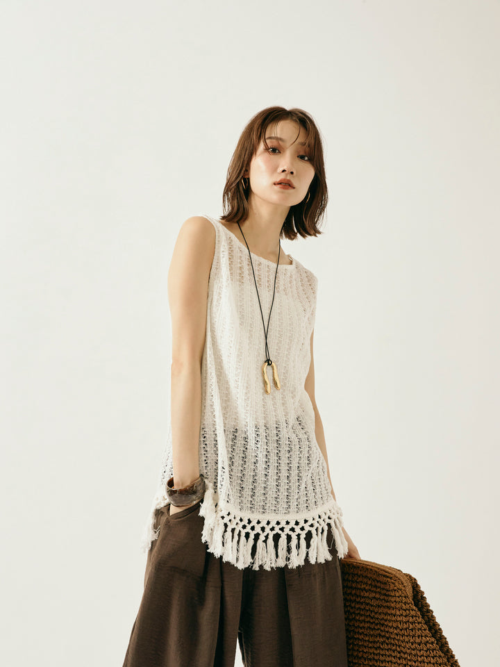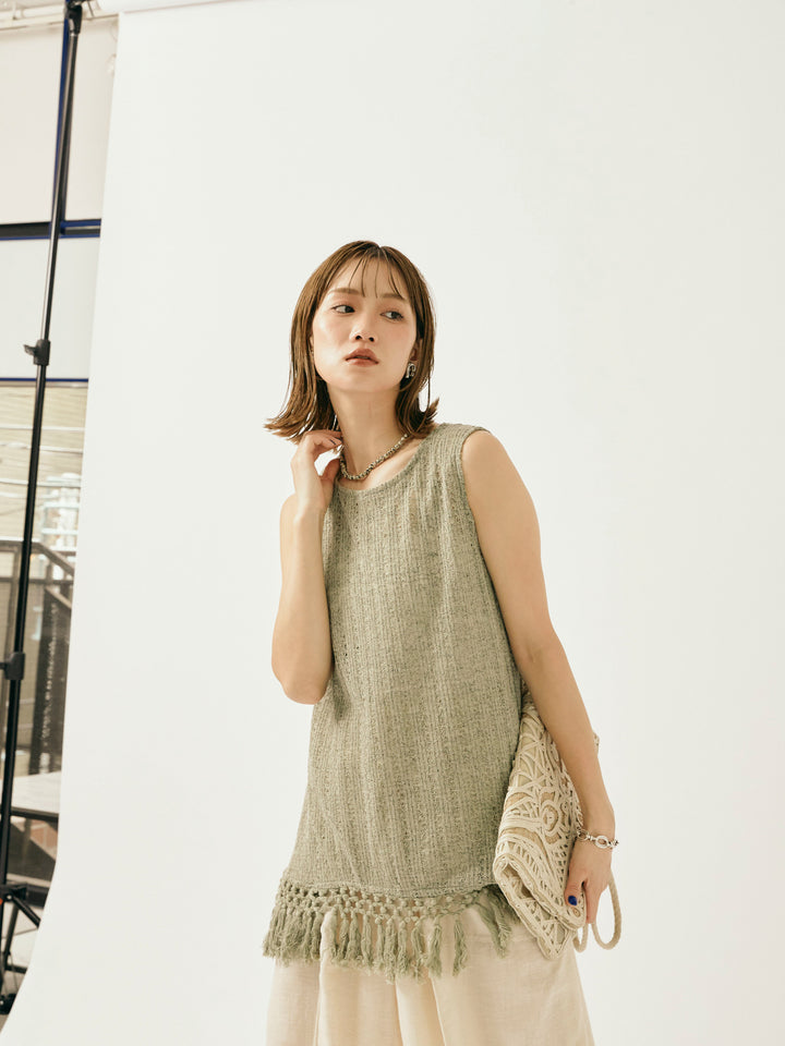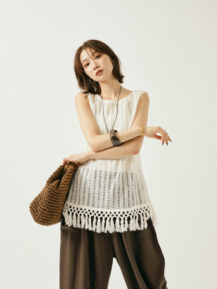 ナチュラルな表情が魅力の透かし編みニットベスト。 裾に施されたフリンジが、動きのあるスタイリングを演出します。 程よいシアー感で、レイヤードコーデにもぴったりなアイテム。 タンクトップやTシャツとの重ね着はもちろん、ワンピースの上にさらっと重ねてもこなれた印象に。 シーズンムード高まる、春夏のスタイリングに取り入れたい1着です。 ※ボトムス、キャミソール(インナー)以外の商品は一律でインナーは付属していません。
