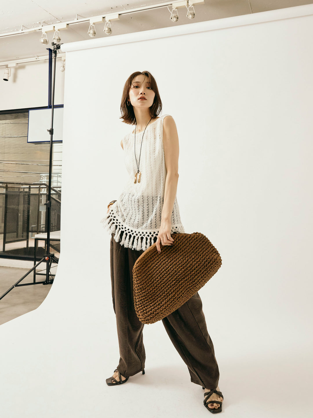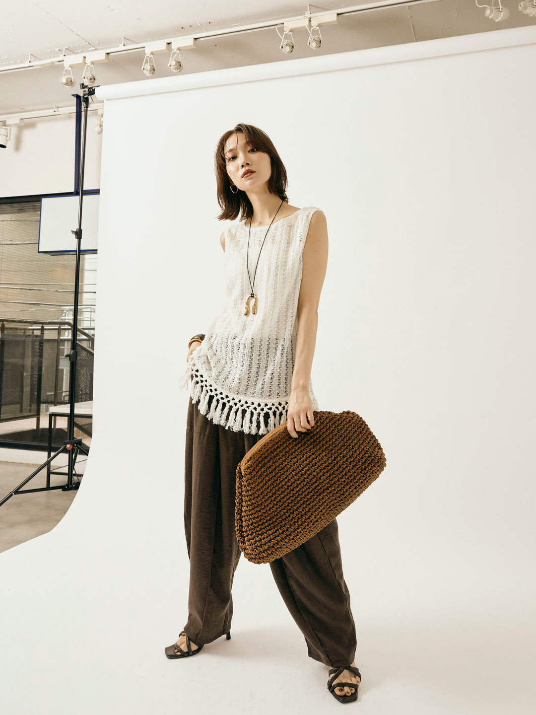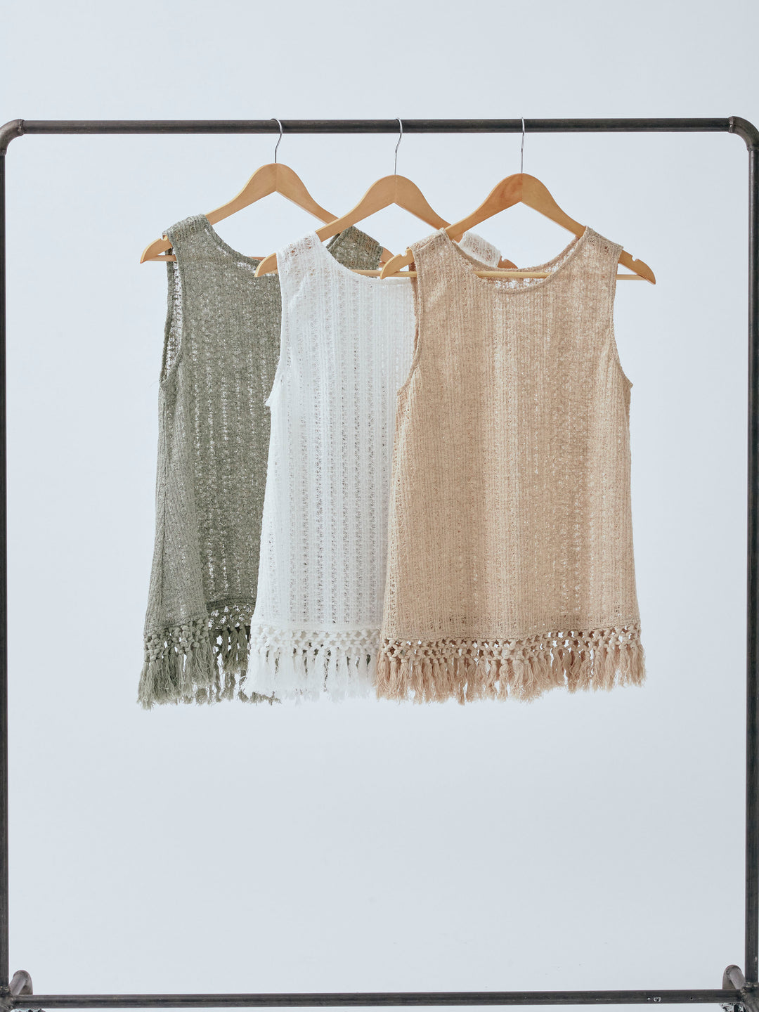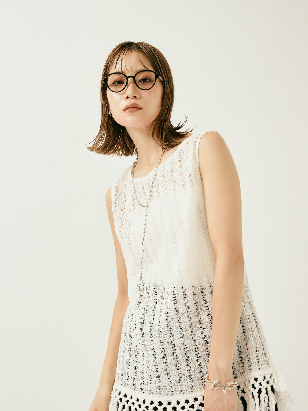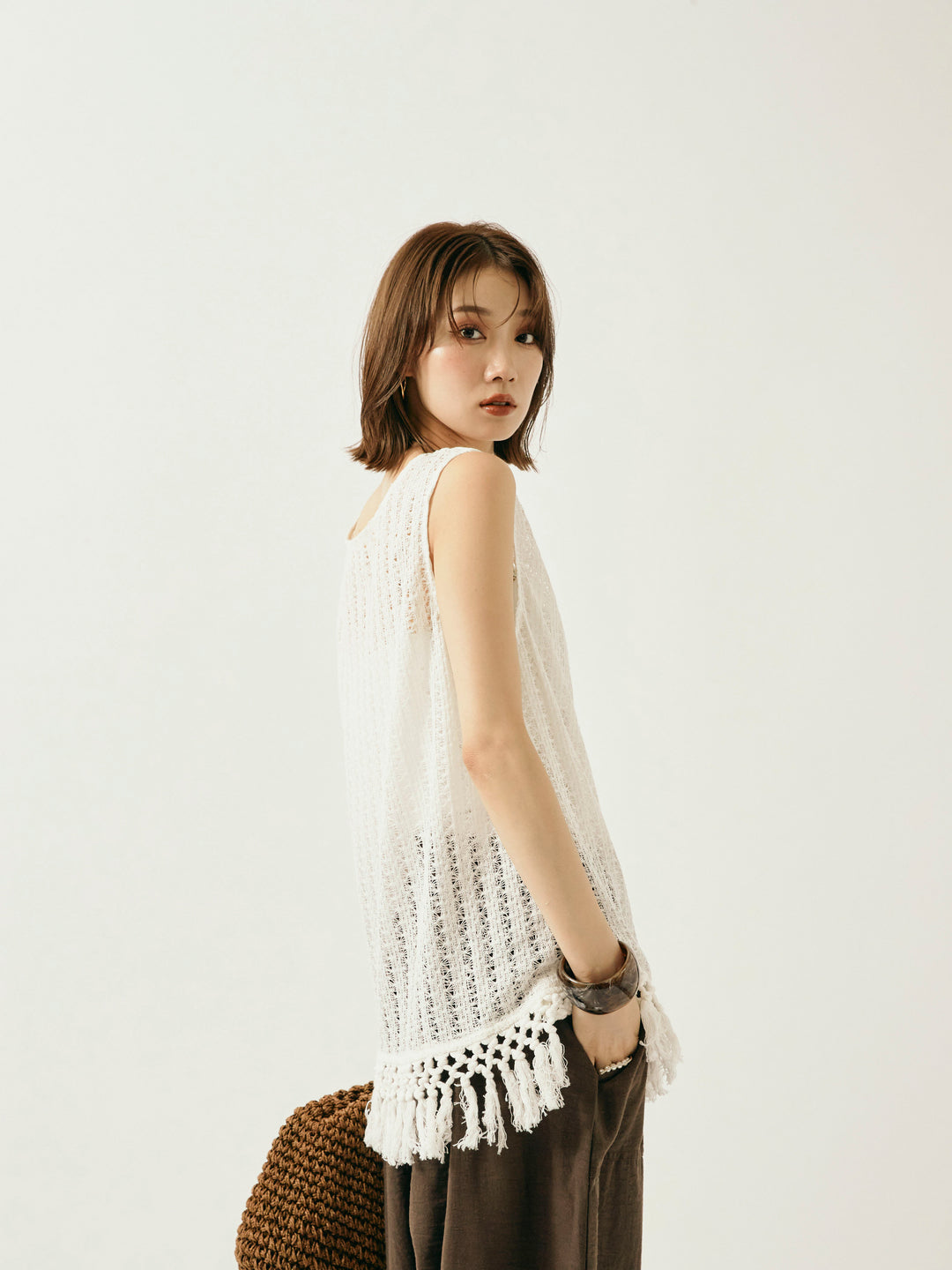 ナチュラルな表情が魅力の透かし編みニットベスト。 裾に施されたフリンジが、動きのあるスタイリングを演出します。 程よいシアー感で、レイヤードコーデにもぴったりなアイテム。 タンクトップやTシャツとの重ね着はもちろん、ワンピースの上にさらっと重ねてもこなれた印象に。 シーズンムード高まる、春夏のスタイリングに取り入れたい1着です。 ※ボトムス、キャミソール(インナー)以外の商品は一律でインナーは付属していません。