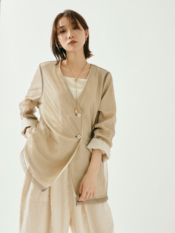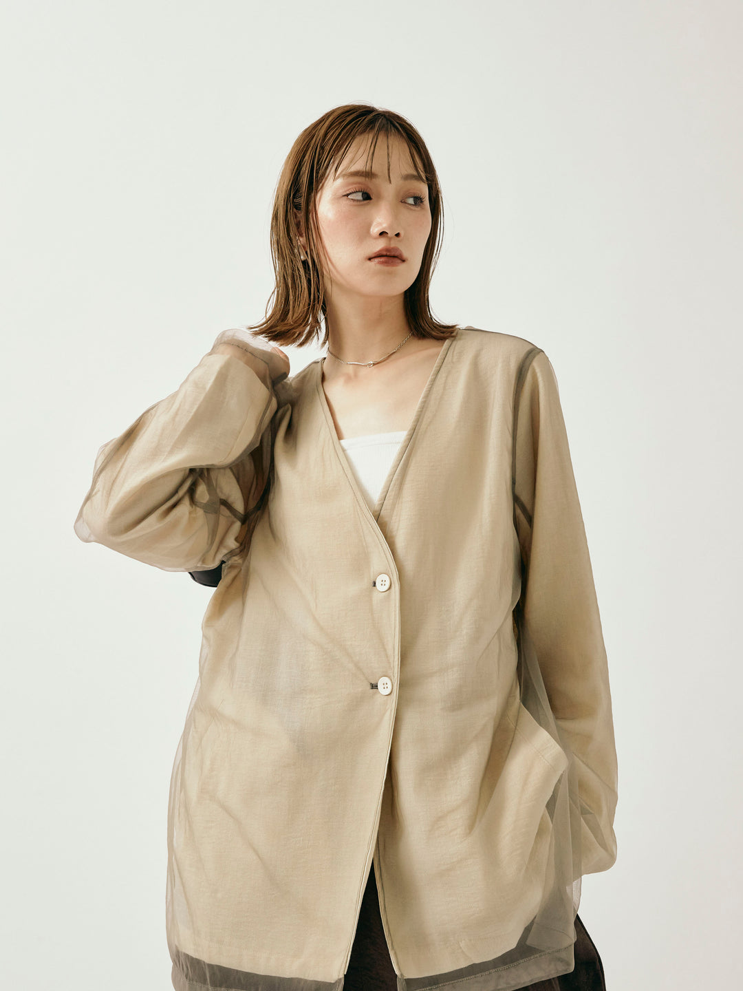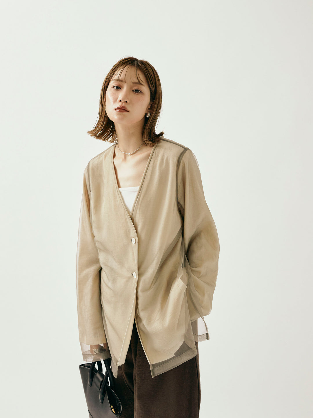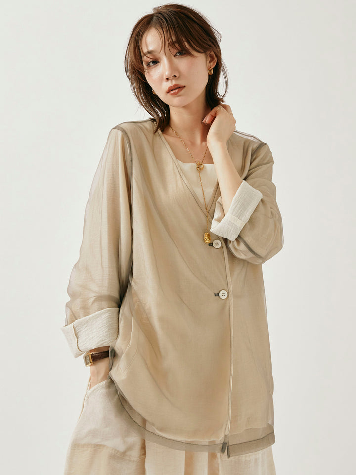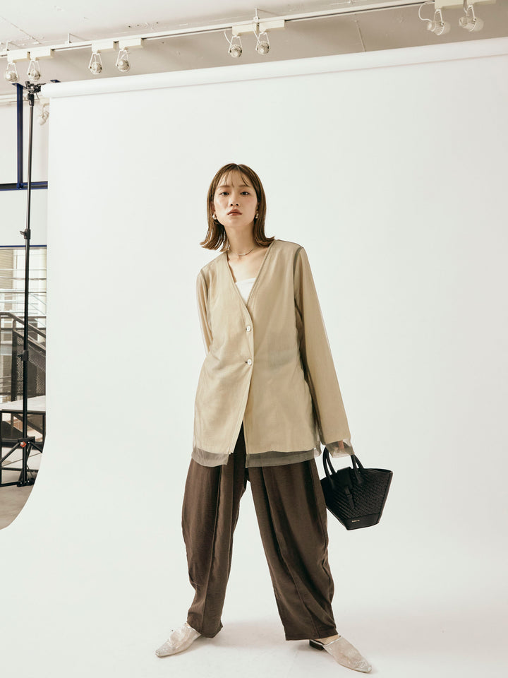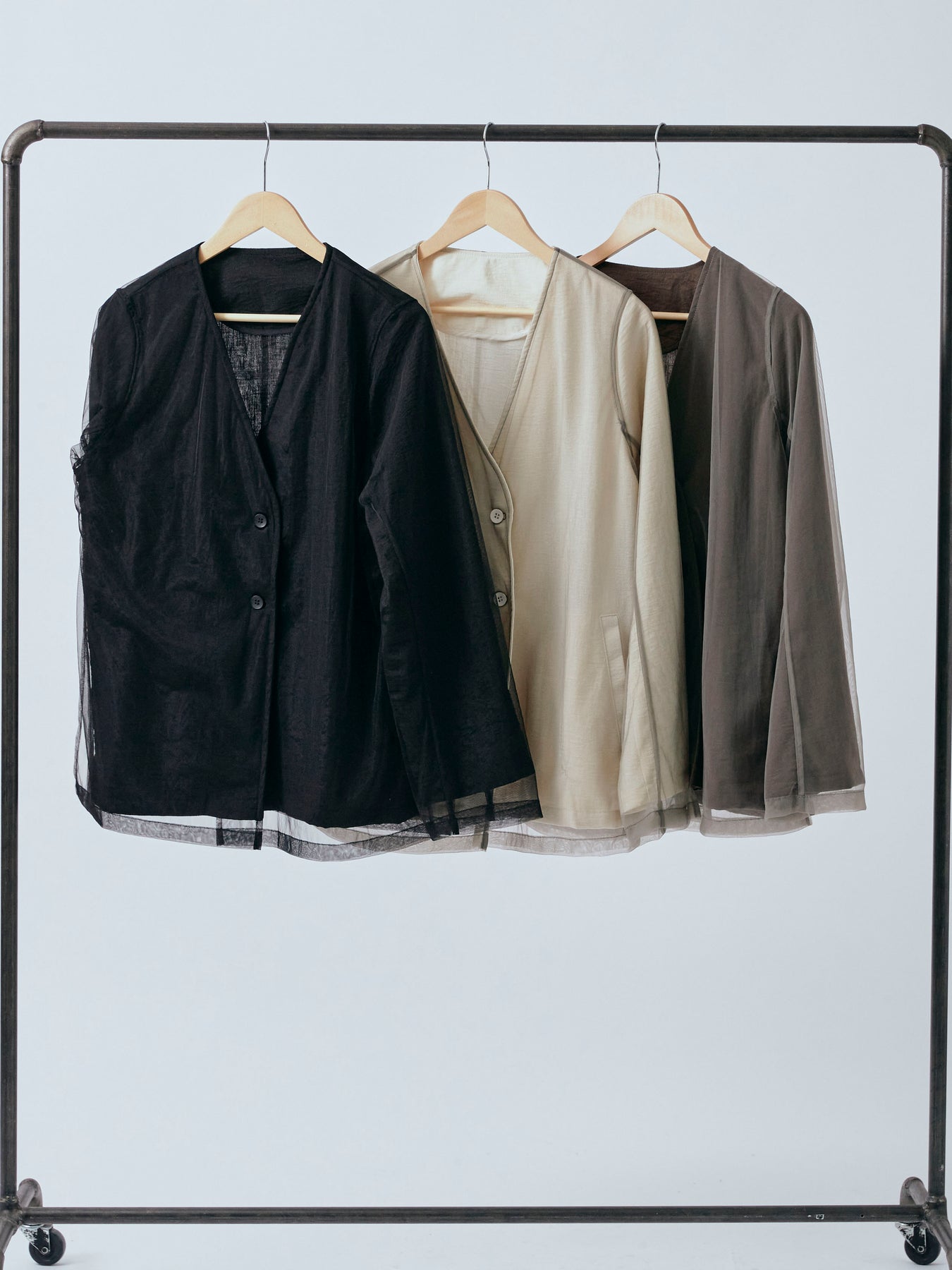 ふんわりと重ねたチュールが目を引く、軽やかなVネックジャケット。 程よくシアーな素材感が、春夏の羽織りとして抜け感のあるスタイリングを叶えます。 シンプルながらも、異素材のレイヤードデザインで奥行きのある印象に。 Vネック仕様で顔まわりもすっきりと見せつつ、着回しやすい万能な一着。 デニムやワンピースにさらっと羽織るだけで、スタイリングが格上げされるアイテムです。 ※ボトムス、キャミソール(インナー)以外の商品は一律でインナーは付属していません。