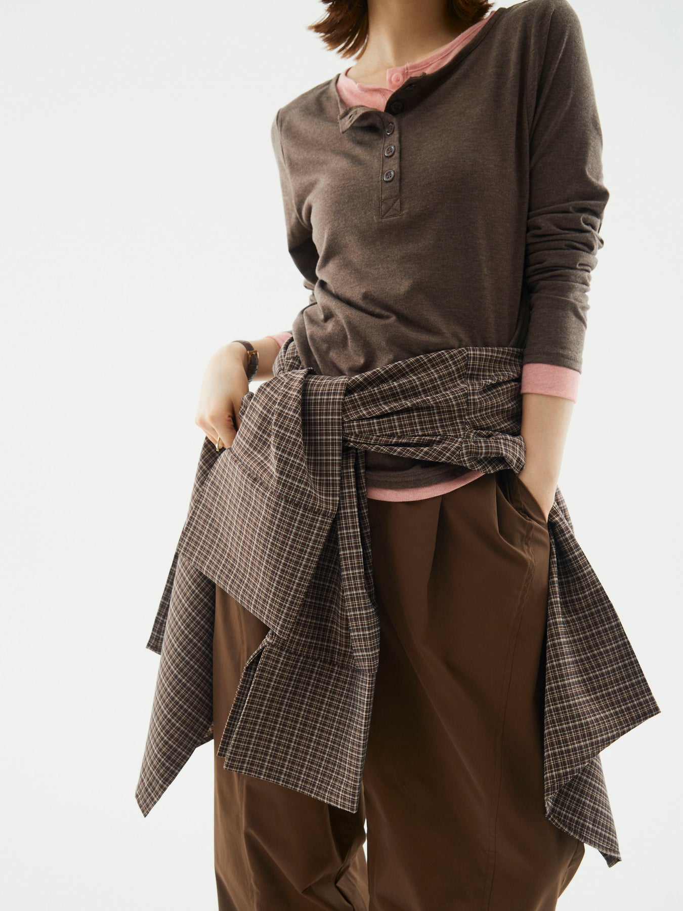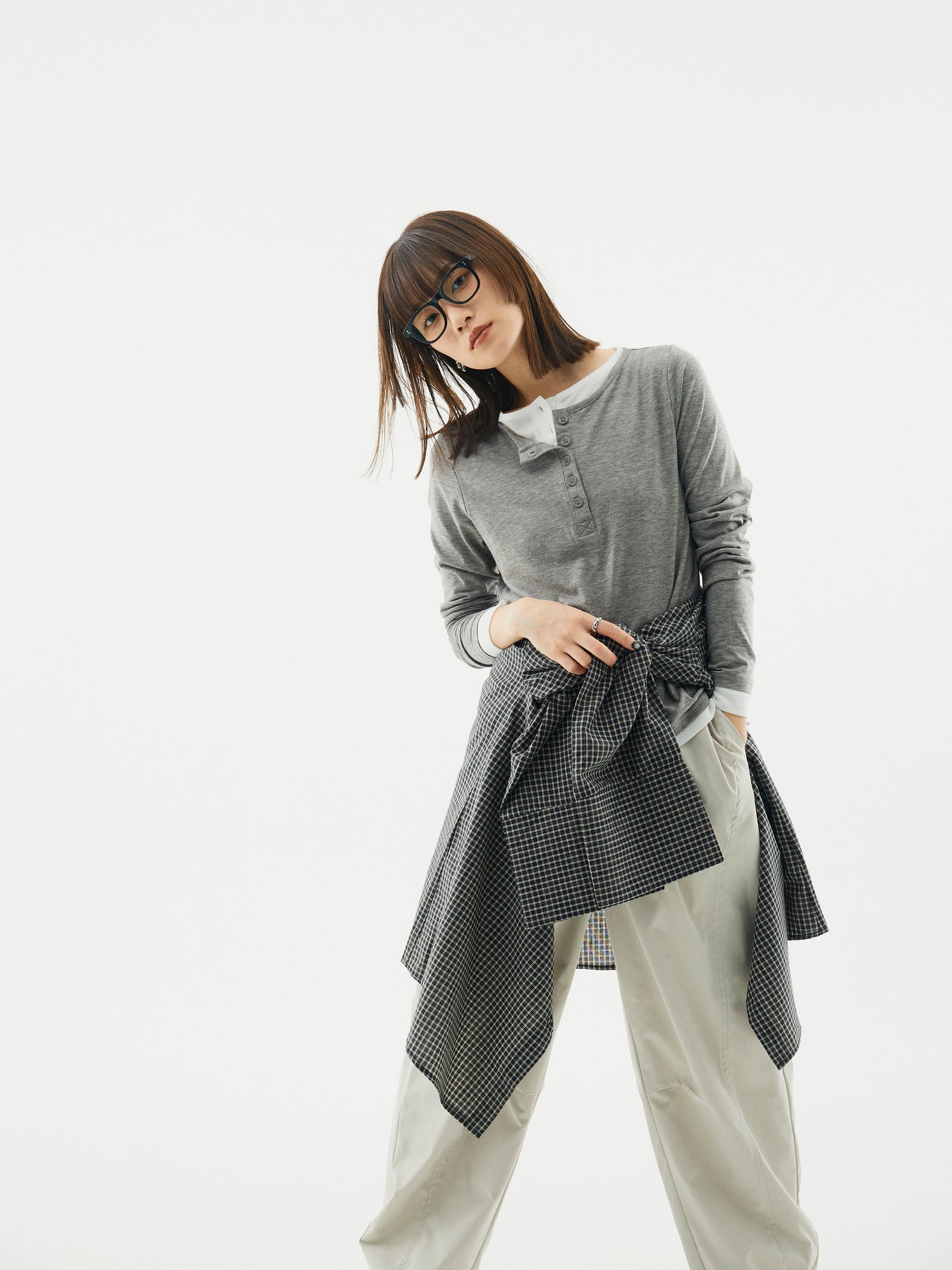 ヴィンテージ感漂う風合いと、絶妙な配色が目を引くレイヤード風ヘンリーネックトップス。 襟元と裾、袖口からさりげなく覗く配色が、シンプルながらもスタイリングに奥行きを与え、1枚でサマになるデザイン。ややルーズなシルエットが今っぽさを引き立てつつ、こなれ感あるカジュアルスタイルにマッチします。 肌当たりの良いコットン混素材で、着心地も快適。デニムやカーゴパンツ、スカートまで幅広く合わせやすい万能トップスです。 1枚で存在感のある、デイリーに使いたくなる優秀アイテム。