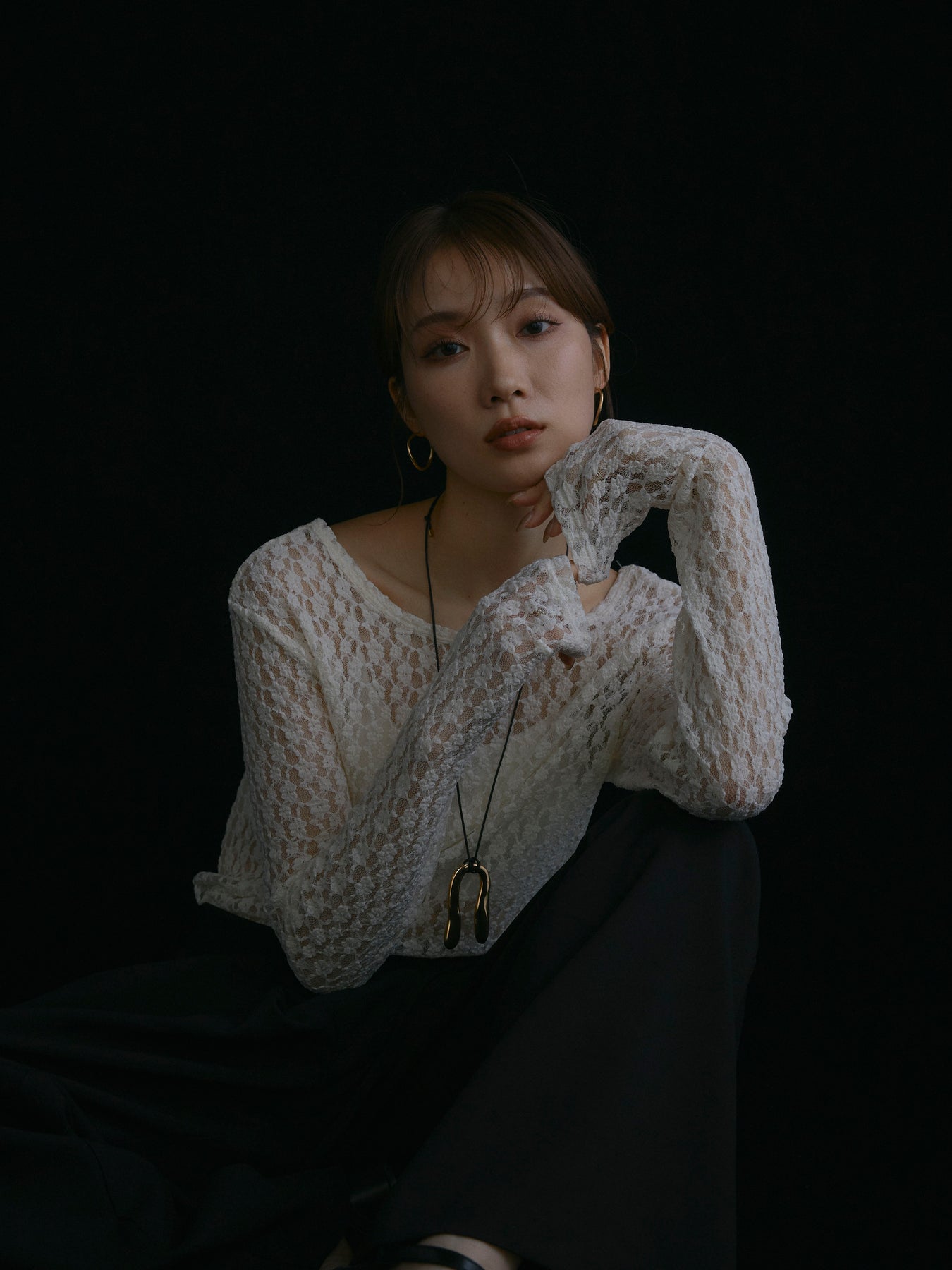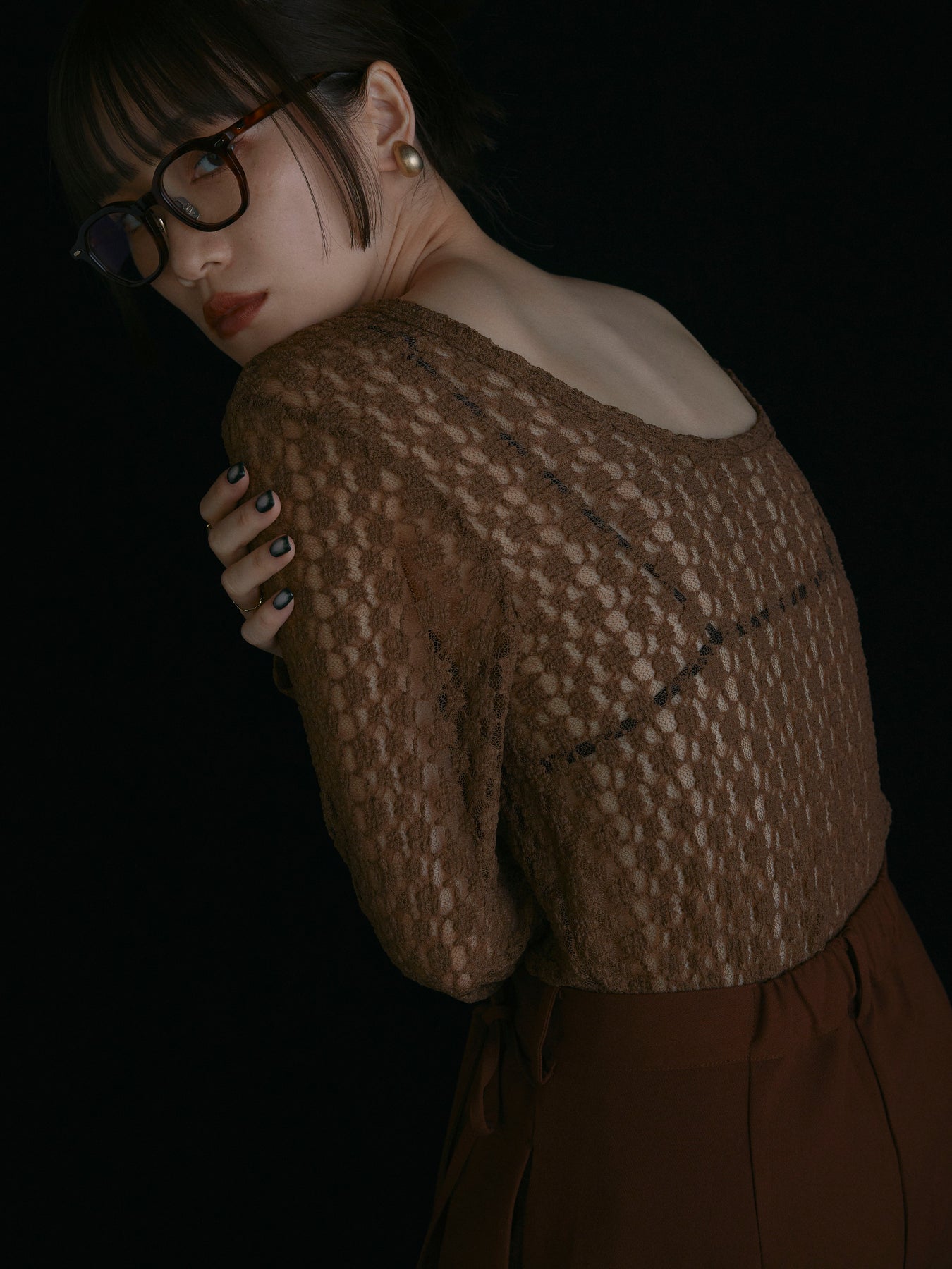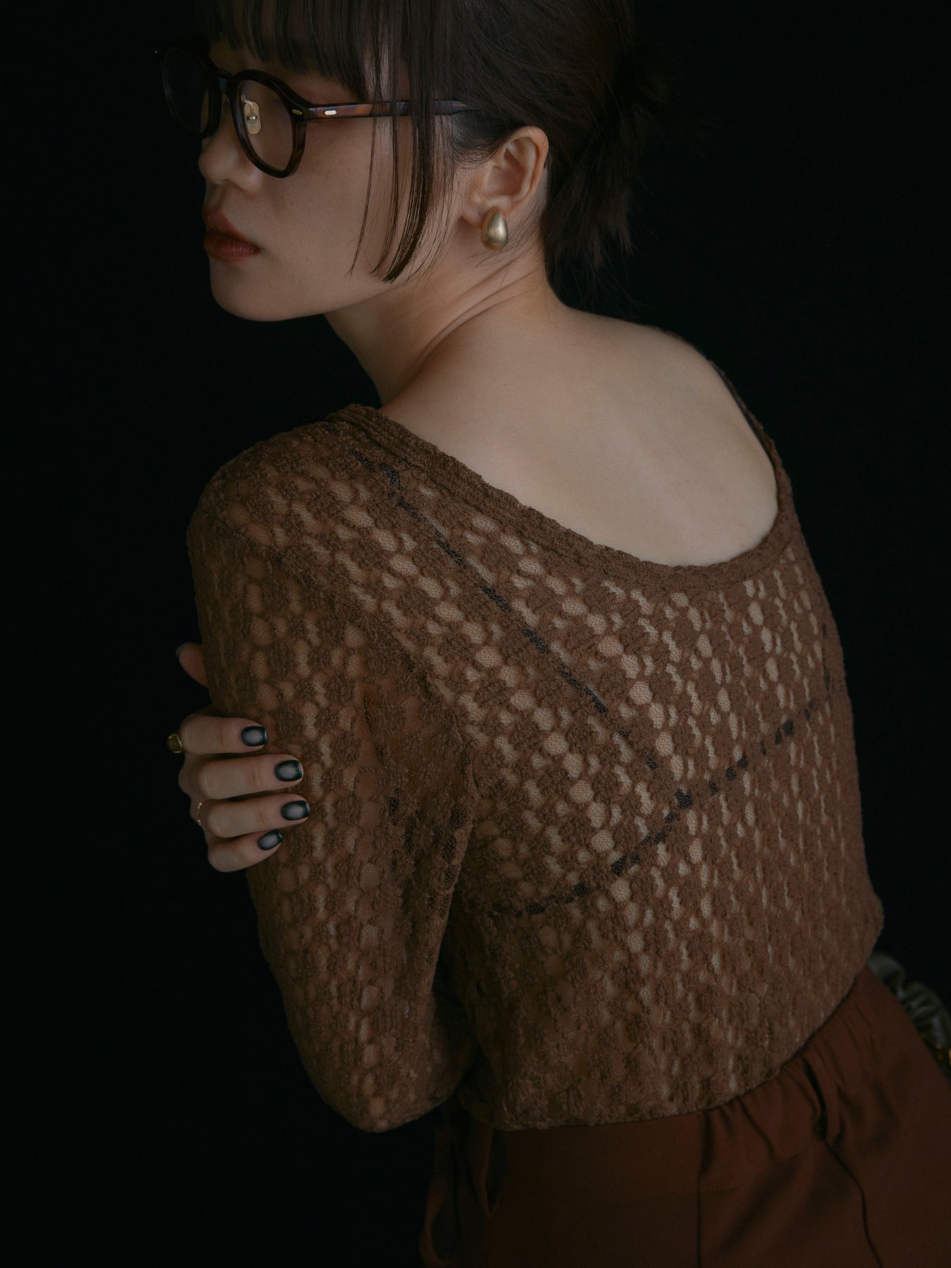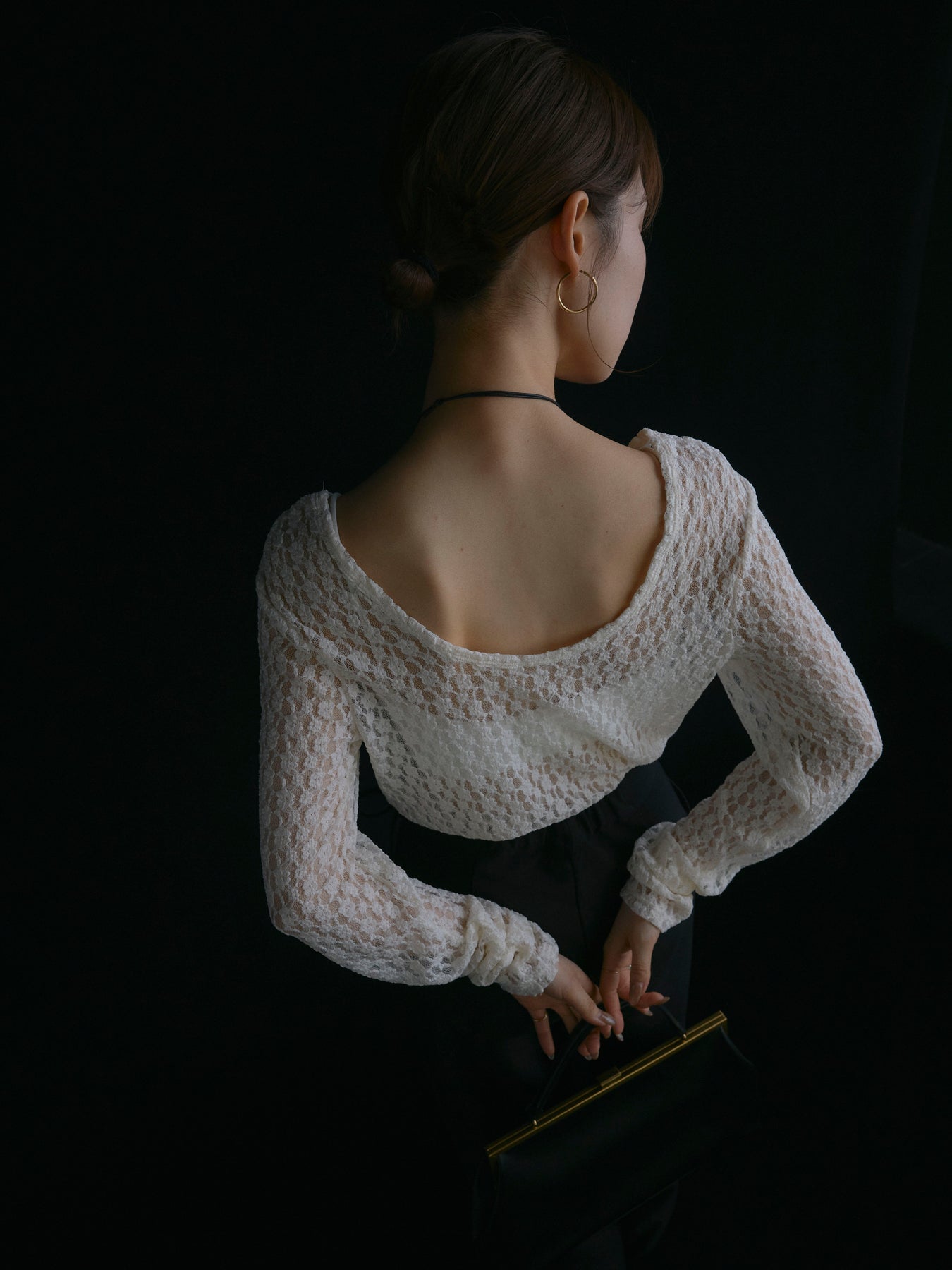程よい透け感のレースが女性らしさを引き立てる一枚。柔らかく肌なじみの良い素材で着心地も快適。程よく体に沿うシルエットがレイヤードにも最適で、ジャケットやベストのインナー使いとしても活躍します。バックスタイルは緩やかなラウンドカットになっており、抜け感のある着こなしを演出できます。