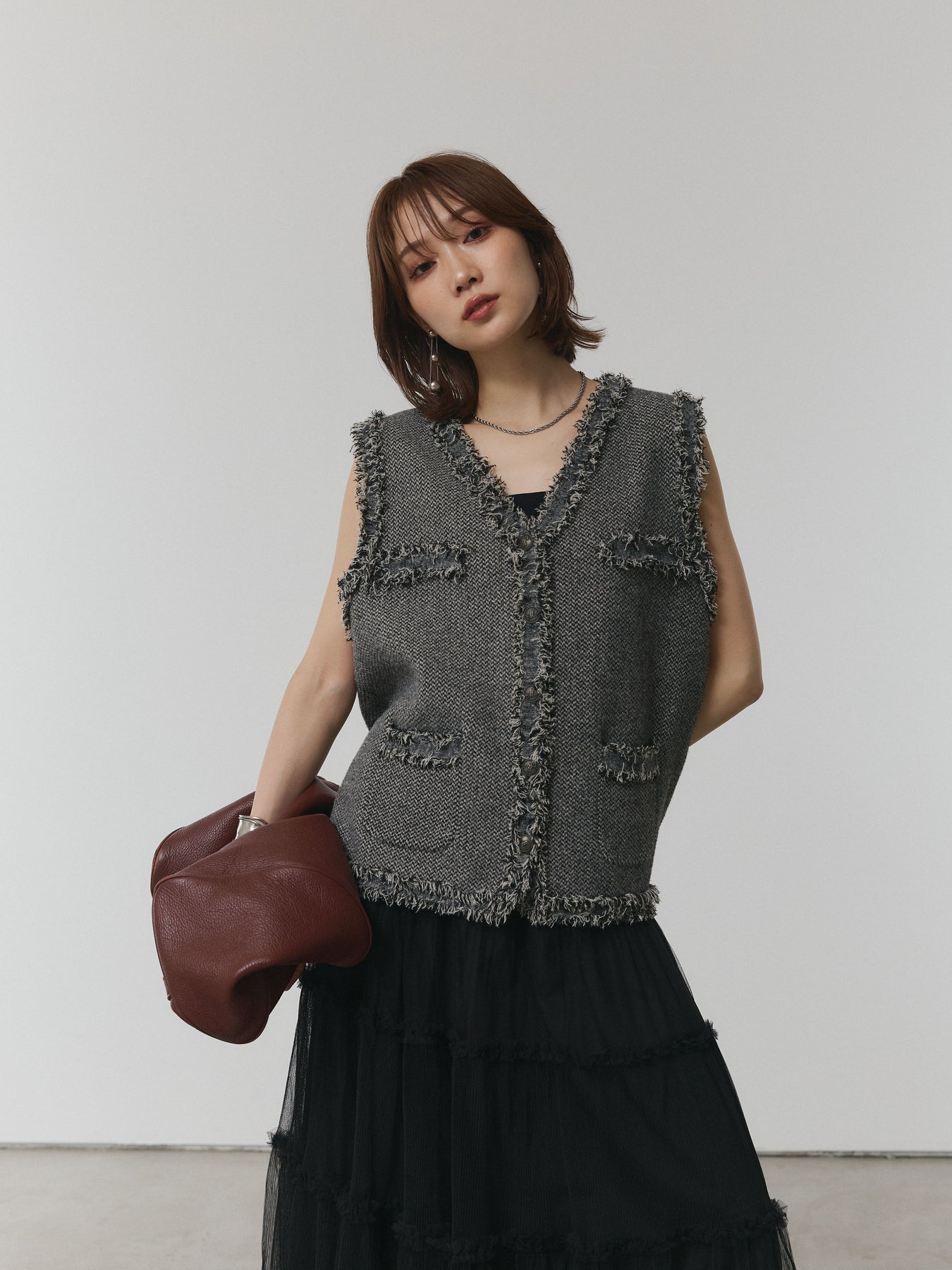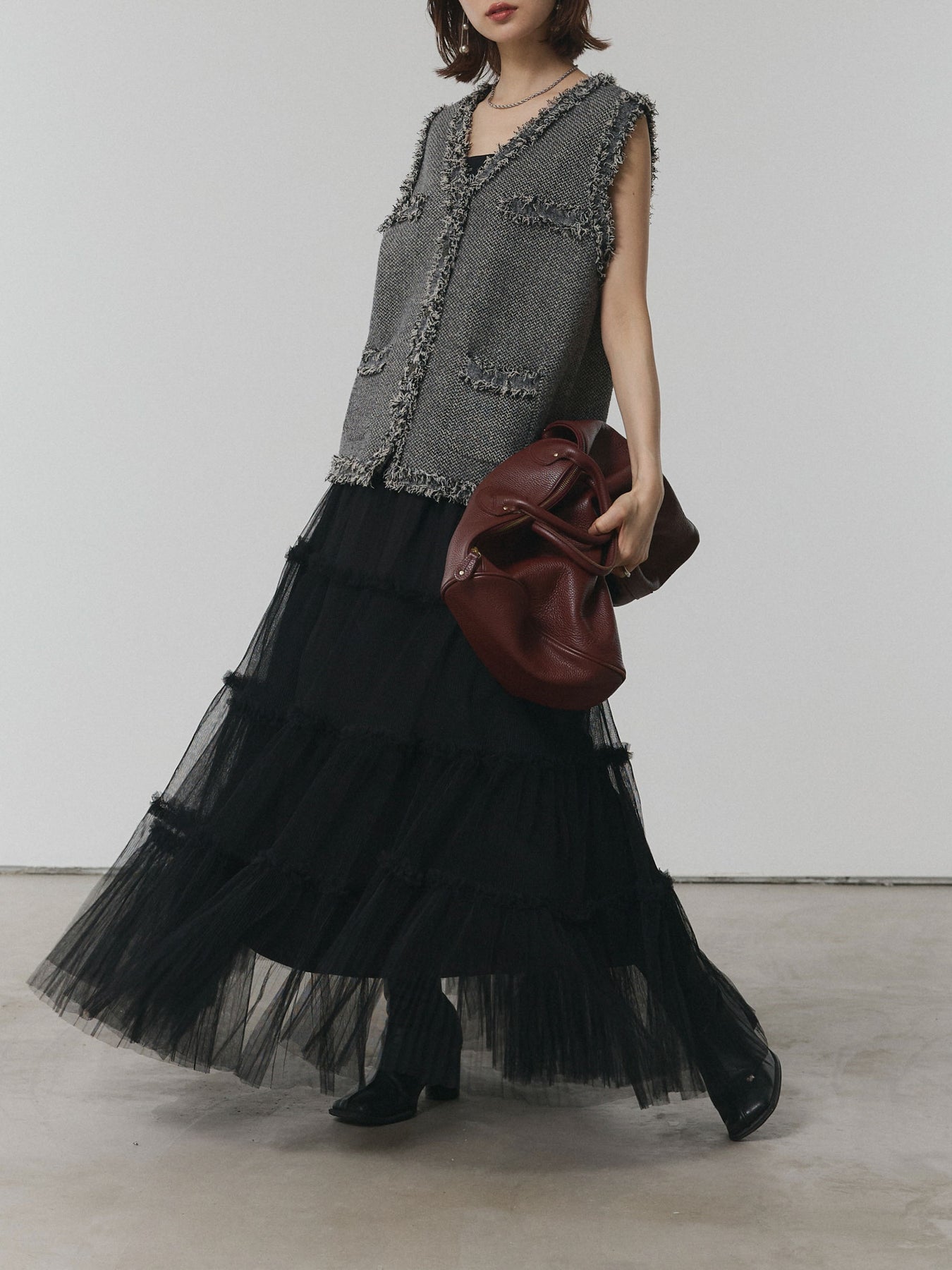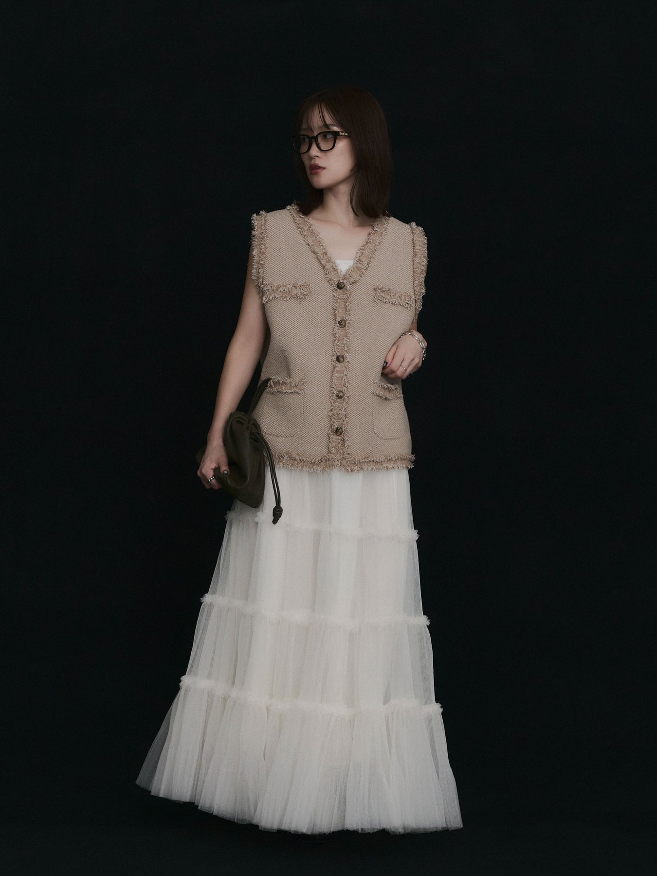 【Allure】[SET]アンティークボタンツイードフリンジニットベスト+チュールティアードフレアスカート(2set)