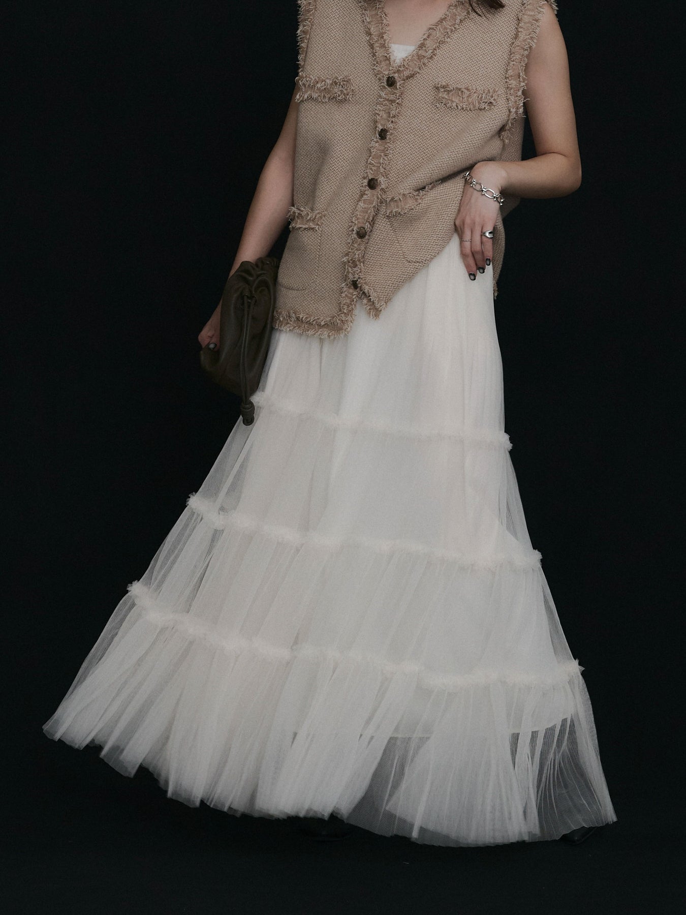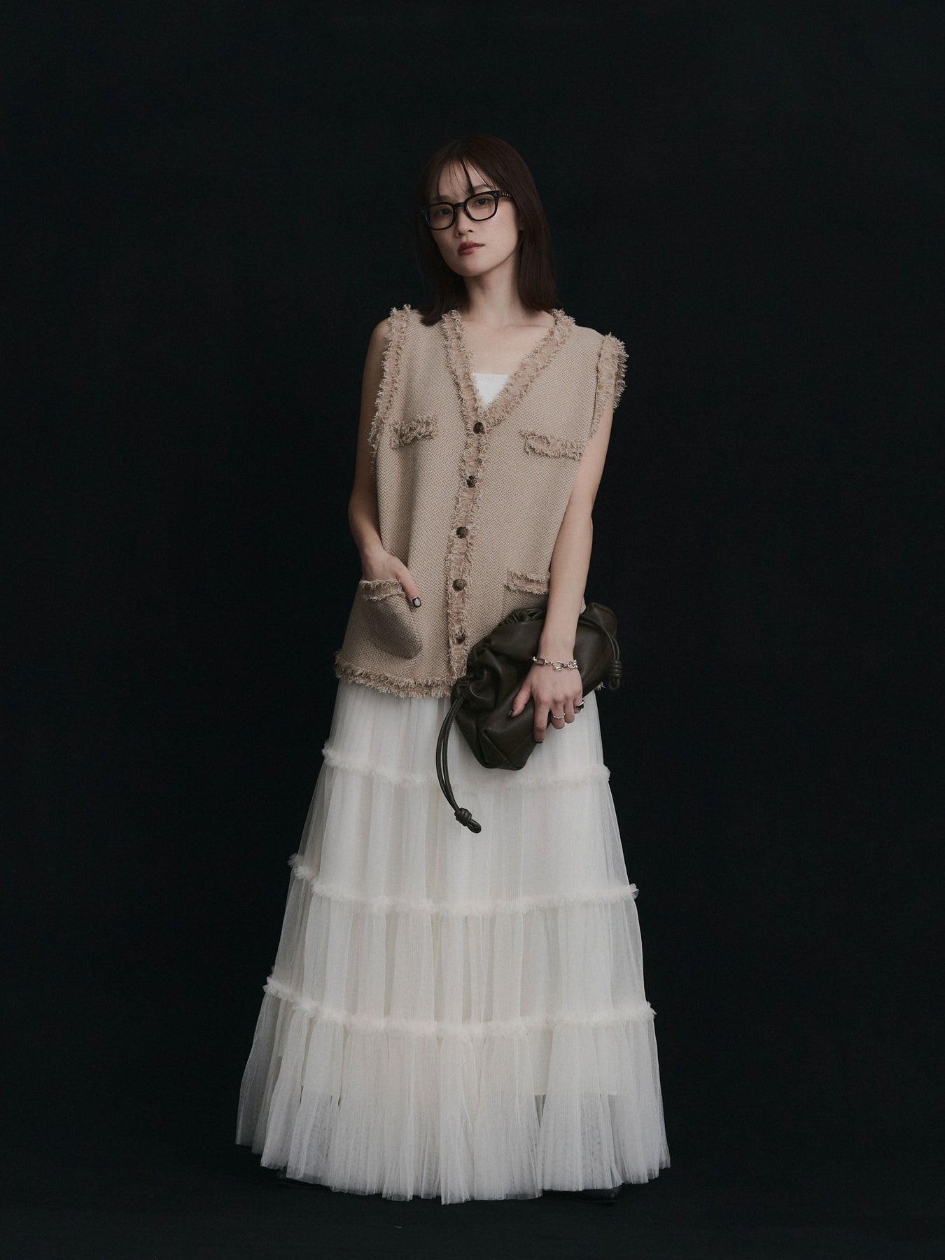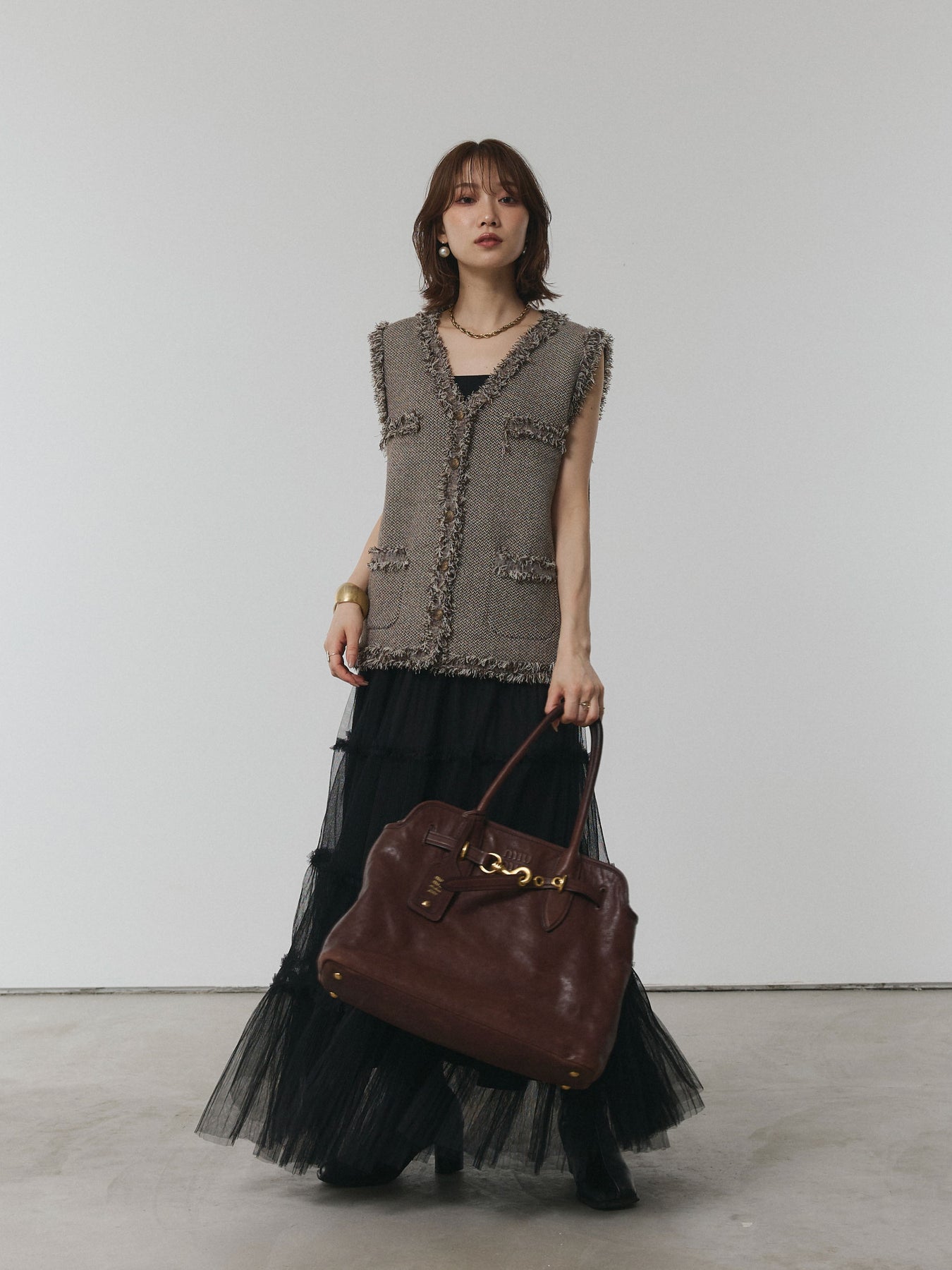 【Allure】[SET]アンティークボタンツイードフリンジニットベスト+チュールティアードフレアスカート(2set)