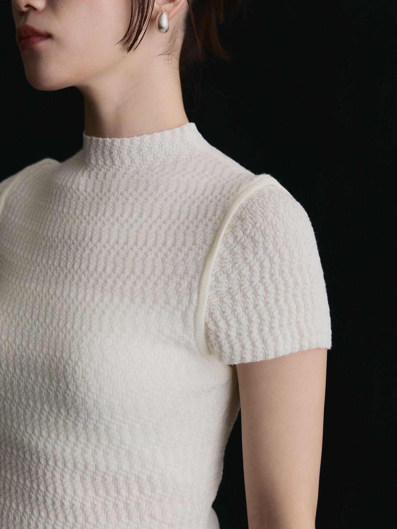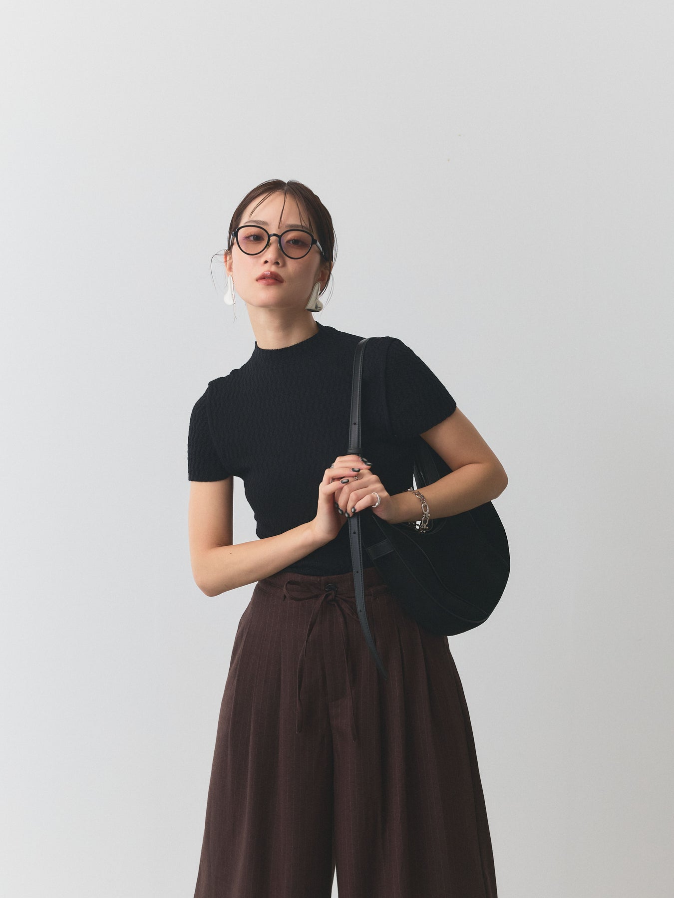 立体感のあるリブ編みで仕立てたハーフスリーブのニットトップス。すっきりとしたシルエットで着こなしやすく、シンプルながらも表情のある素材感がスタイリングに奥行きをプラスします。伸縮性があり快適な着心地で、一枚で着るのはもちろん、ジャケットやカーディガンのインナーとしても活躍。シーズンを通してデイリーに取り入れやすい万能アイテムです。 ※ボトムス、キャミソール(インナー)以外の商品は一律でインナーは付属していません。