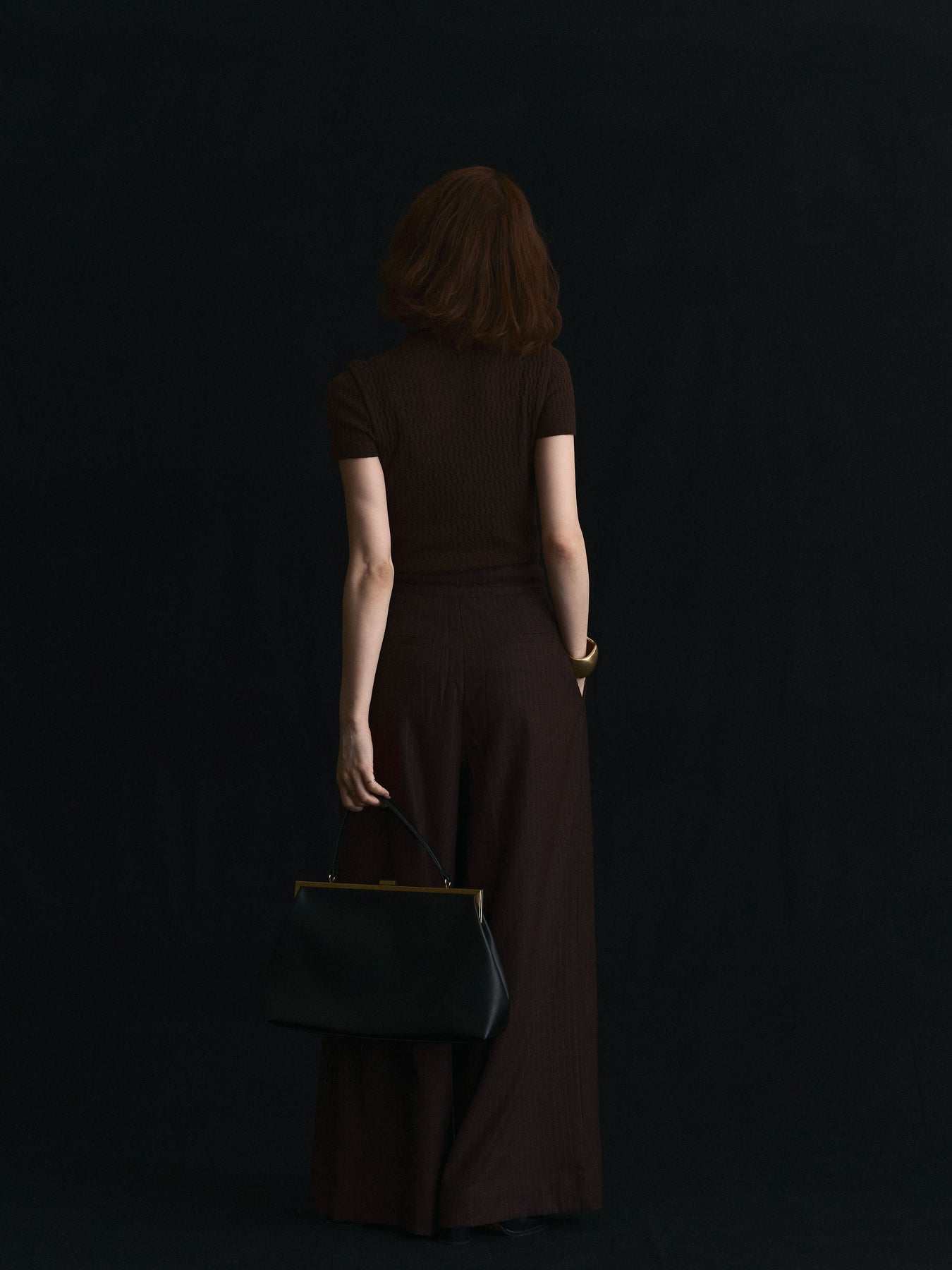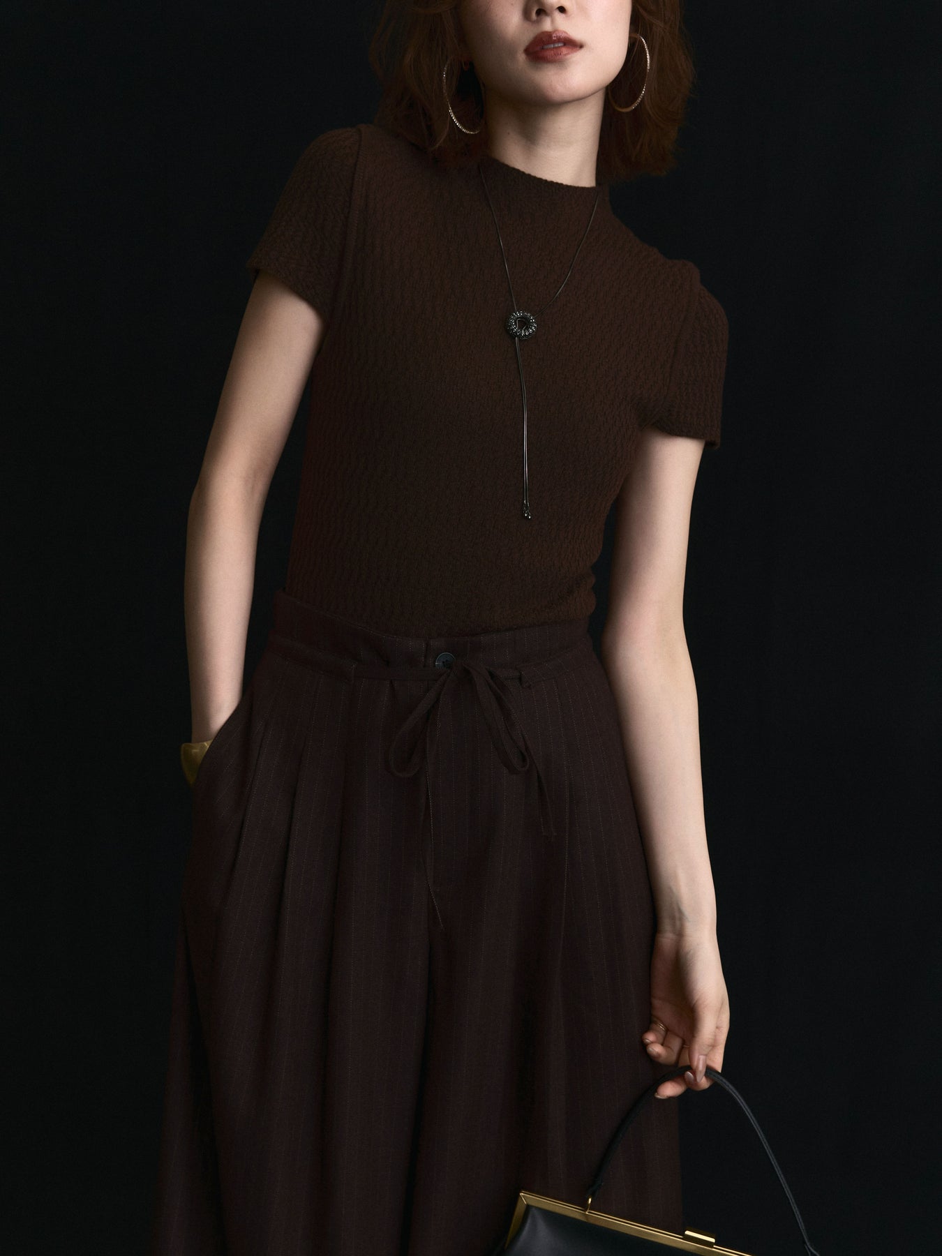 【Allure】[SET]デザインリブハーフニットトップス+ウールライクストライプワイドパンツ(2set)